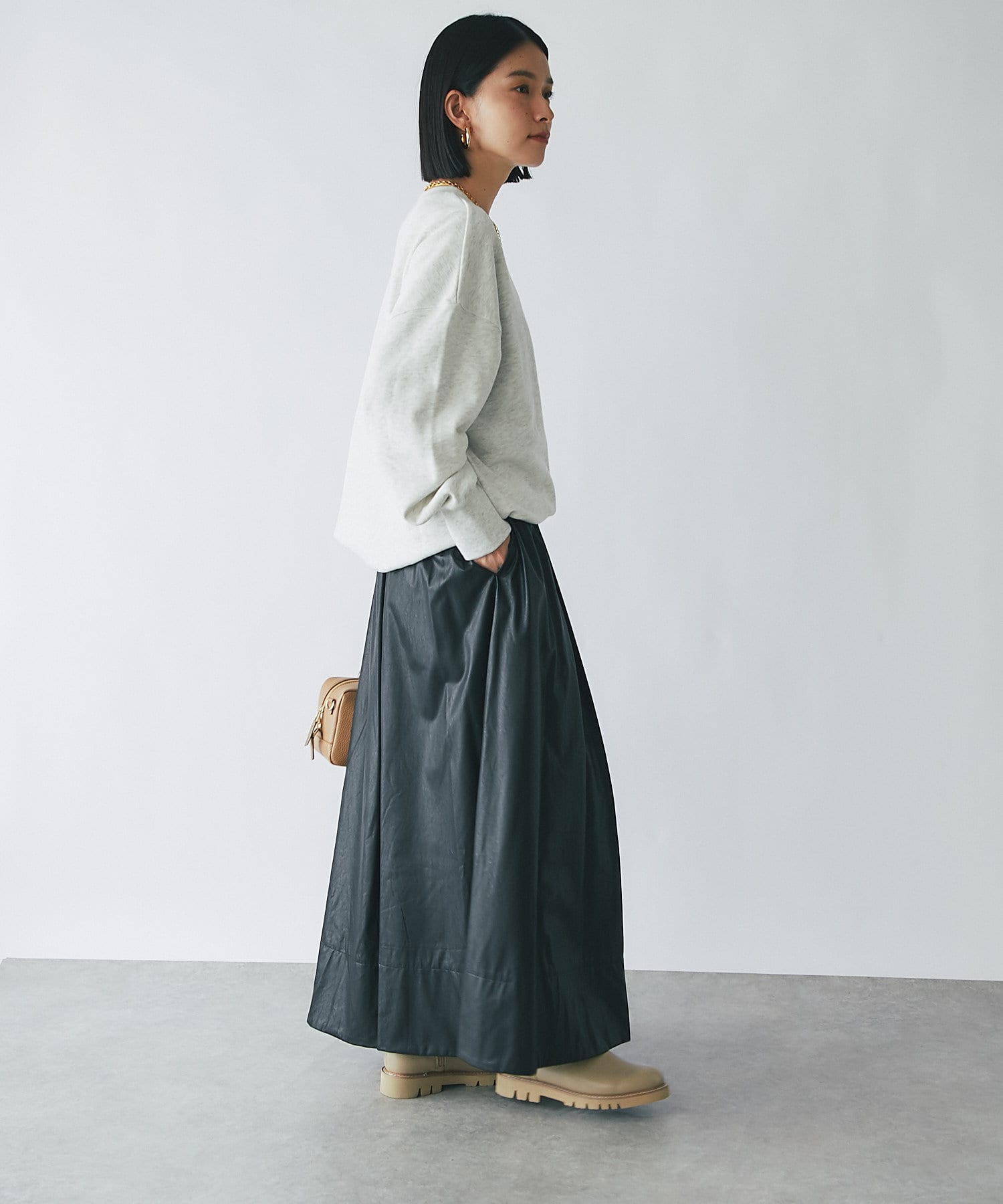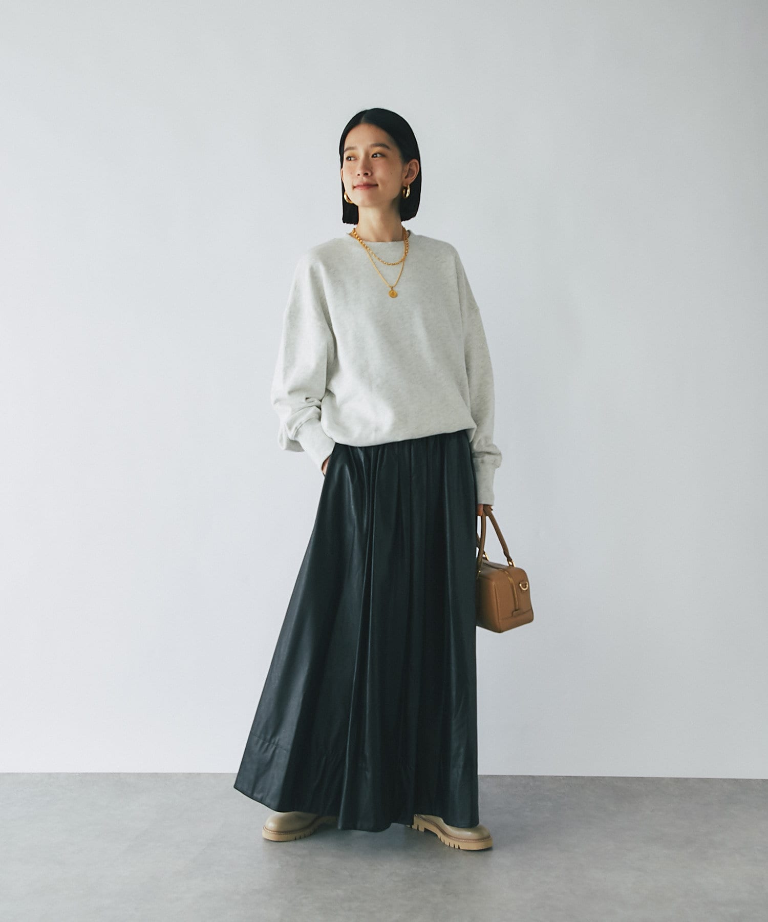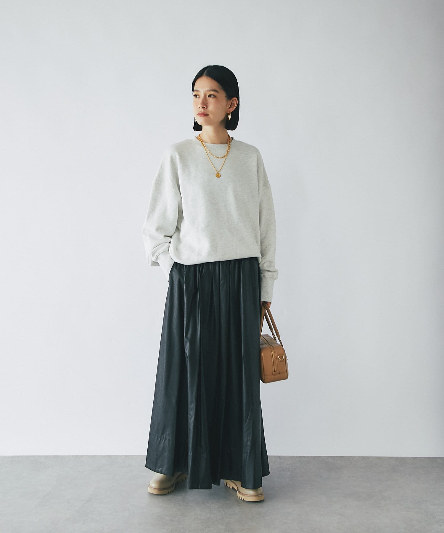 トップスはカジュアルにスウェットやMA-1などと合わせていただいたり、ローゲージのニットなどを合わせて合皮の光沢感とニットの温かみのコントラストをお楽しみいただくのが一押しです。