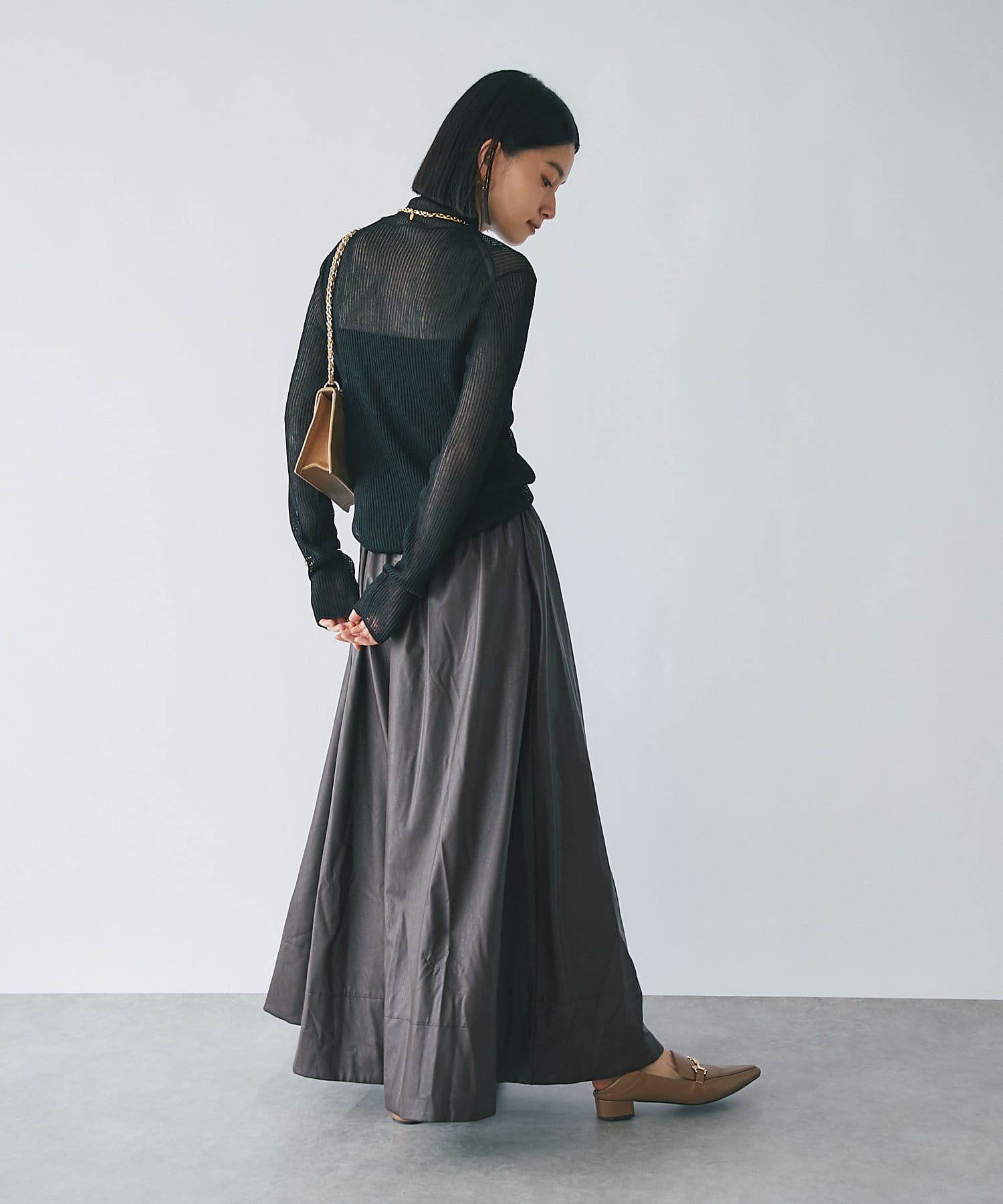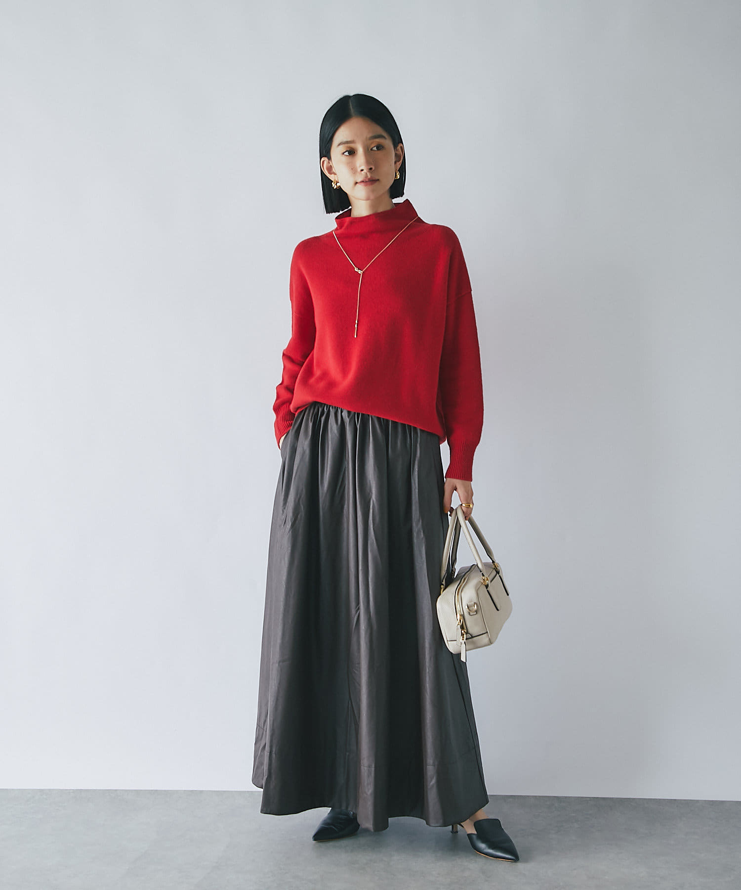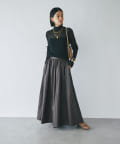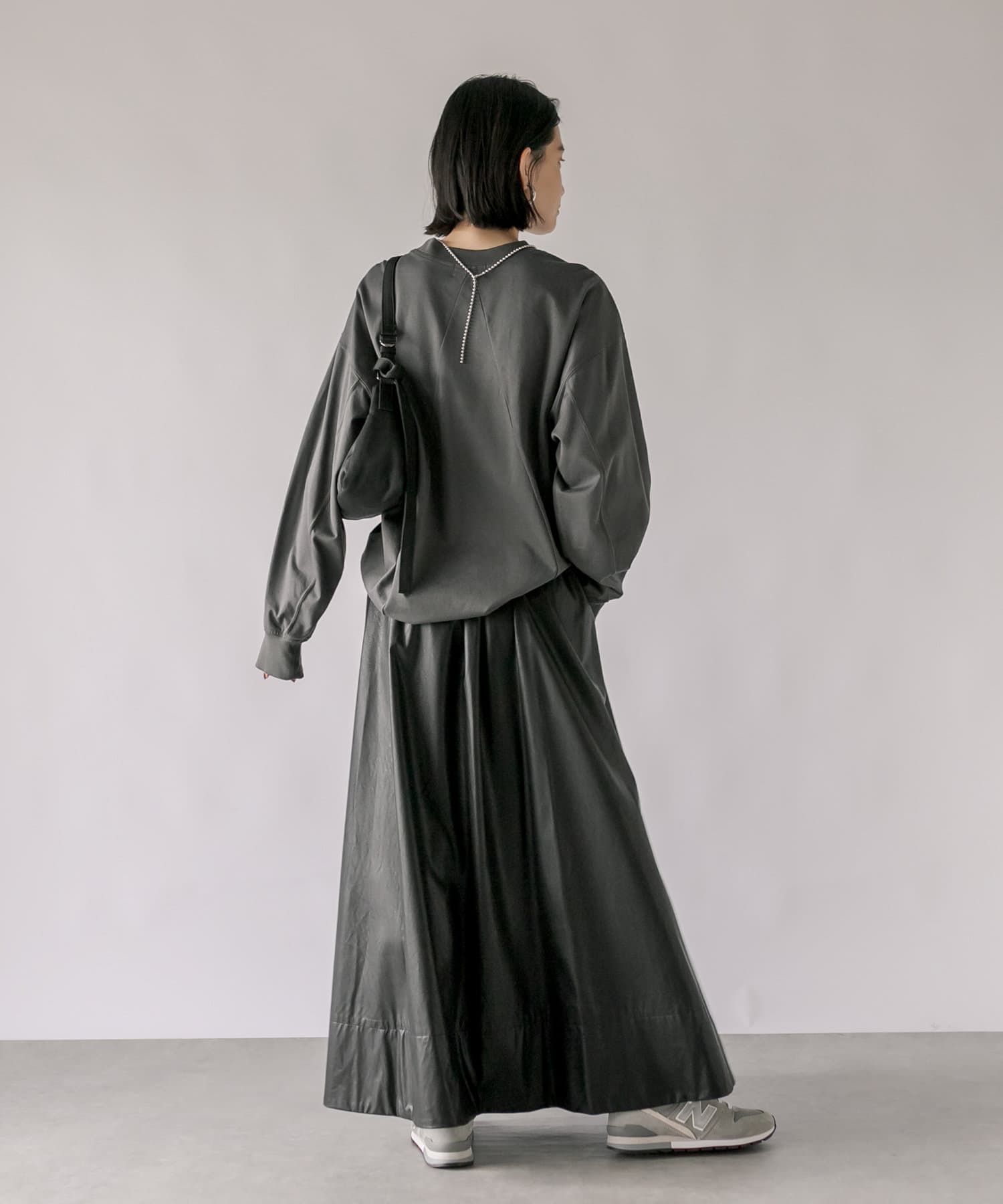 トップスはカジュアルにスウェットやMA-1などと合わせていただいたり、ローゲージのニットなどを合わせて合皮の光沢感とニットの温かみのコントラストをお楽しみいただくのが一押しです。