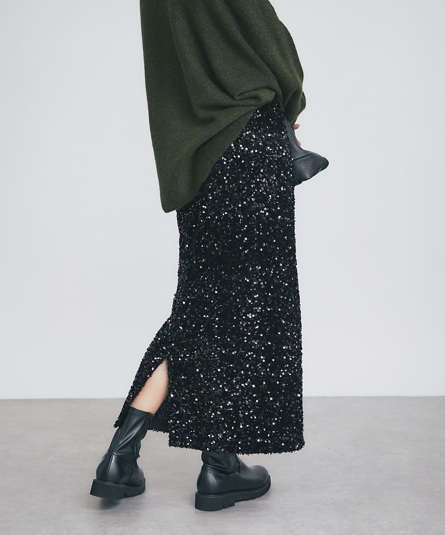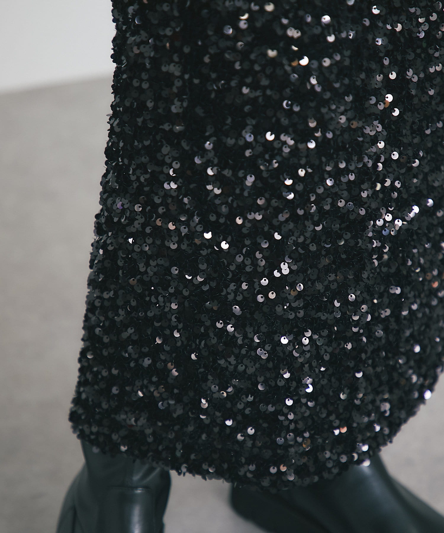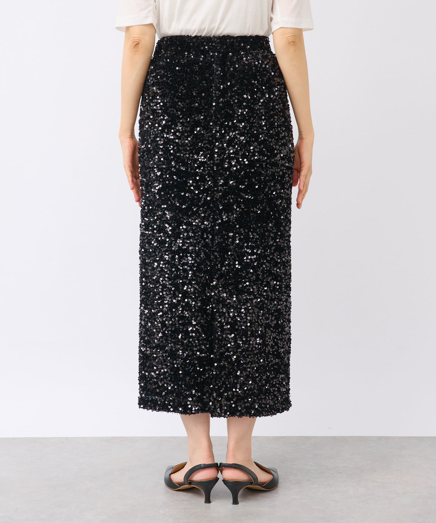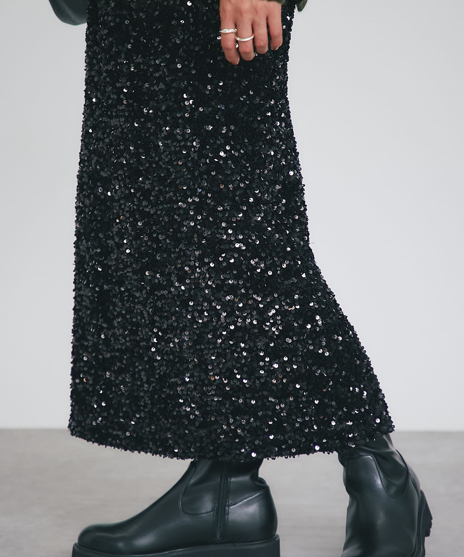 • パッと目を引く主役アイテム、スパンコールタイトスカート。