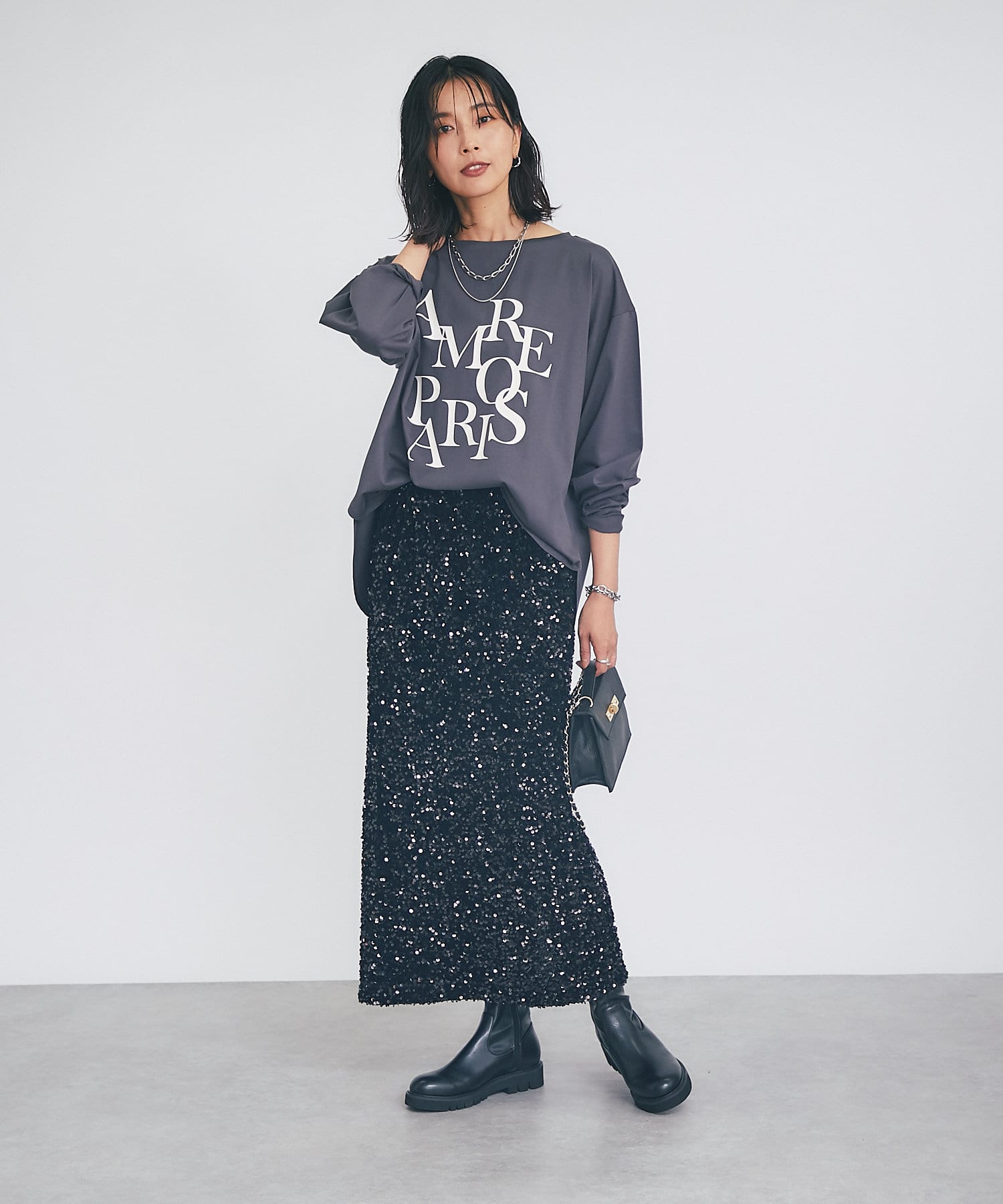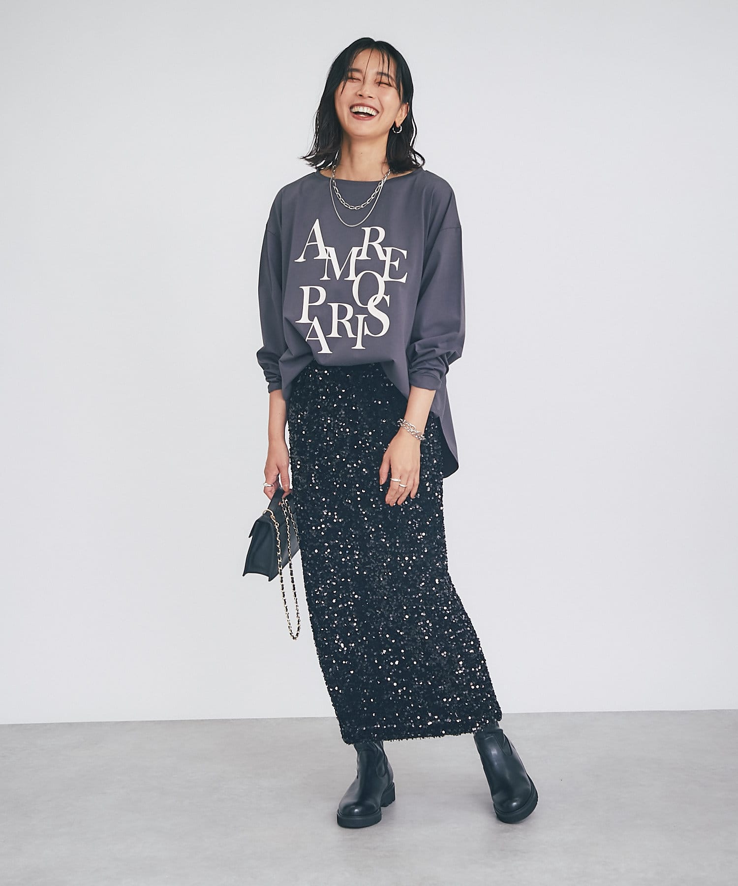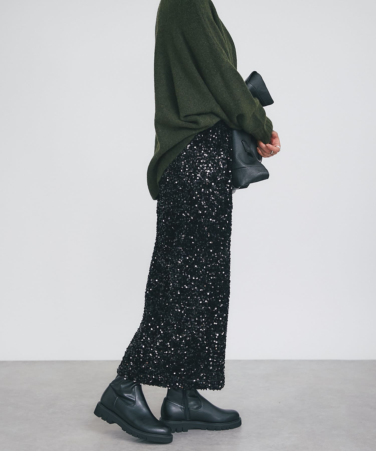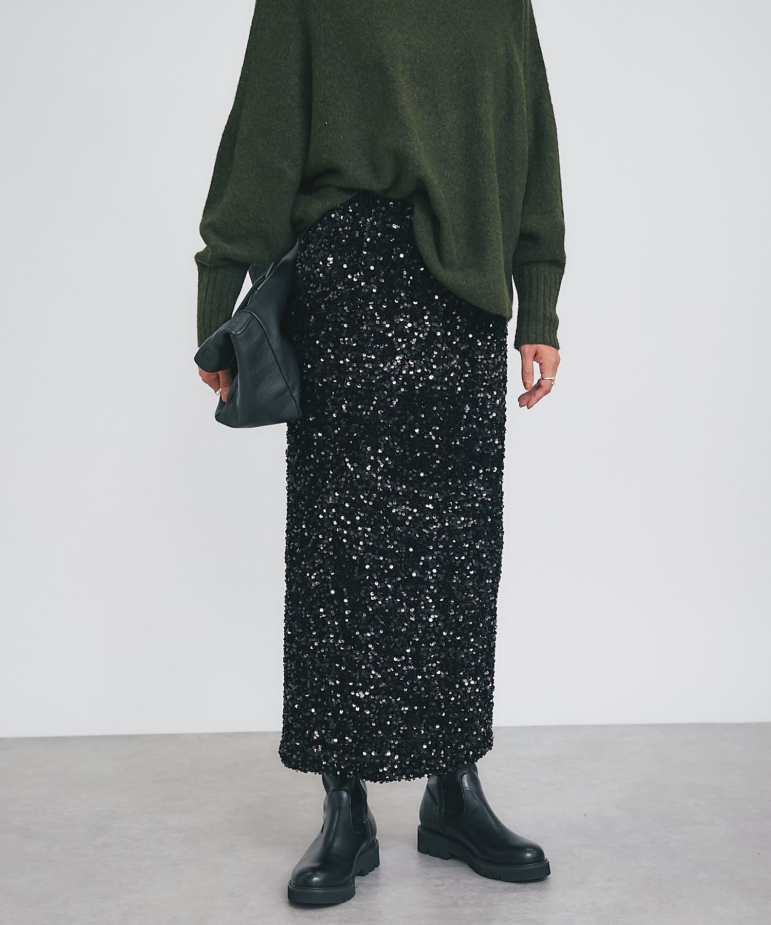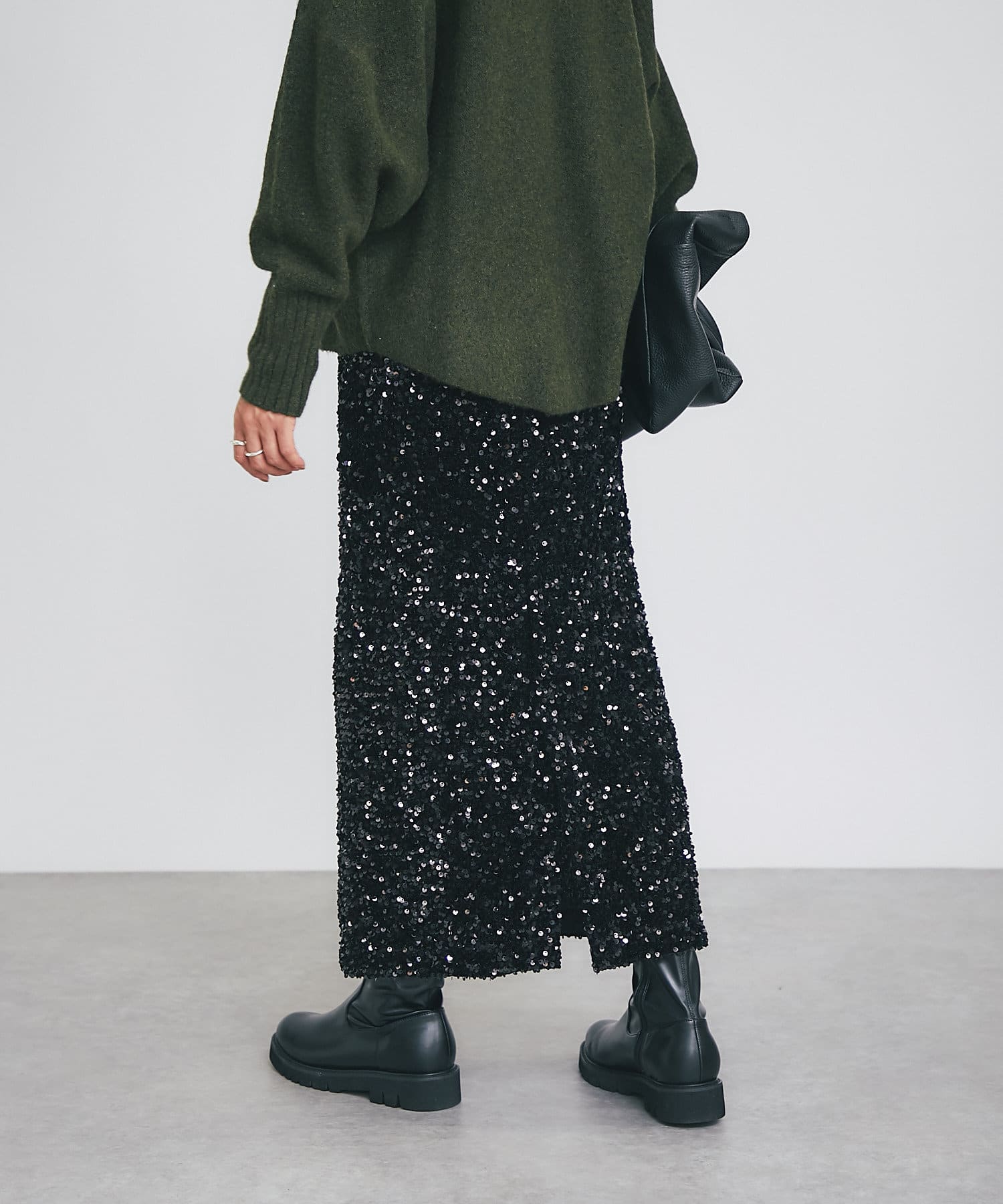 • パッと目を引く主役アイテム、スパンコールタイトスカート。