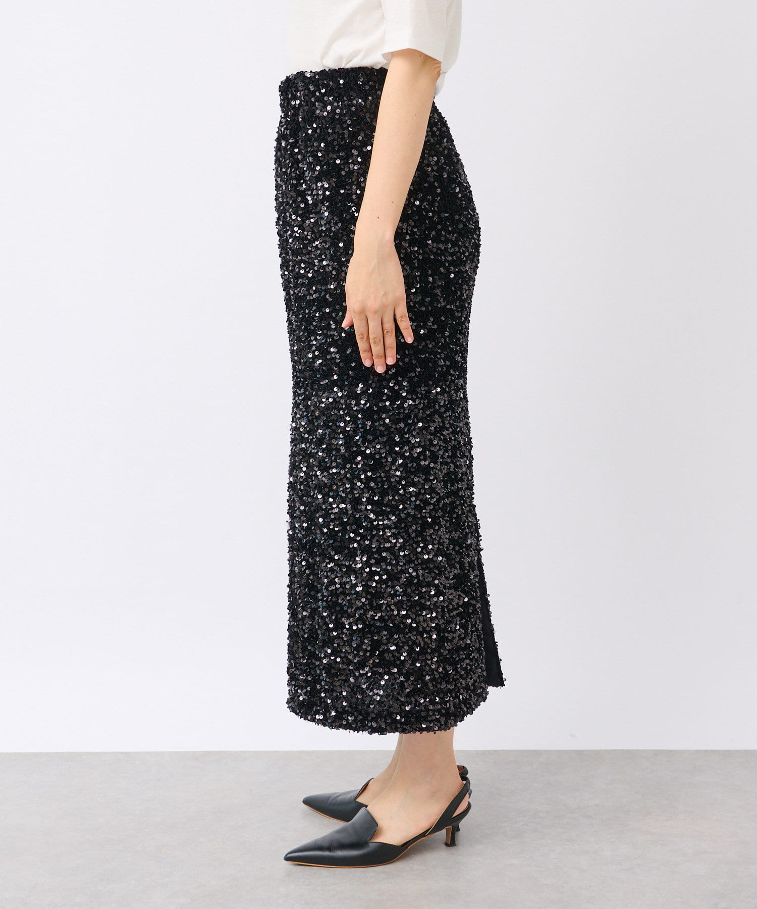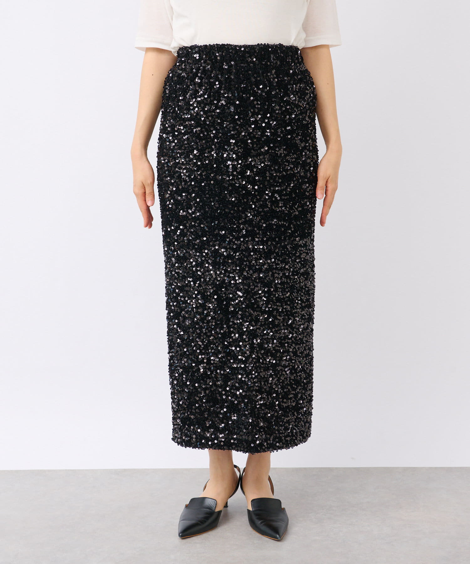 パッと目を引く主役アイテム、スパンコールタイトスカート。