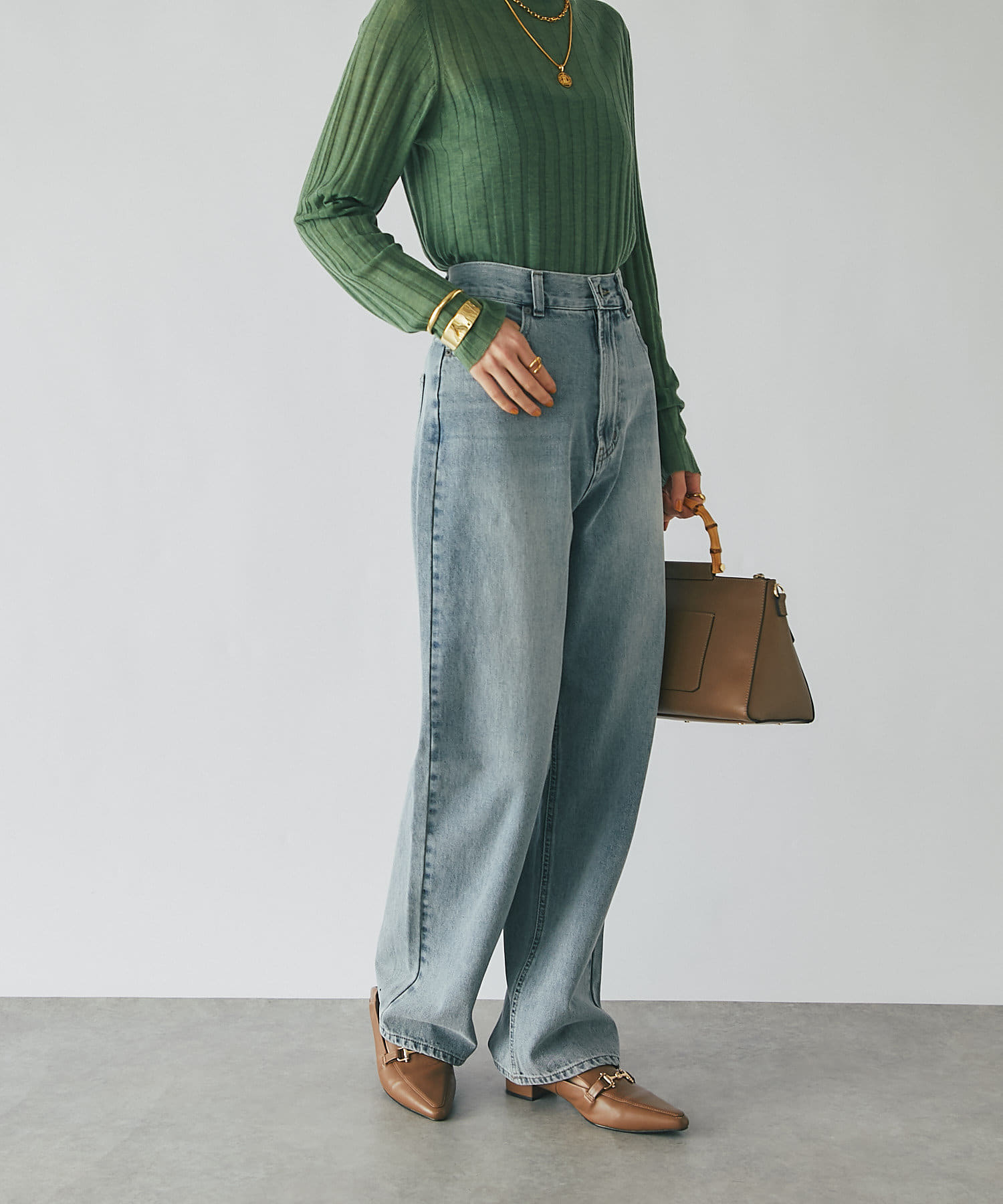 やわらかなサックスカラーが女性らしいワイドデニム。