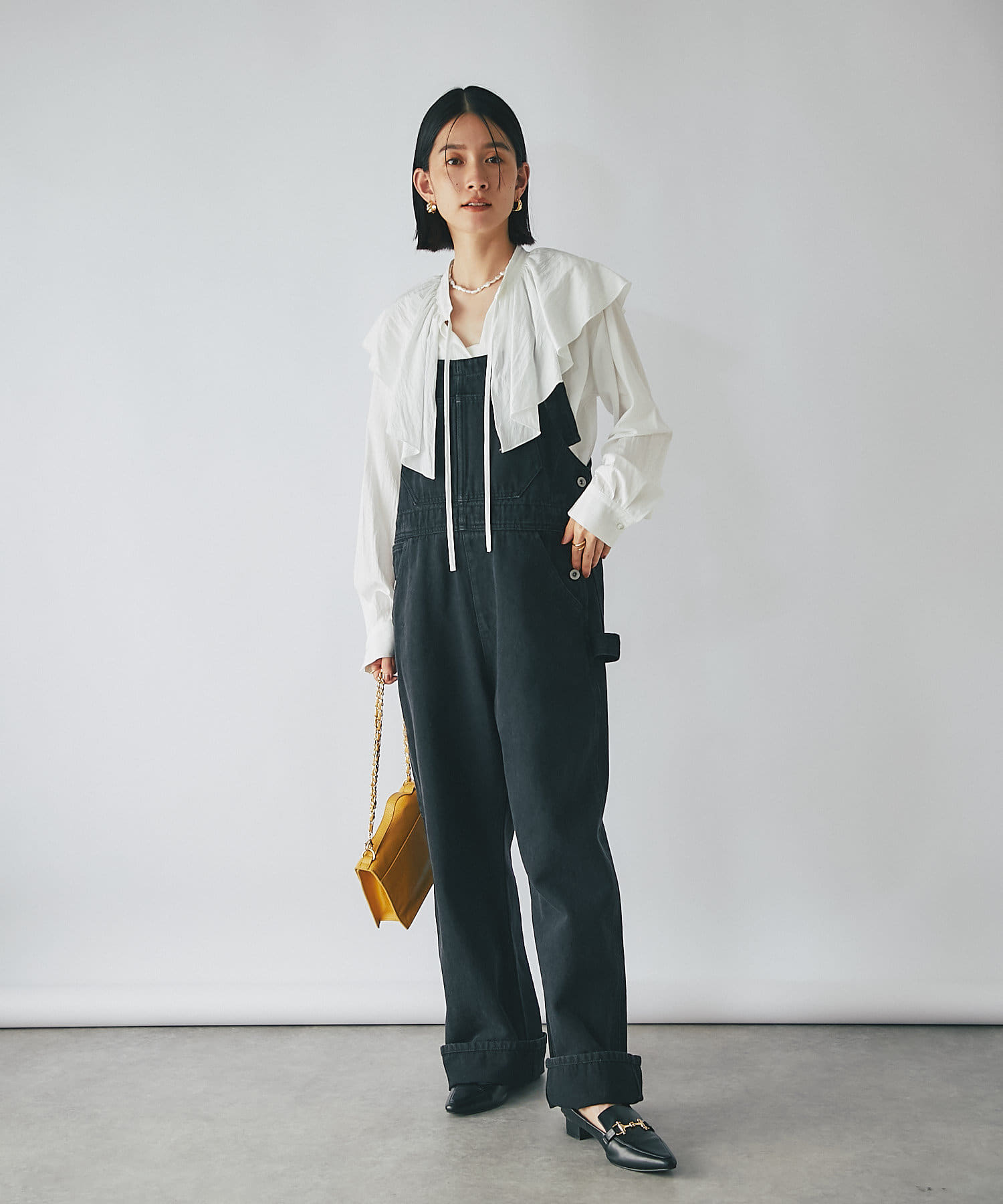 肩周りを覆う大きめのフリルカラーは、お顔回りに華やかさをプラスしてくれます。