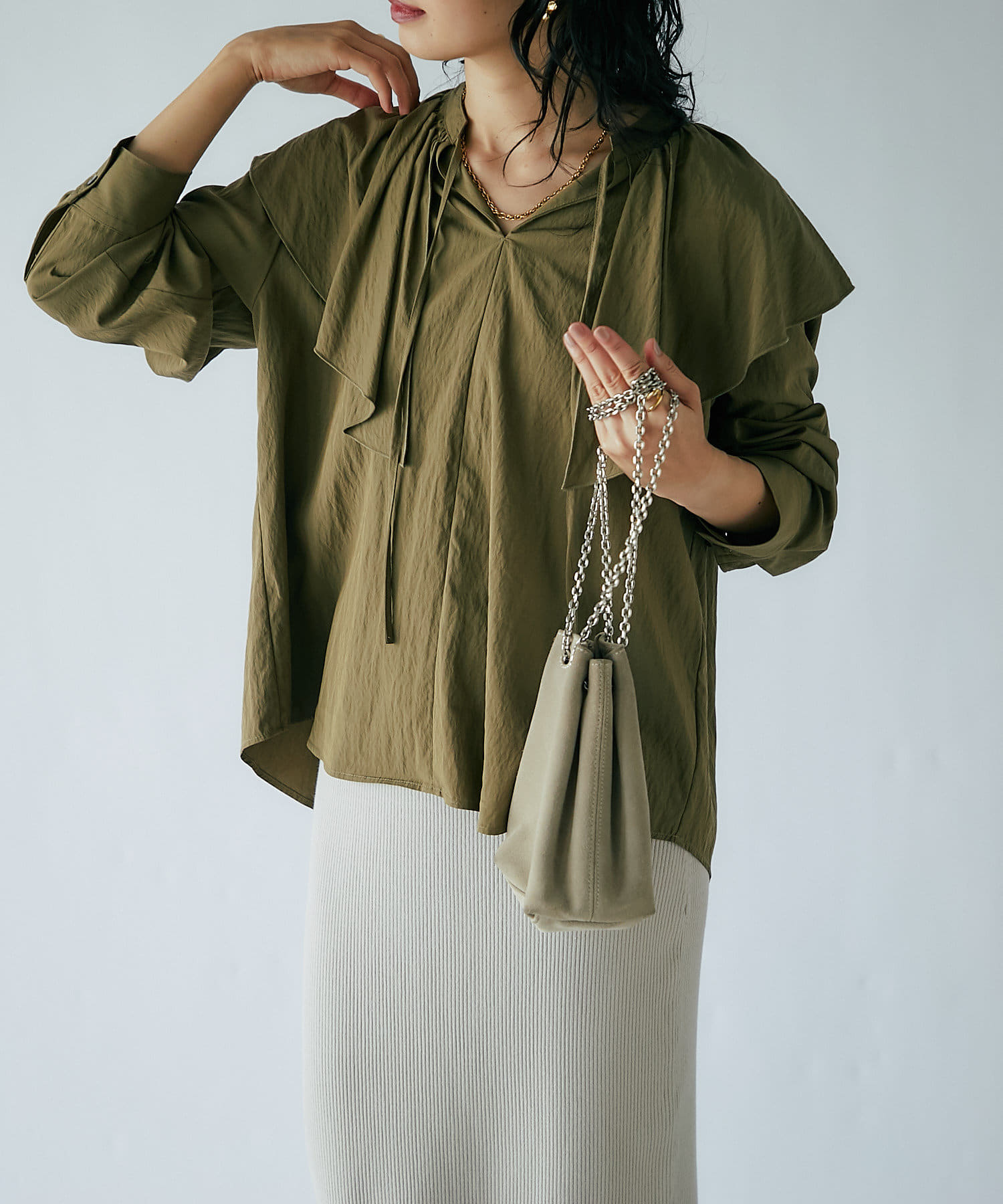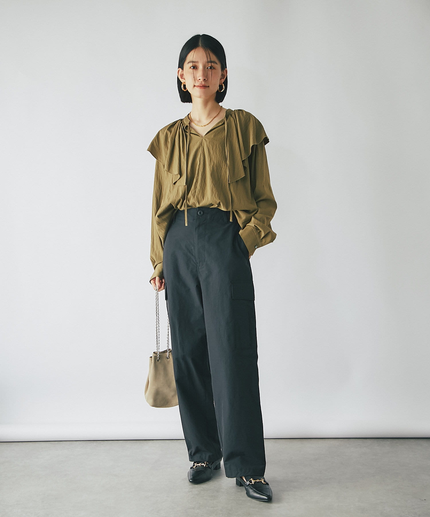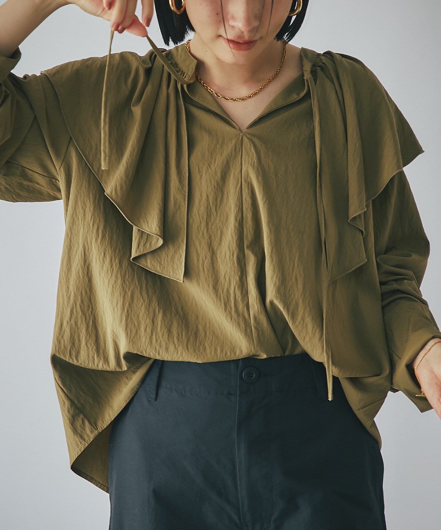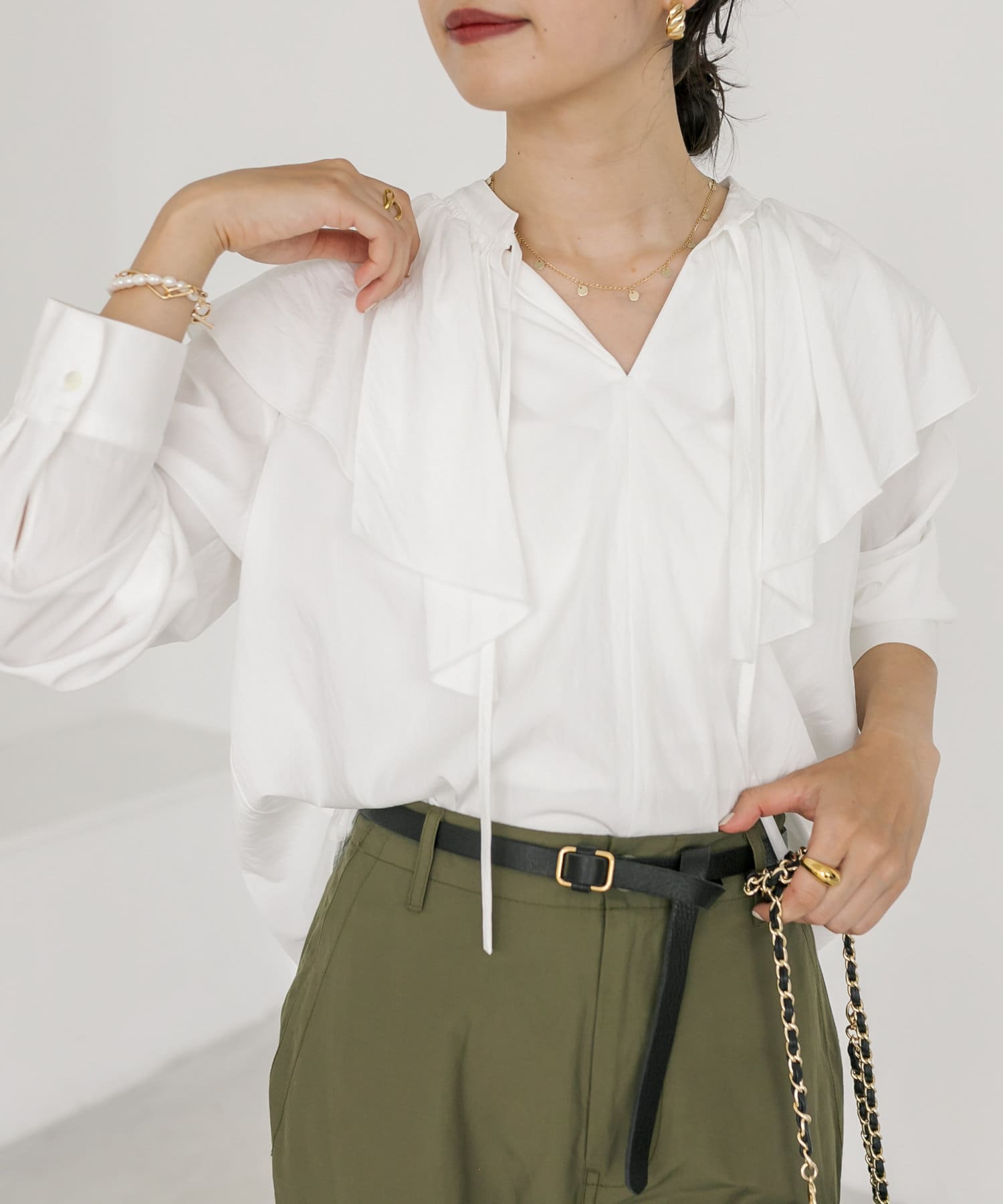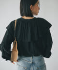 大きめのフリルデザインが華やかなブラウスが登場。