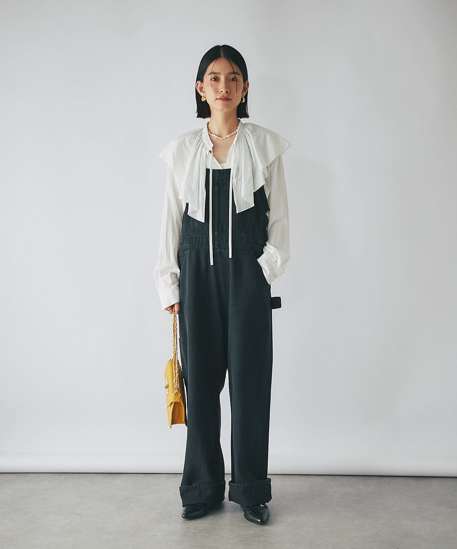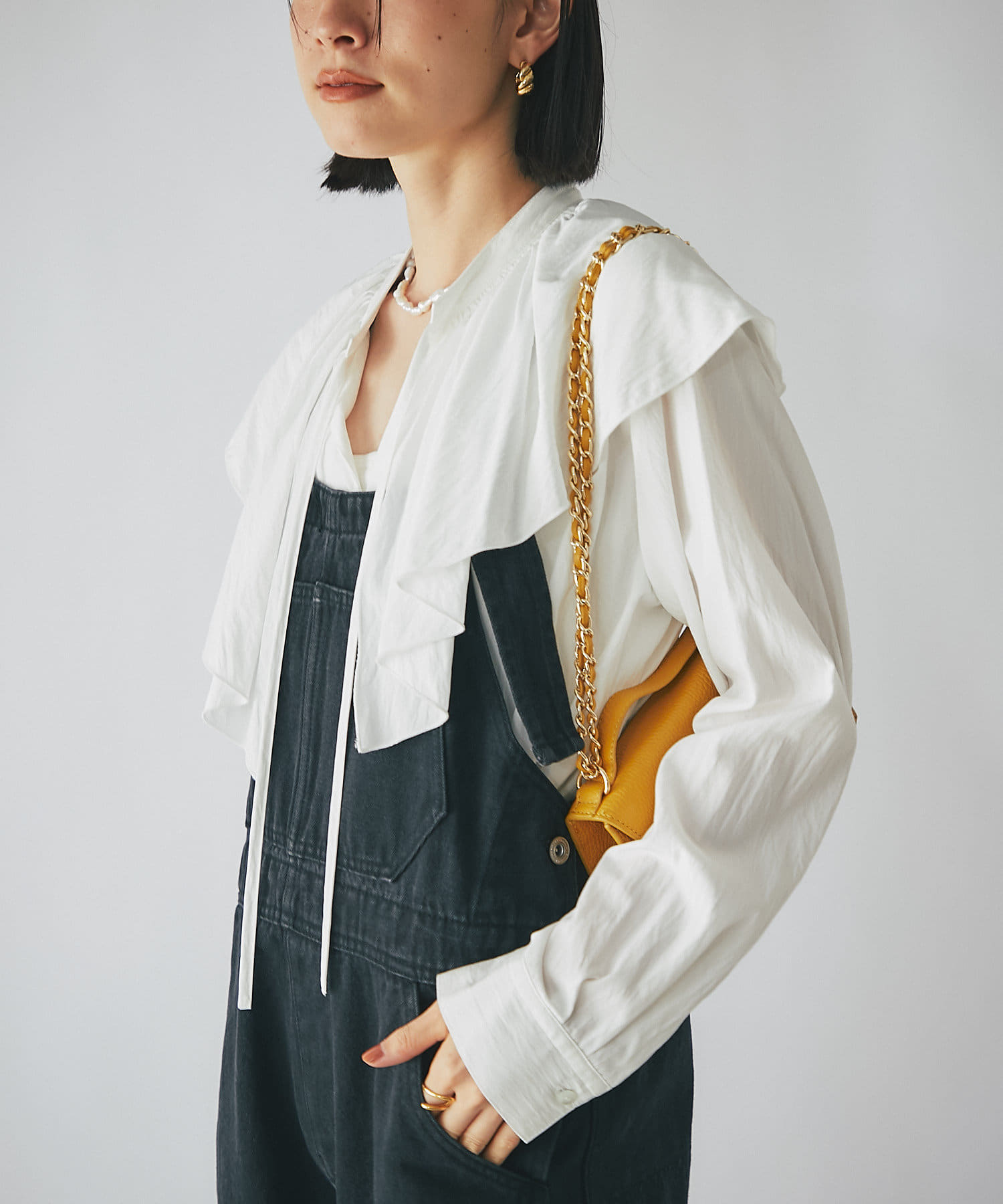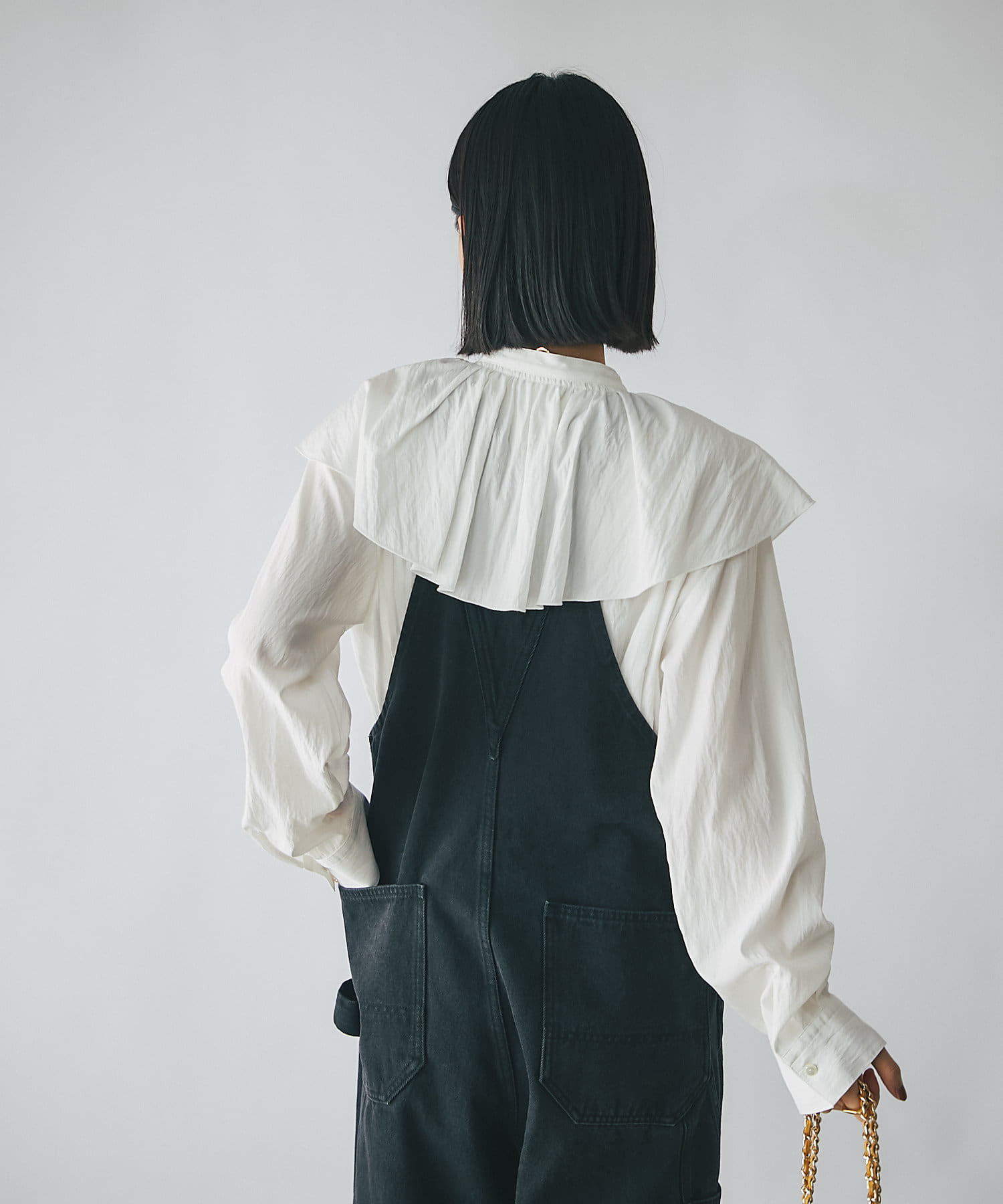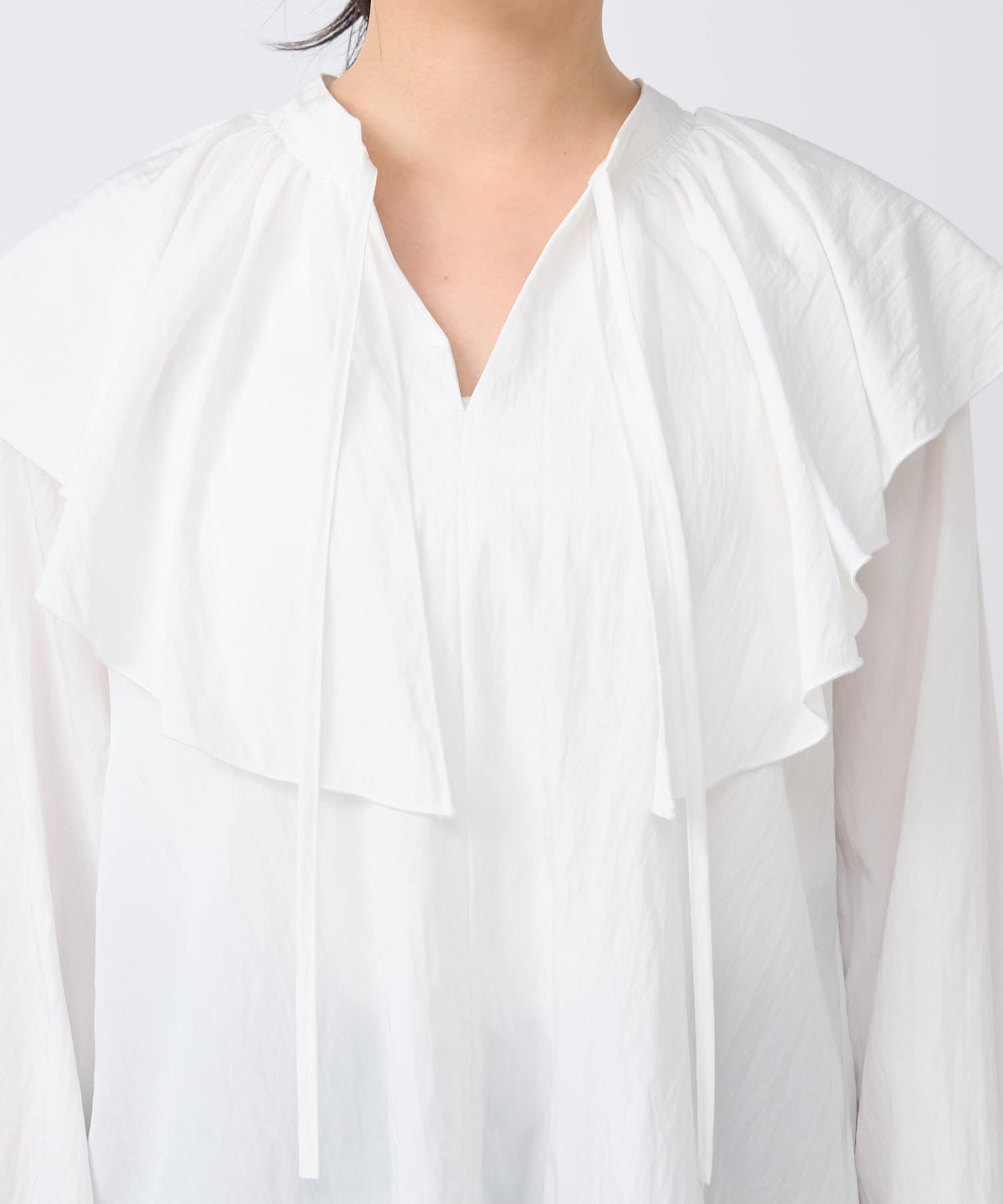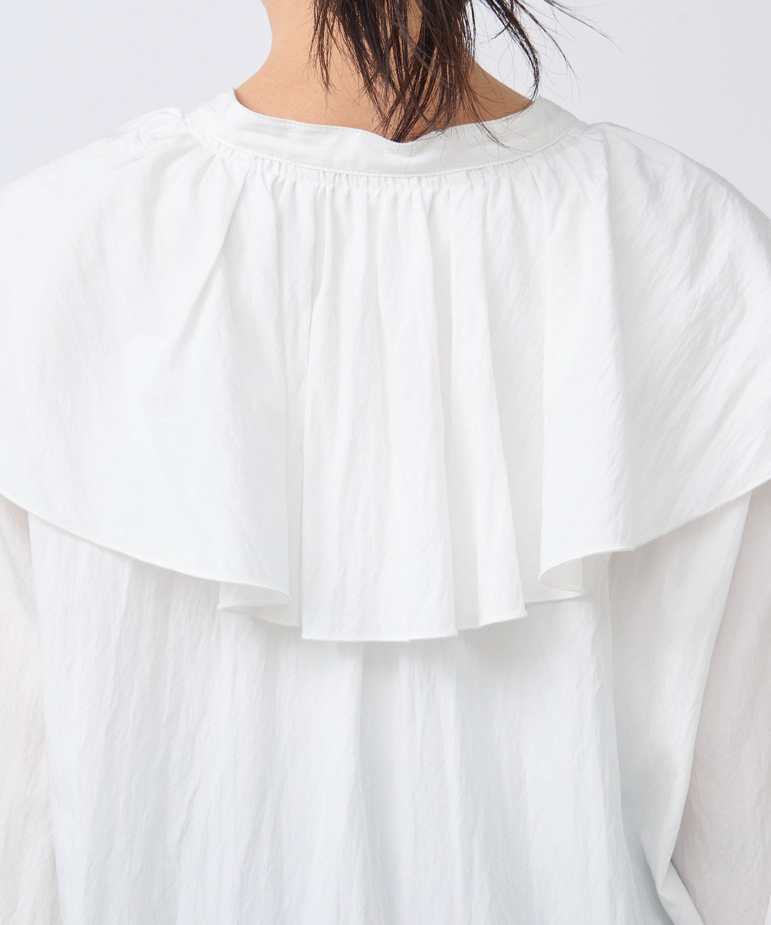 肩周りを覆う大きめのフリルカラーは、お顔回りに華やかさをプラスしてくれます。
