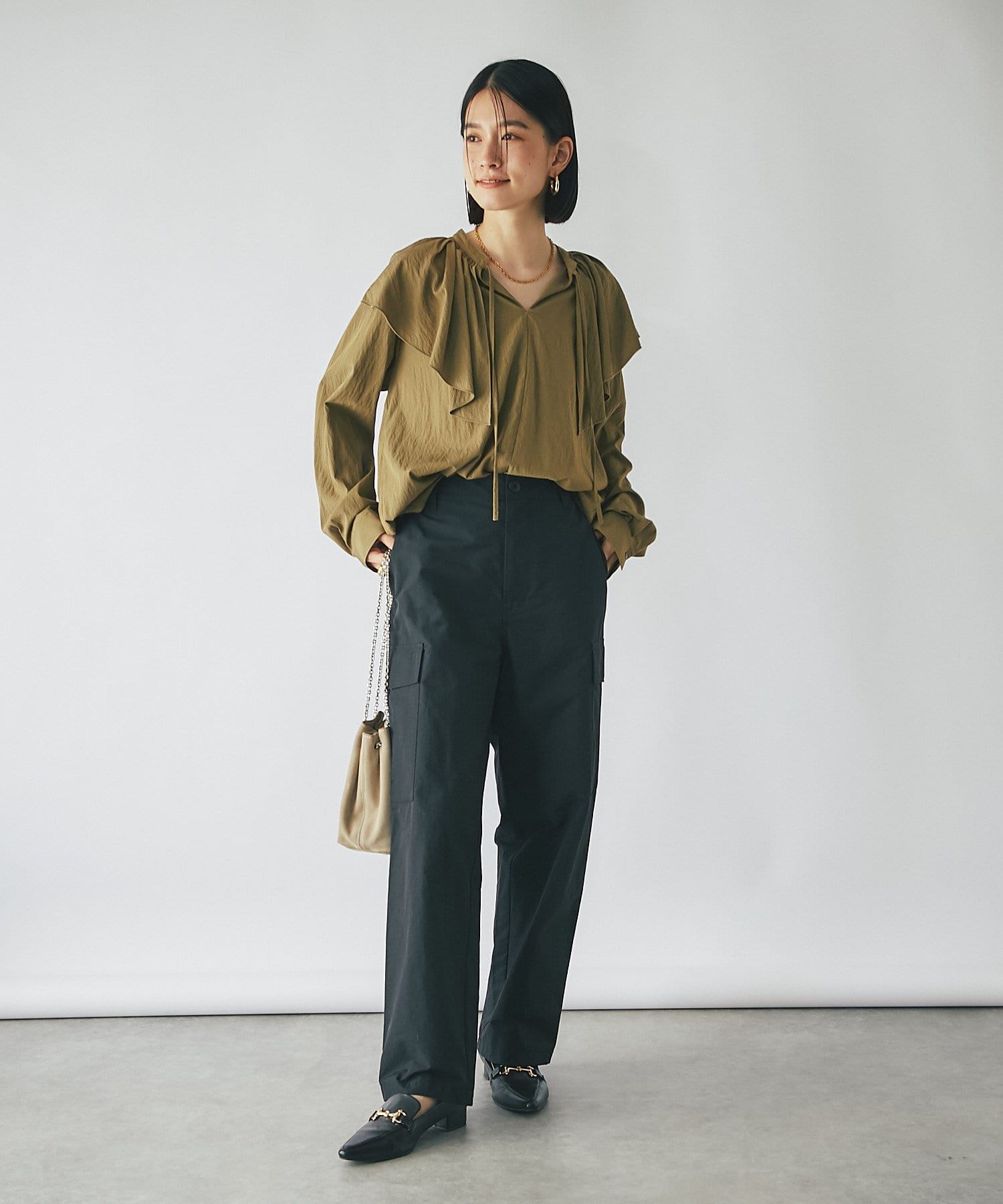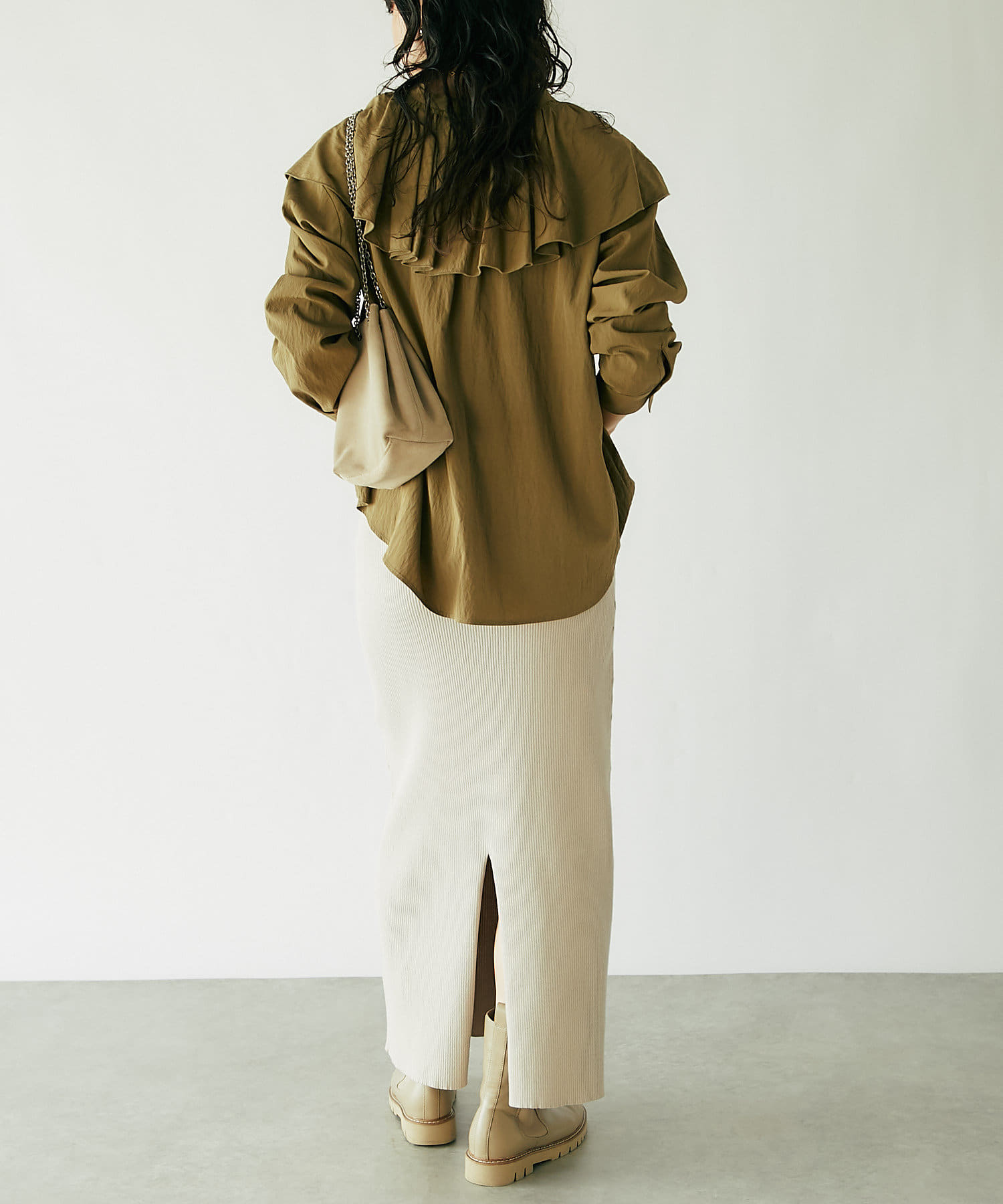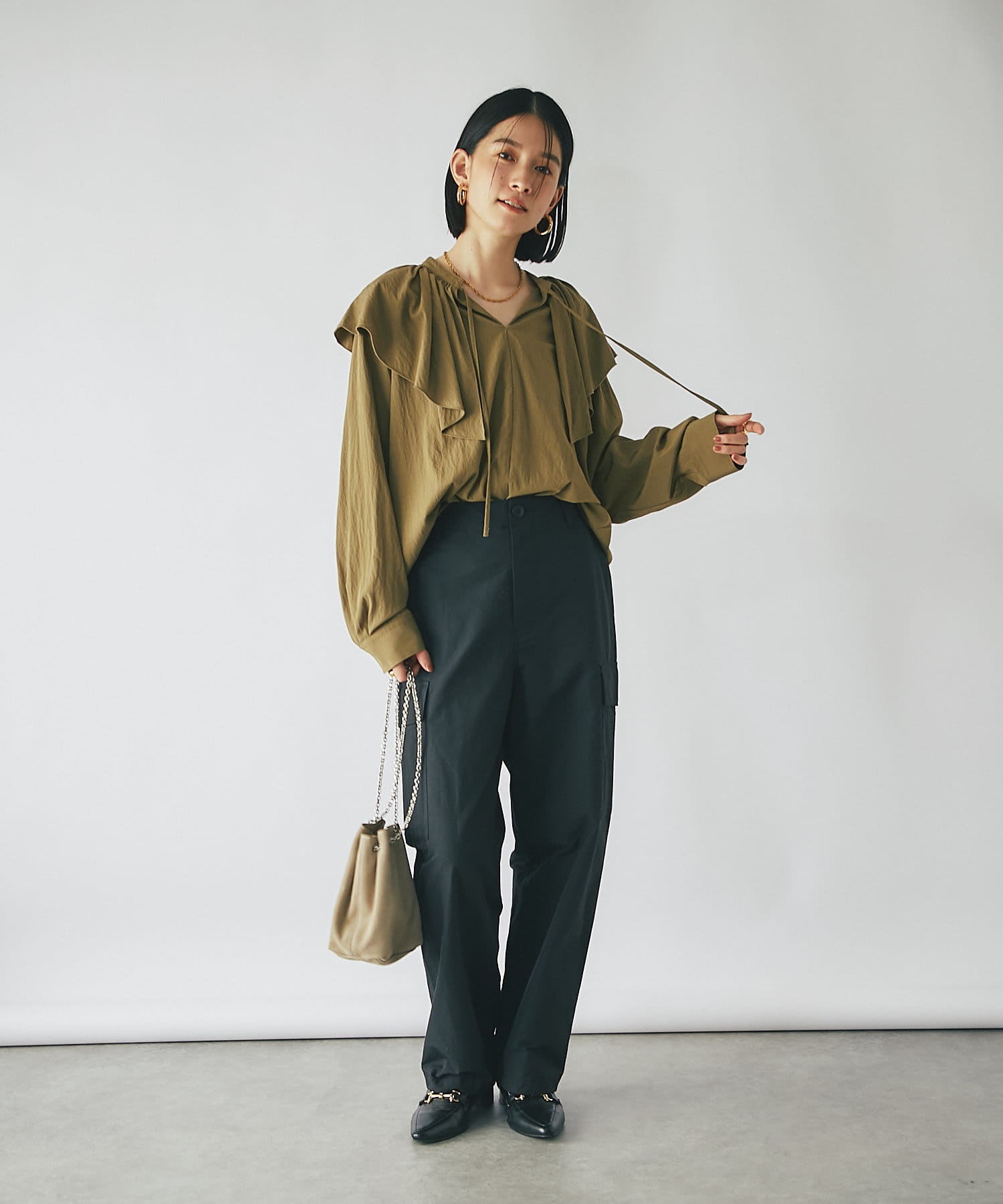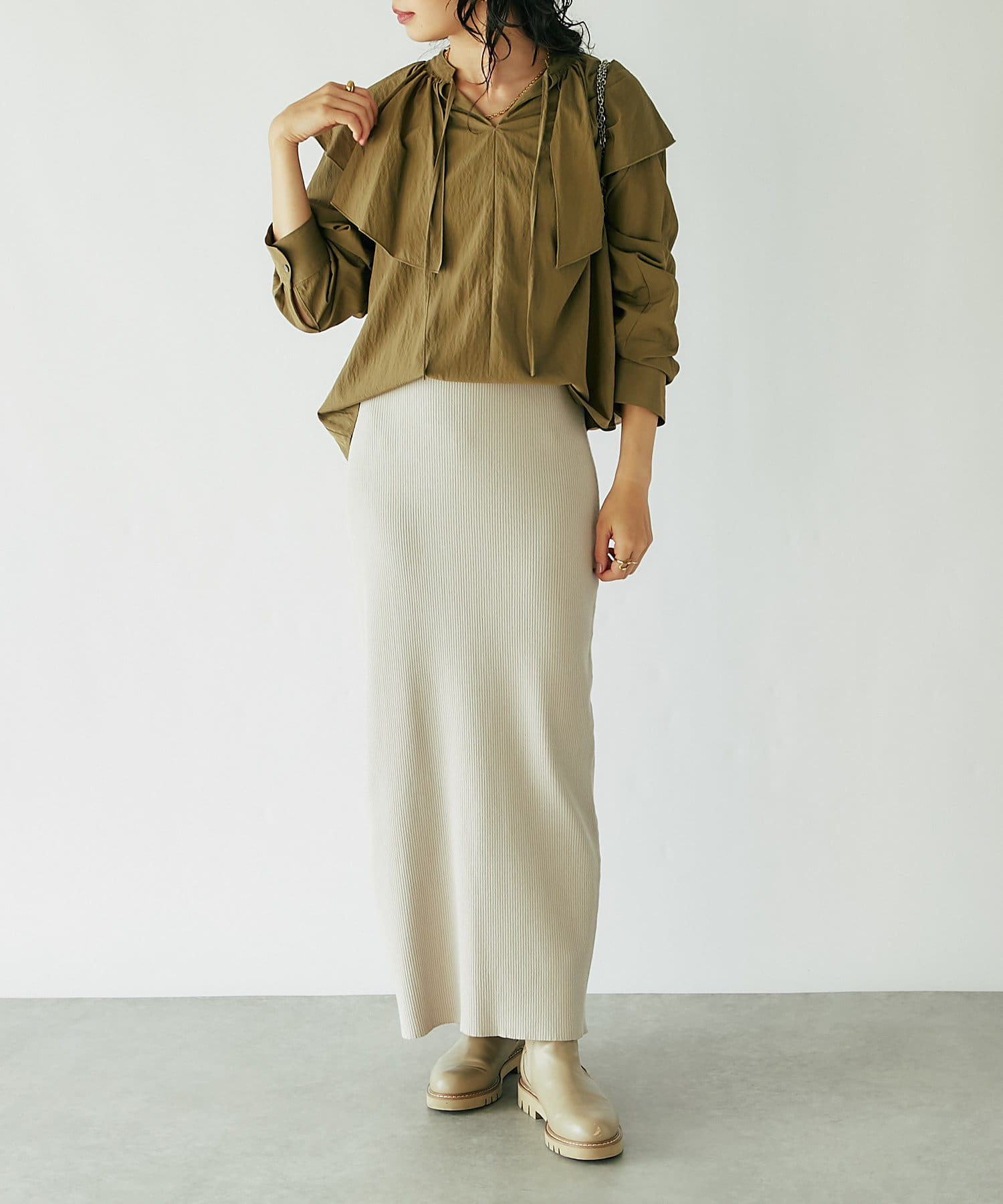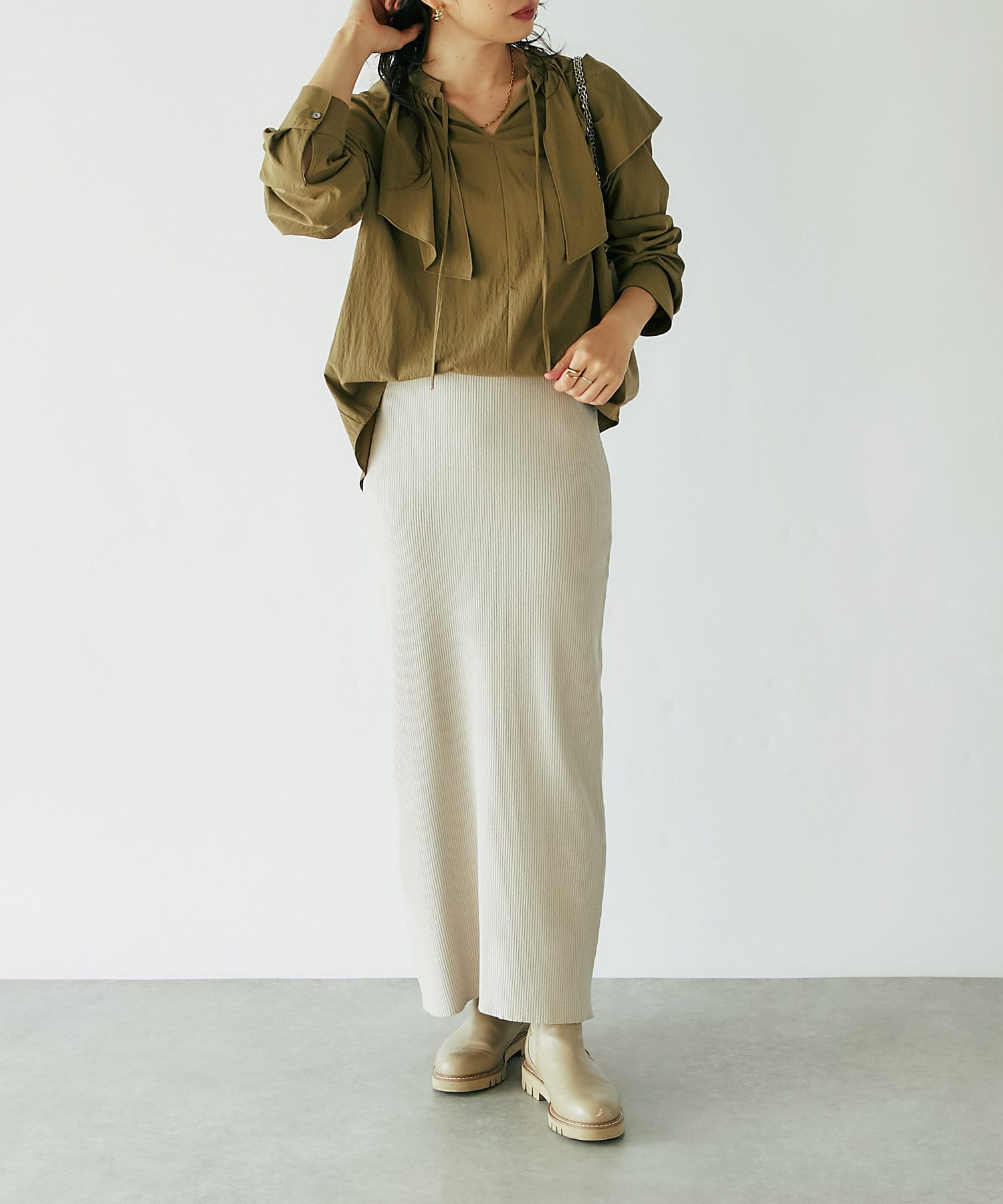 ベーシックに使えるオフホワイト、ブラックと、秋のムードを感じさせるカーキの3色展開。