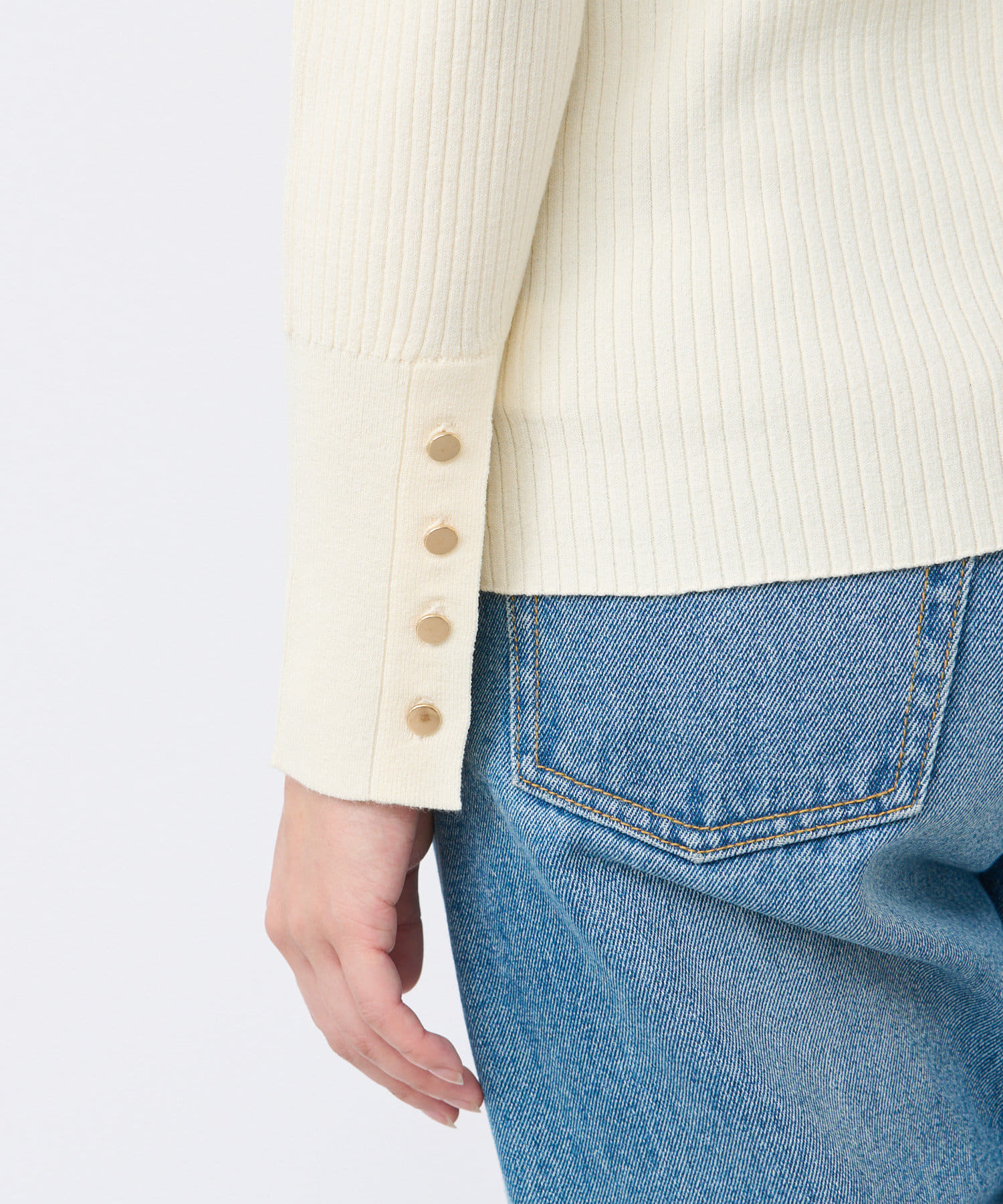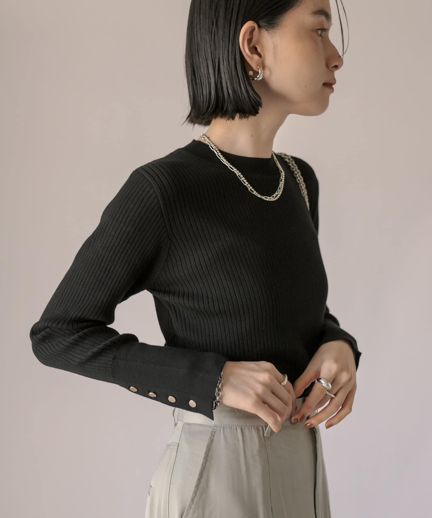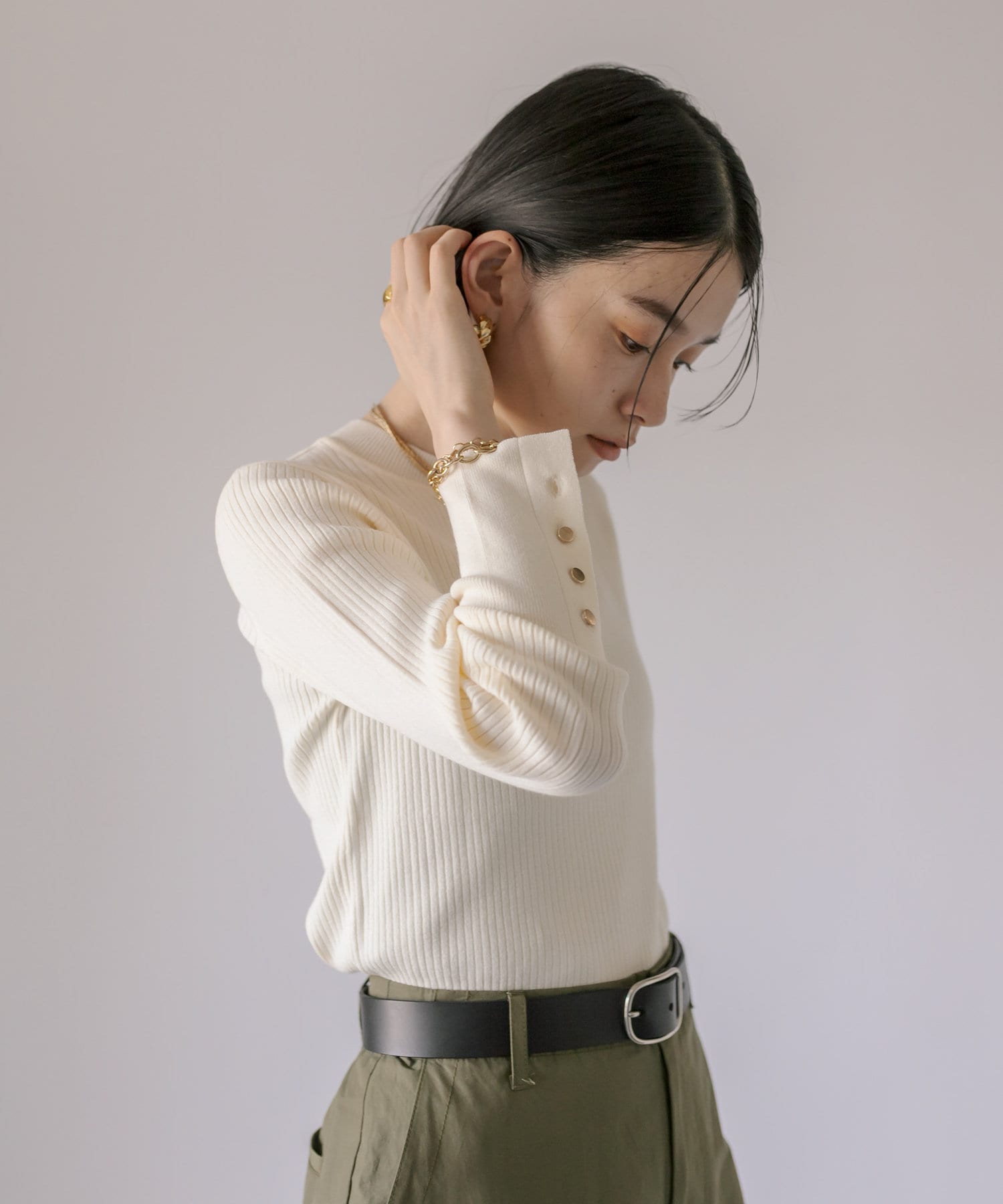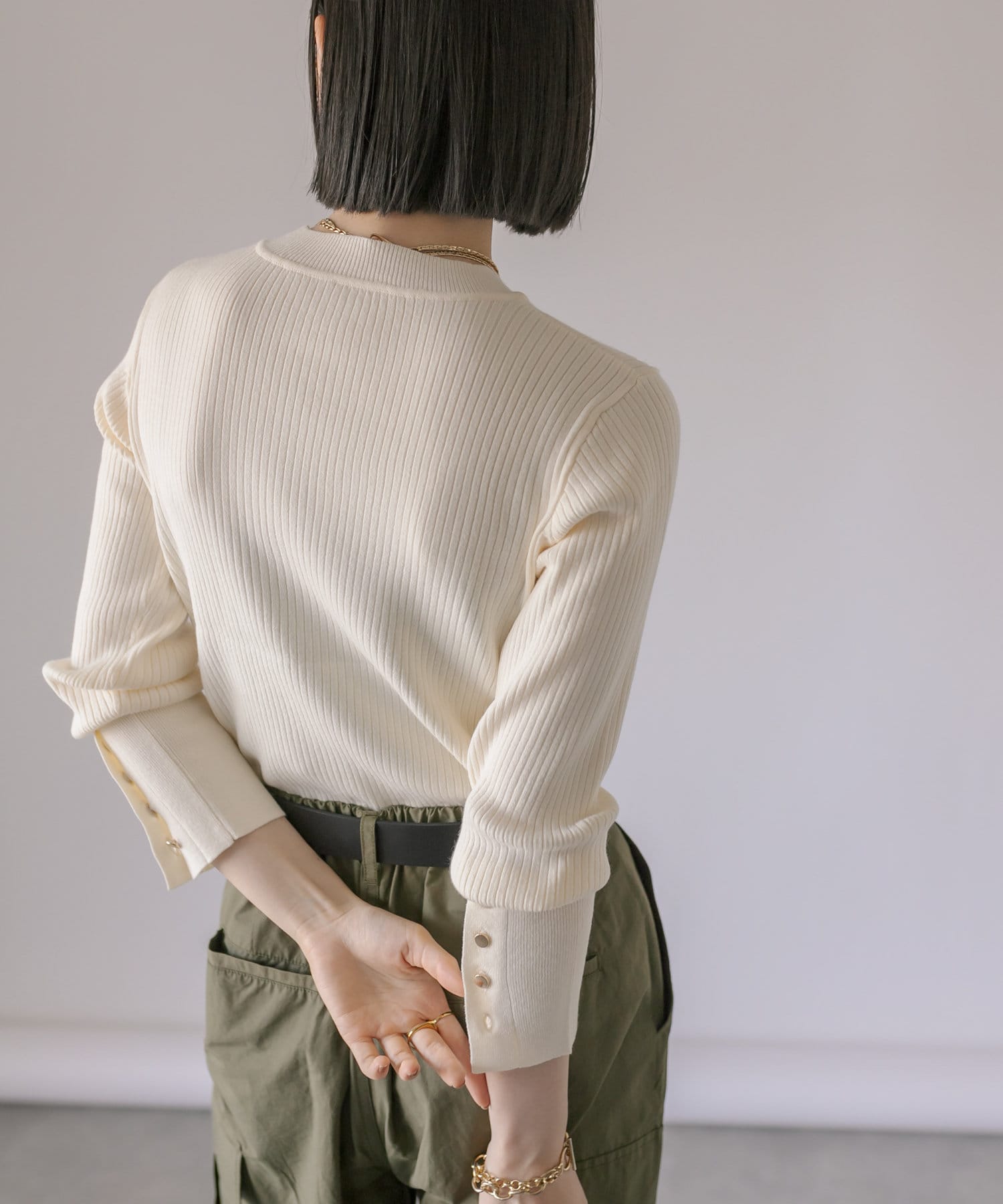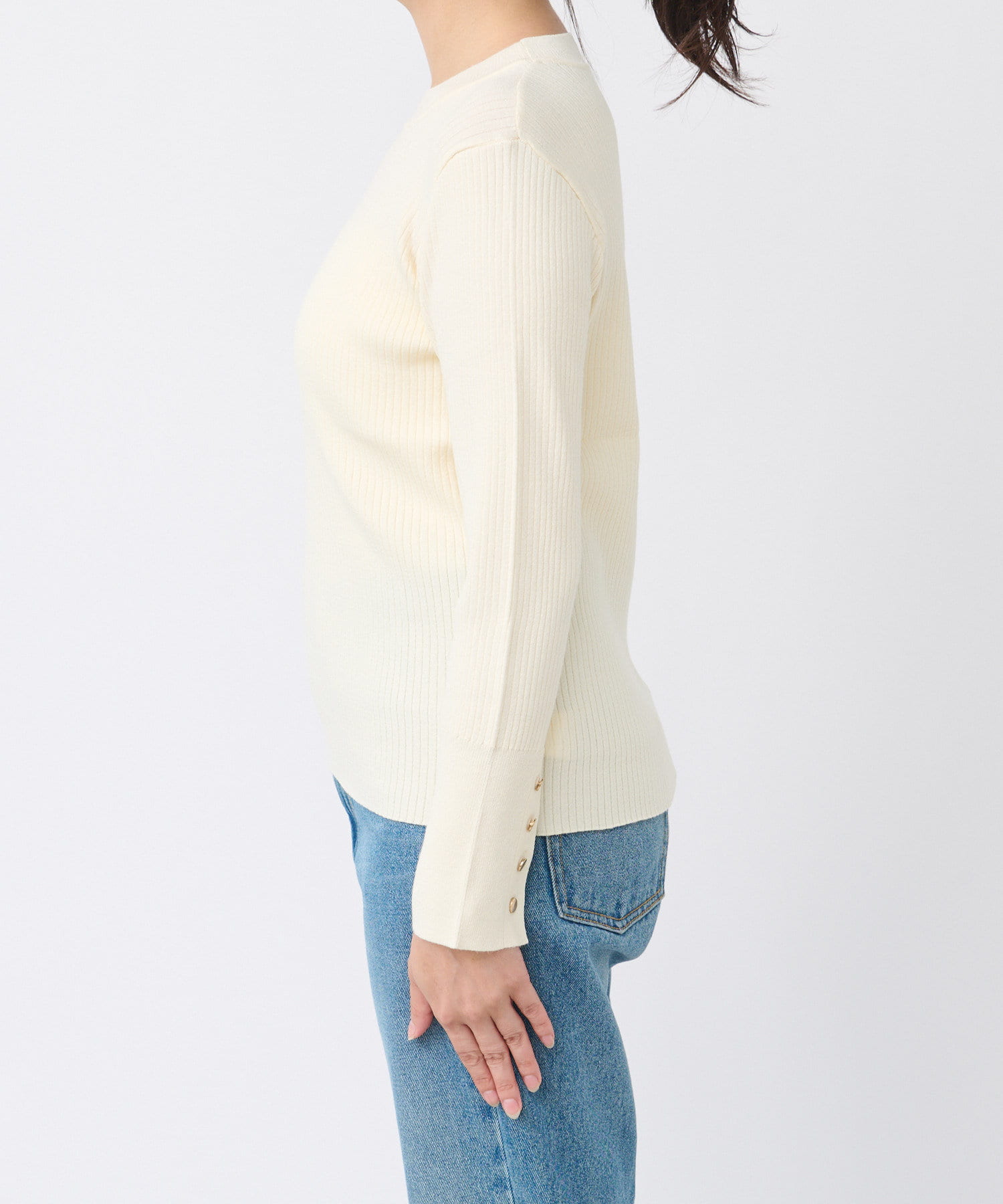袖口に施されたボタンあきのデザインがアクセントになるニットプルオーバー。