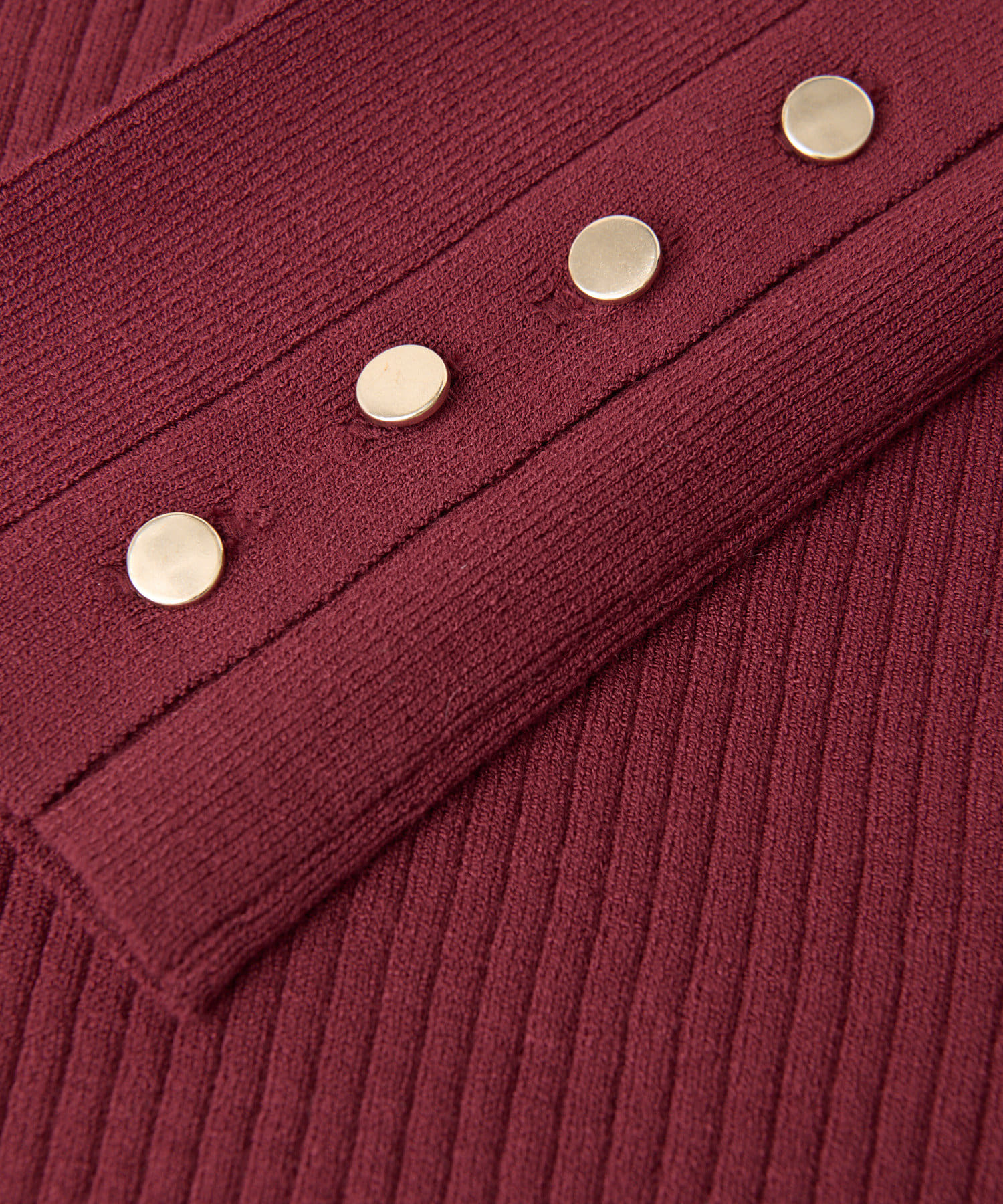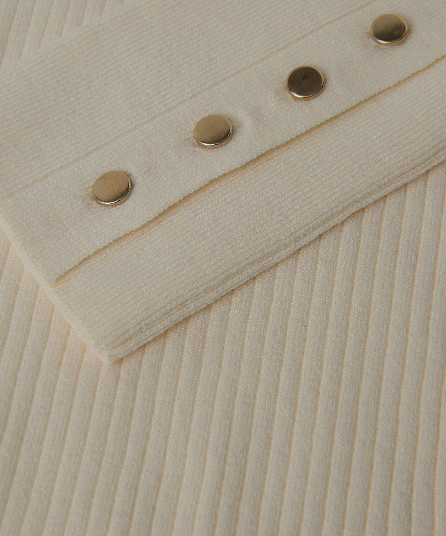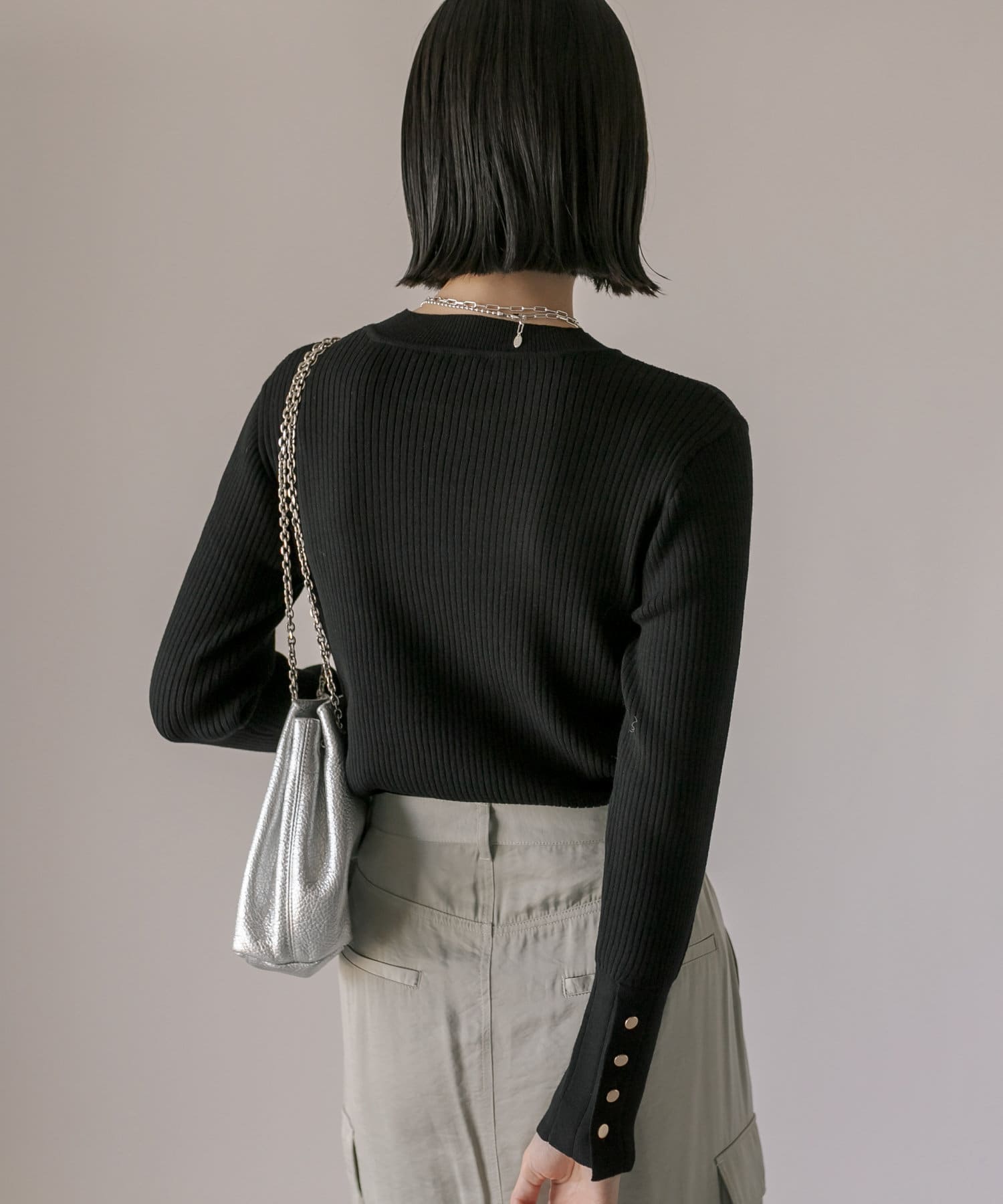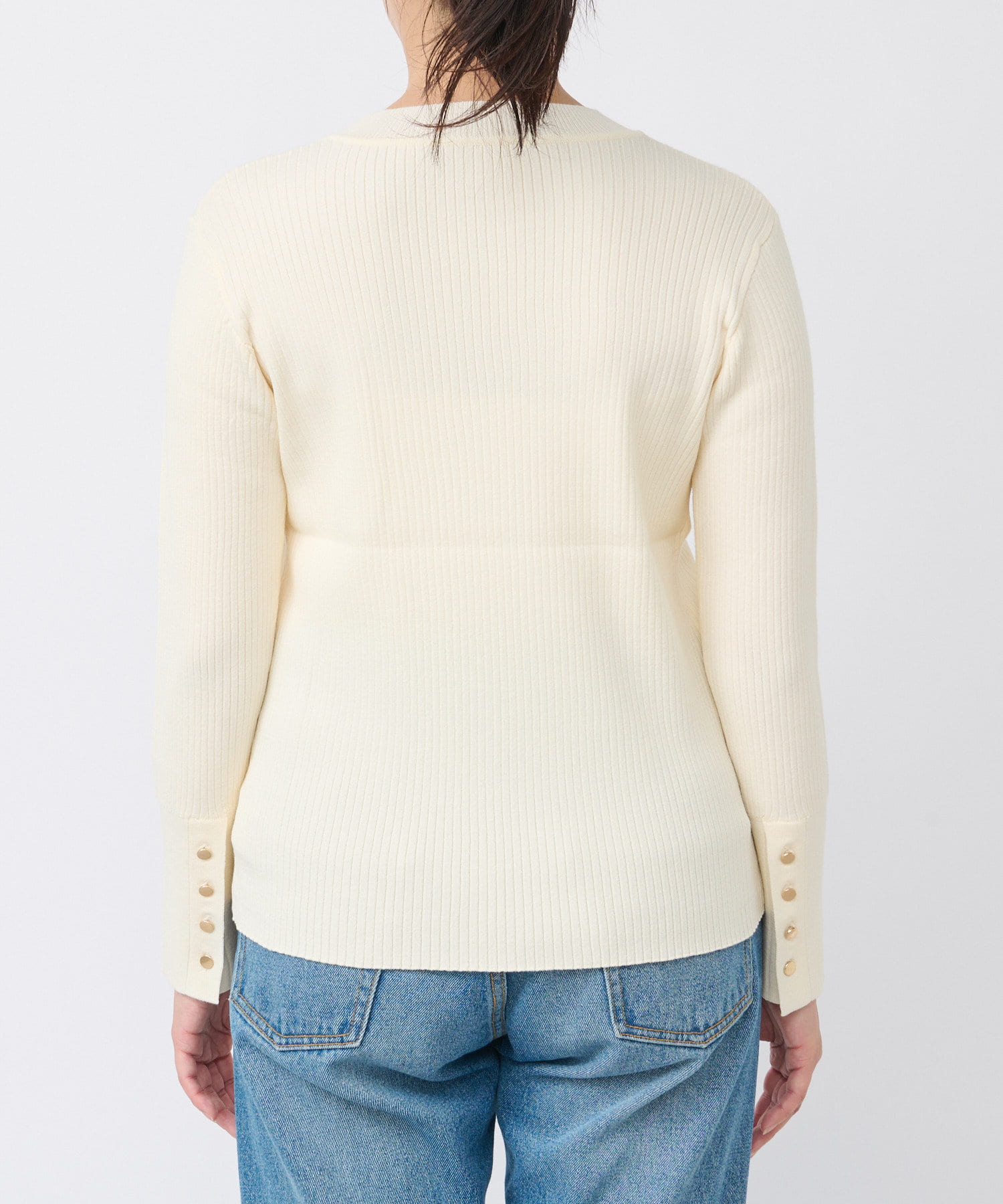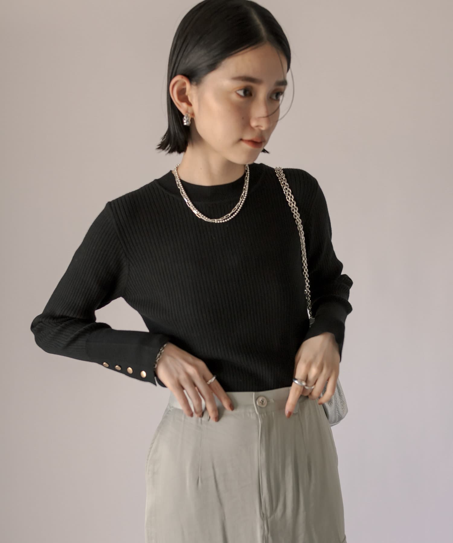 袖口に施されたボタンあきのデザインがアクセントになるニットプルオーバー。