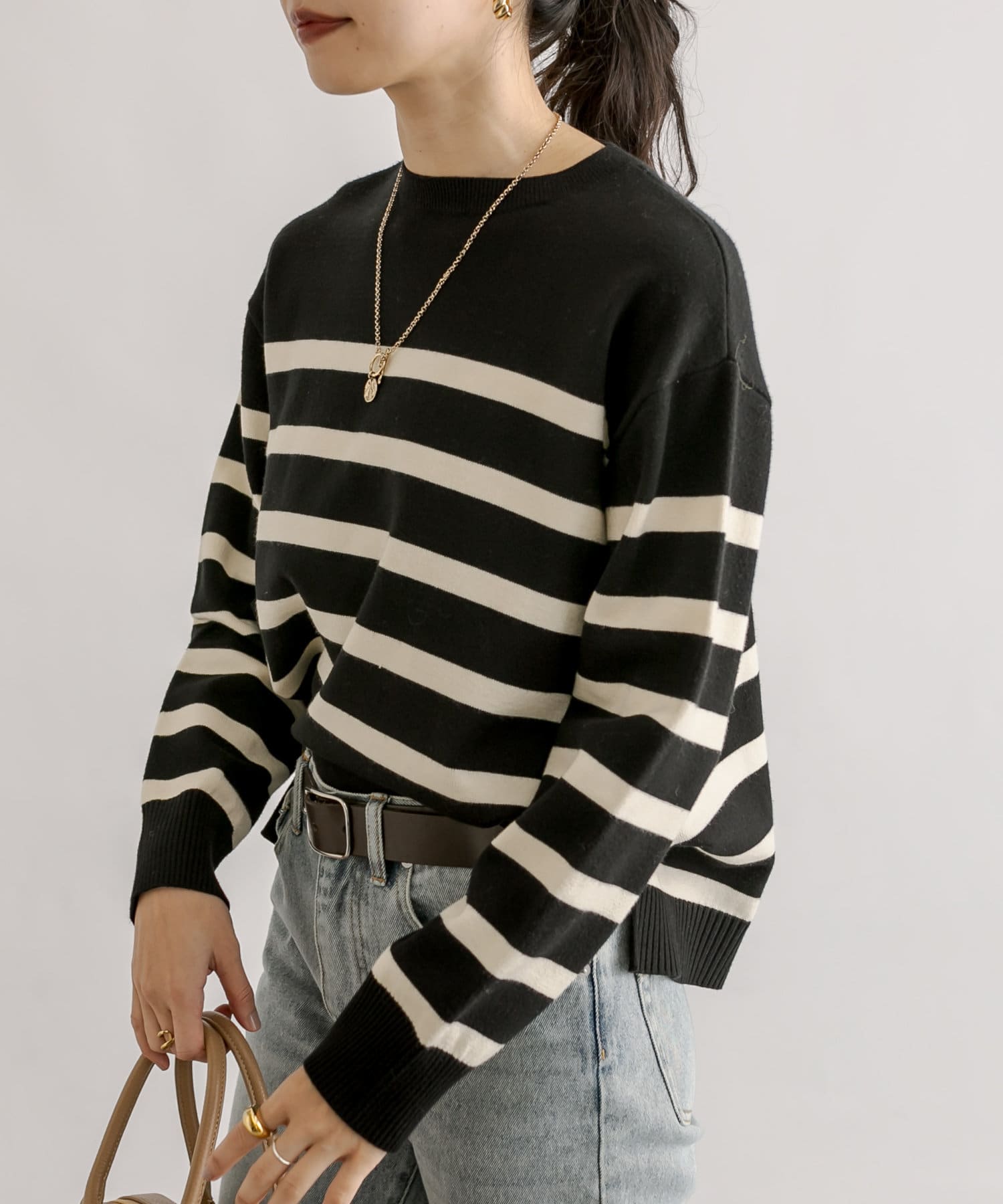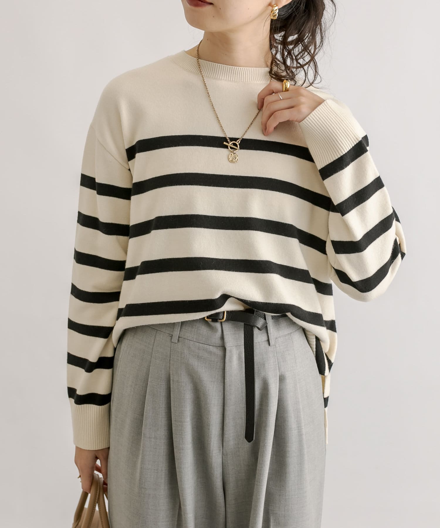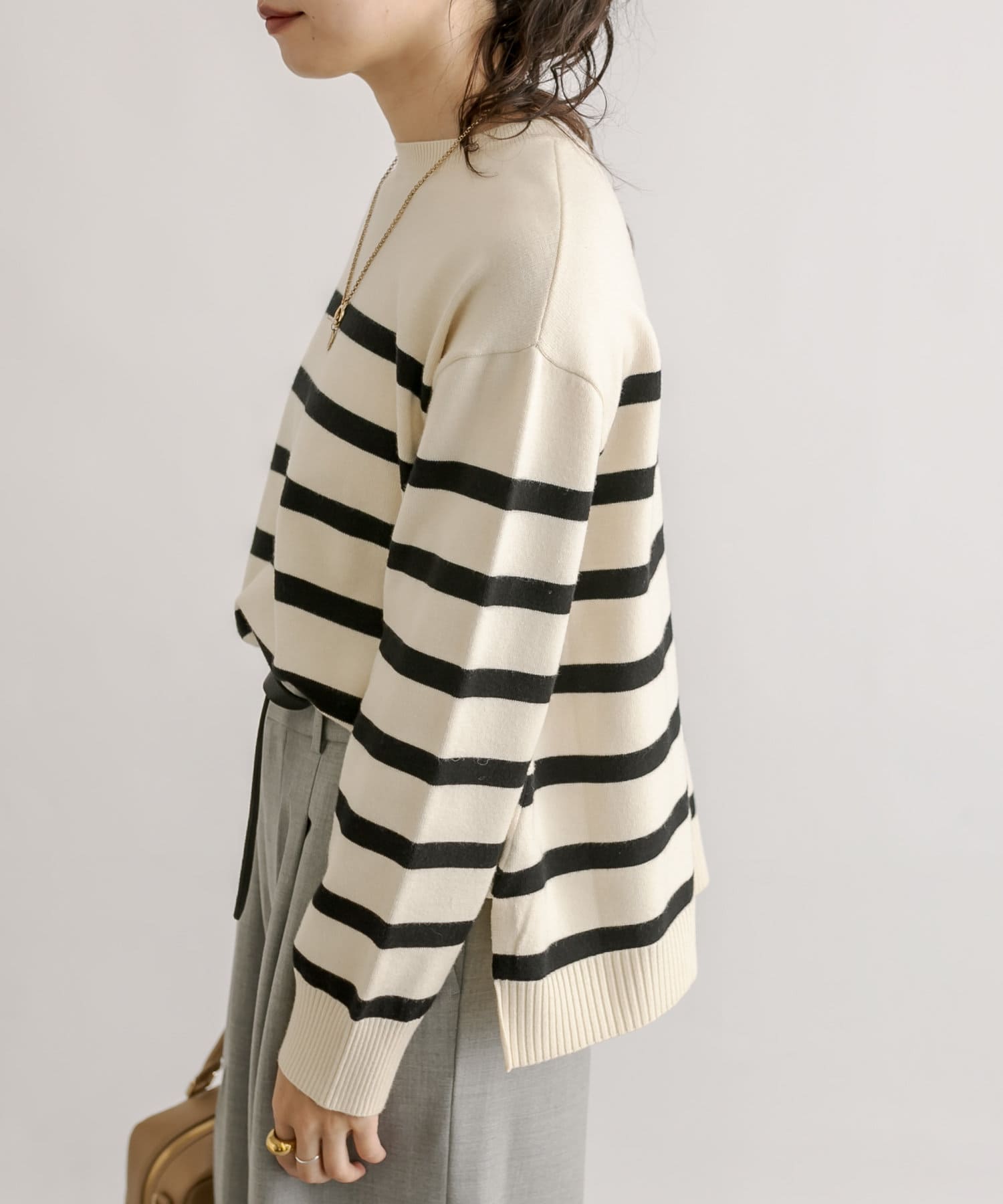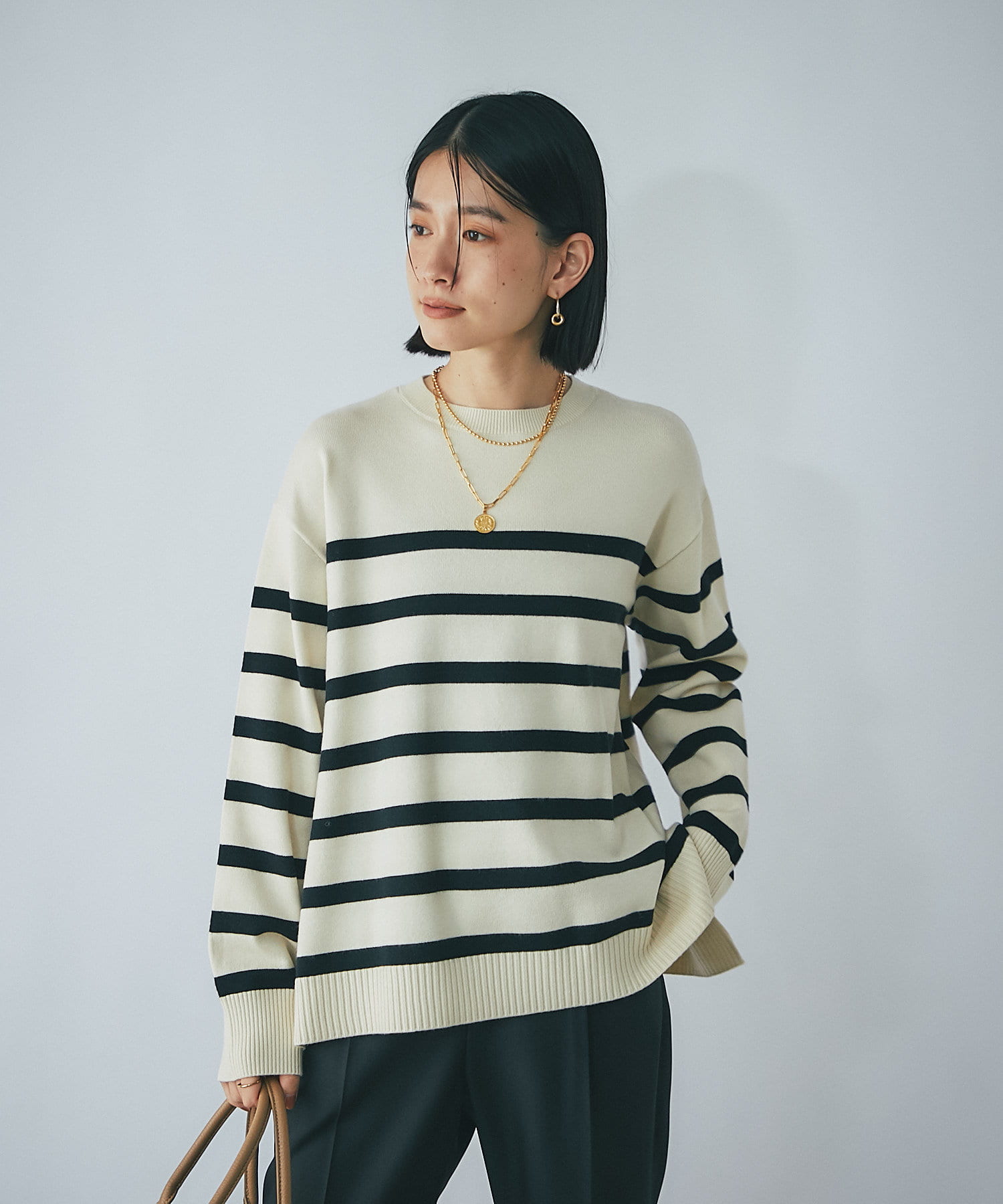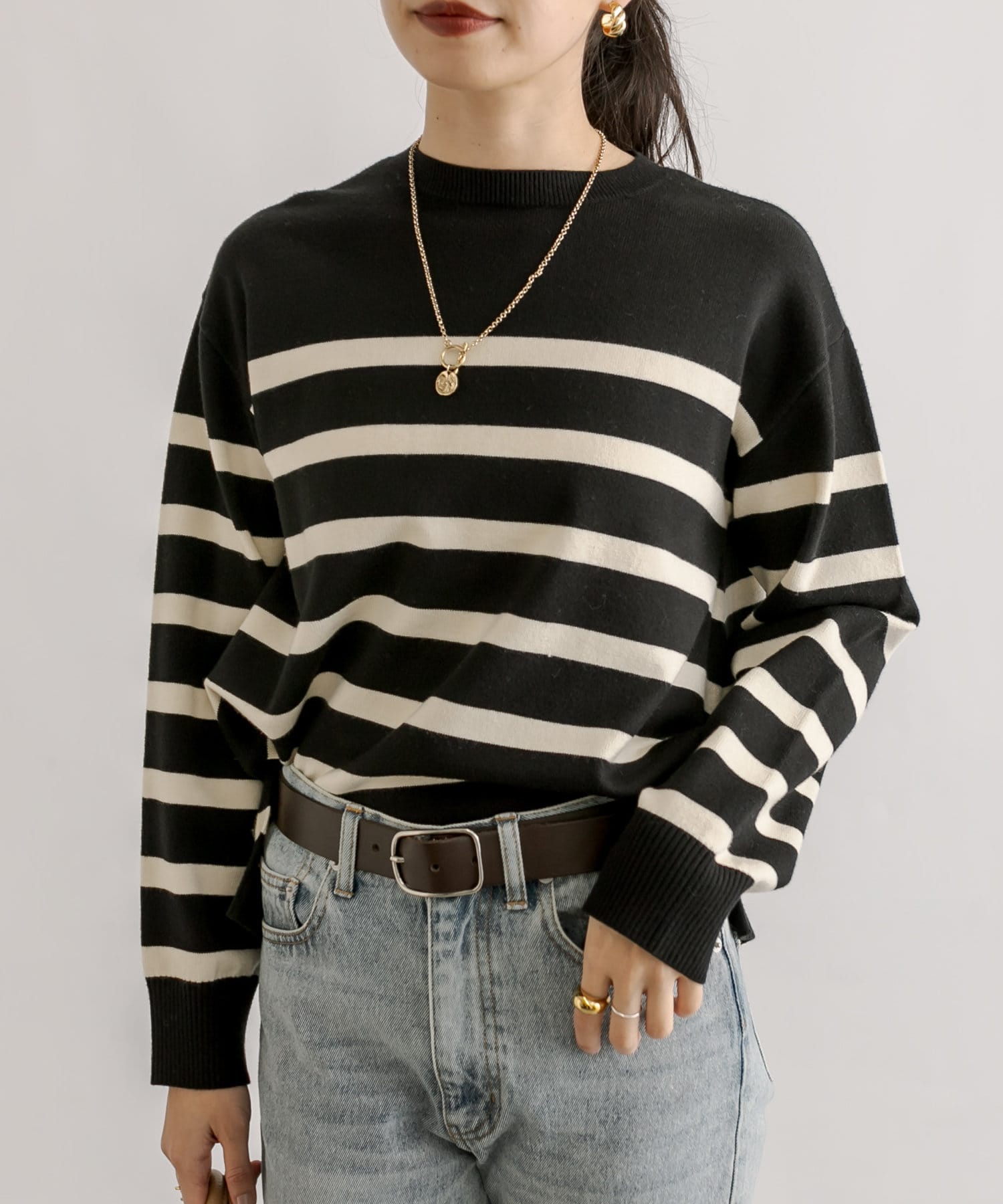 毎年人気のボーダーニット。程よい厚みとゆったり感のニットは、一枚で着てもシャツやシアーアイテムとレイヤードしても様になる一枚です。