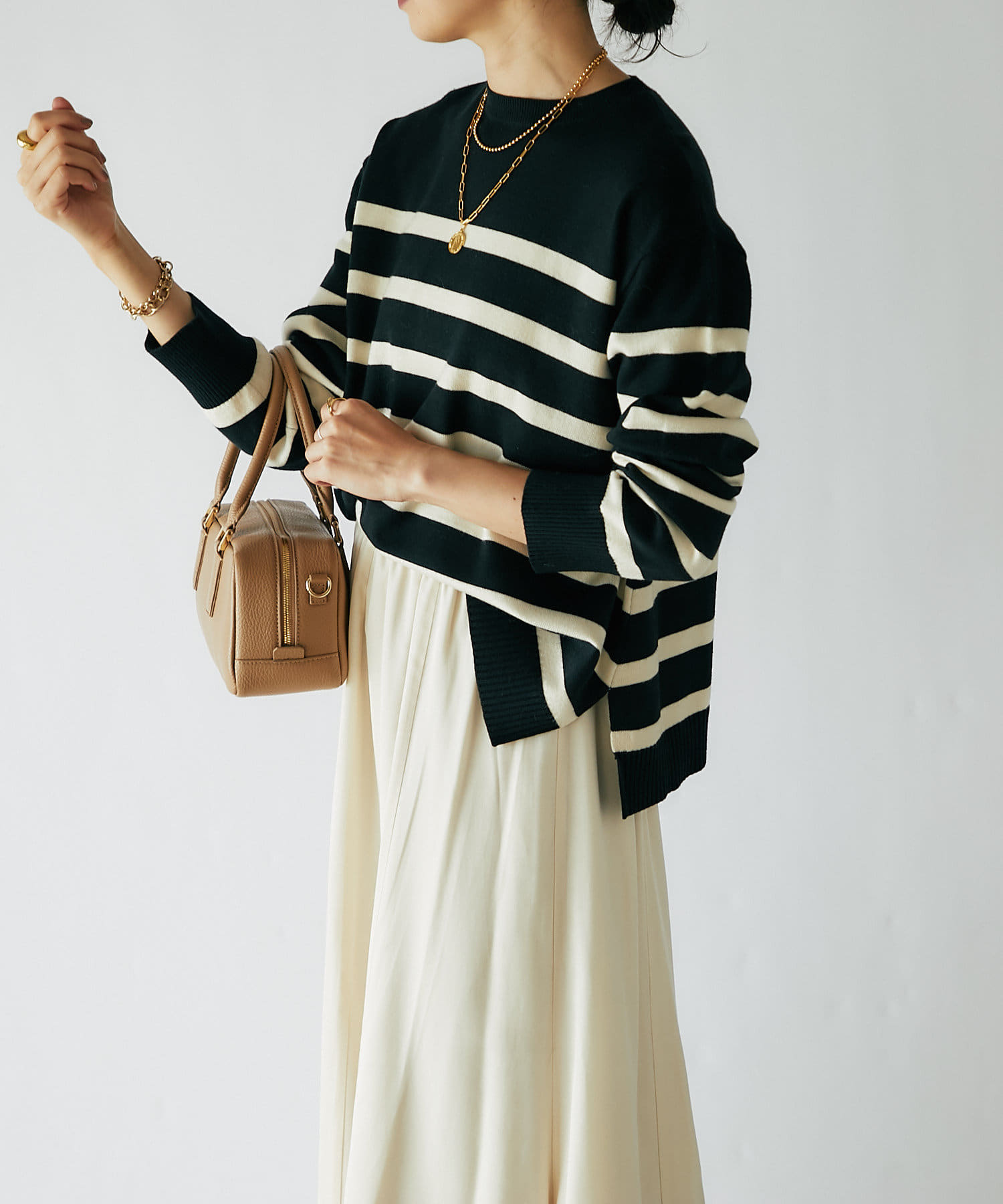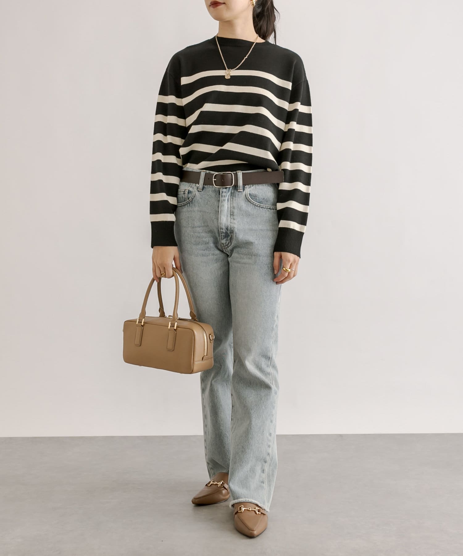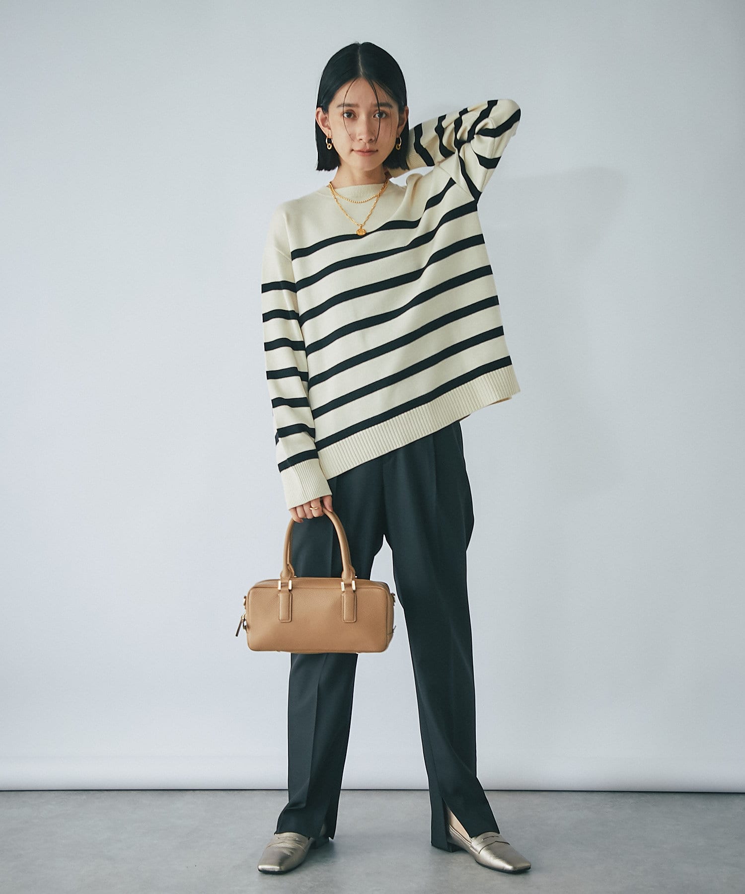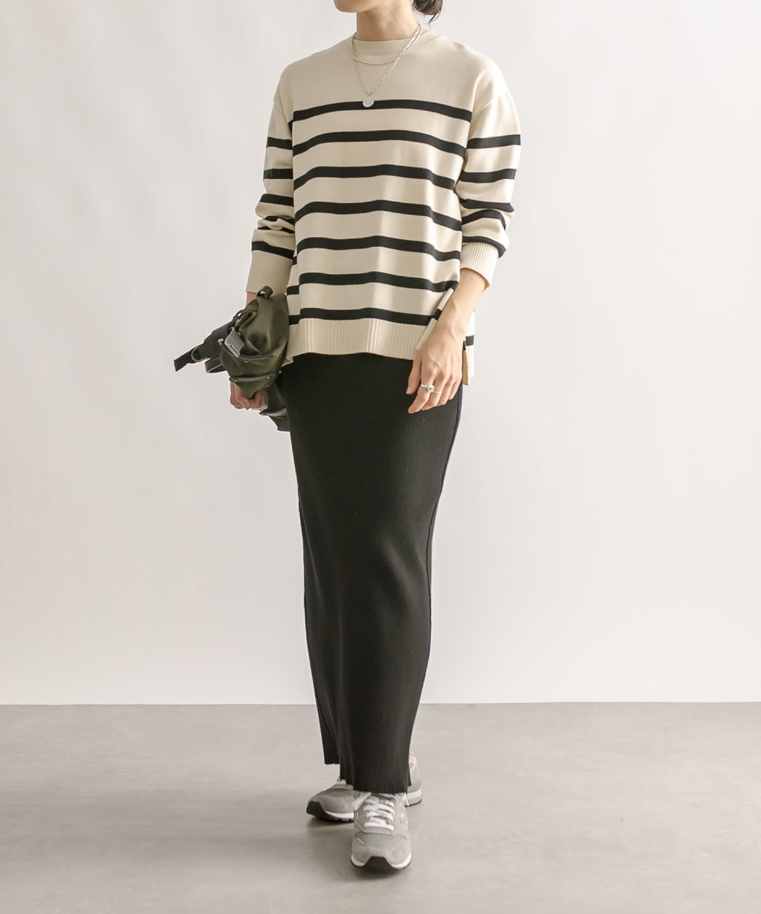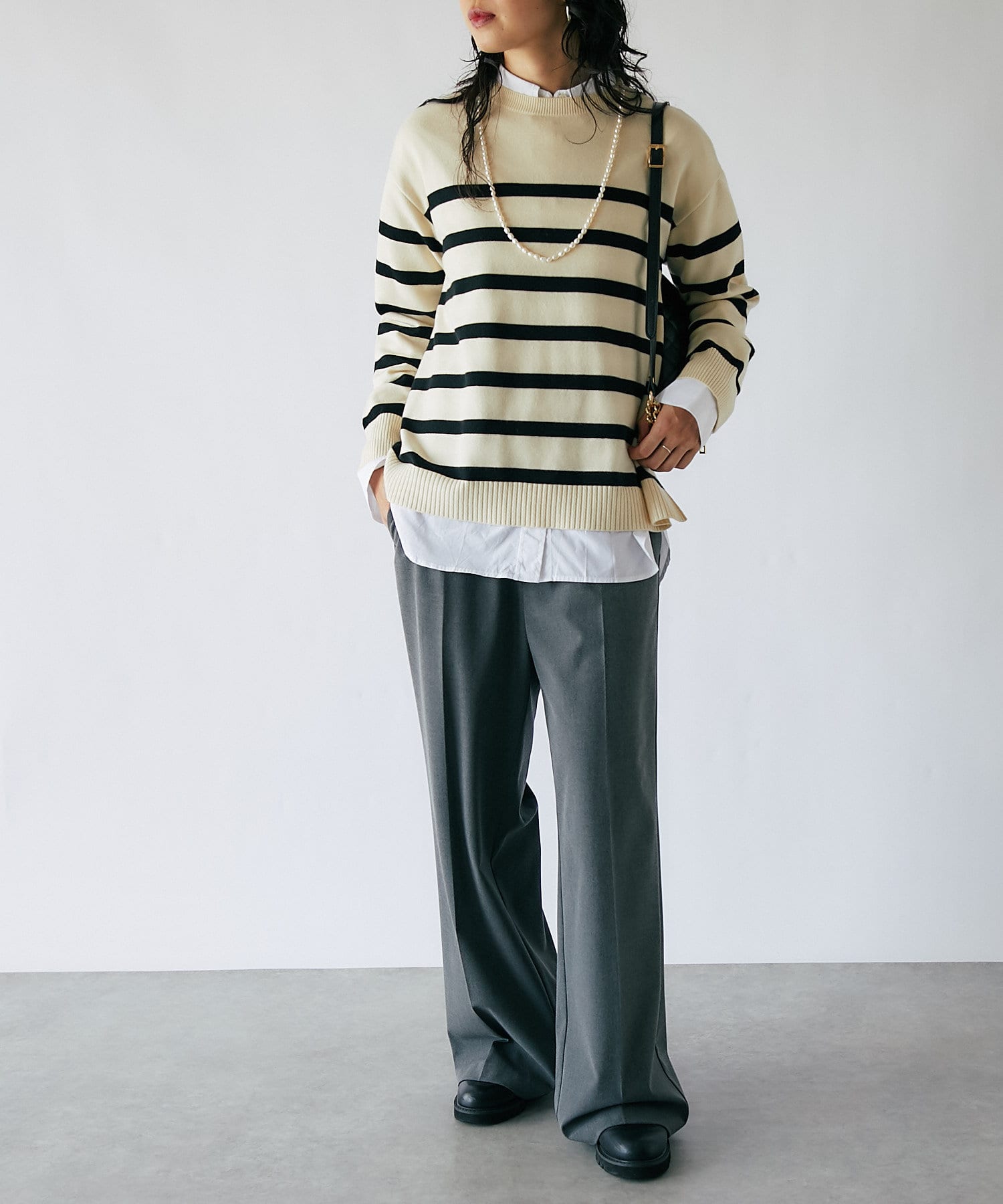 毎年人気のボーダーニット。程よい厚みとゆったり感のニットは、一枚で着てもシャツやシアーアイテムとレイヤードしても様になる一枚です。