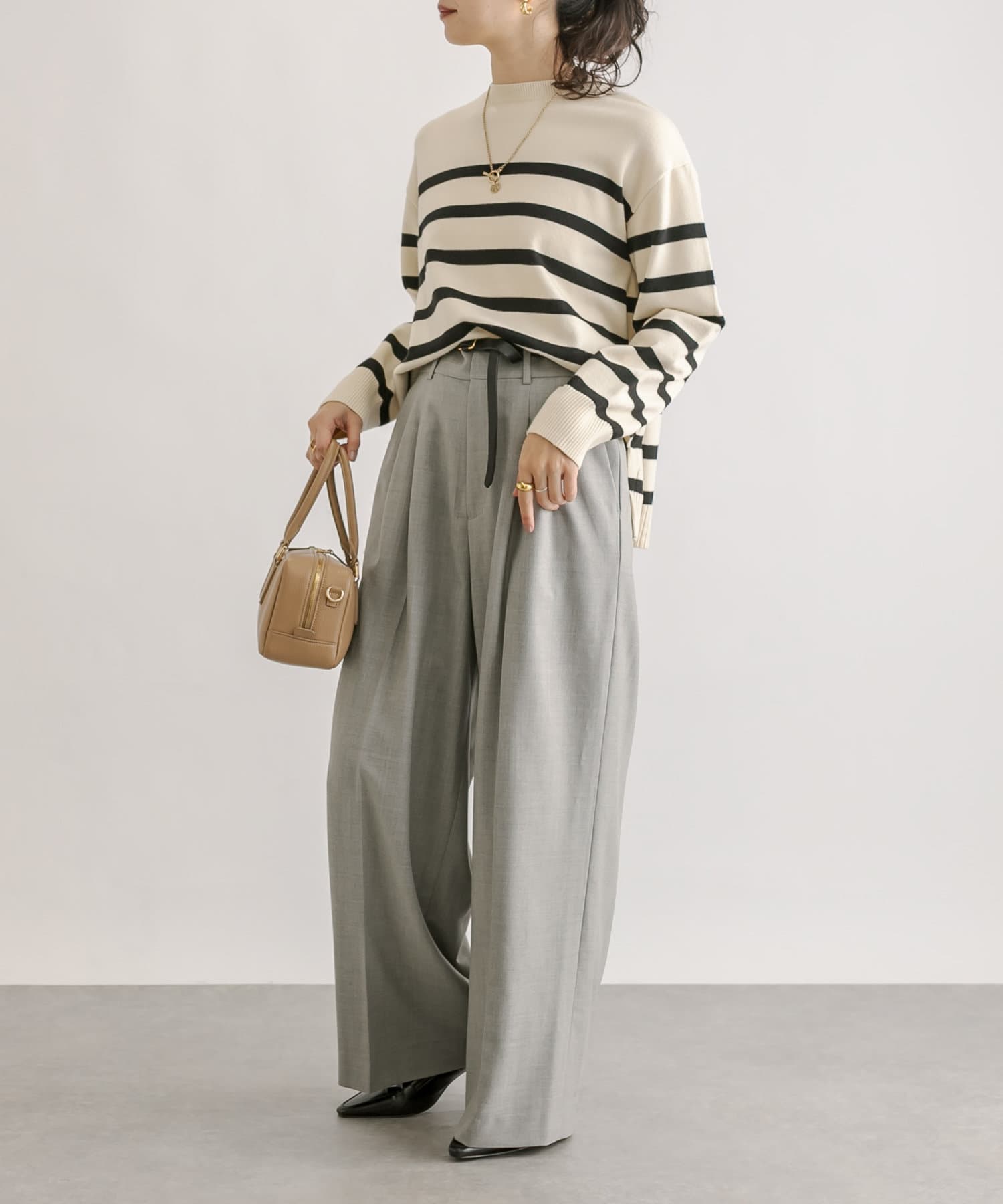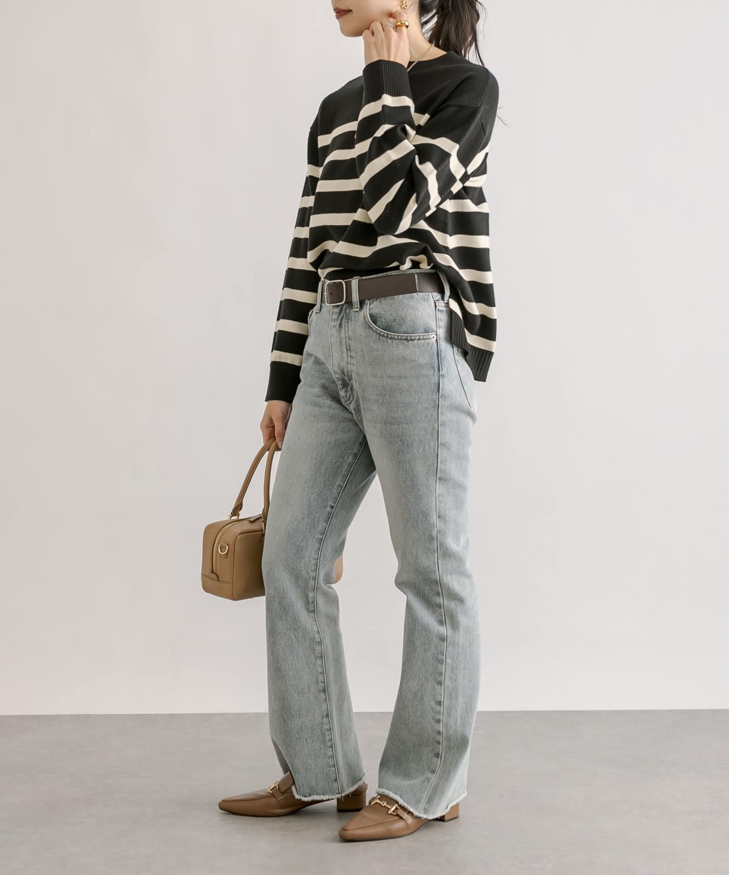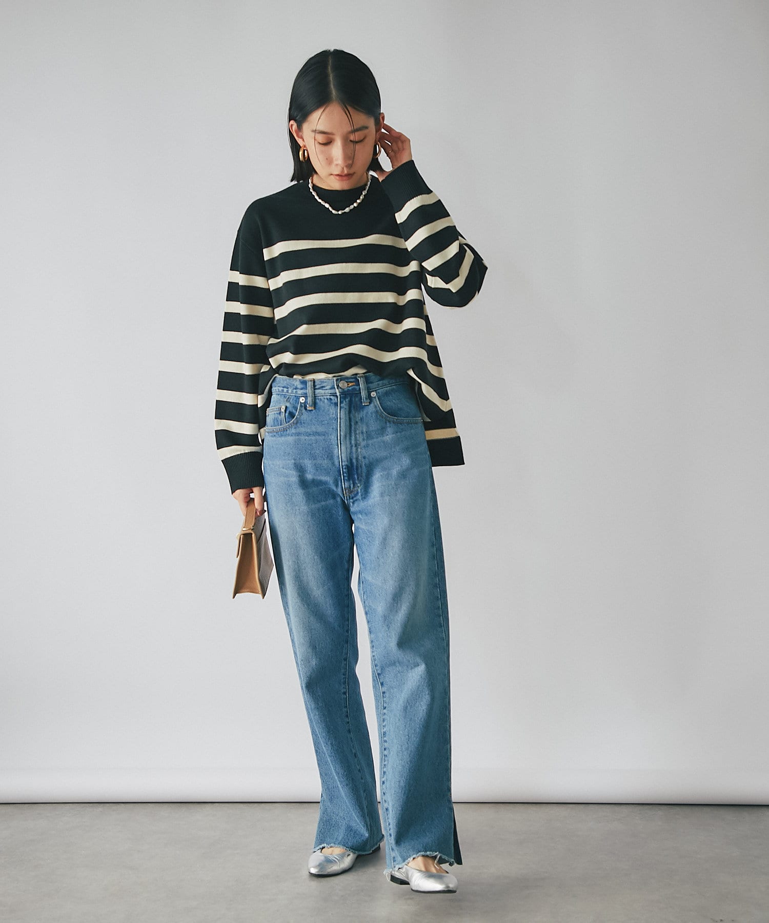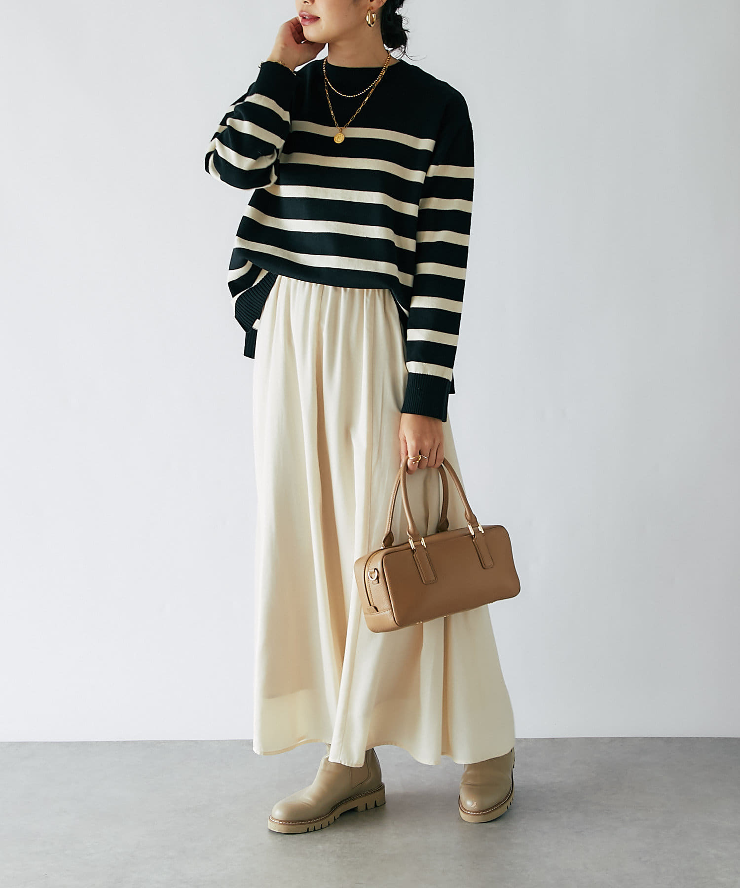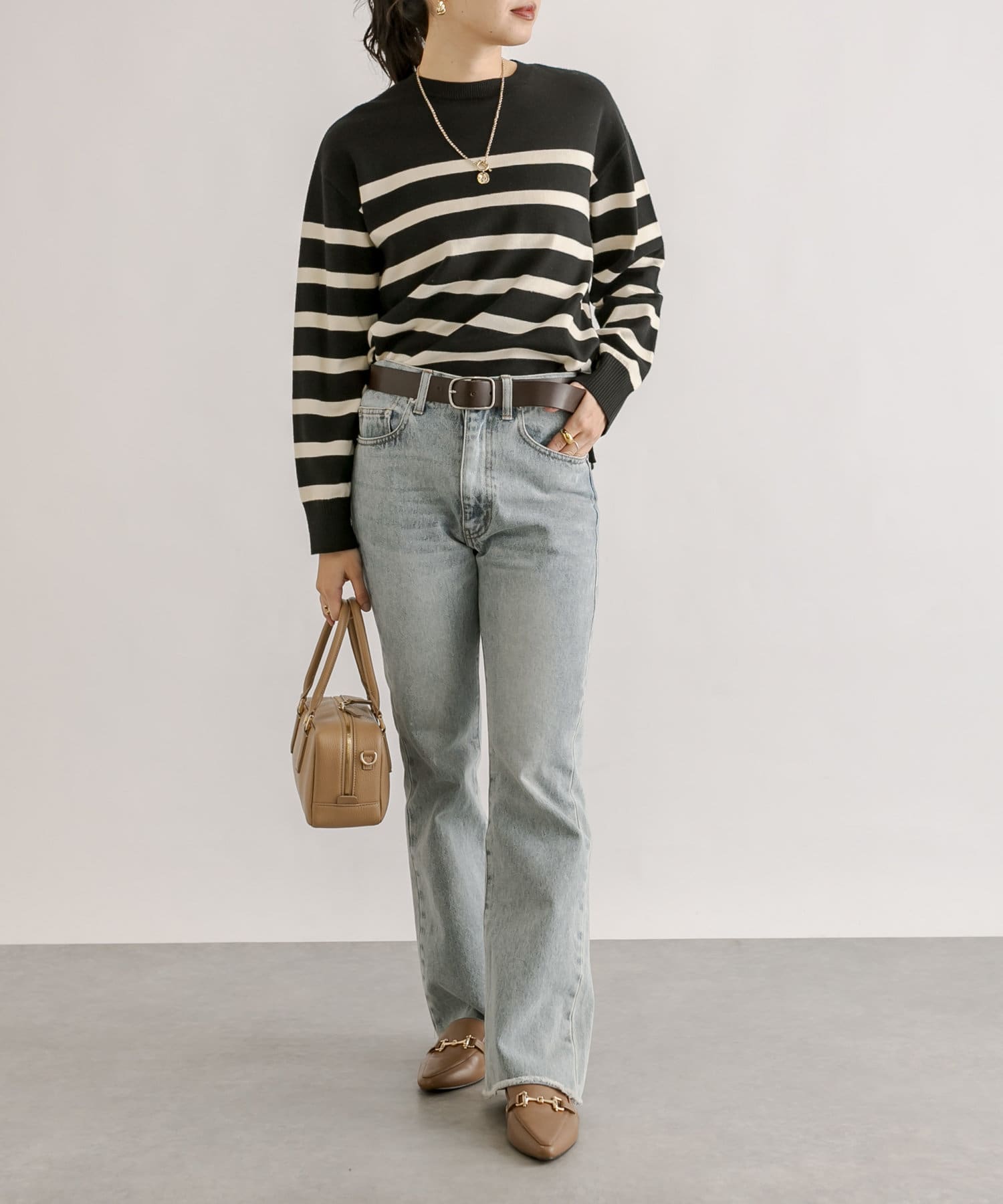 毎年人気のボーダーニット。程よい厚みとゆったり感のニットは、一枚で着てもシャツやシアーアイテムとレイヤードしても様になる一枚です。