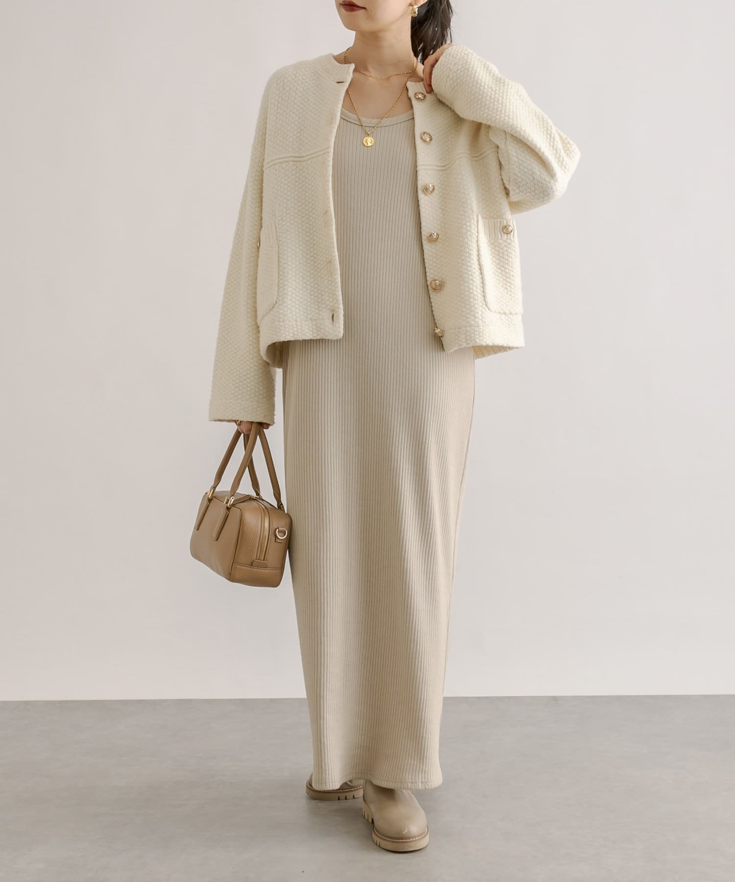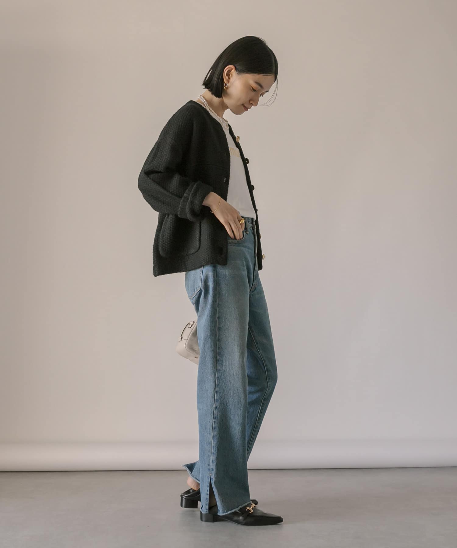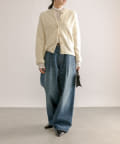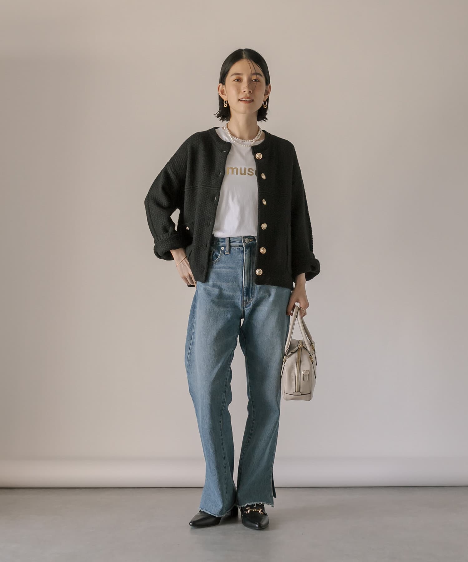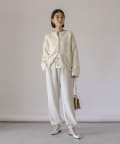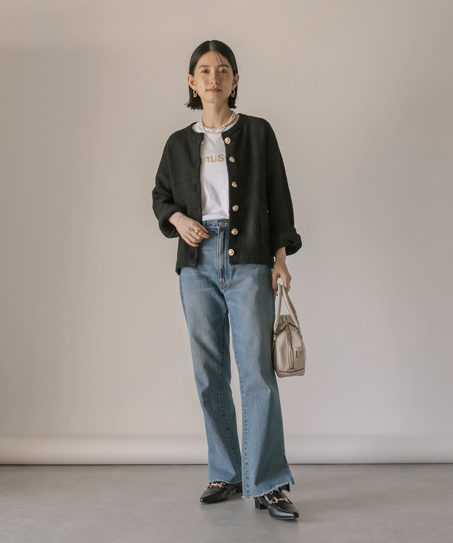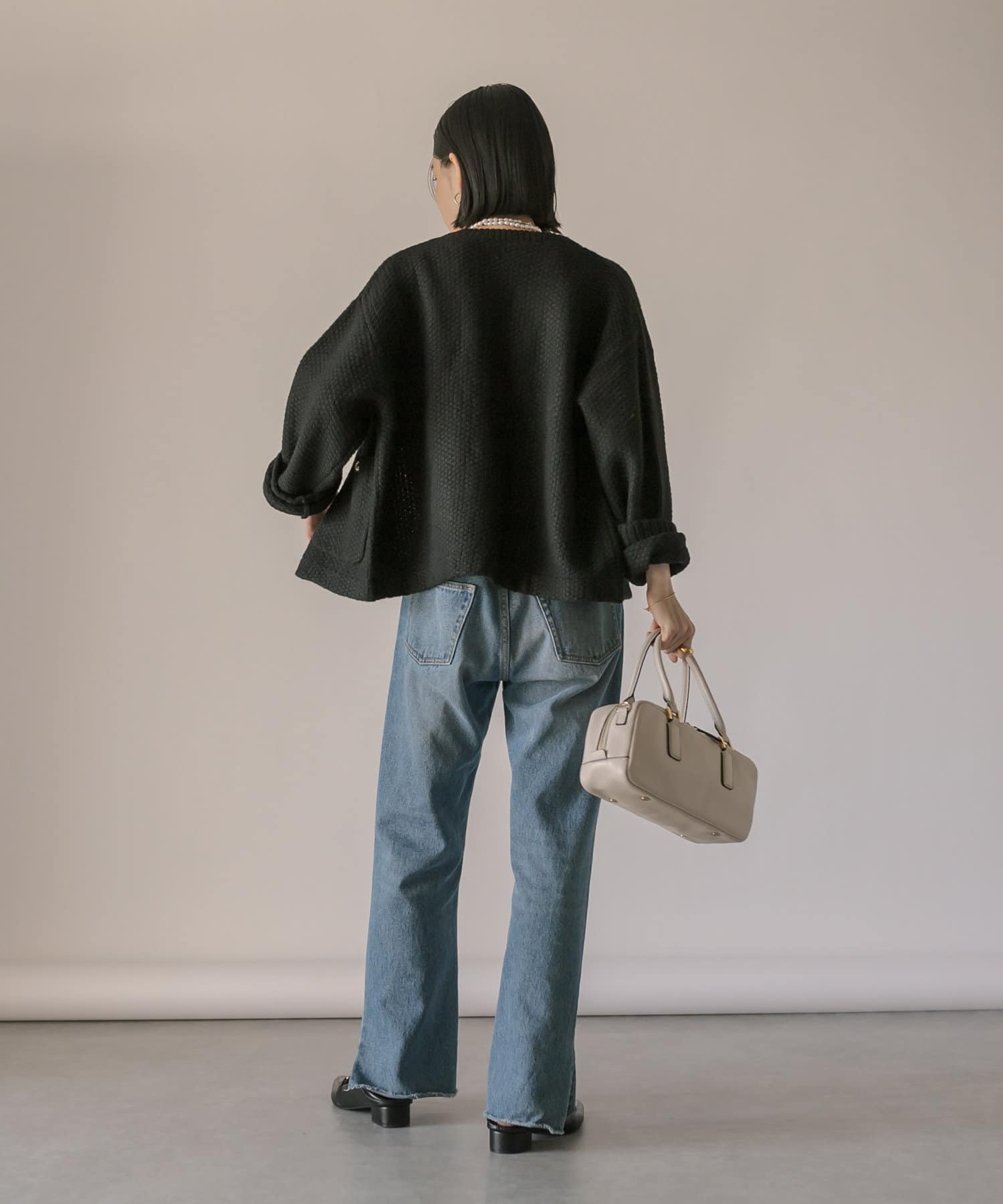 ボタンを全て閉めて一枚着としてお召しいただくのがおすすめ。ボトムスはデニムやワイドパンツ、ロングスカート等、幅広いアイテムと合わせていただけます。