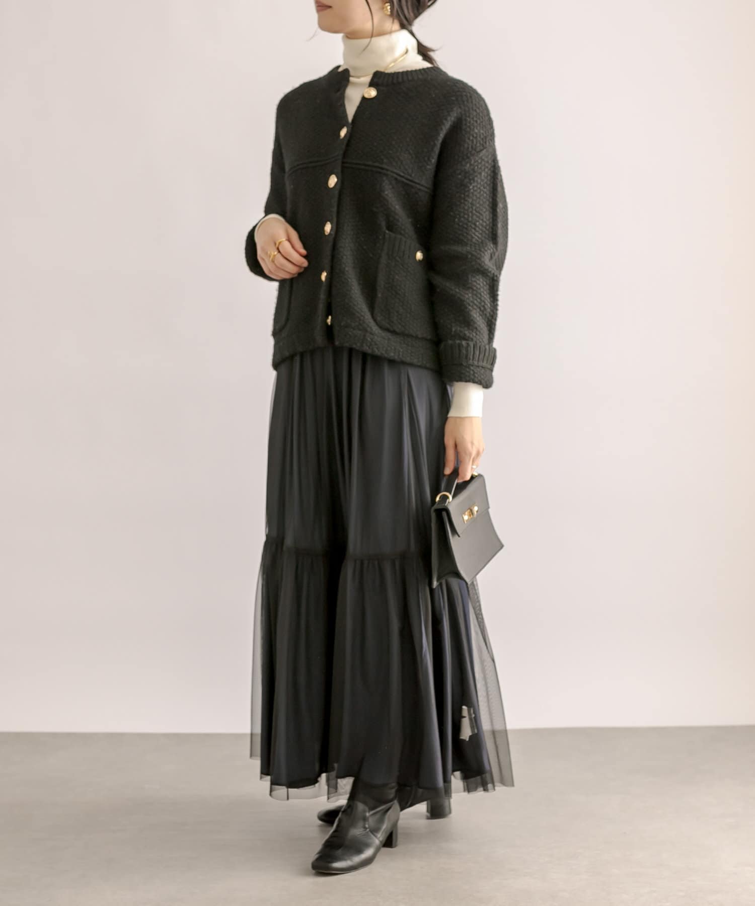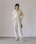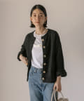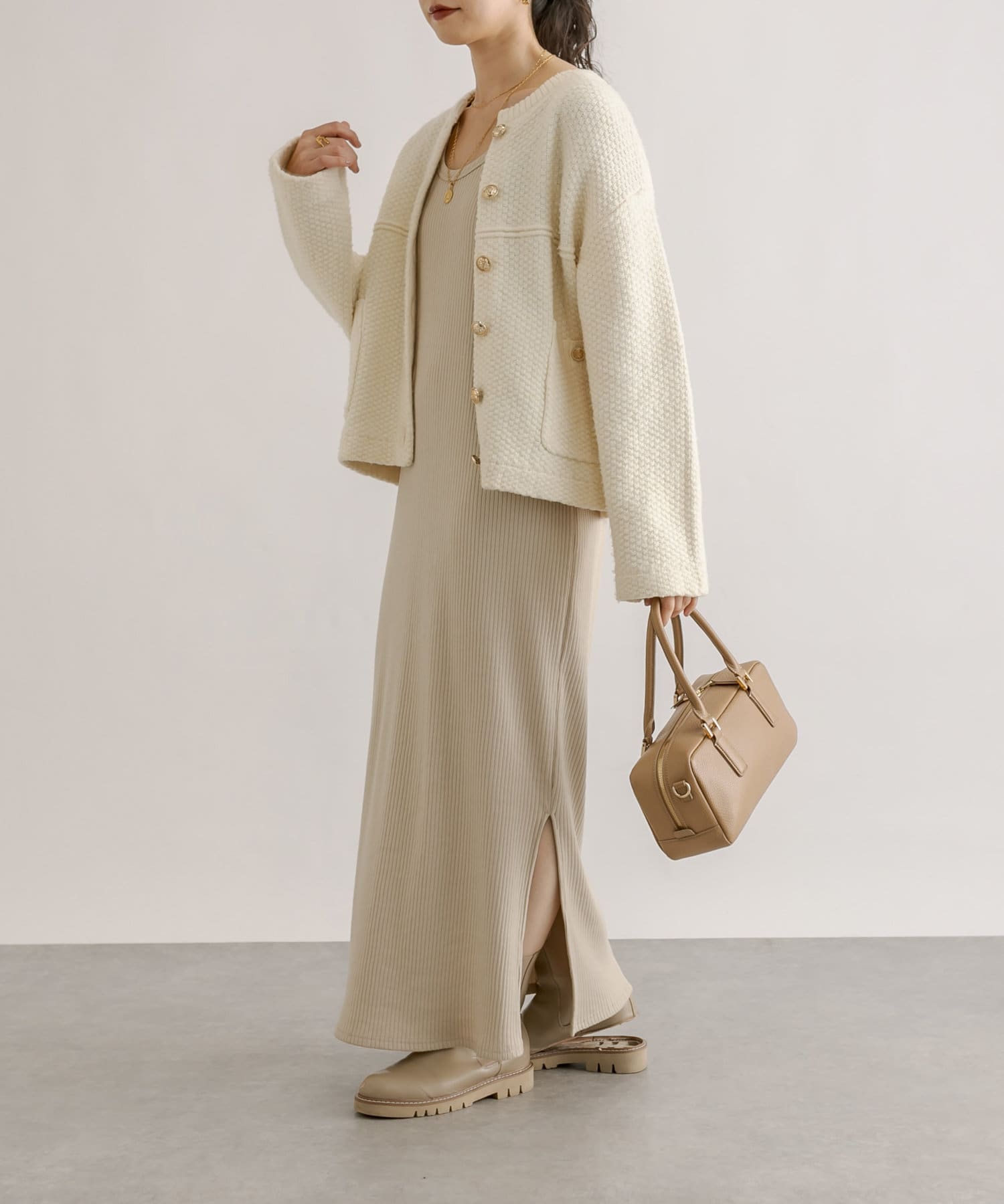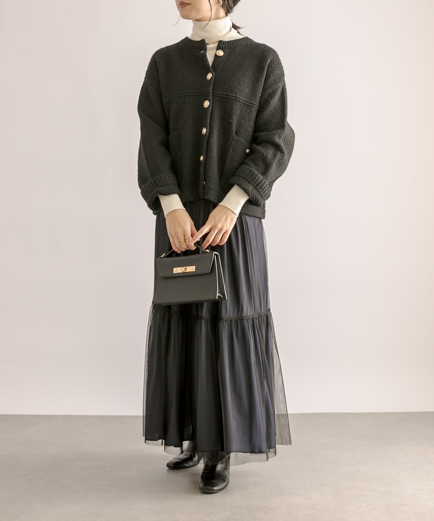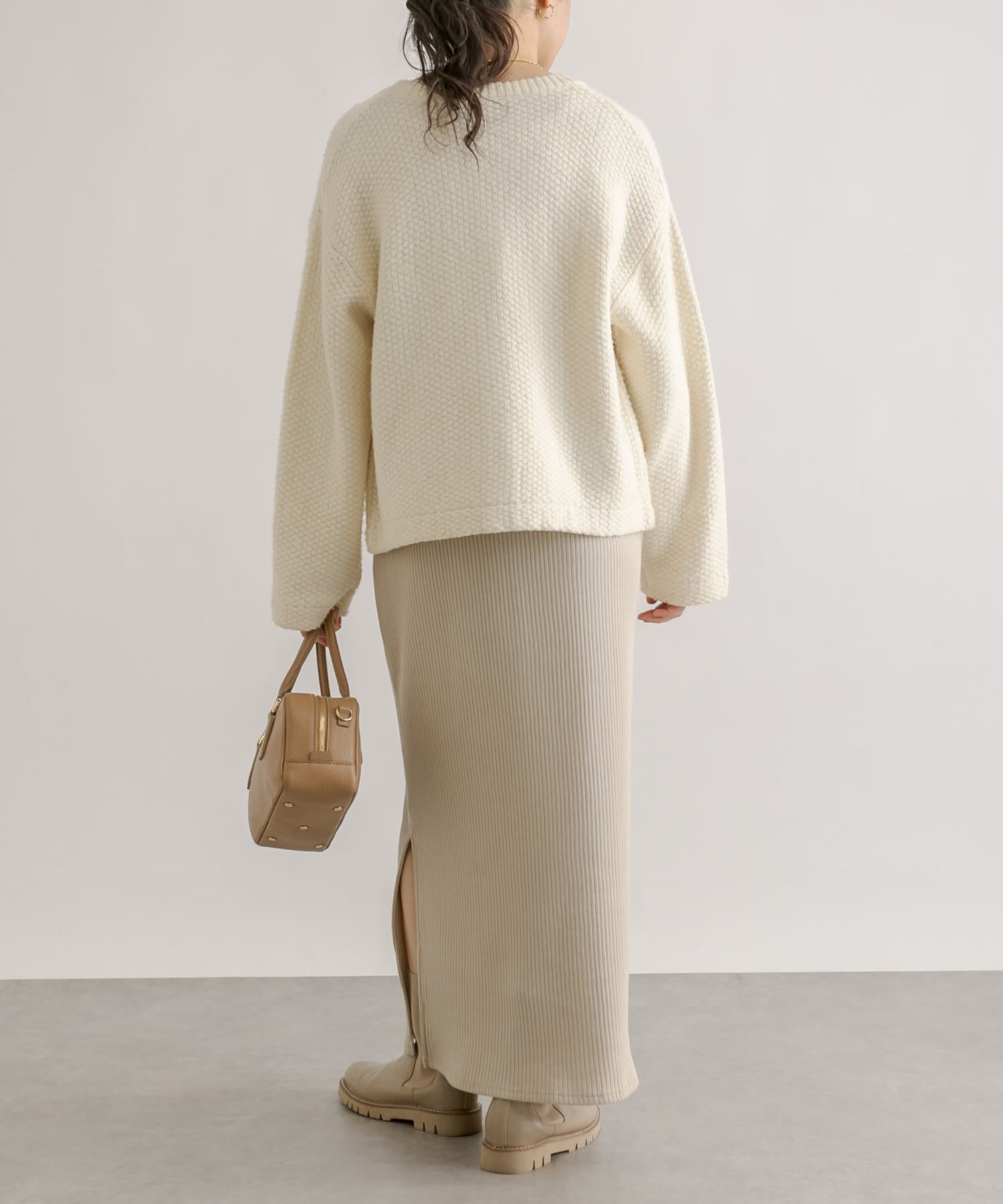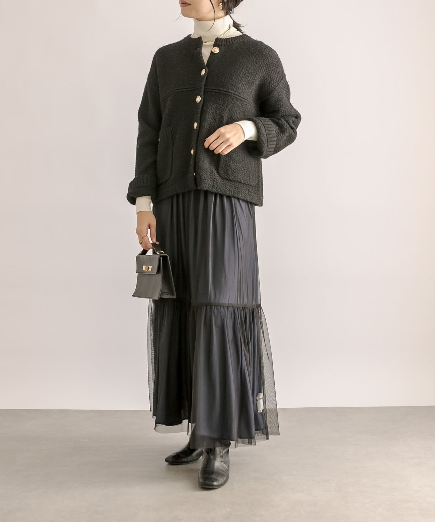ボタンを全て閉めて一枚着としてお召しいただくのがおすすめ。ボトムスはデニムやワイドパンツ、ロングスカート等、幅広いアイテムと合わせていただけます。