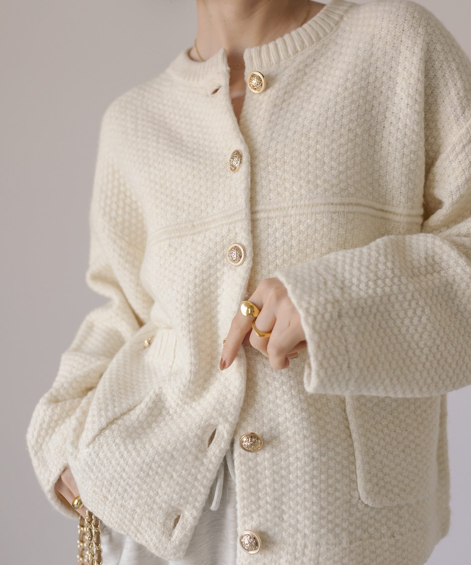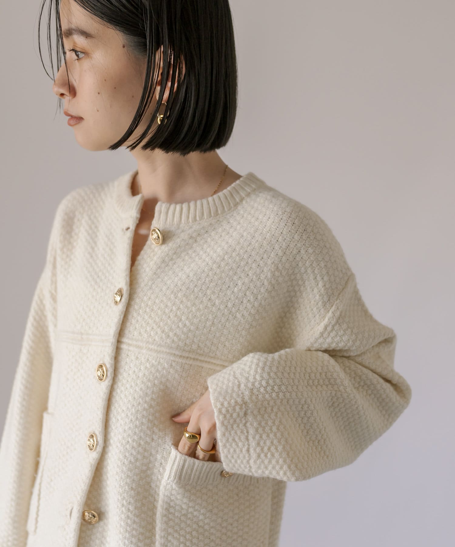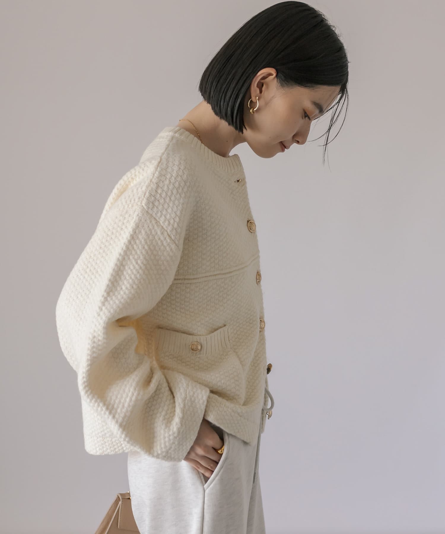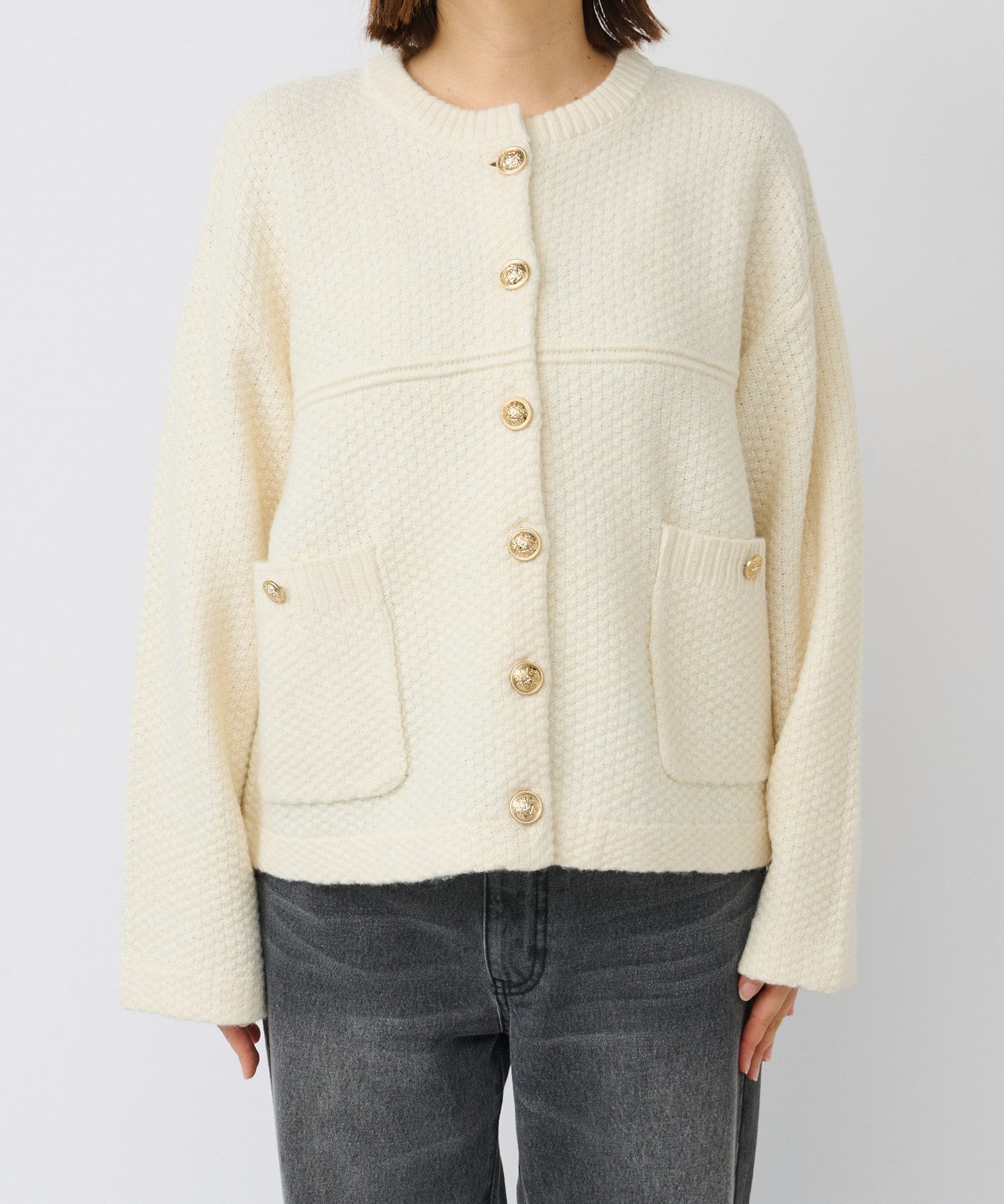 ナチュラルな風合いの編地にメタルボタンがポイントのカーディガン。