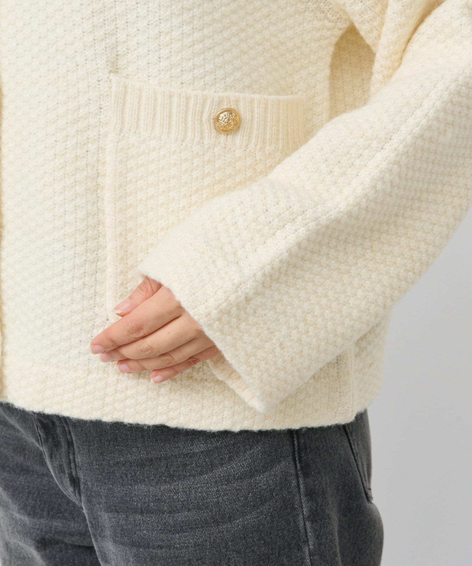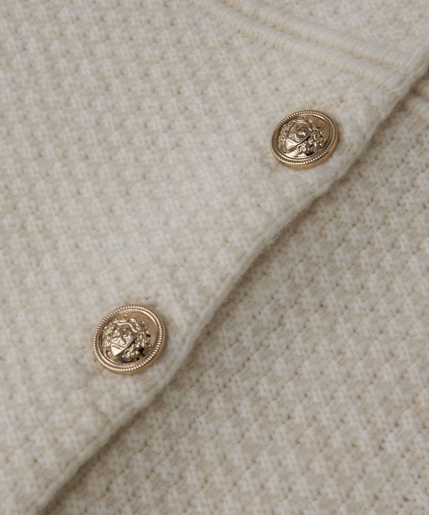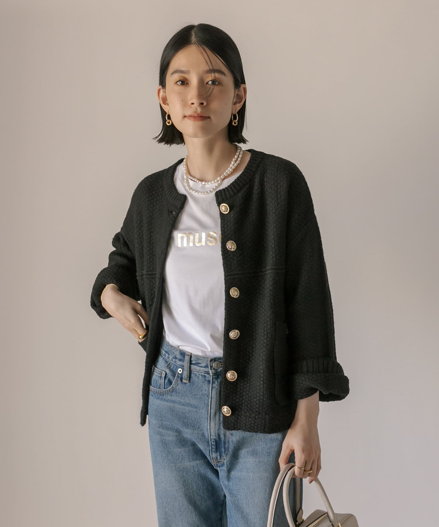 ナチュラルな風合いの編地にメタルボタンがポイントのカーディガン。