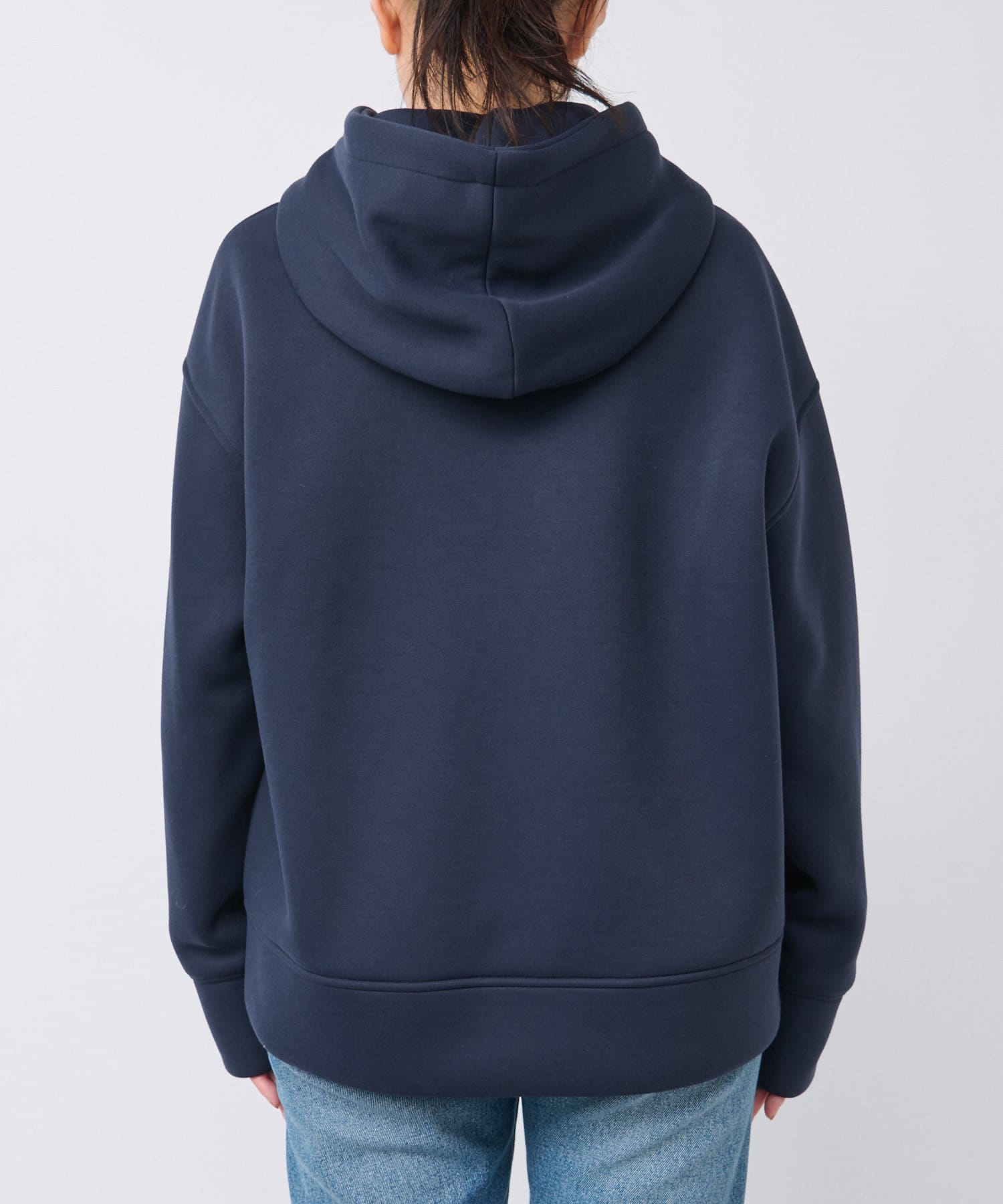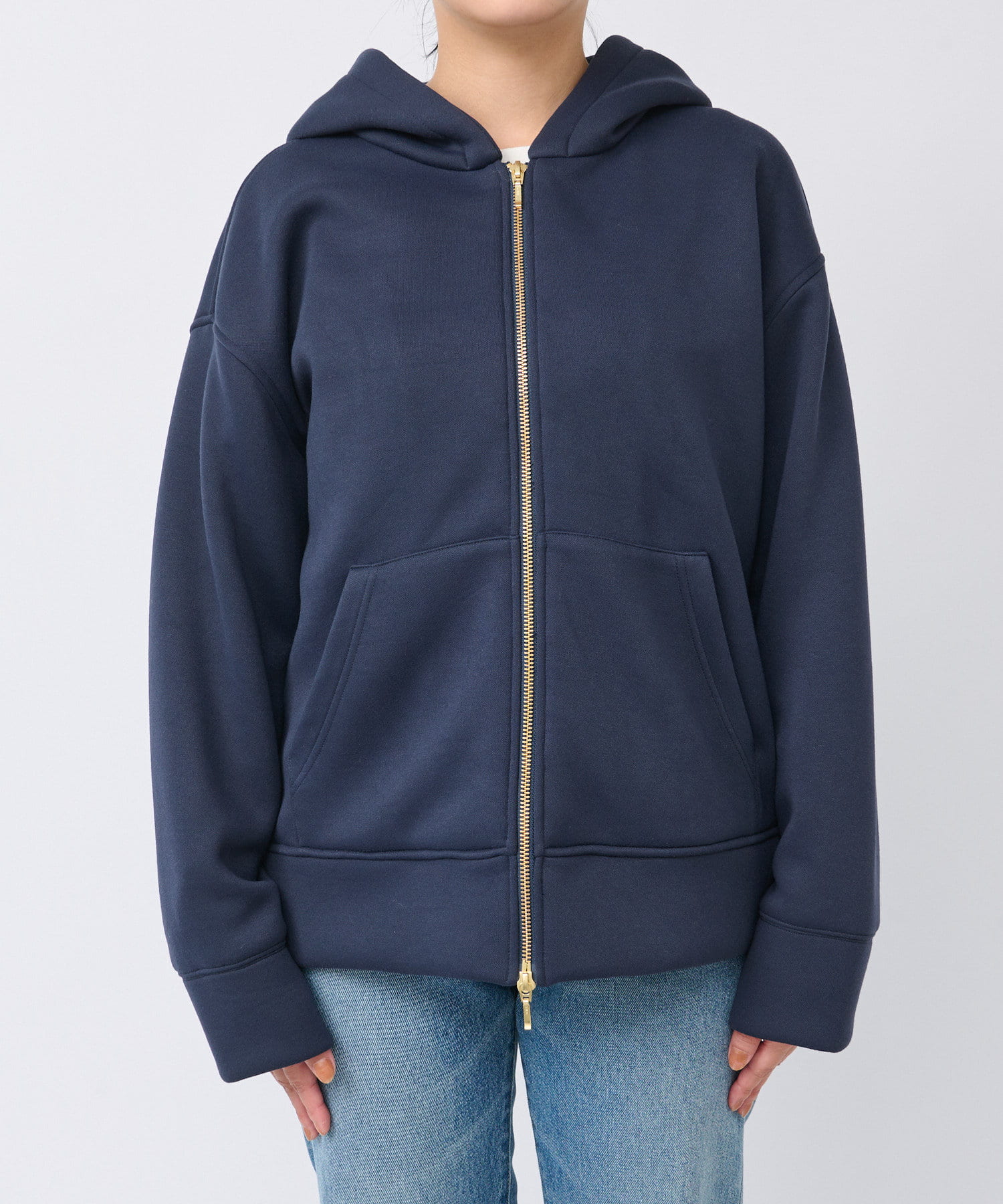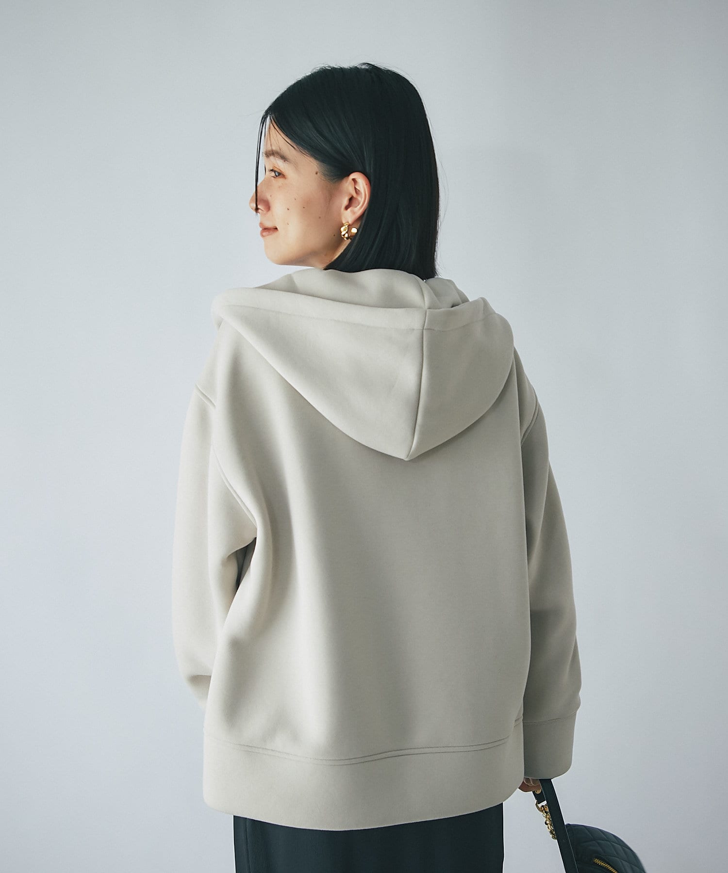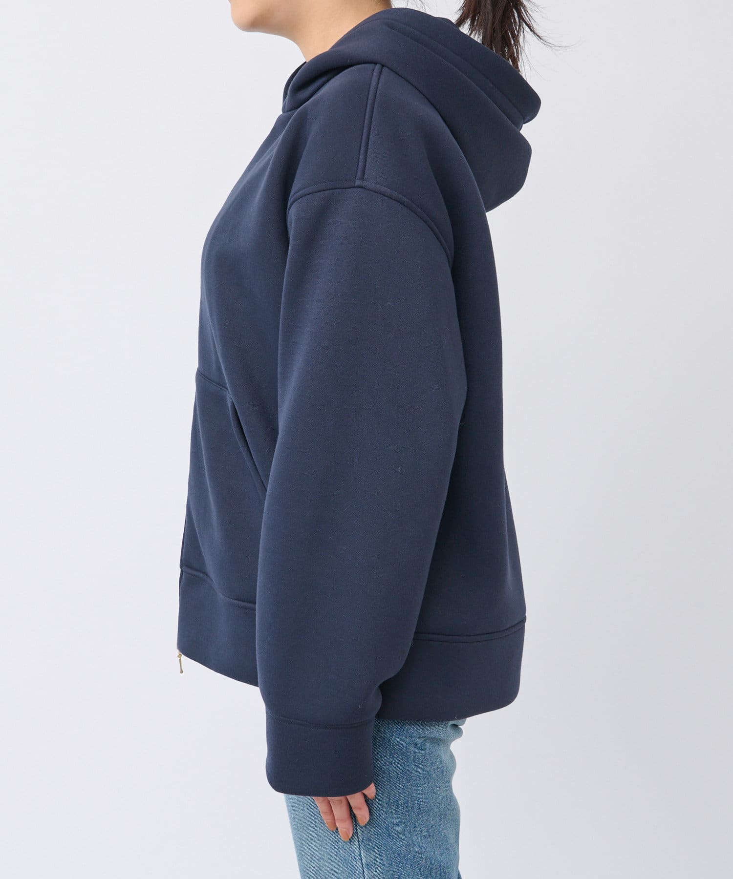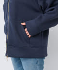 やや長めの袖丈やヒップが隠れる程度の着丈で安心感のあるシルエットのフーディジャケット。