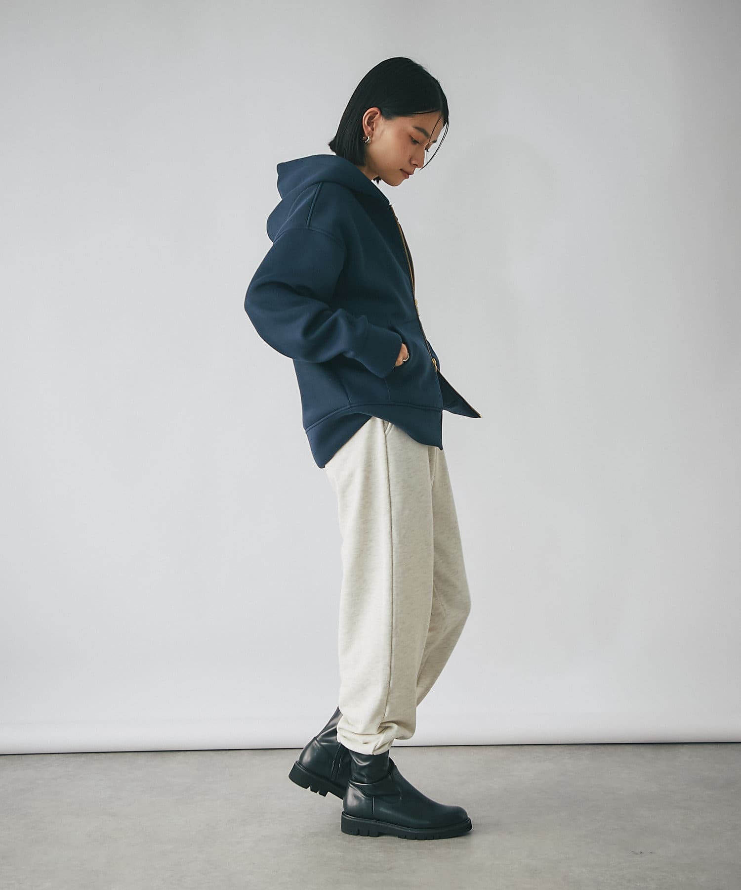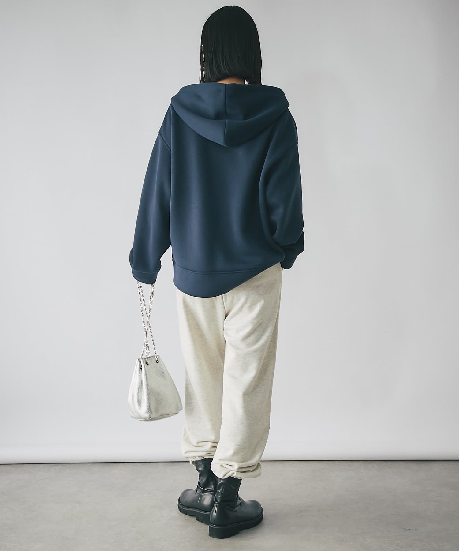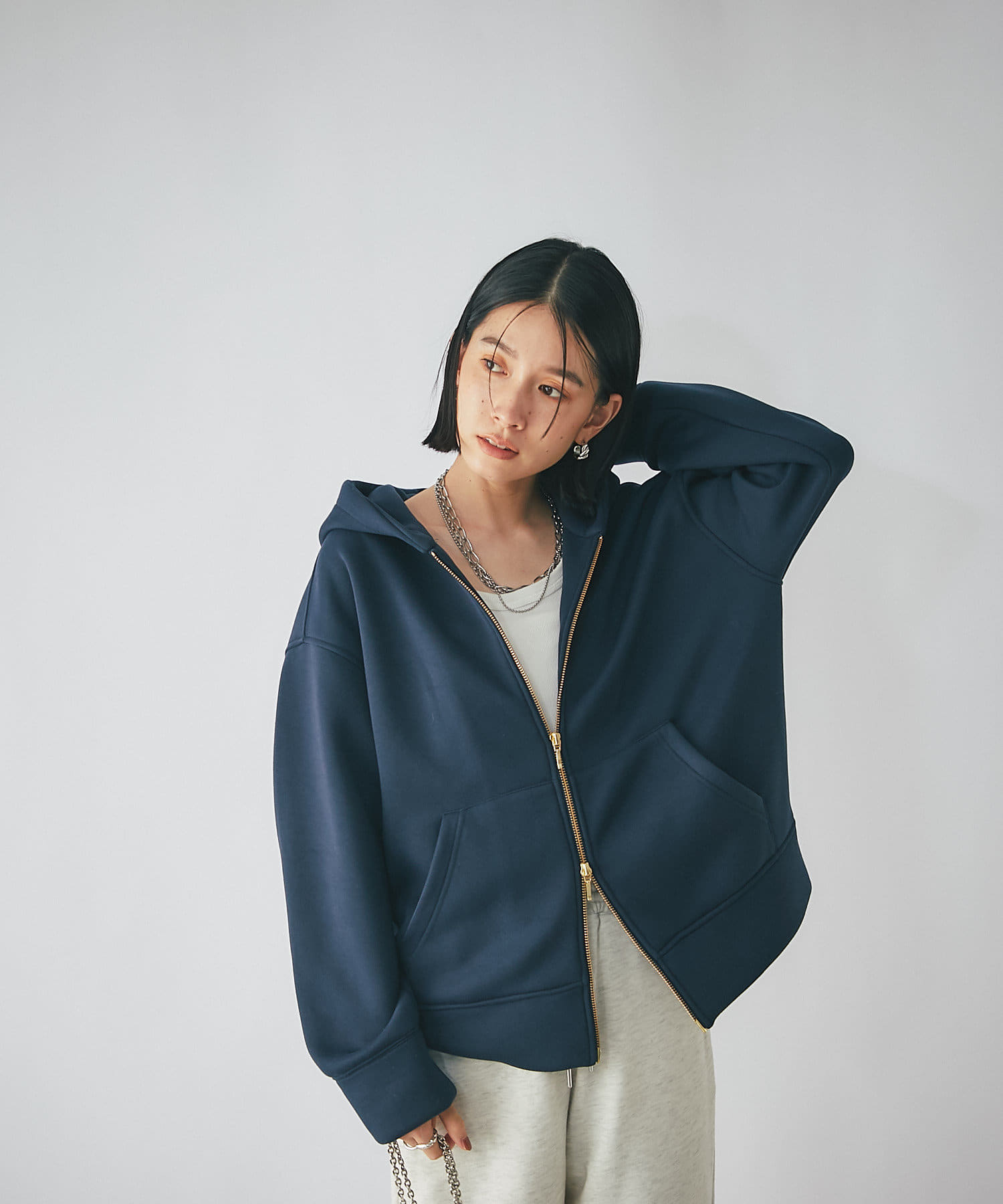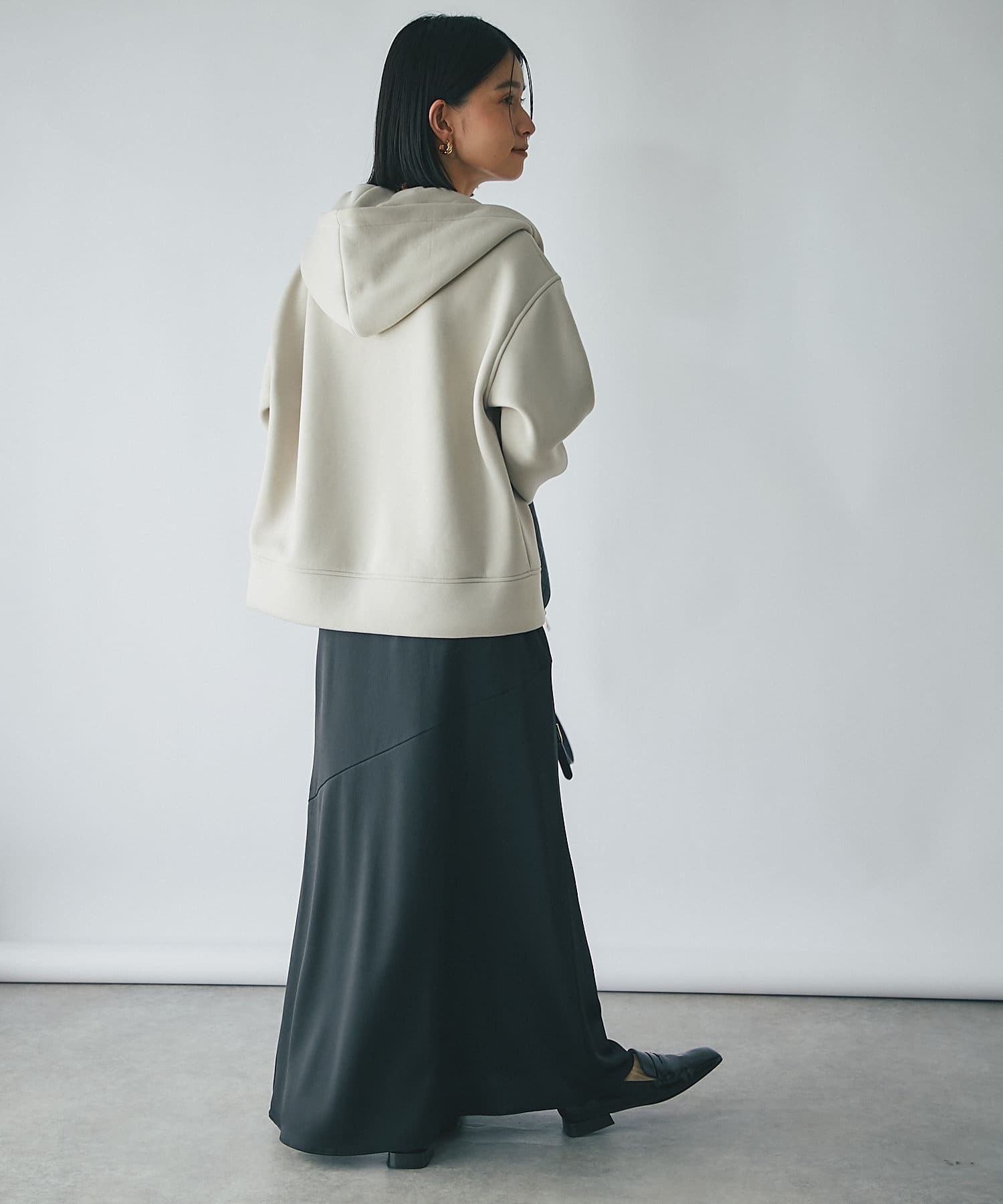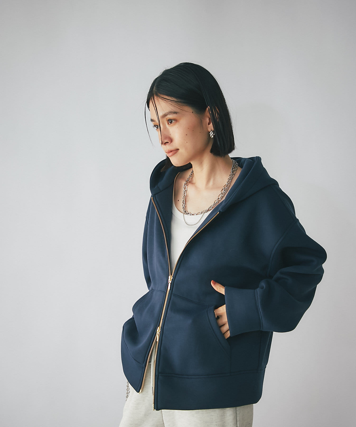 やや長めの袖丈やヒップが隠れる程度の着丈で安心感のあるシルエットのフーディジャケット。