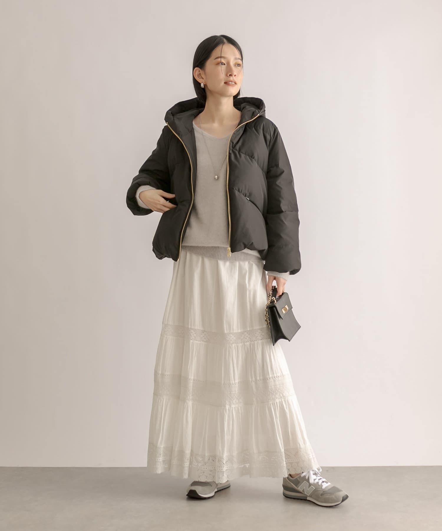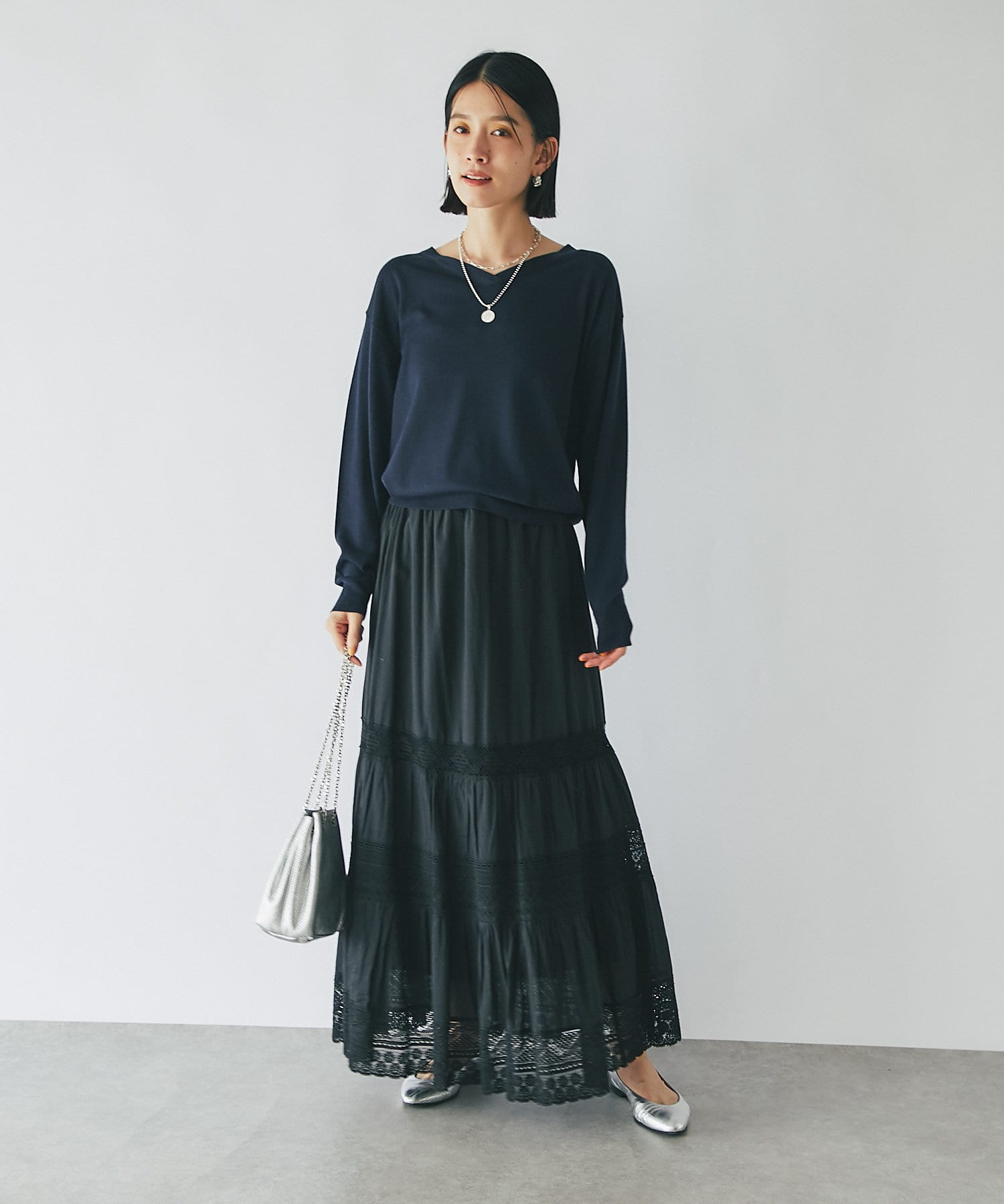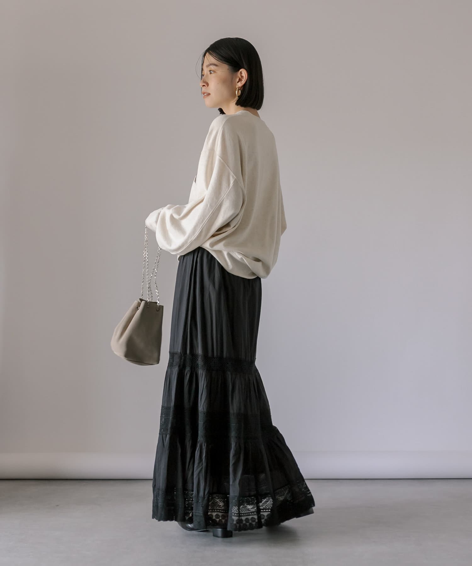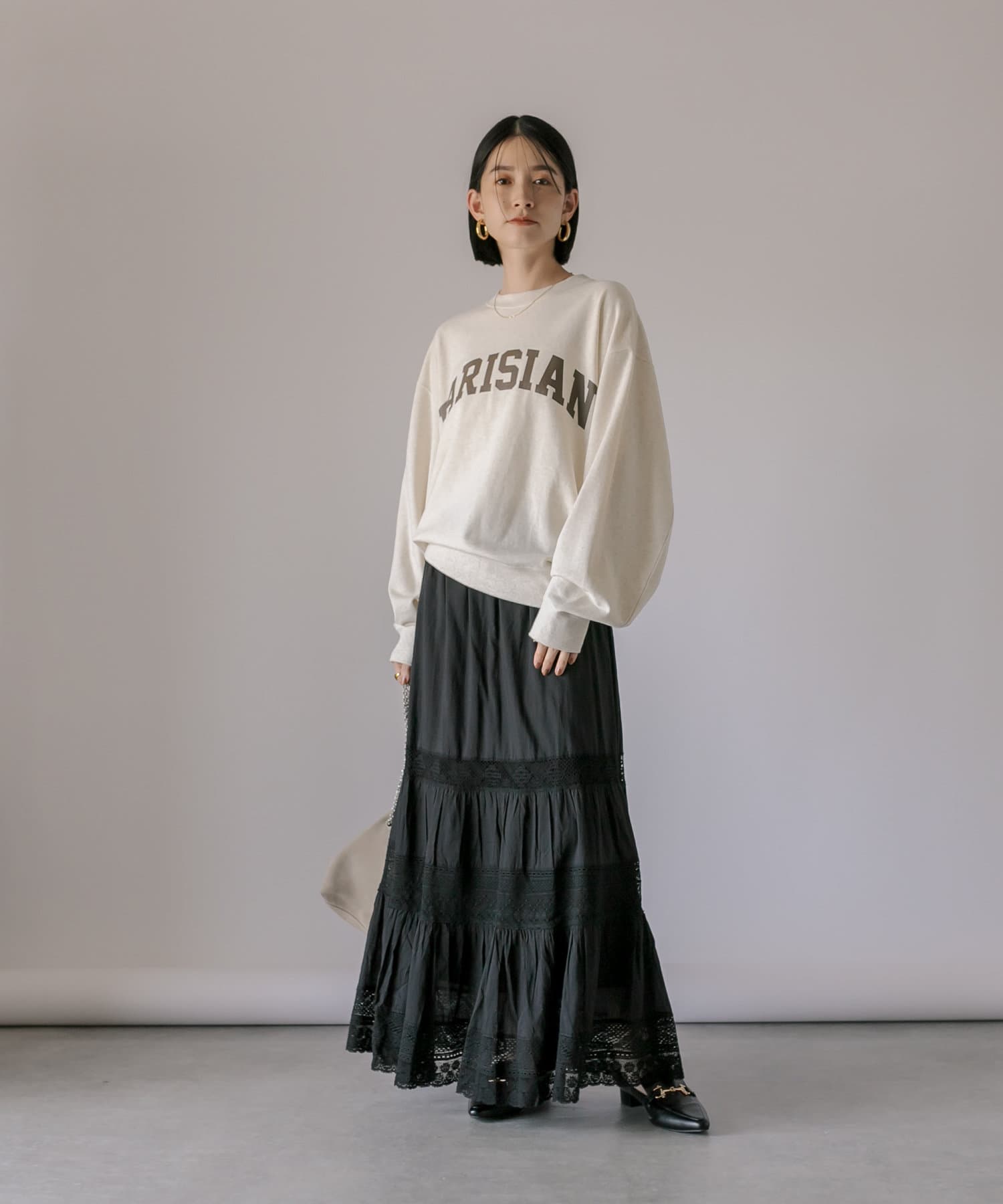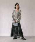 スカートの甘さを程よく抑えつつ、女性らしいスタイルが完成します。