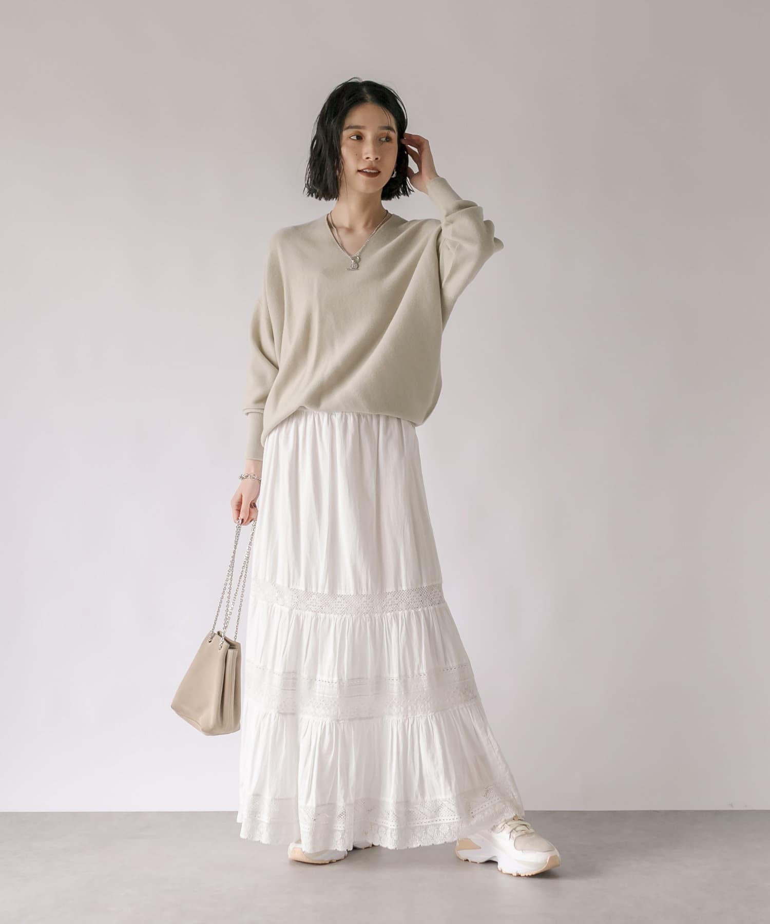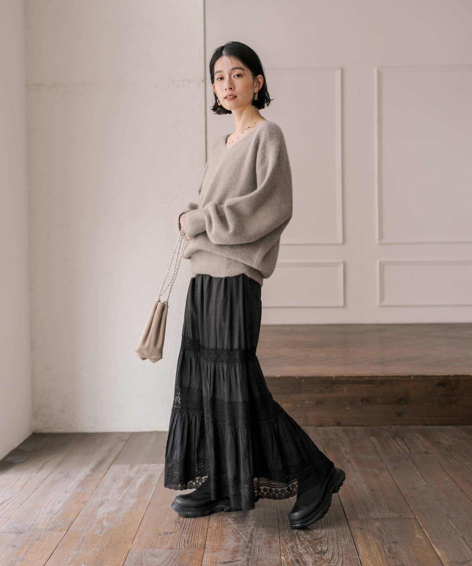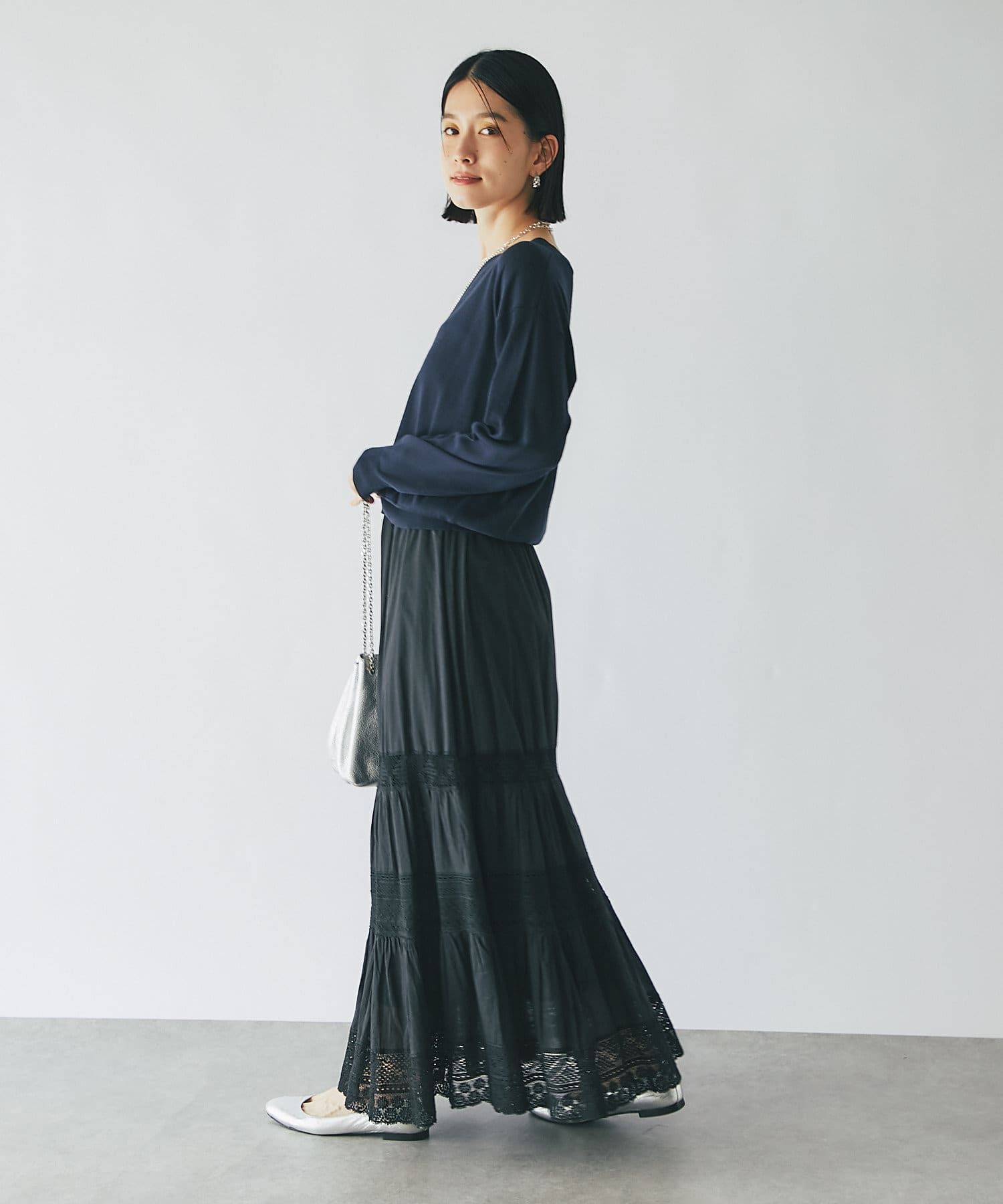 スカートの甘さを程よく抑えつつ、女性らしいスタイルが完成します。