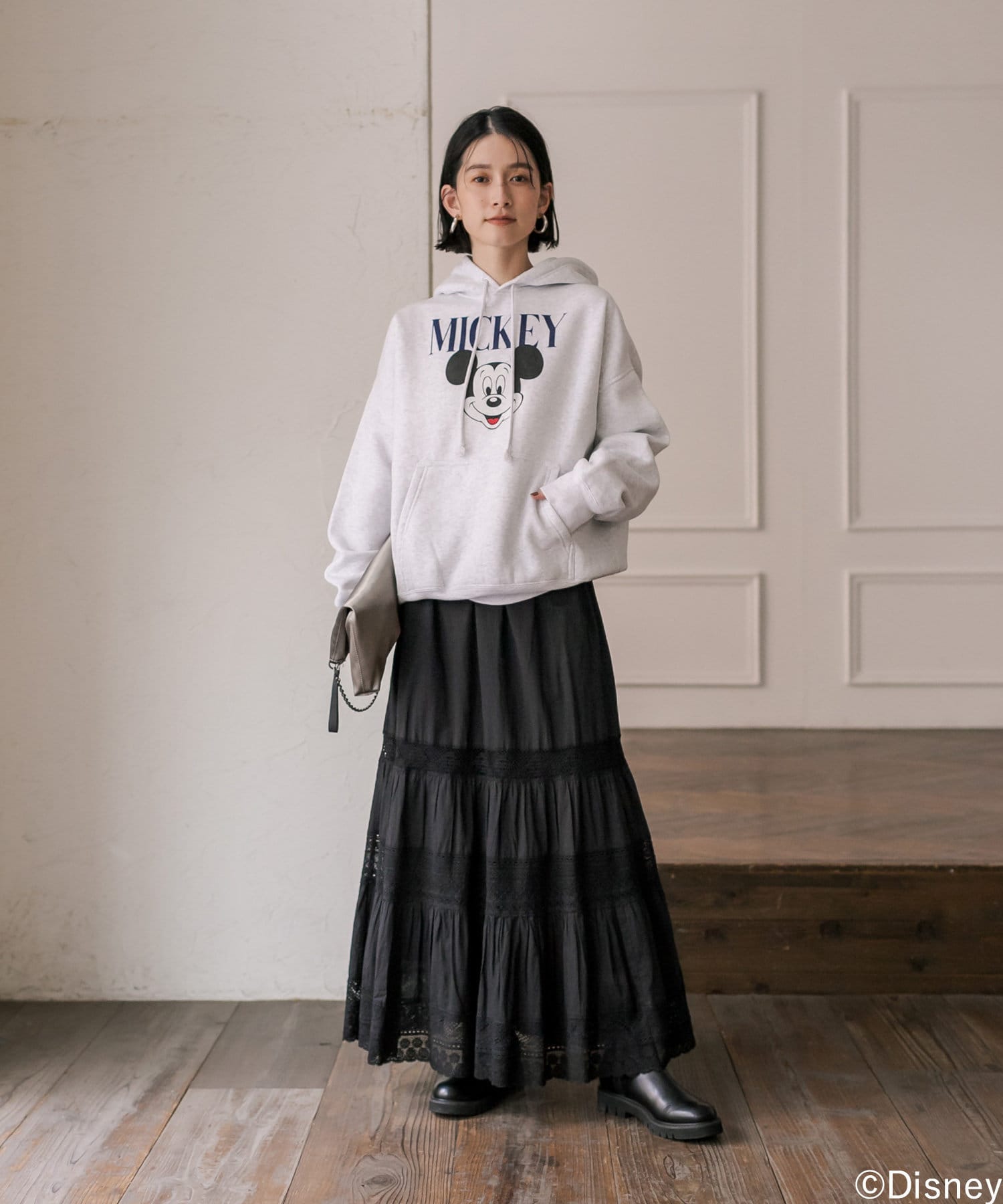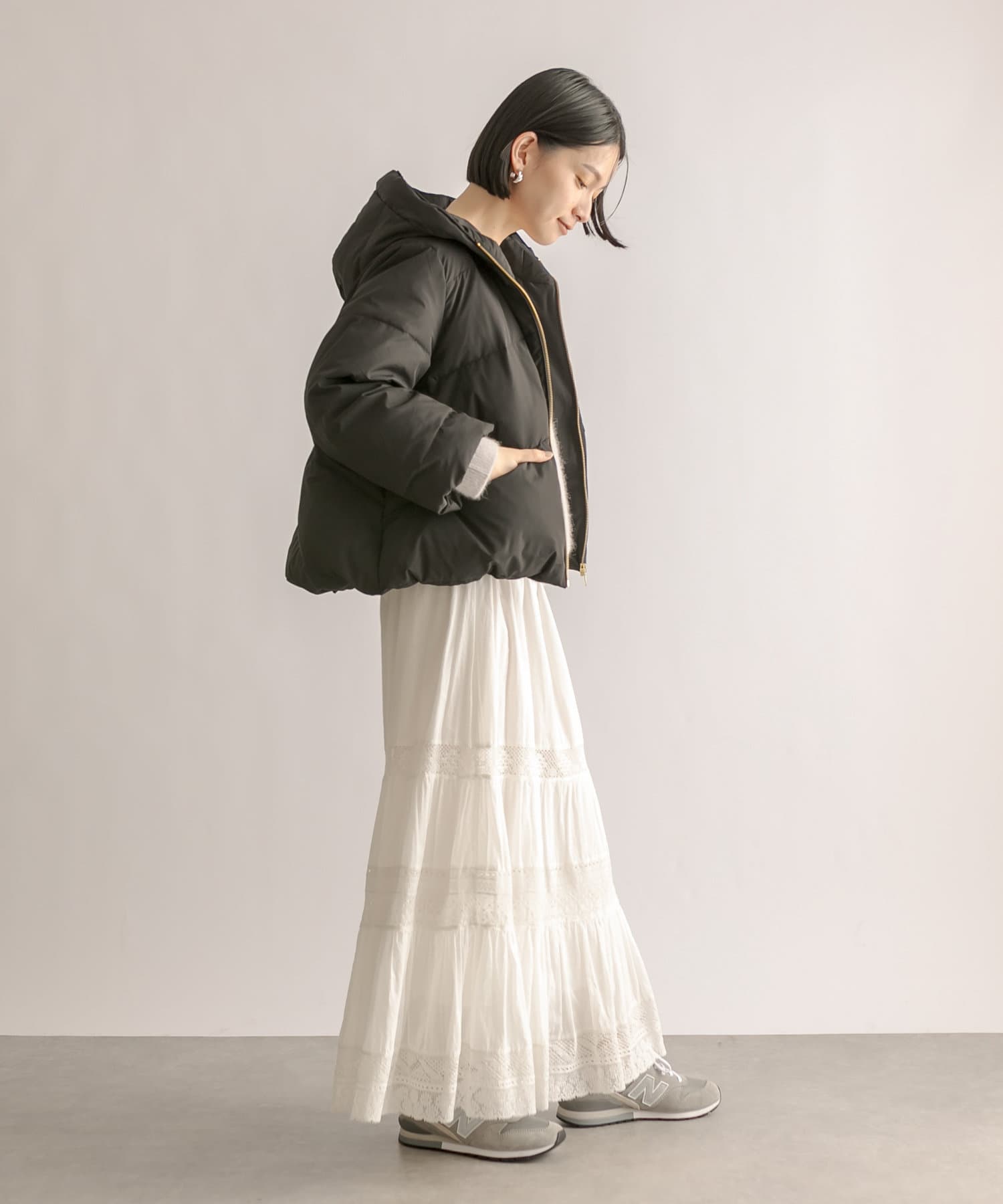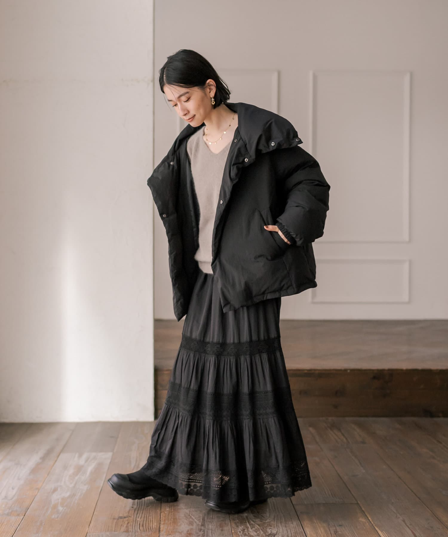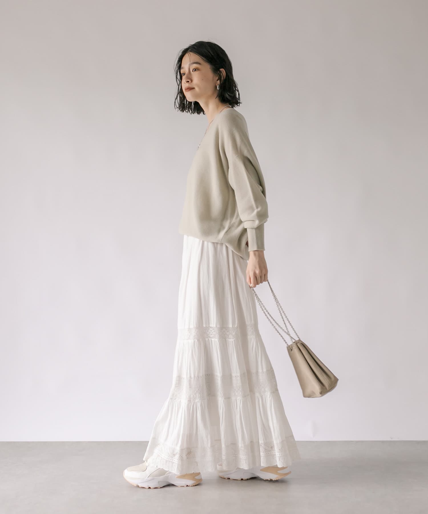 スカートの甘さを程よく抑えつつ、女性らしいスタイルが完成します。