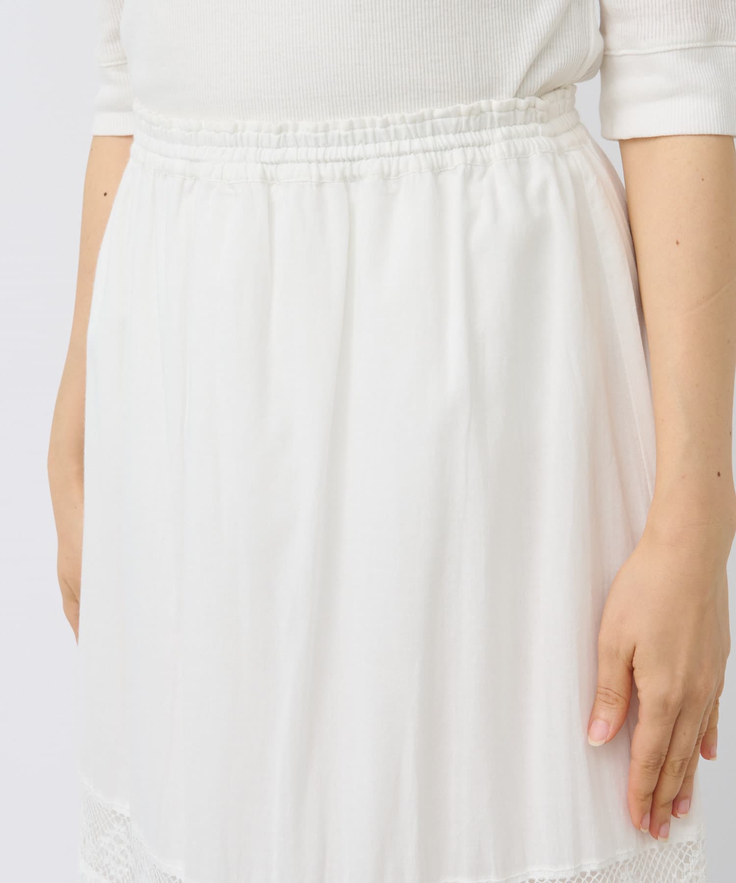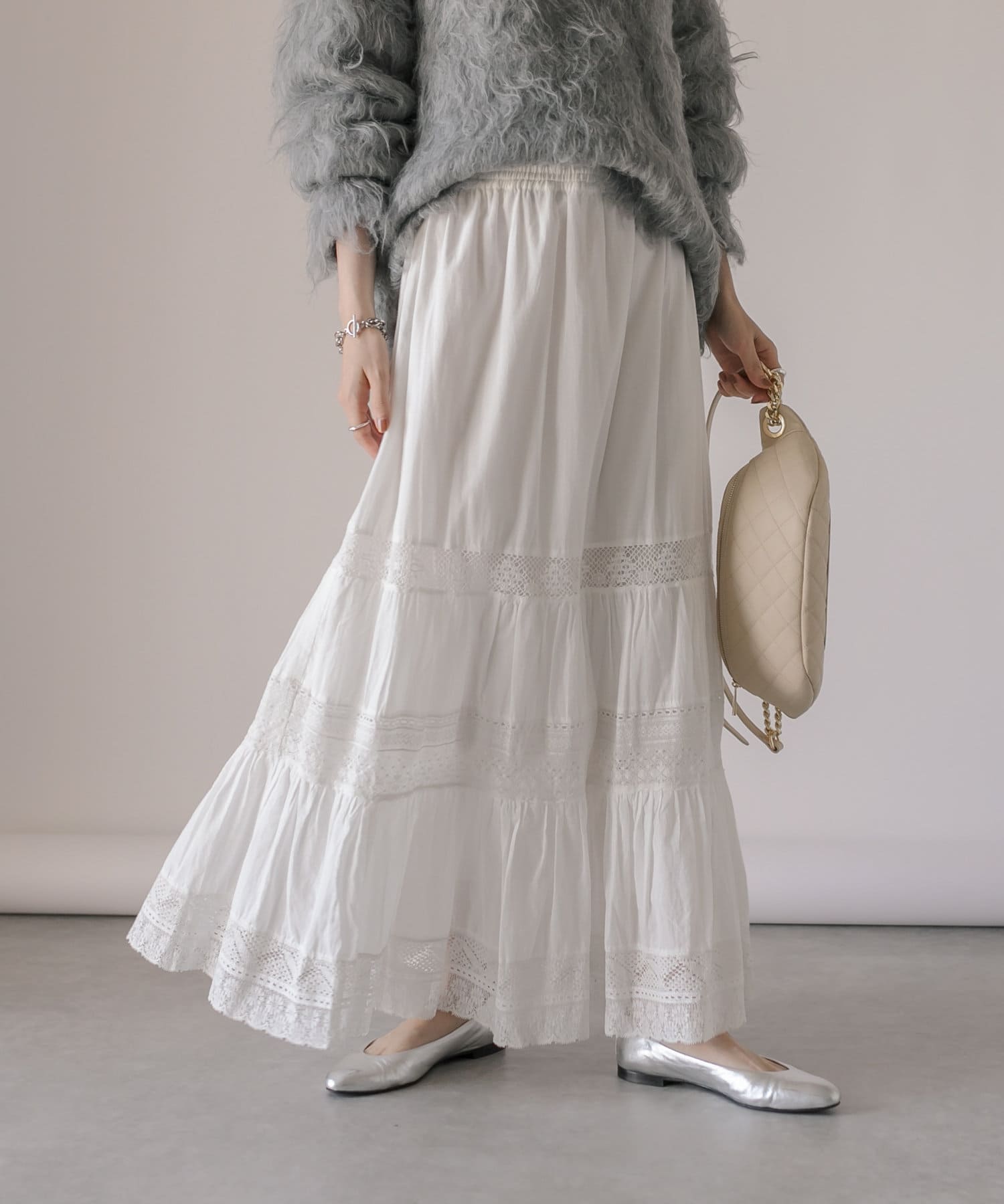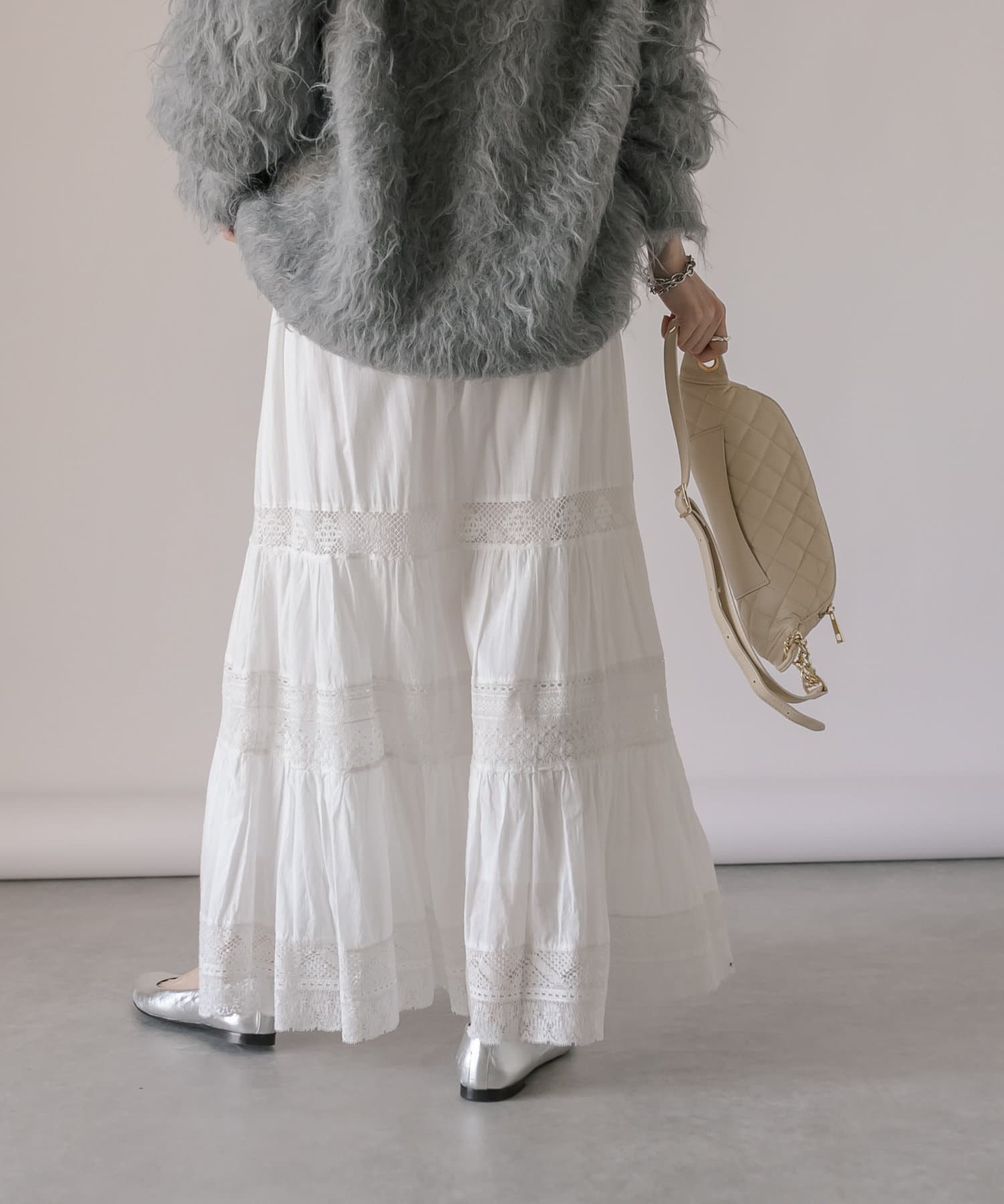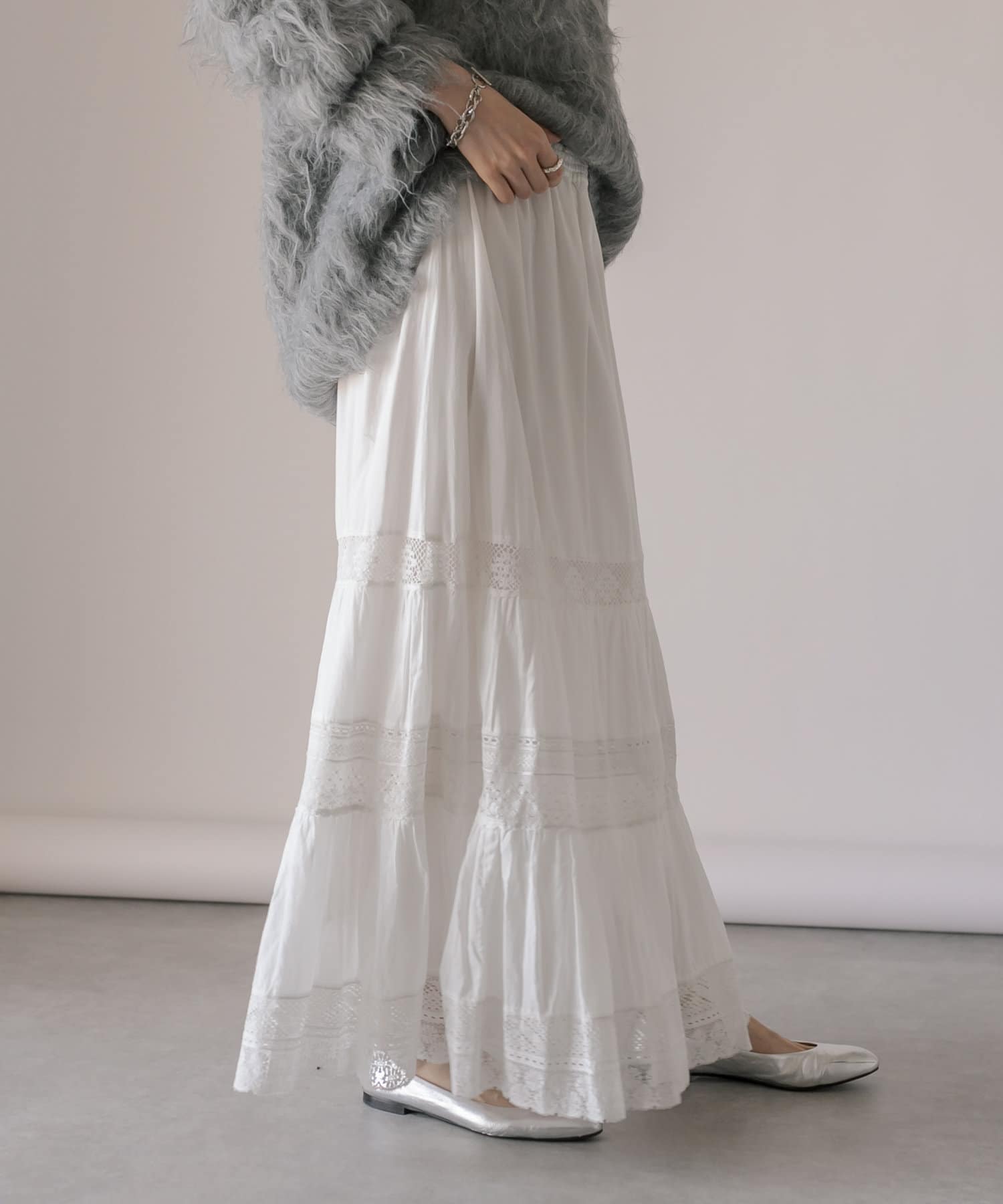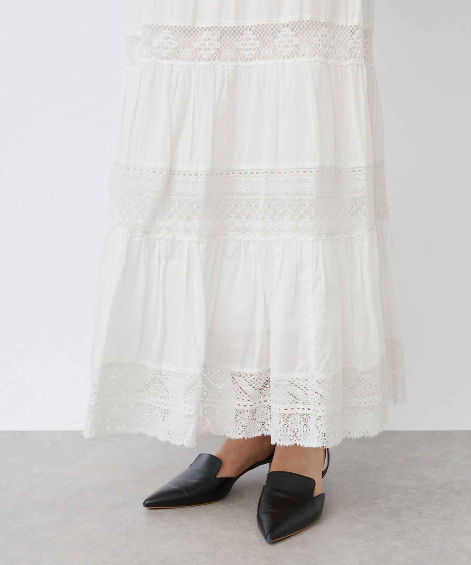 繊細で手の込んだリバーレースを使用したティアードスカート。