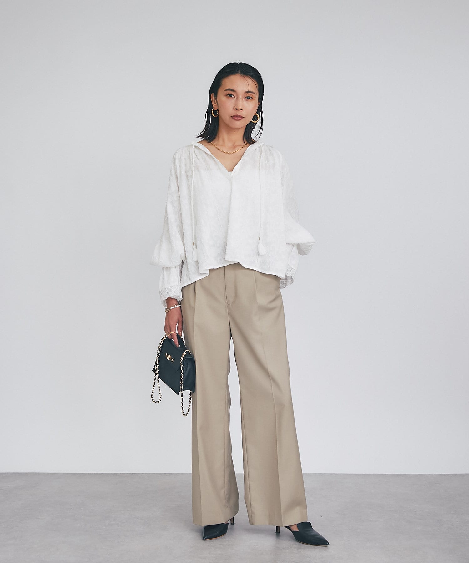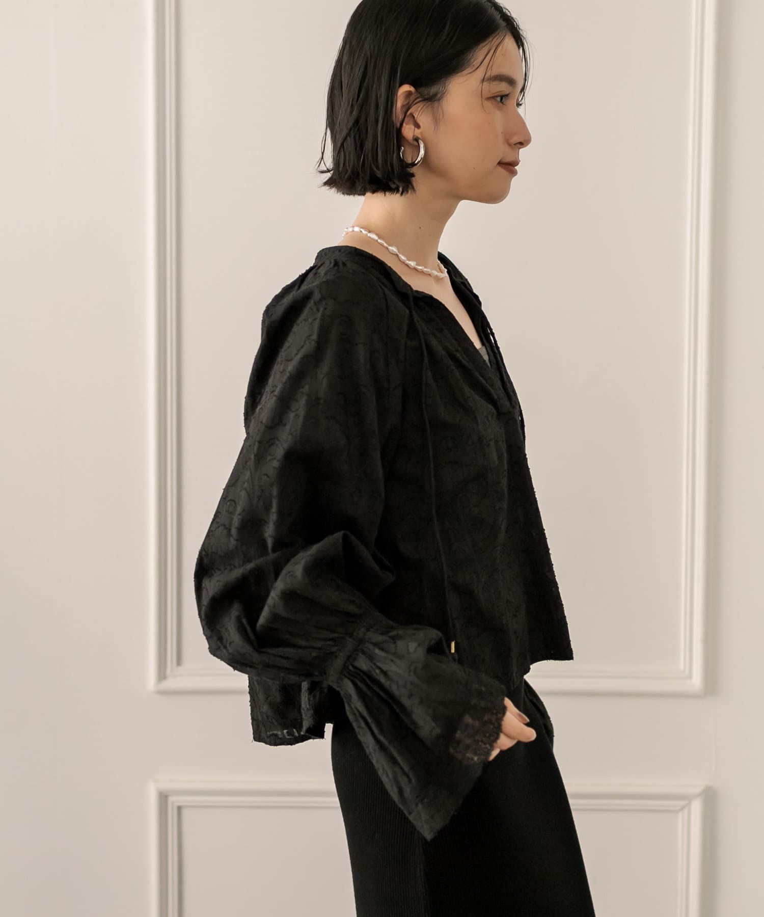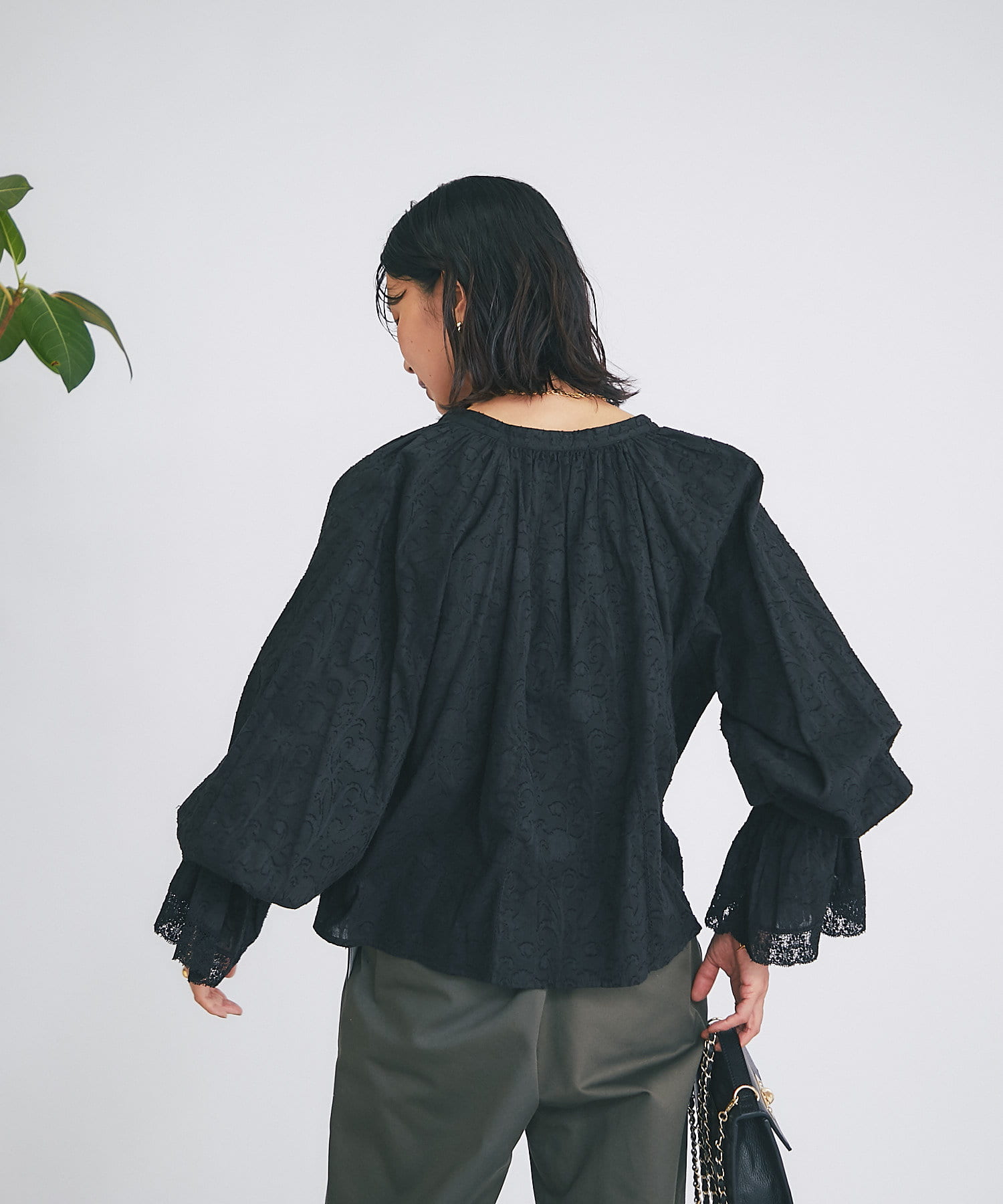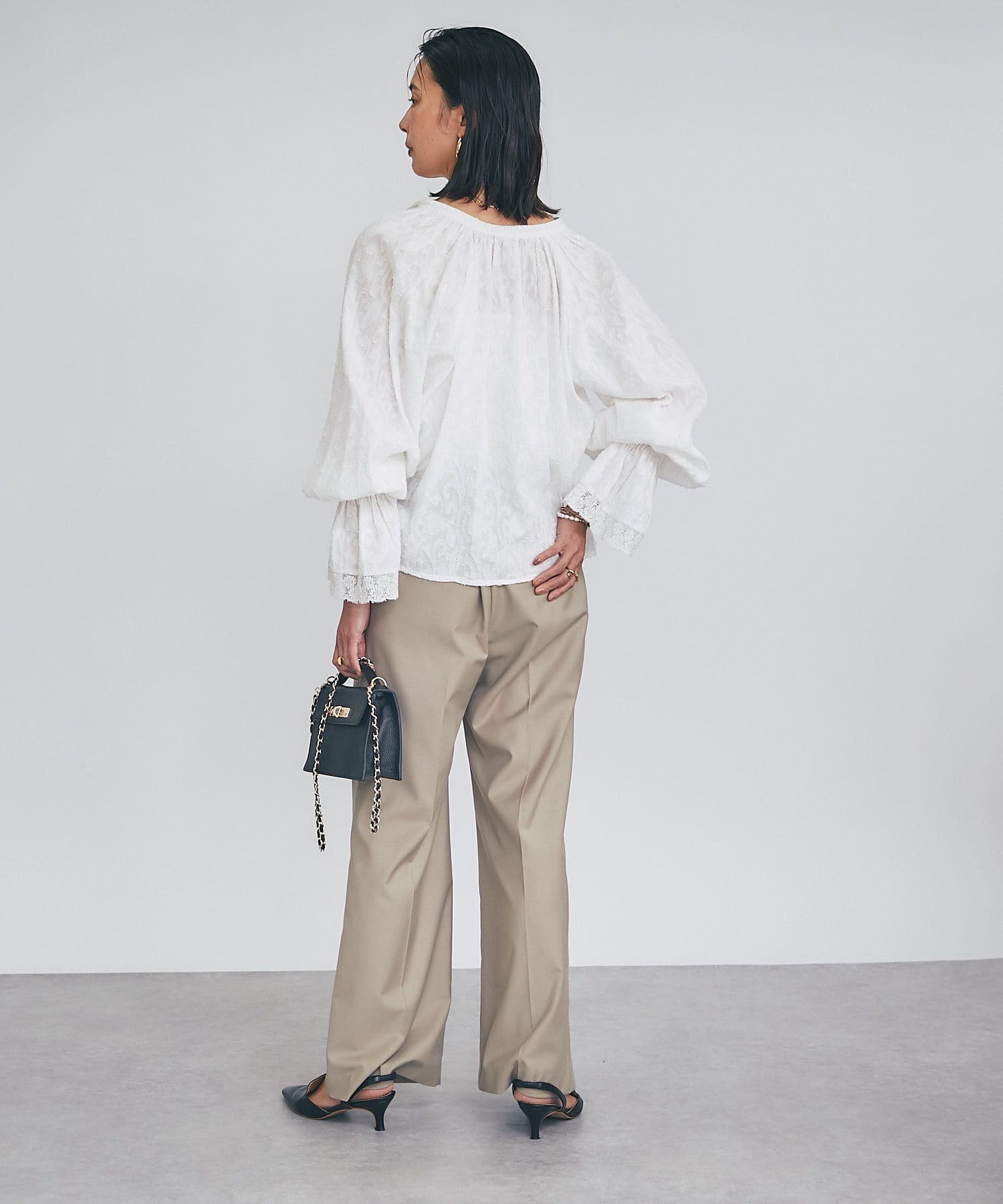 柔らかいジャガード生地と、袖のデザインが華やかなブラウス。