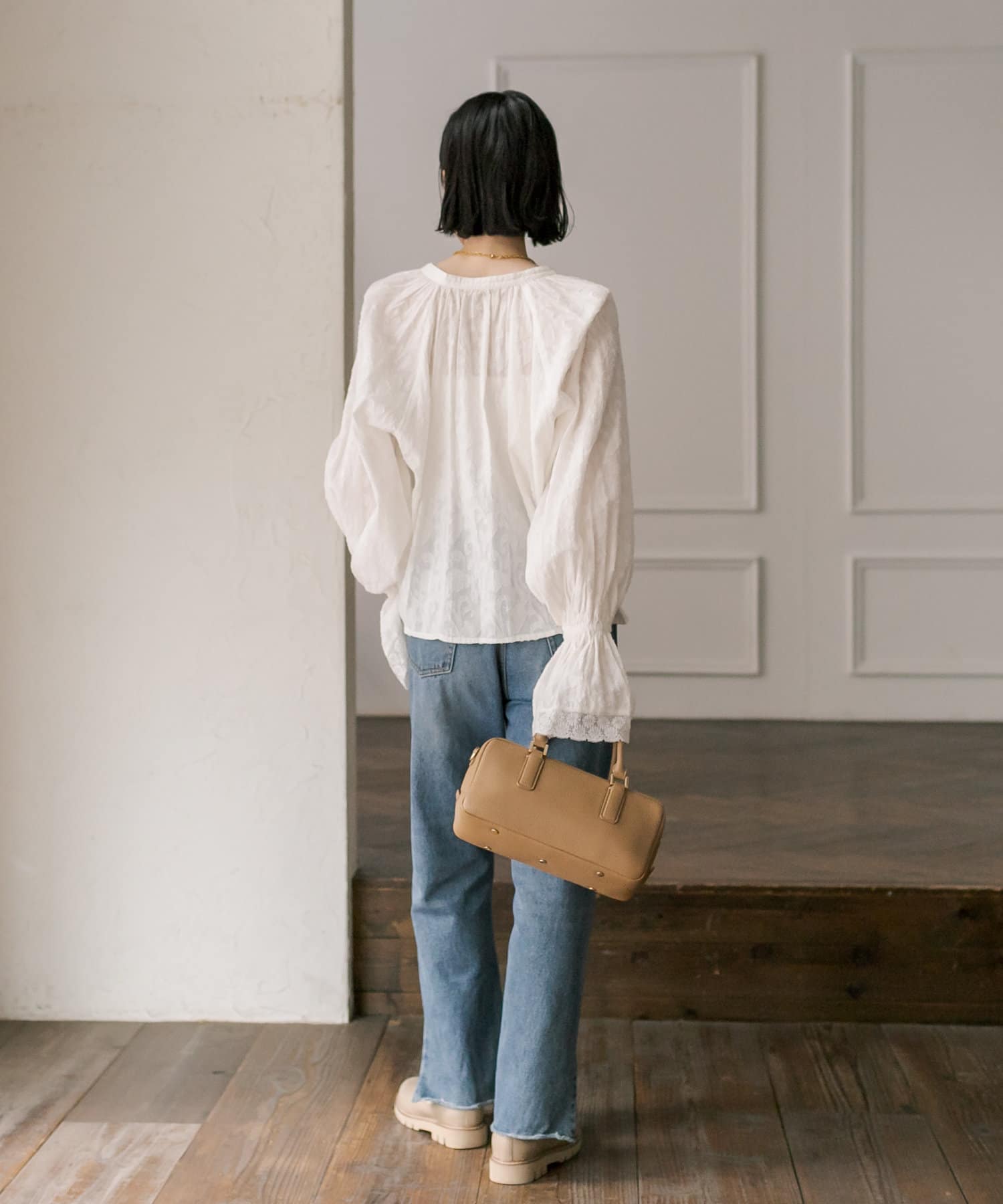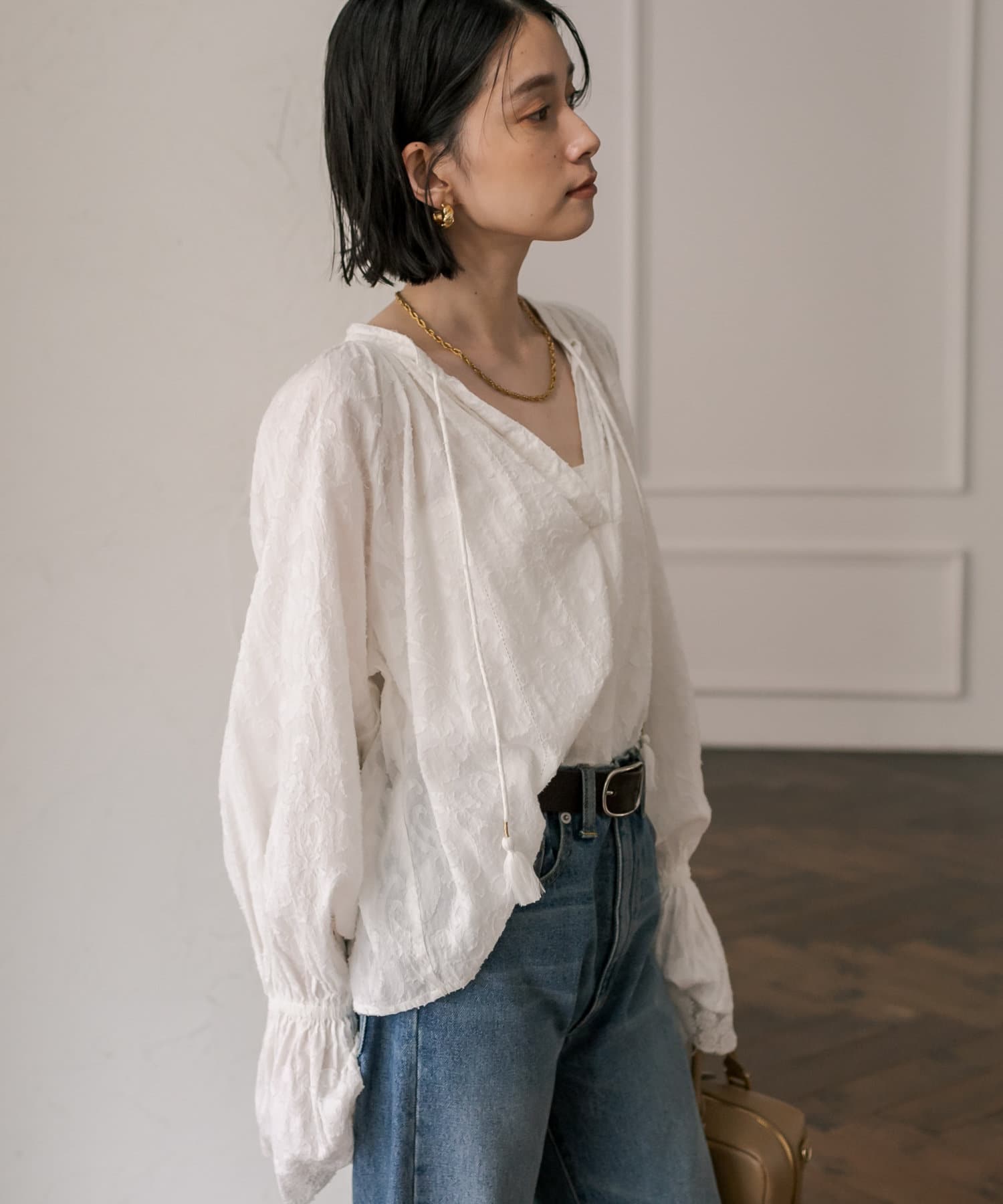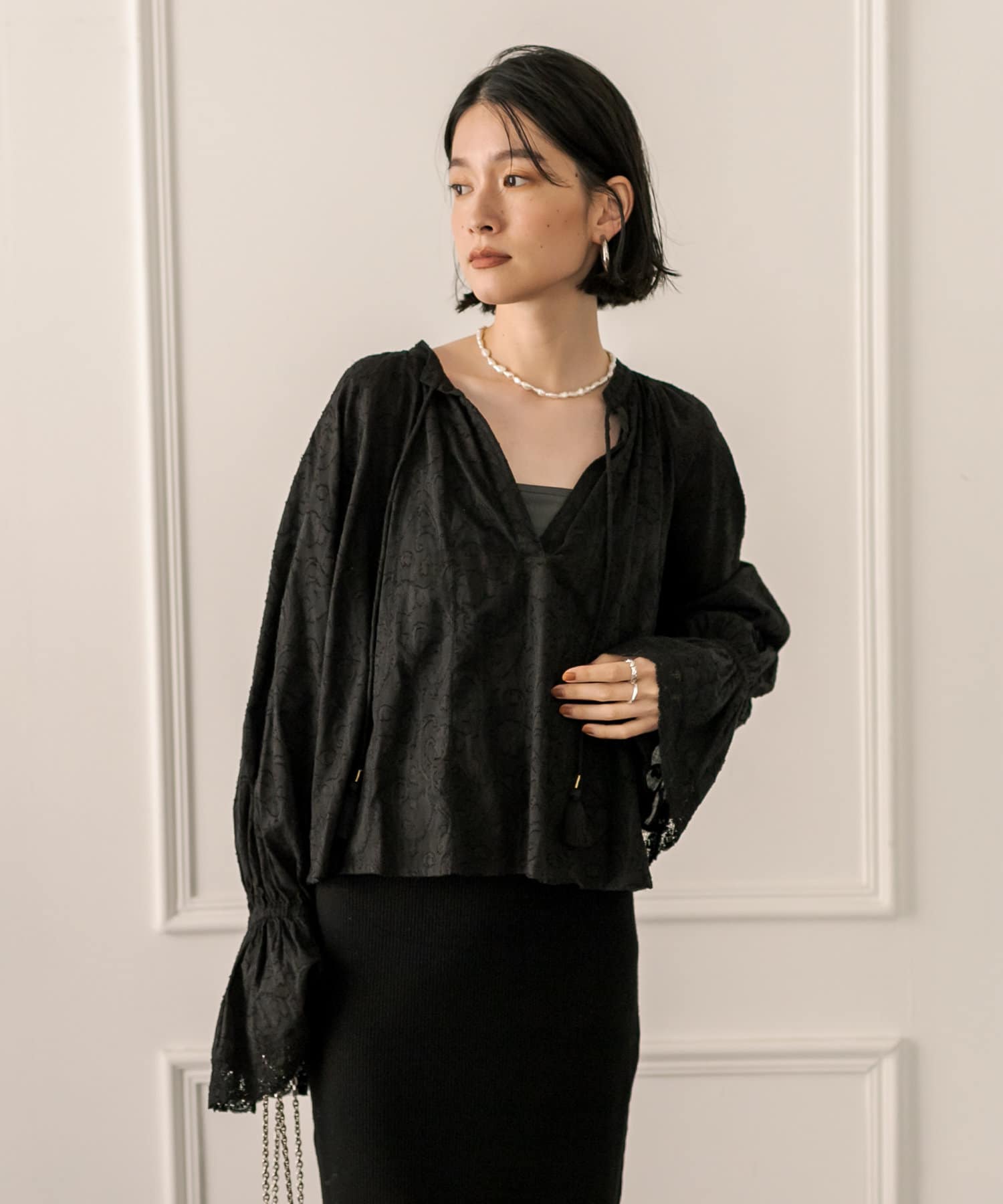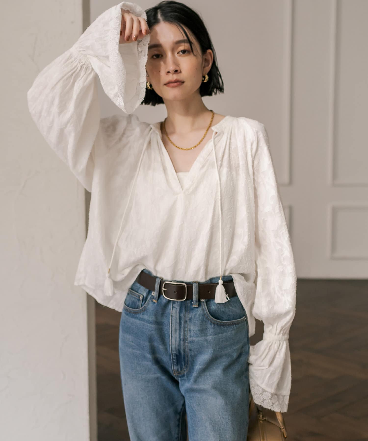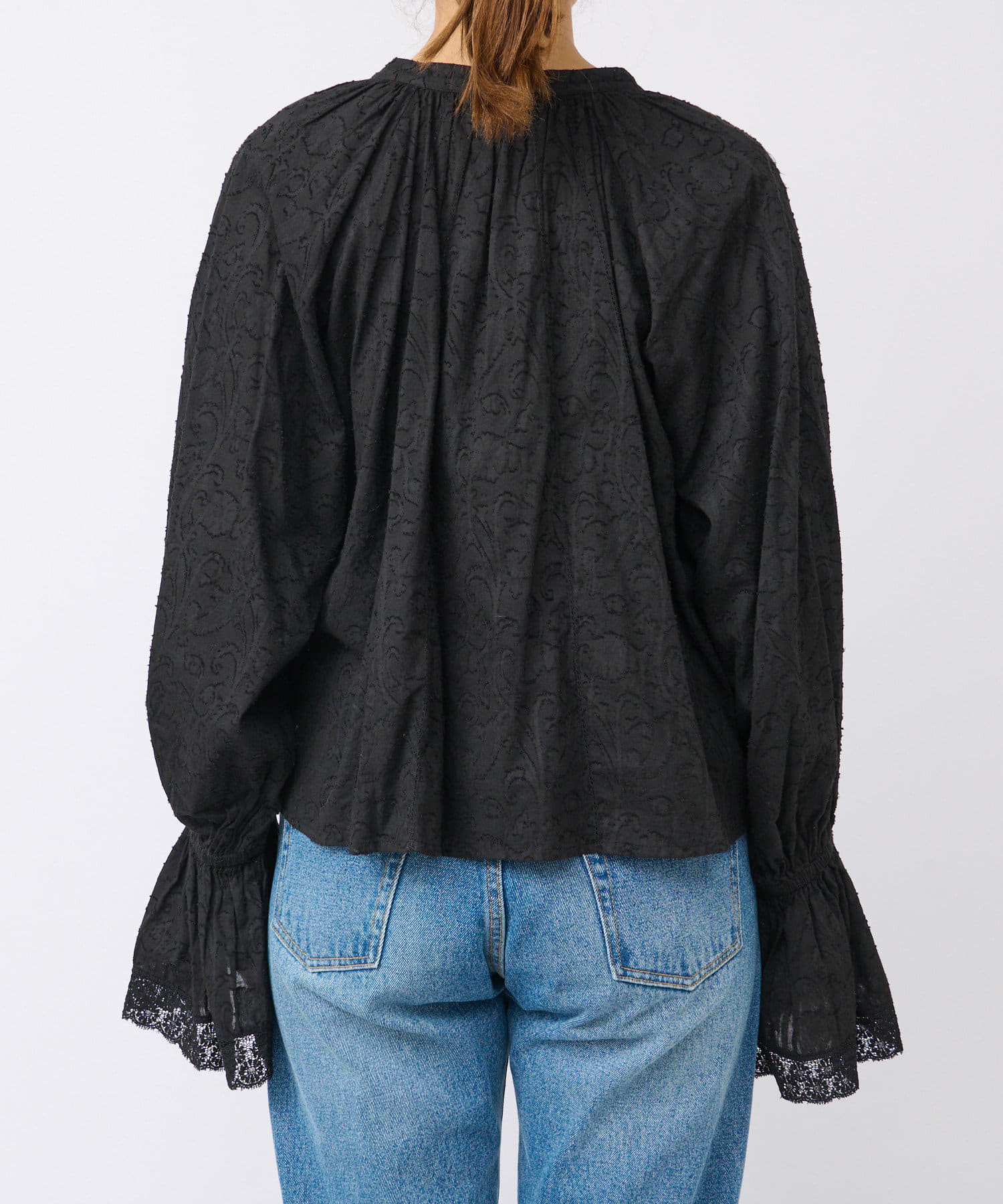 柔らかいジャガード生地と、袖のデザインが華やかなブラウス。