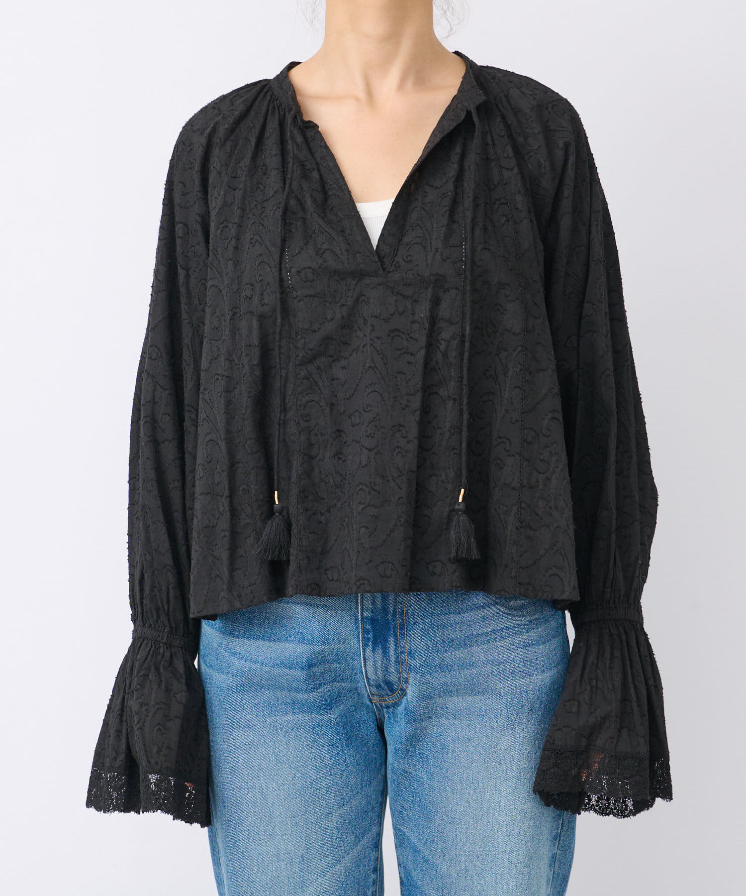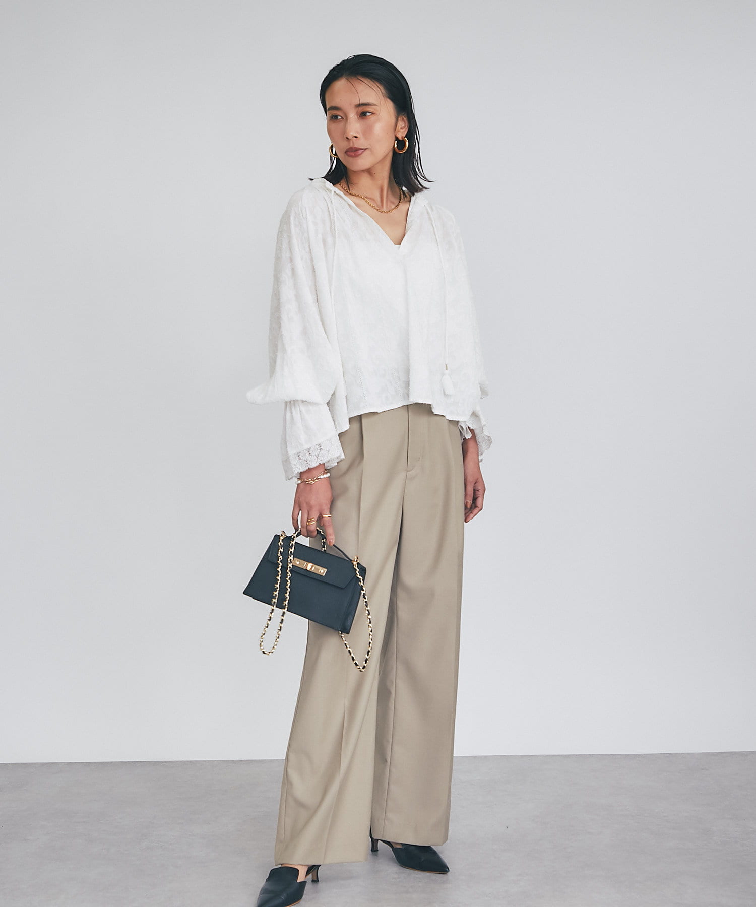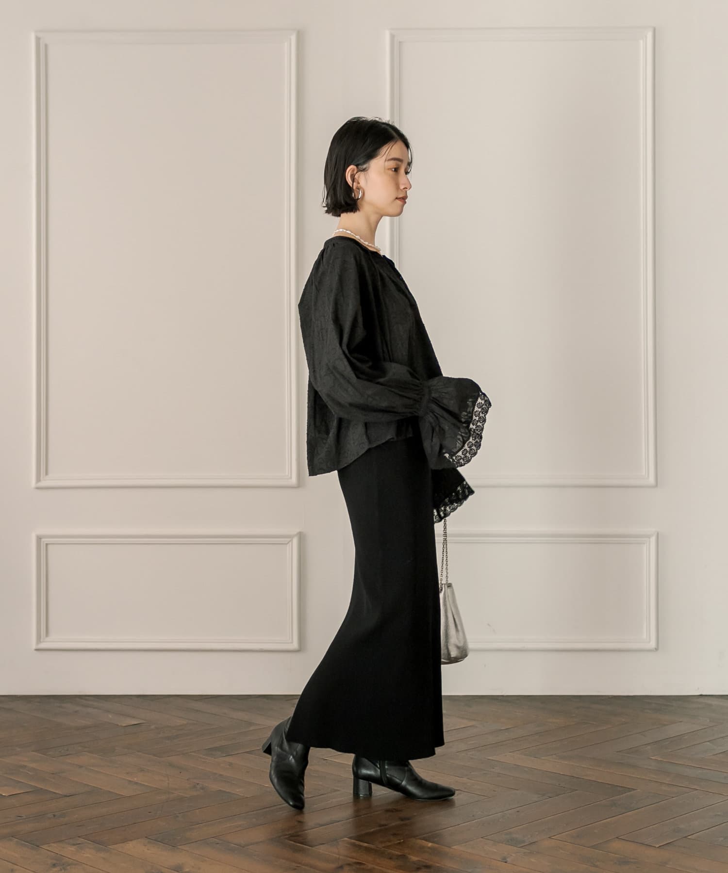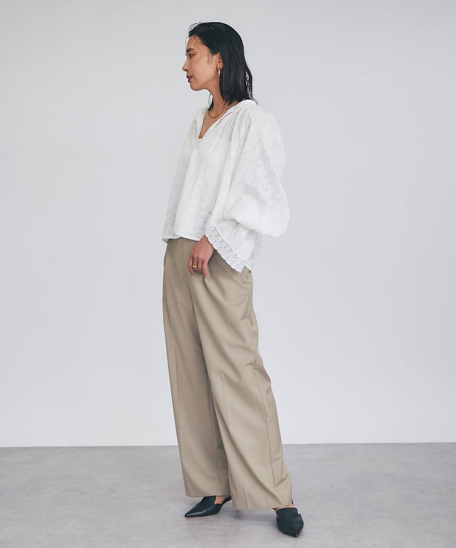 柔らかいジャガード生地と、袖のデザインが華やかなブラウス。