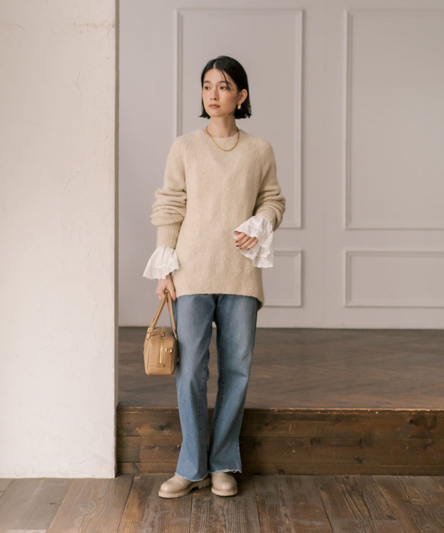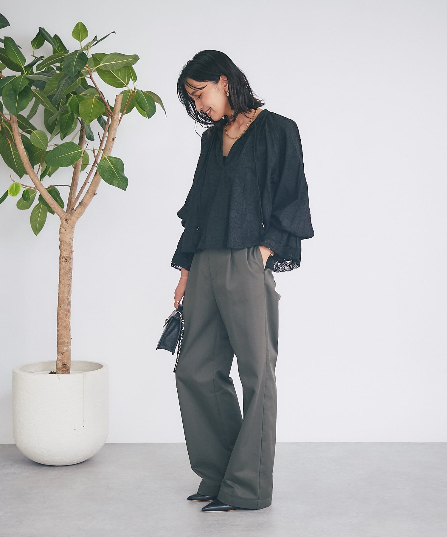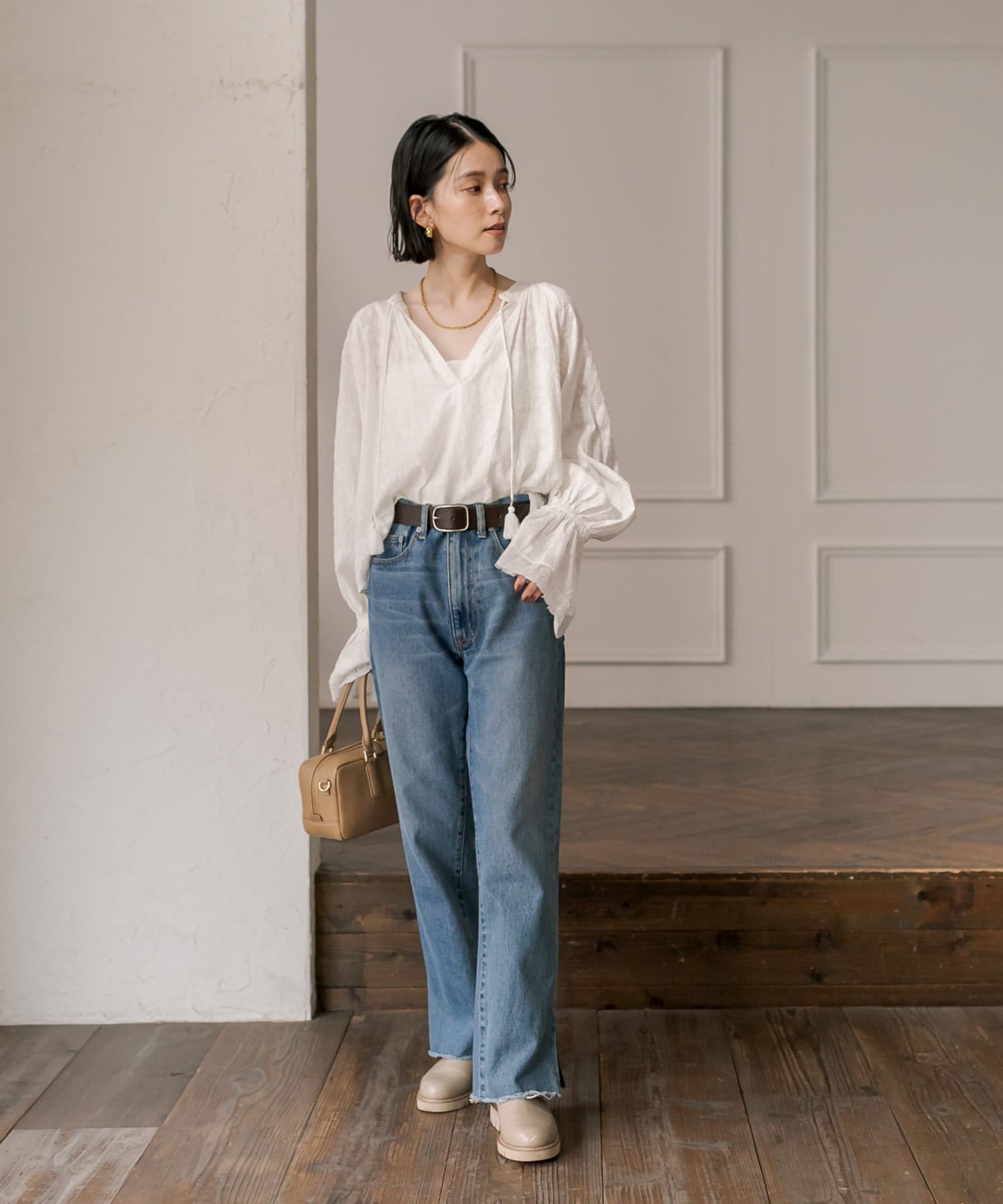 普段着ならデニムやワイドパンツを合わせて甘さを抑えたコーディネートがおすすめ。