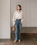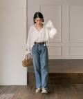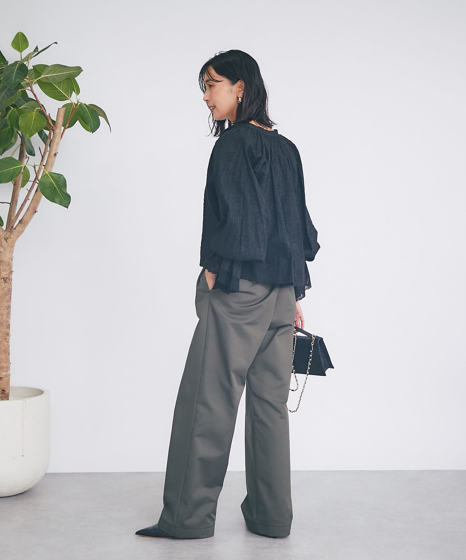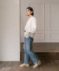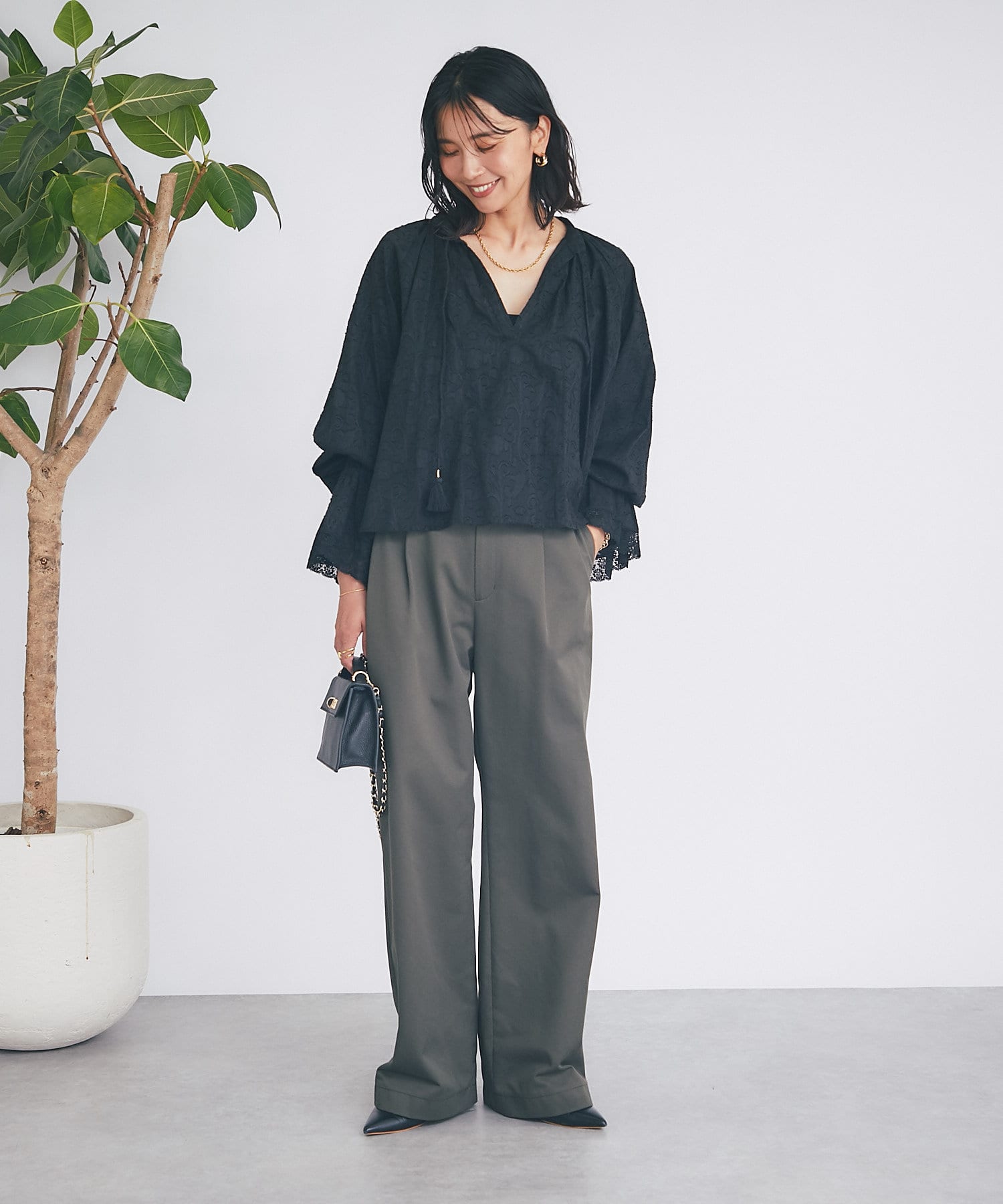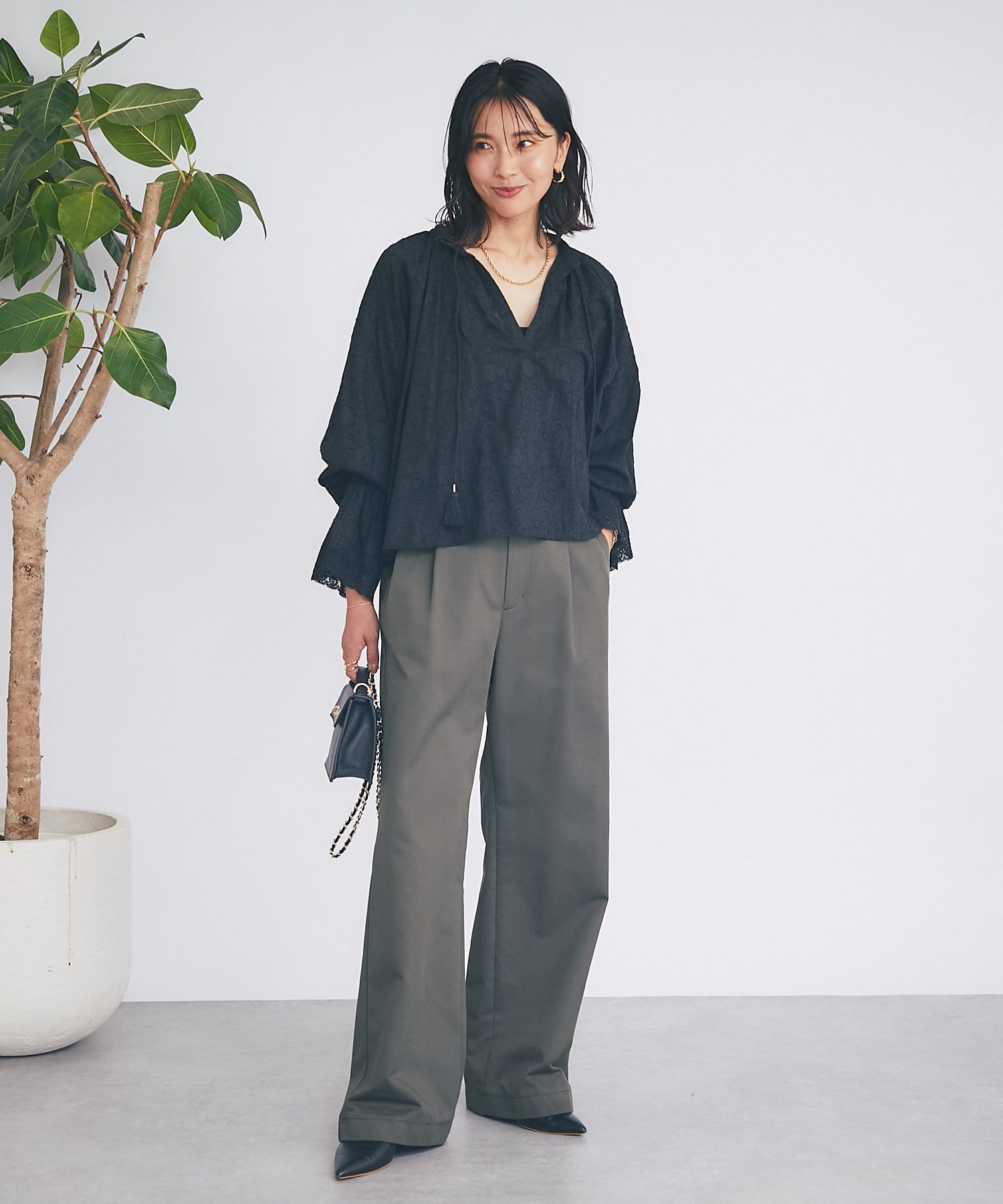 普段着ならデニムやワイドパンツを合わせて甘さを抑えたコーディネートがおすすめ。