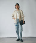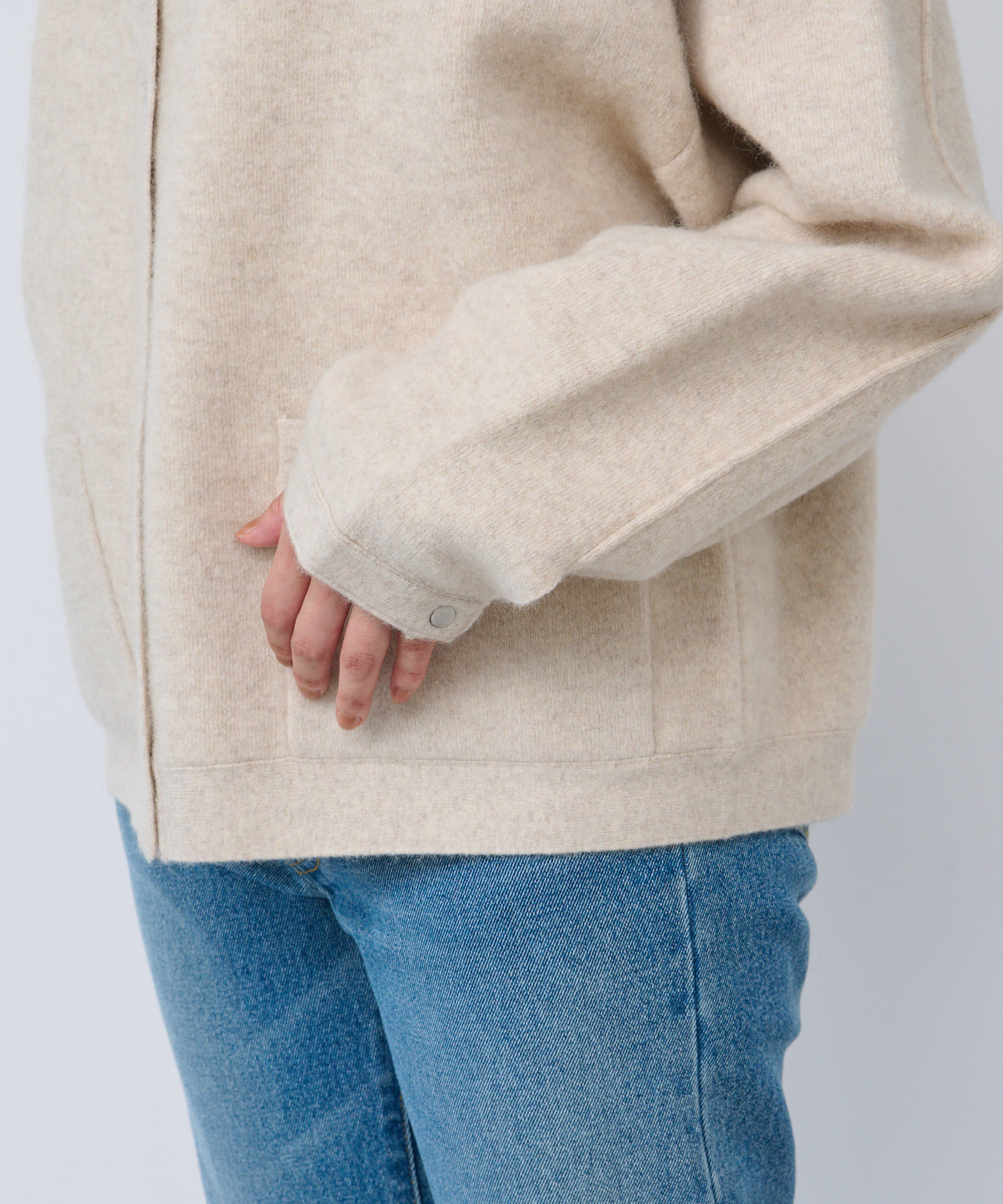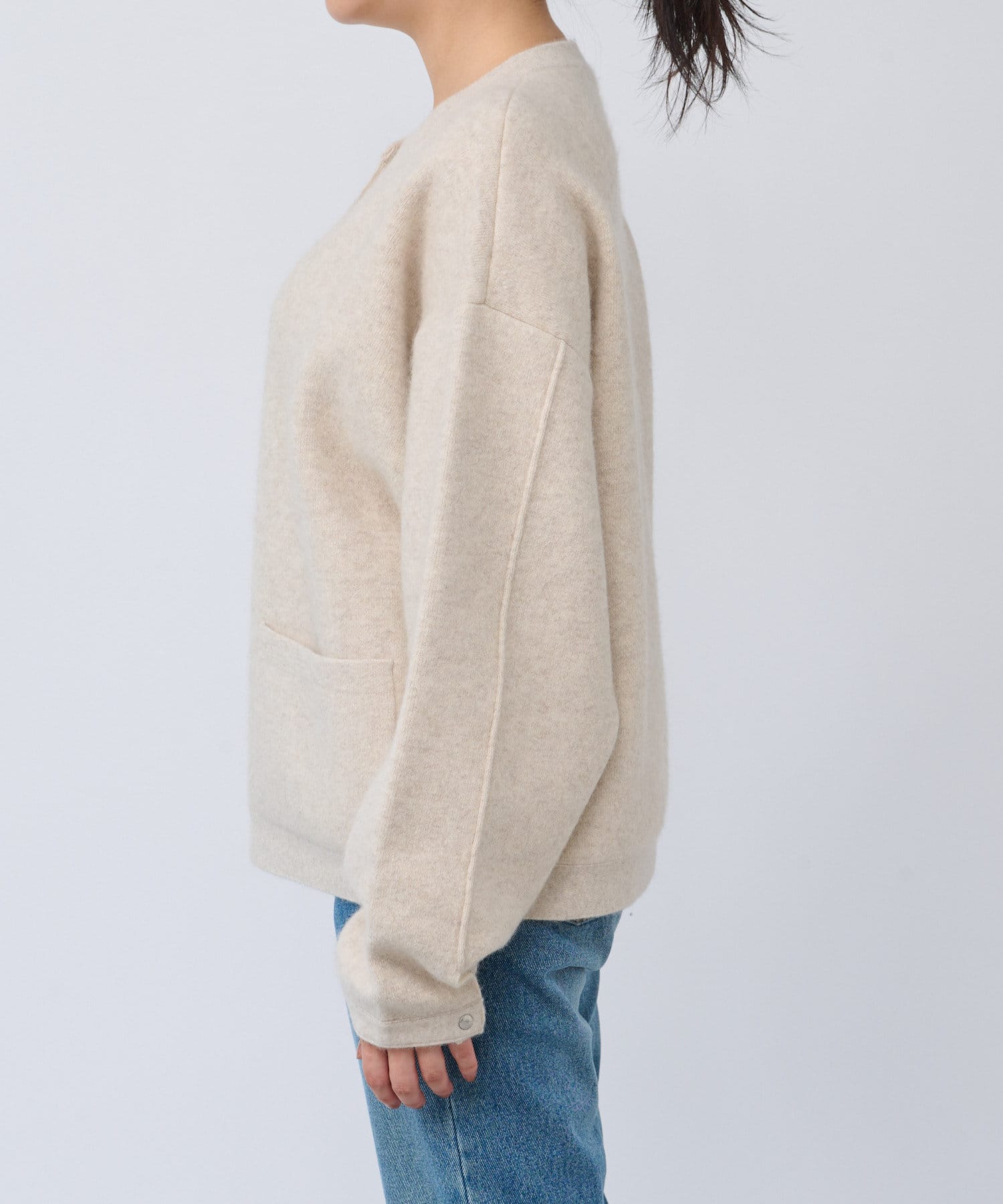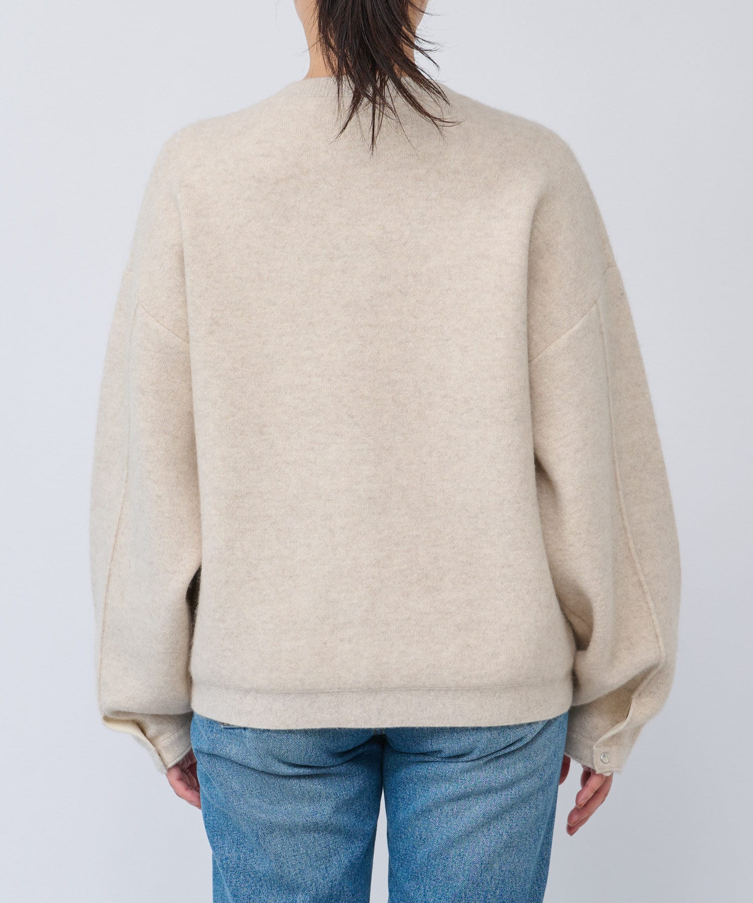 ボリューム感のあるやや長めの袖や、ヒップにかかる程度の着丈など、全体的にゆったりとしたシルエットでリラックスしてお召いただける1着。