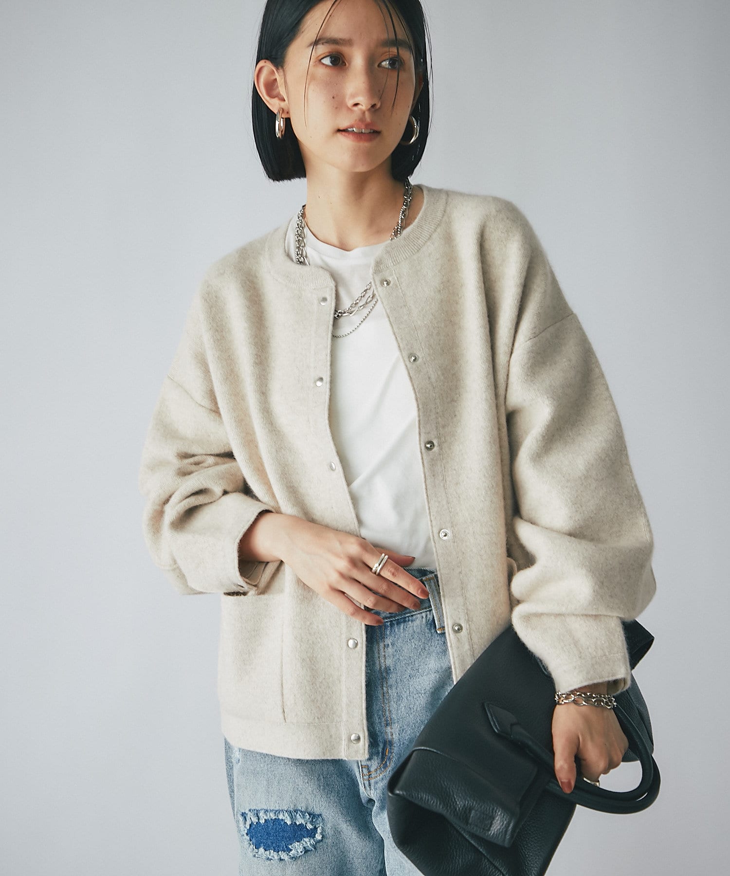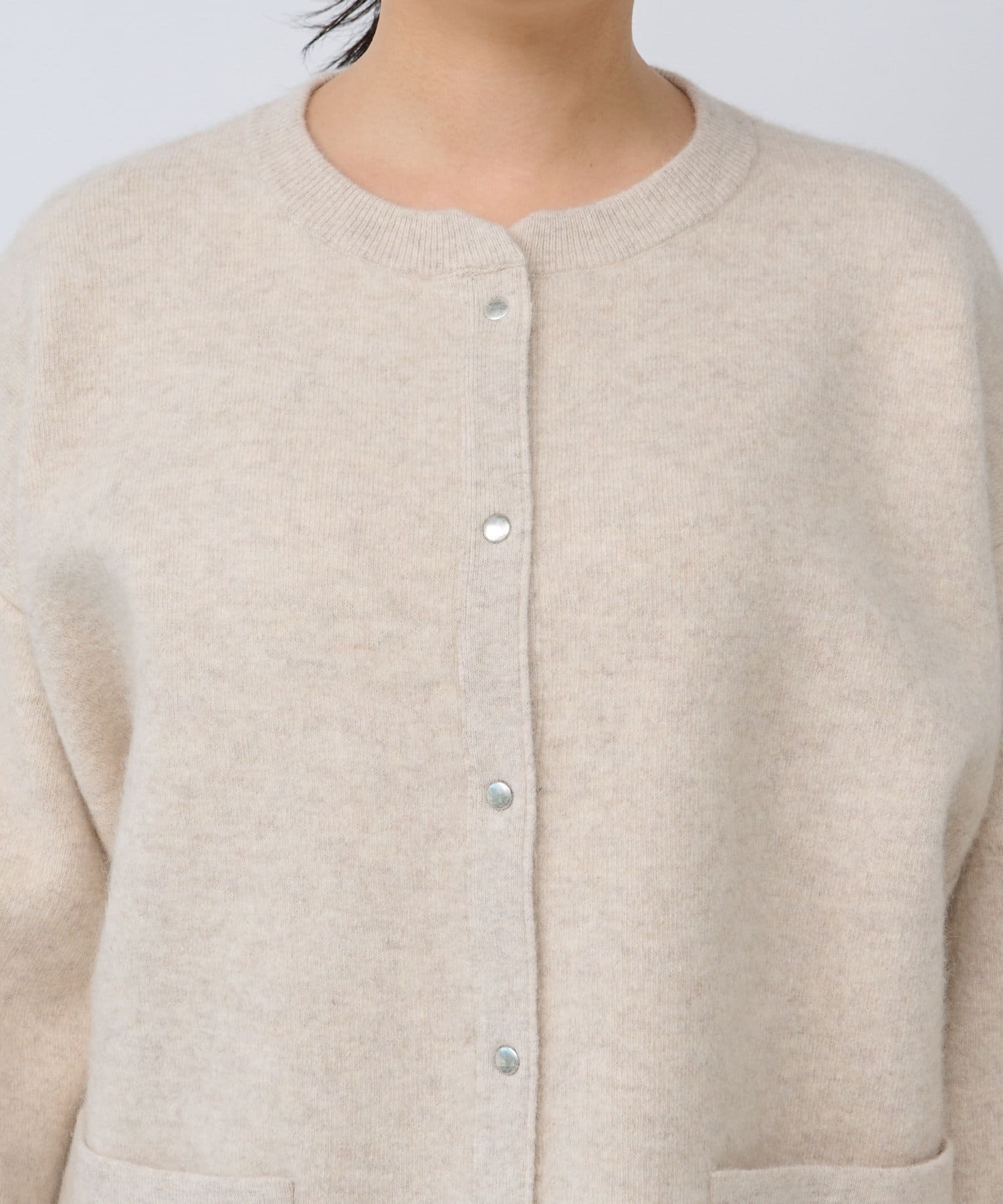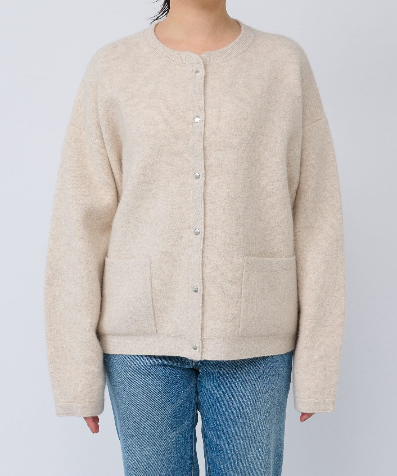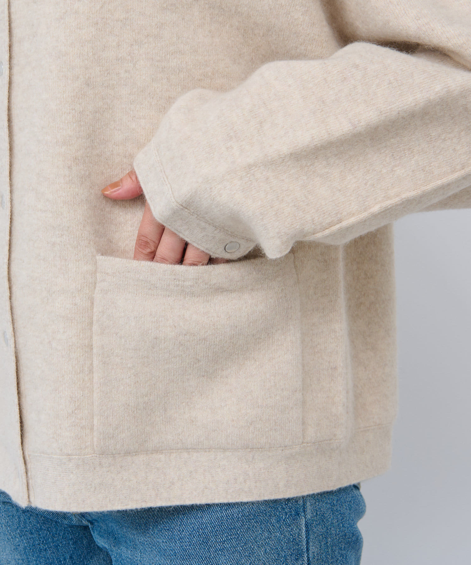 ボリューム感のあるやや長めの袖や、ヒップにかかる程度の着丈など、全体的にゆったりとしたシルエットでリラックスしてお召いただける1着。