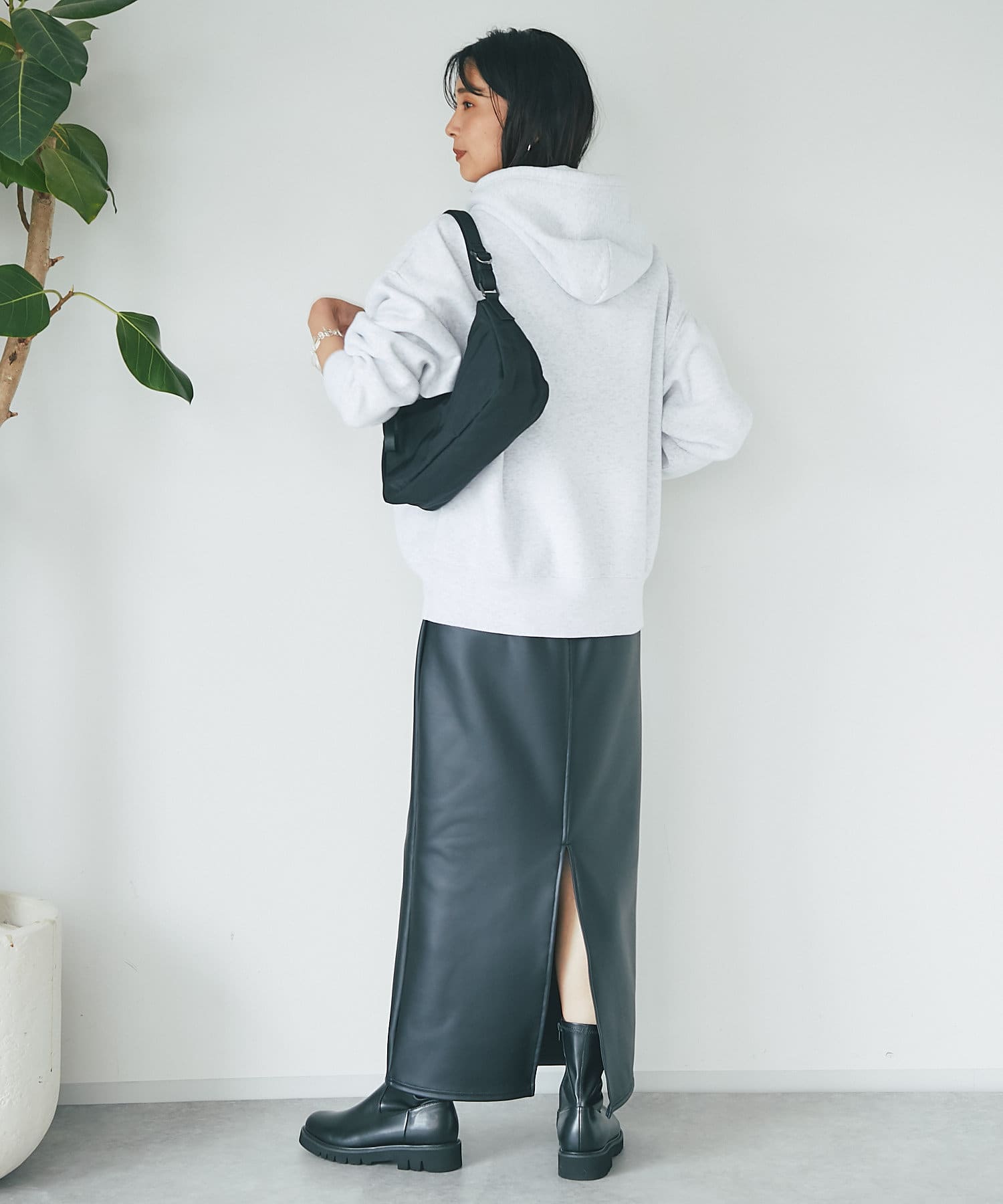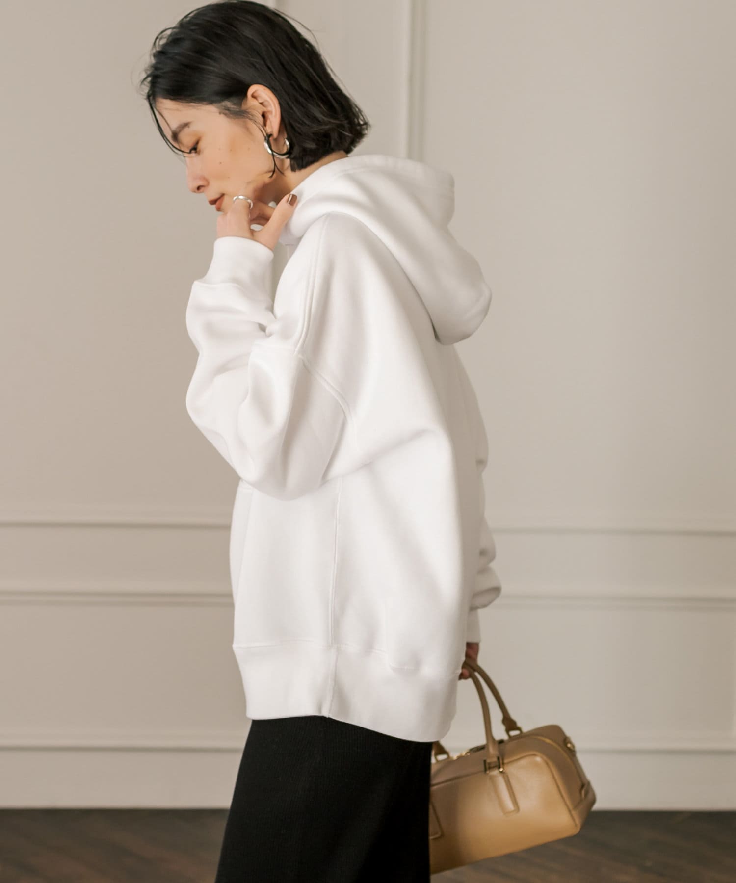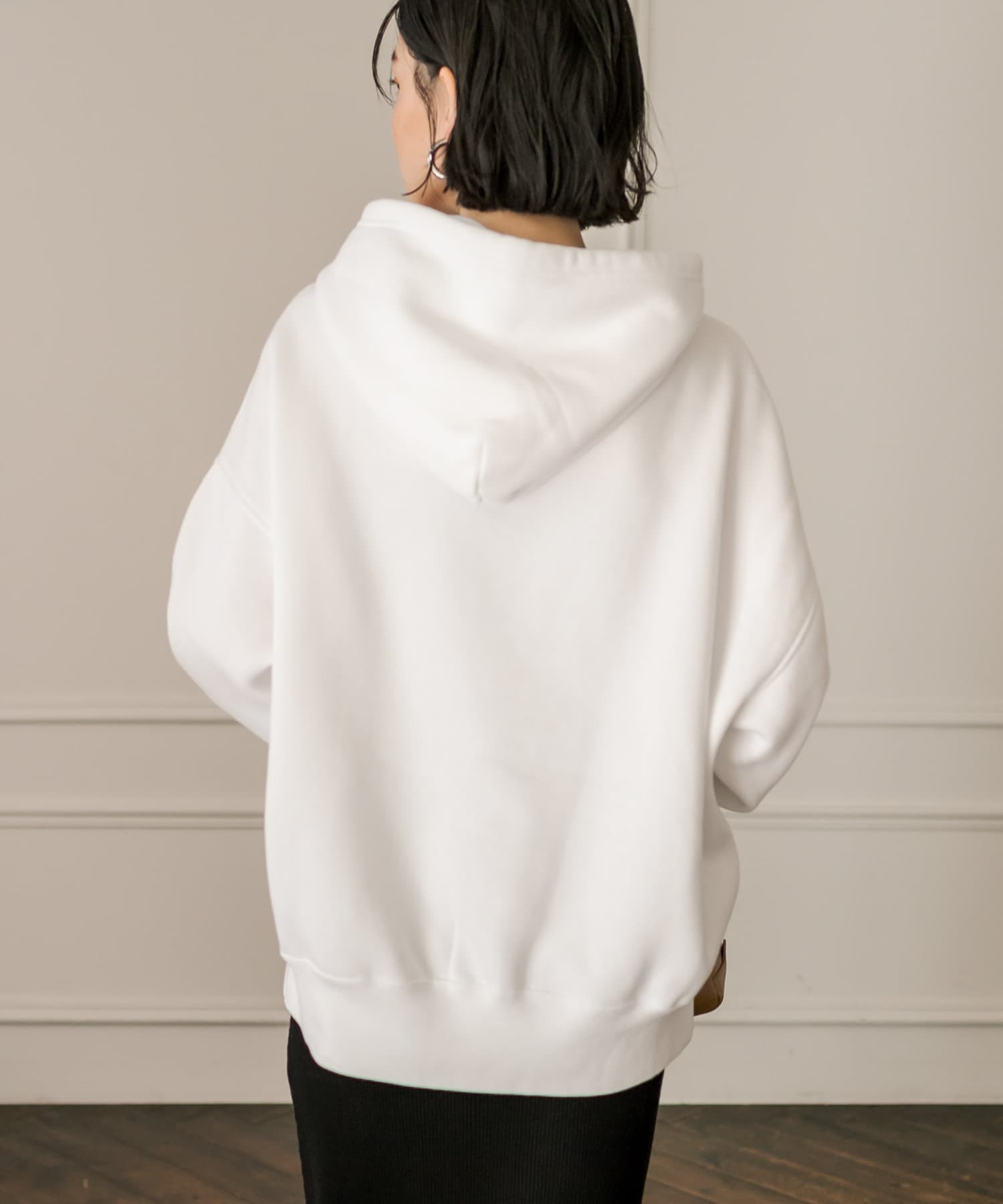 程よいゆったり感で体のラインを拾いづらく、腰のあたりまで隠れる着丈なので、ボトムの形も選びません。