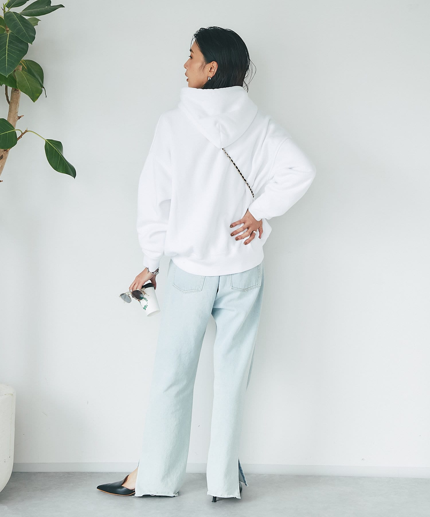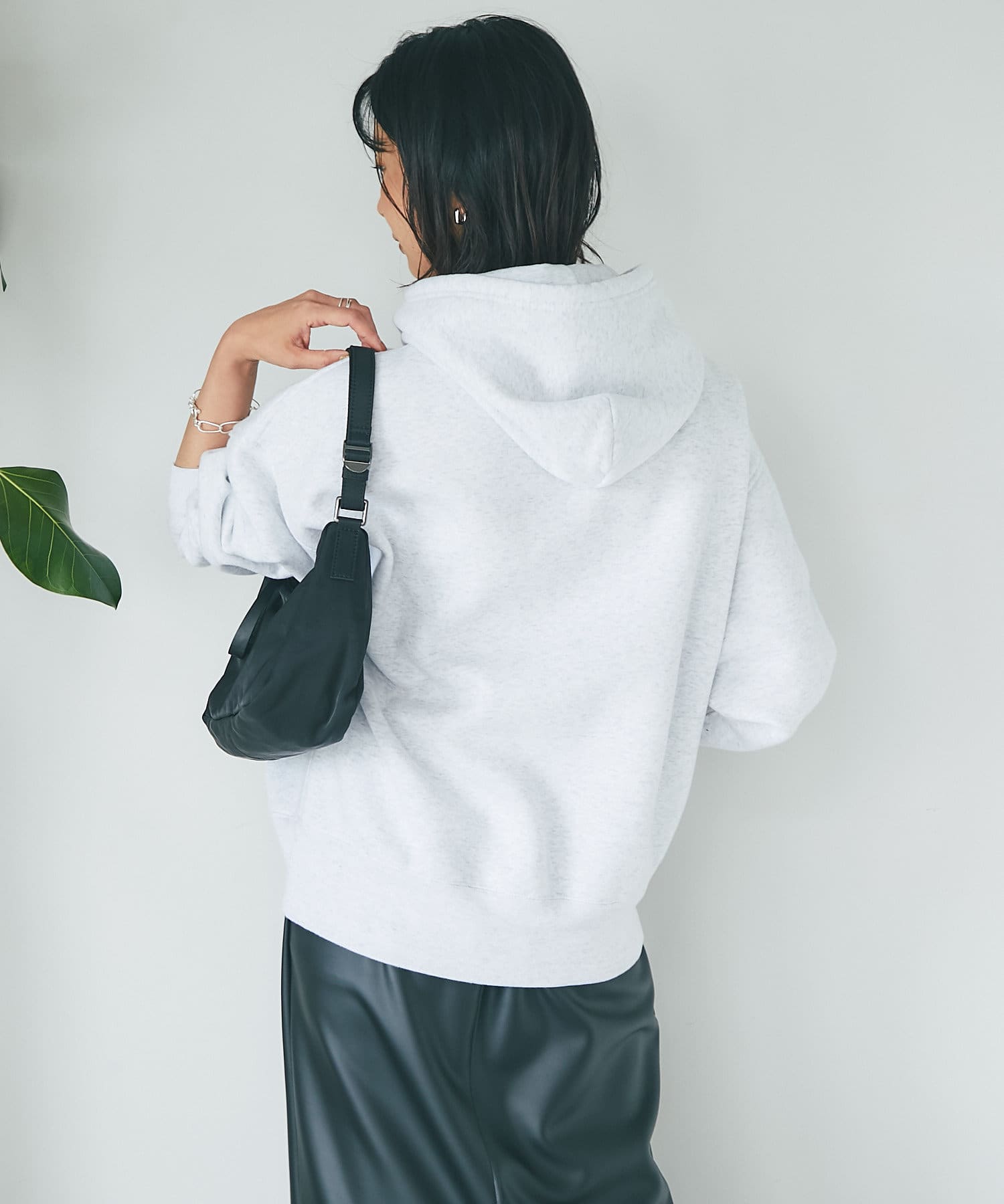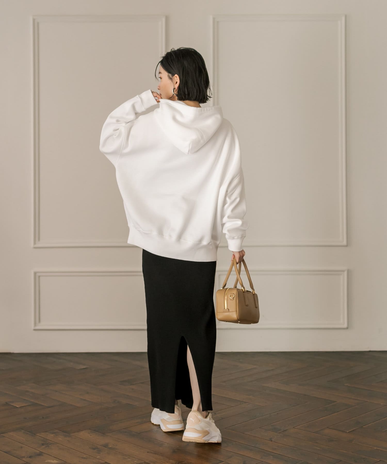 程よいゆったり感で体のラインを拾いづらく、腰のあたりまで隠れる着丈なので、ボトムの形も選びません。