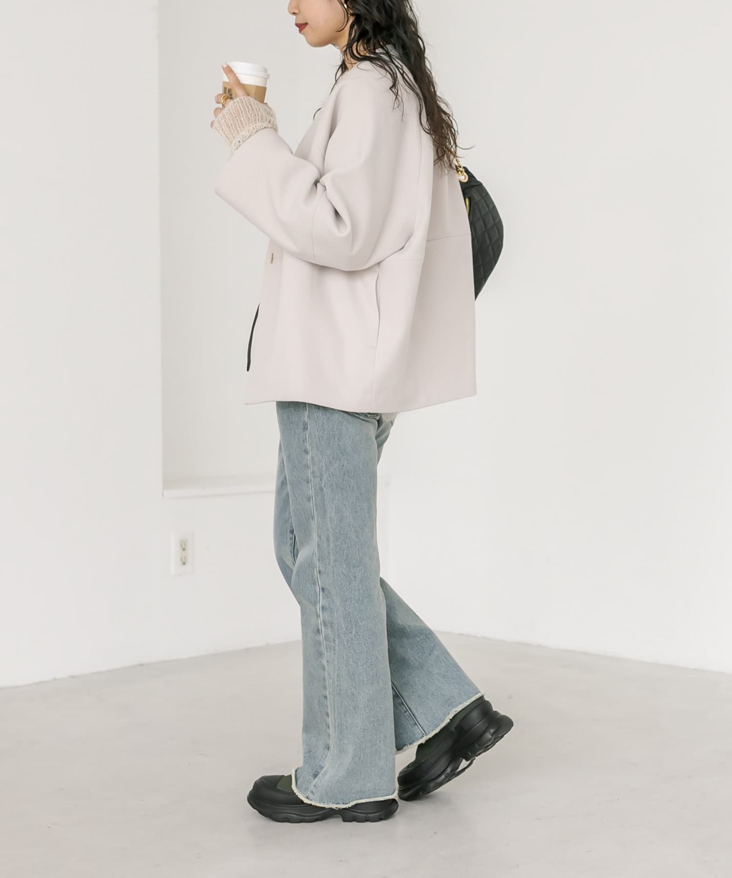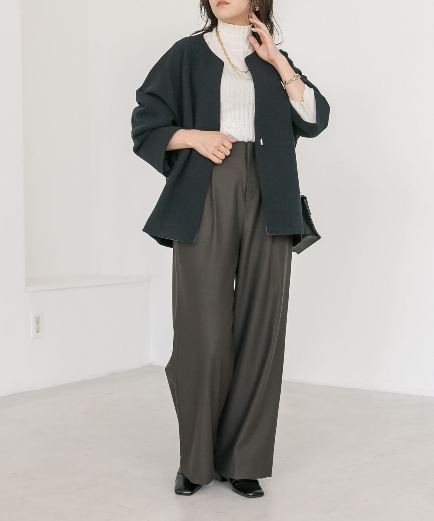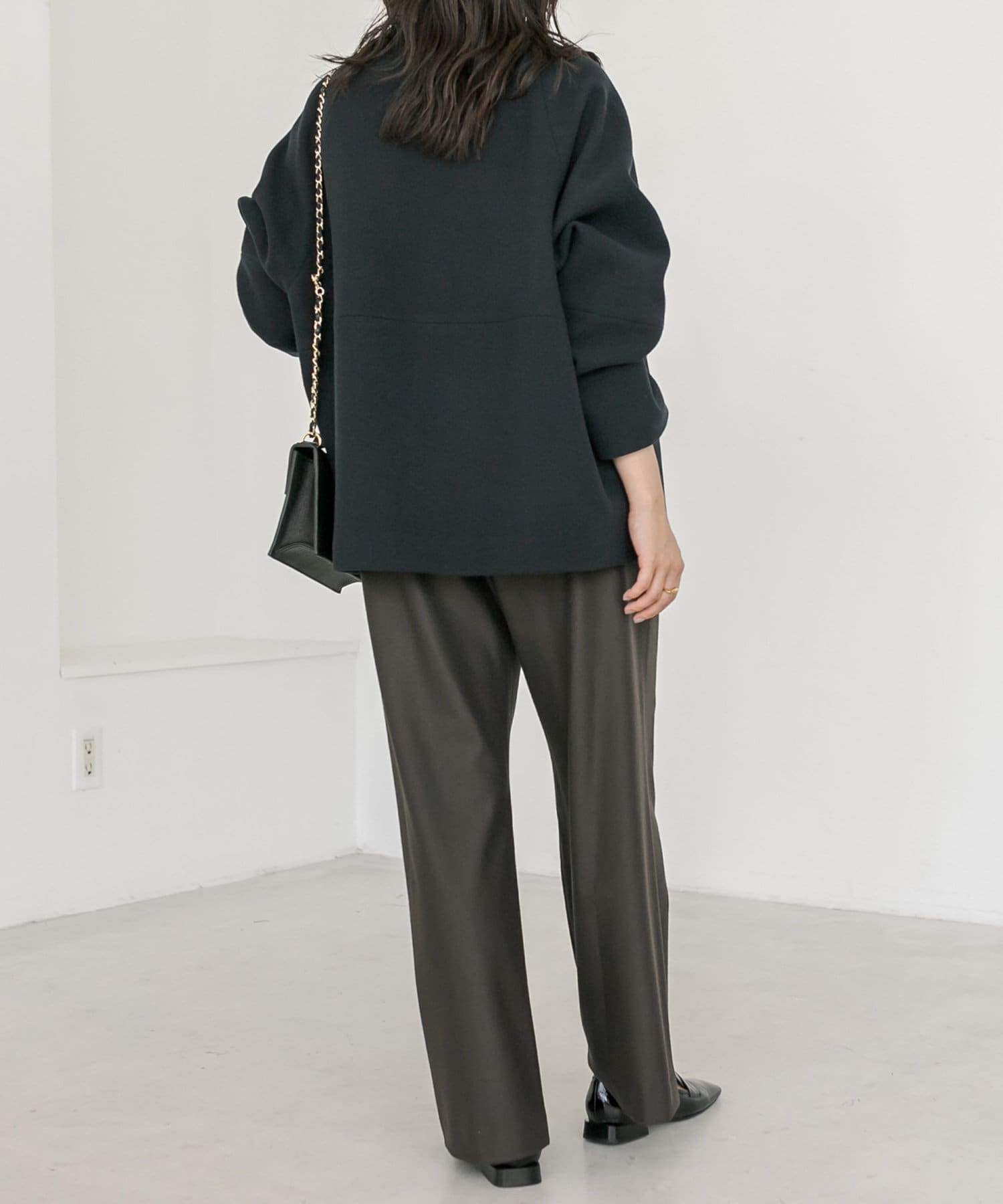 ボトムもシルエットを問わず合わせていただけますが、コクーンシルエットを活かすならややスッキリとしたパンツを合わせていただくのがオススメ。