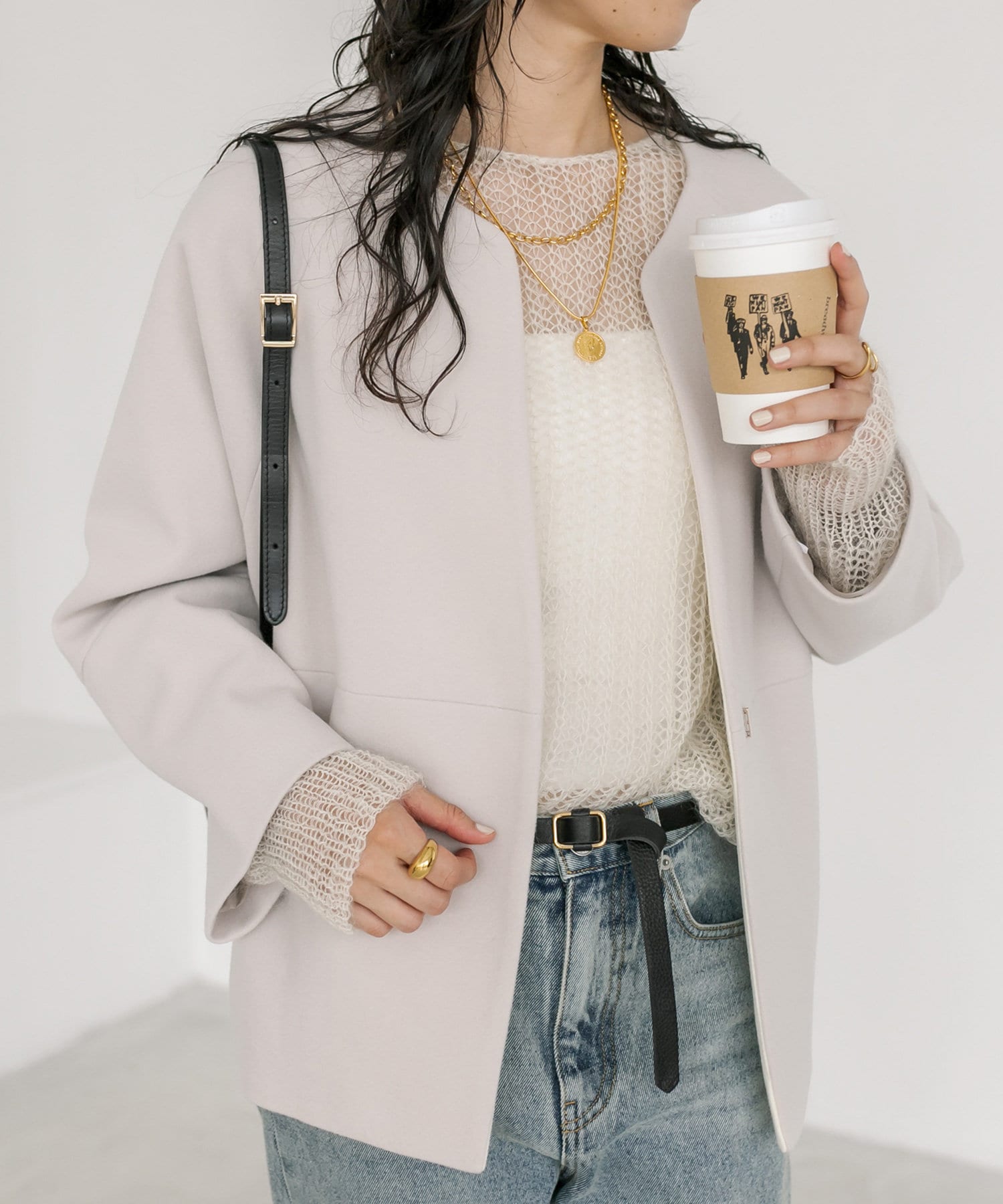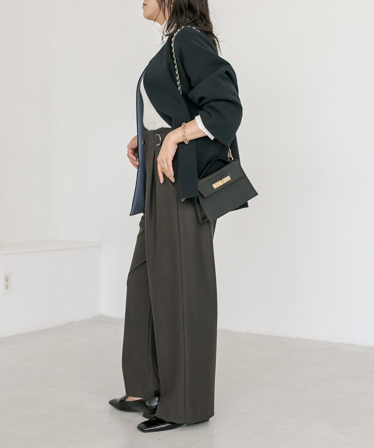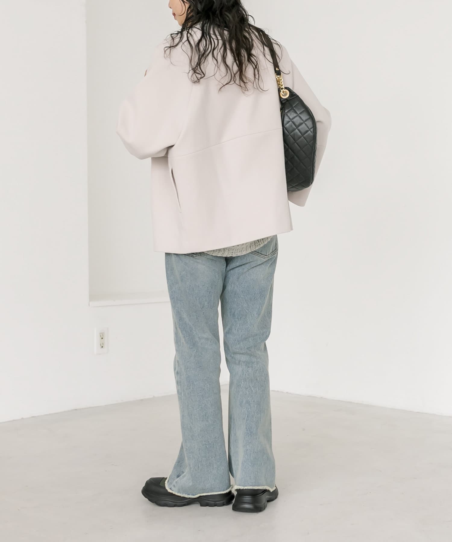 ボトムもシルエットを問わず合わせていただけますが、コクーンシルエットを活かすならややスッキリとしたパンツを合わせていただくのがオススメ。