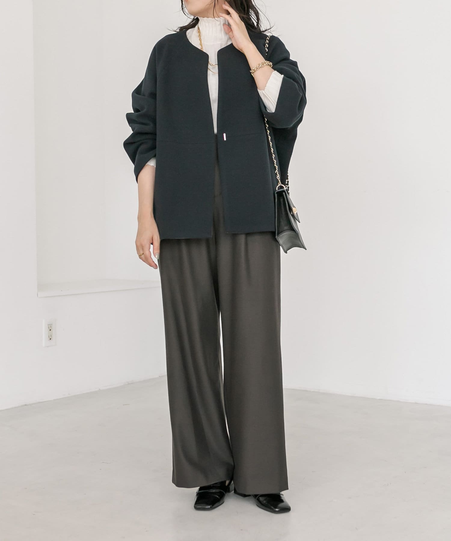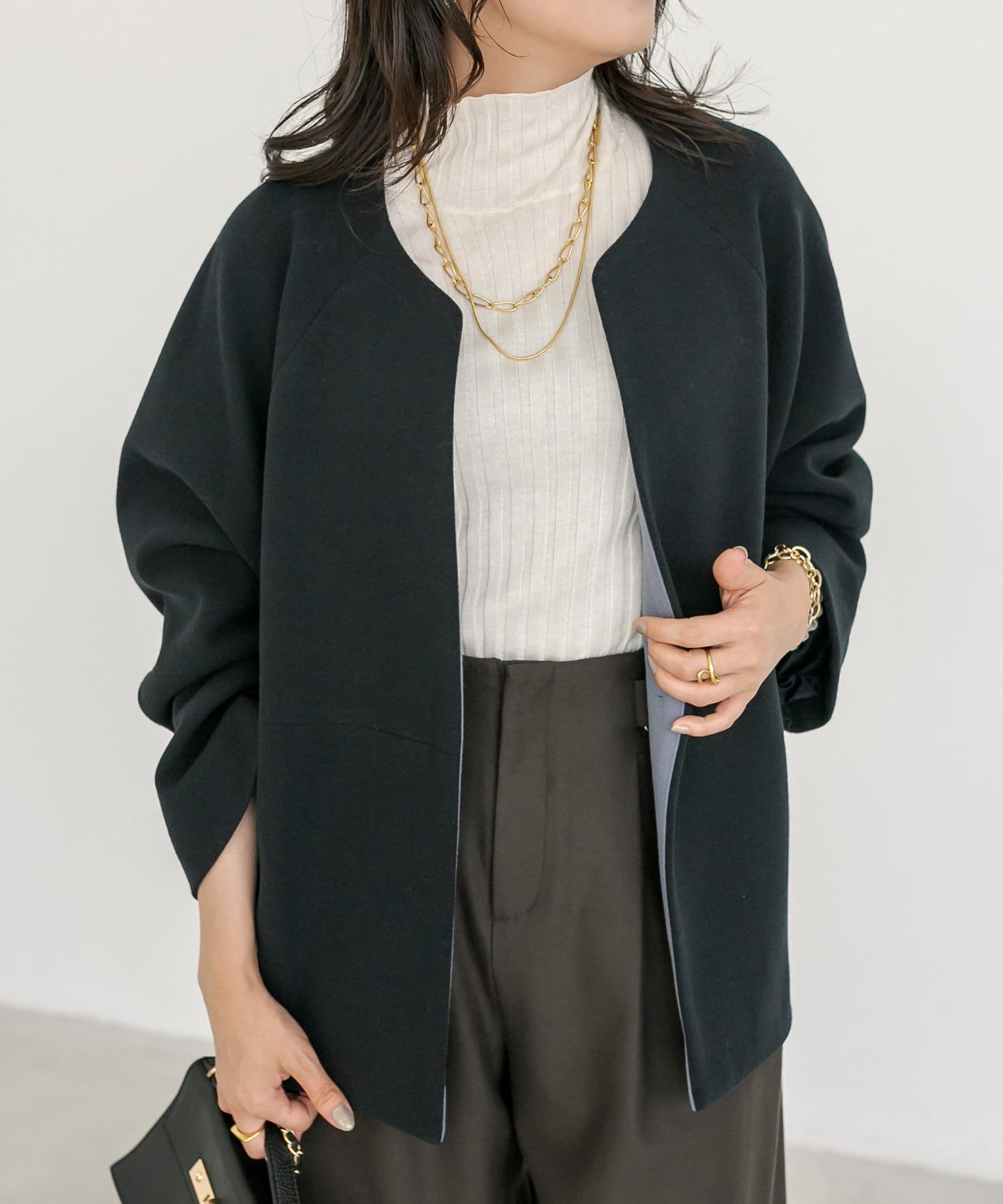 すっきりとしたネックラインで、インナーは形を問わずお召しいただけます。また、ストールなどを巻いた際にも、もたつきにくいシルエットなのも嬉しい点。