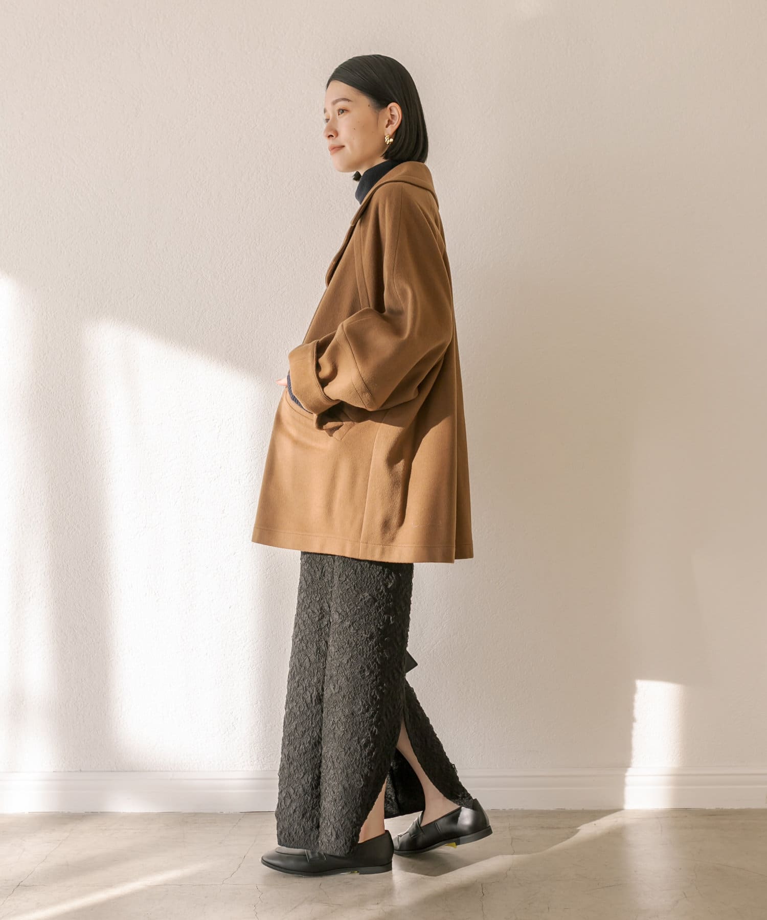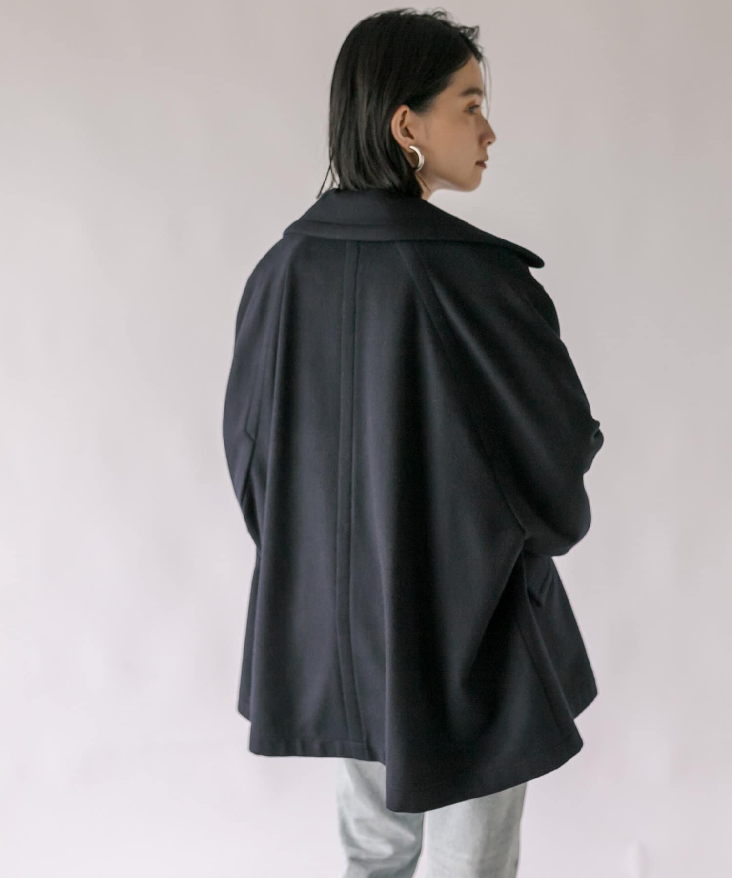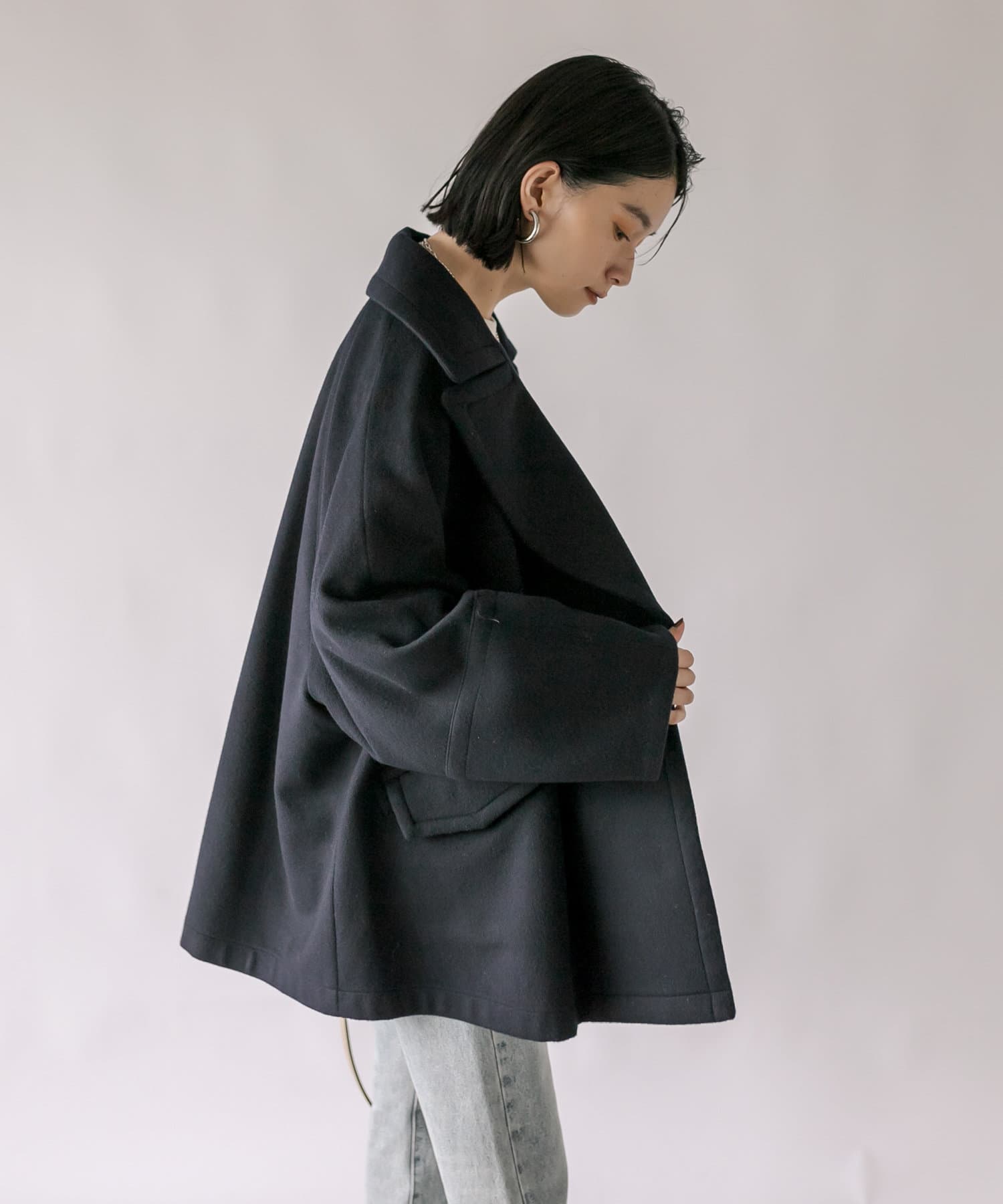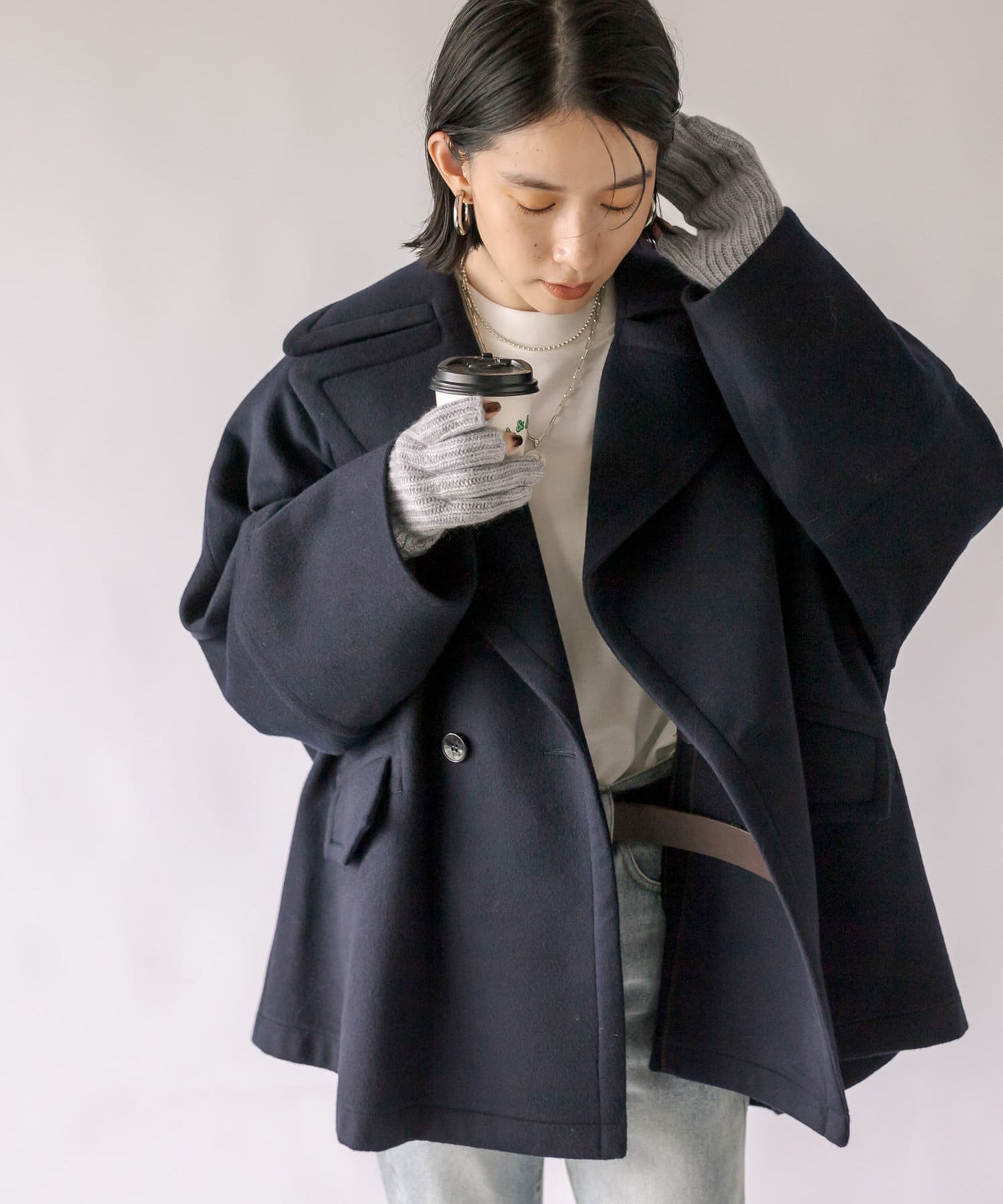 ゆったりとしたシルエットが魅力のハーフコート。