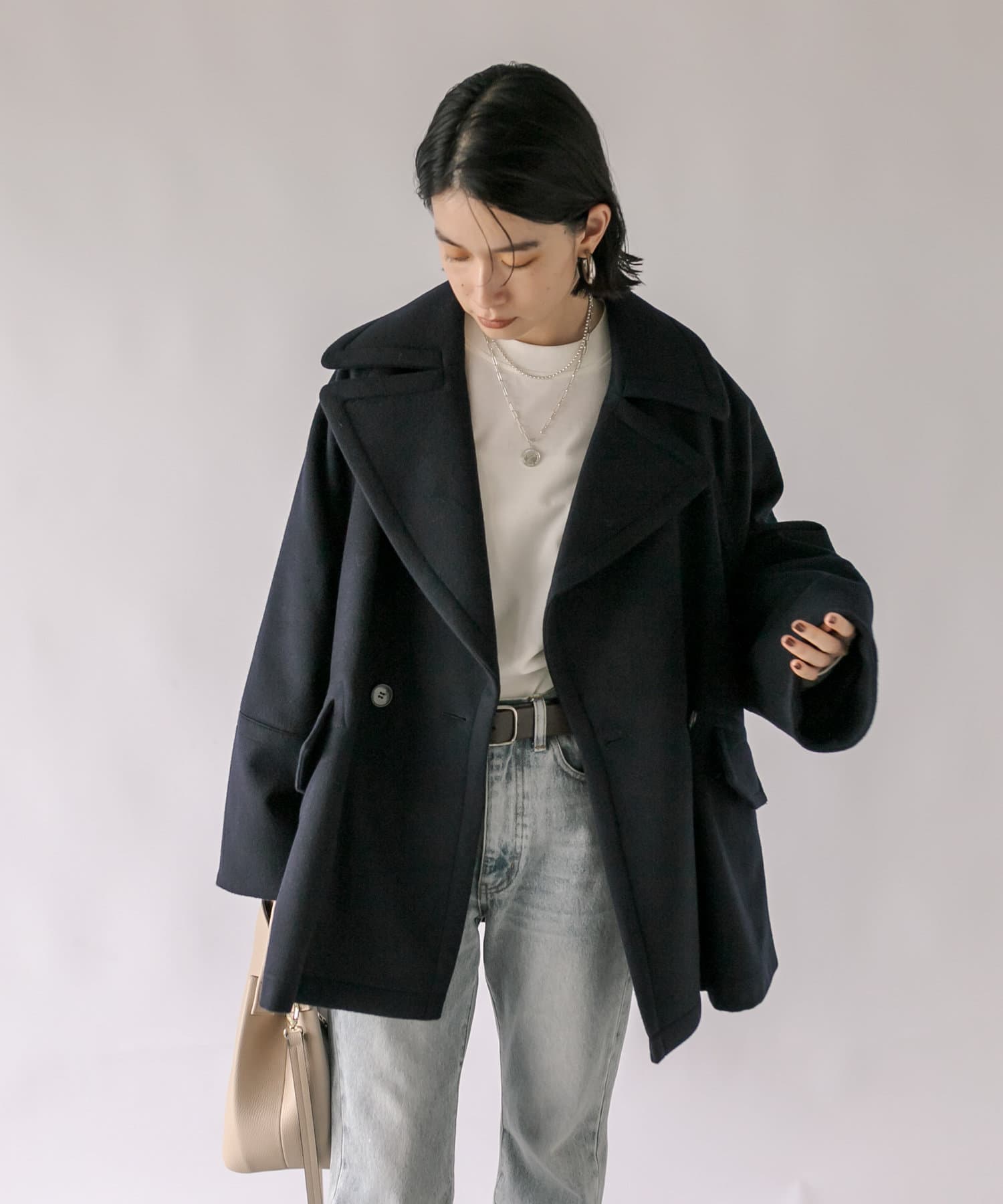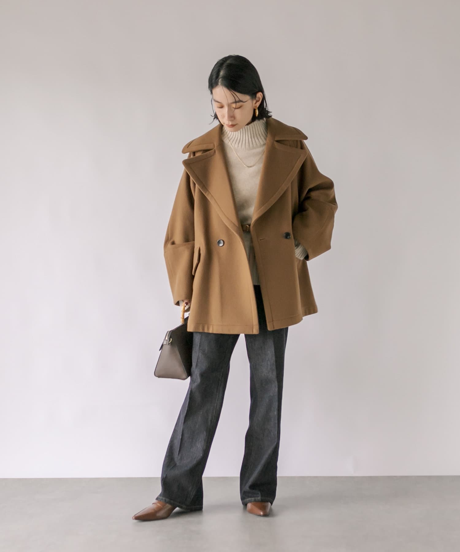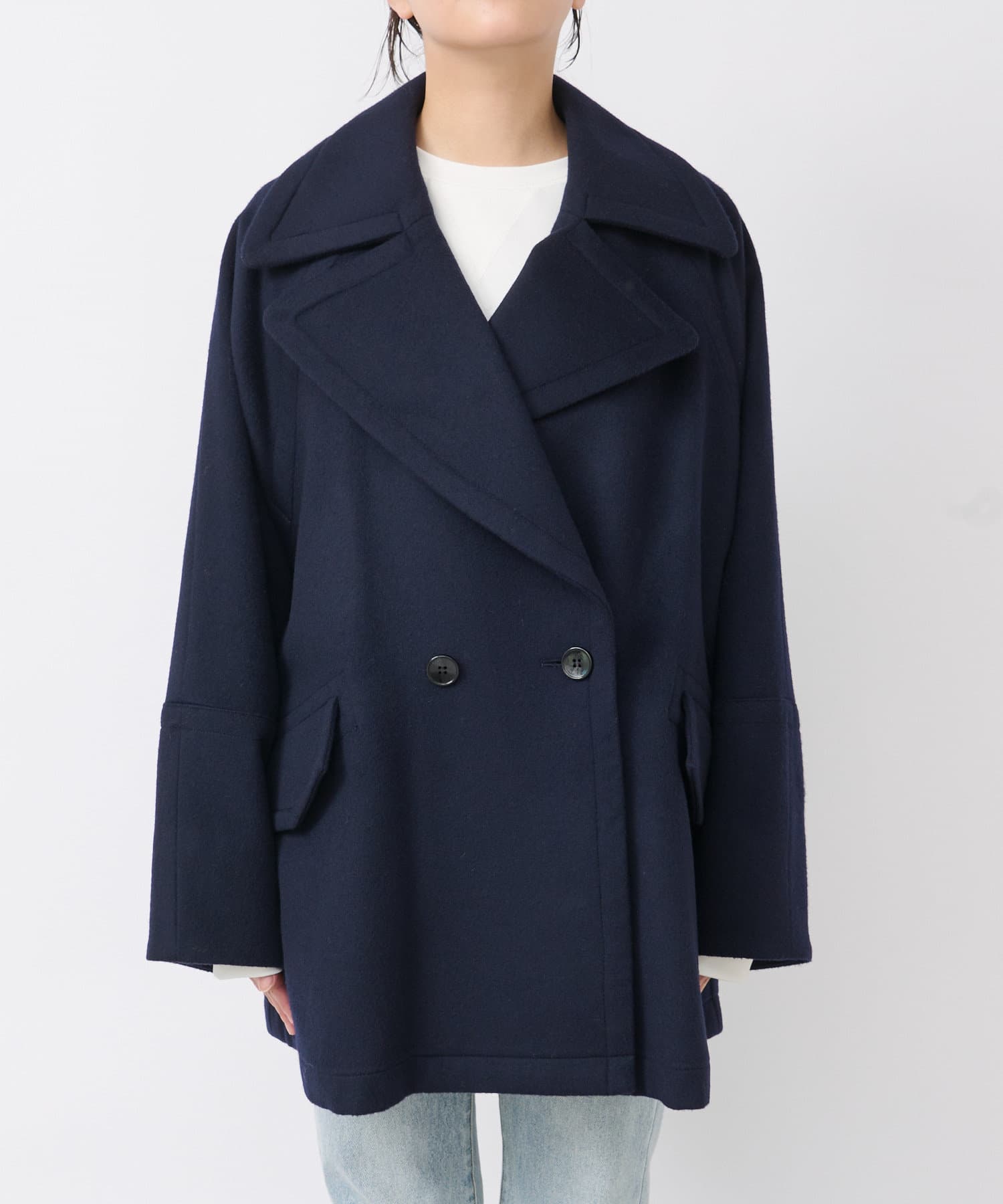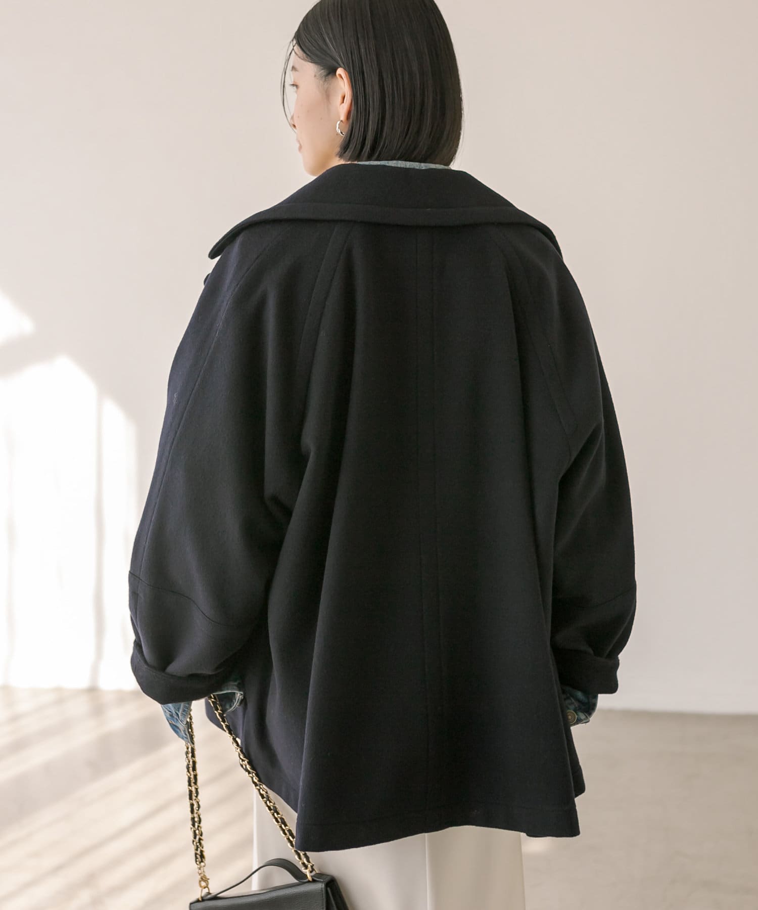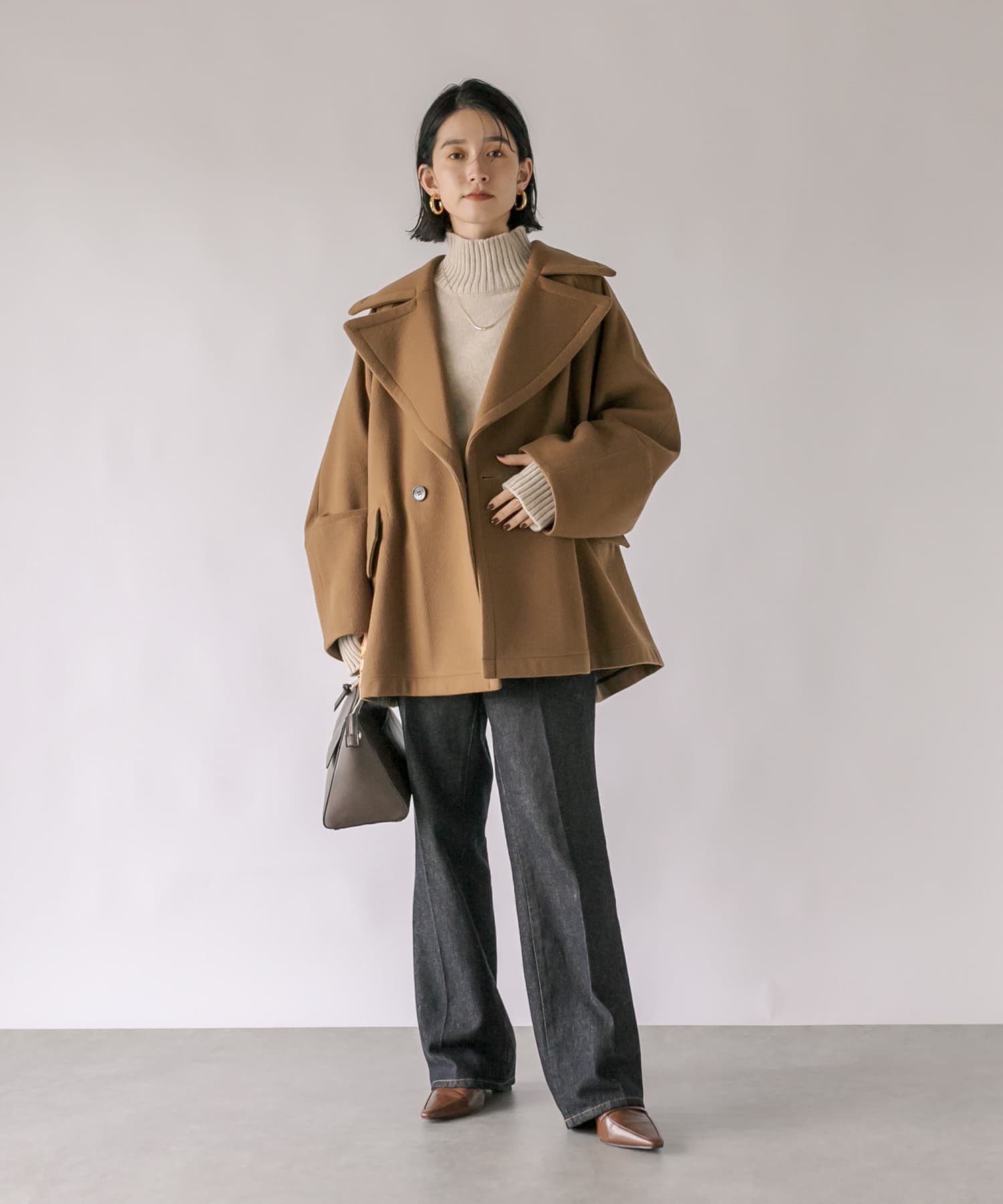 ゆったりとしたシルエットが魅力のハーフコート。