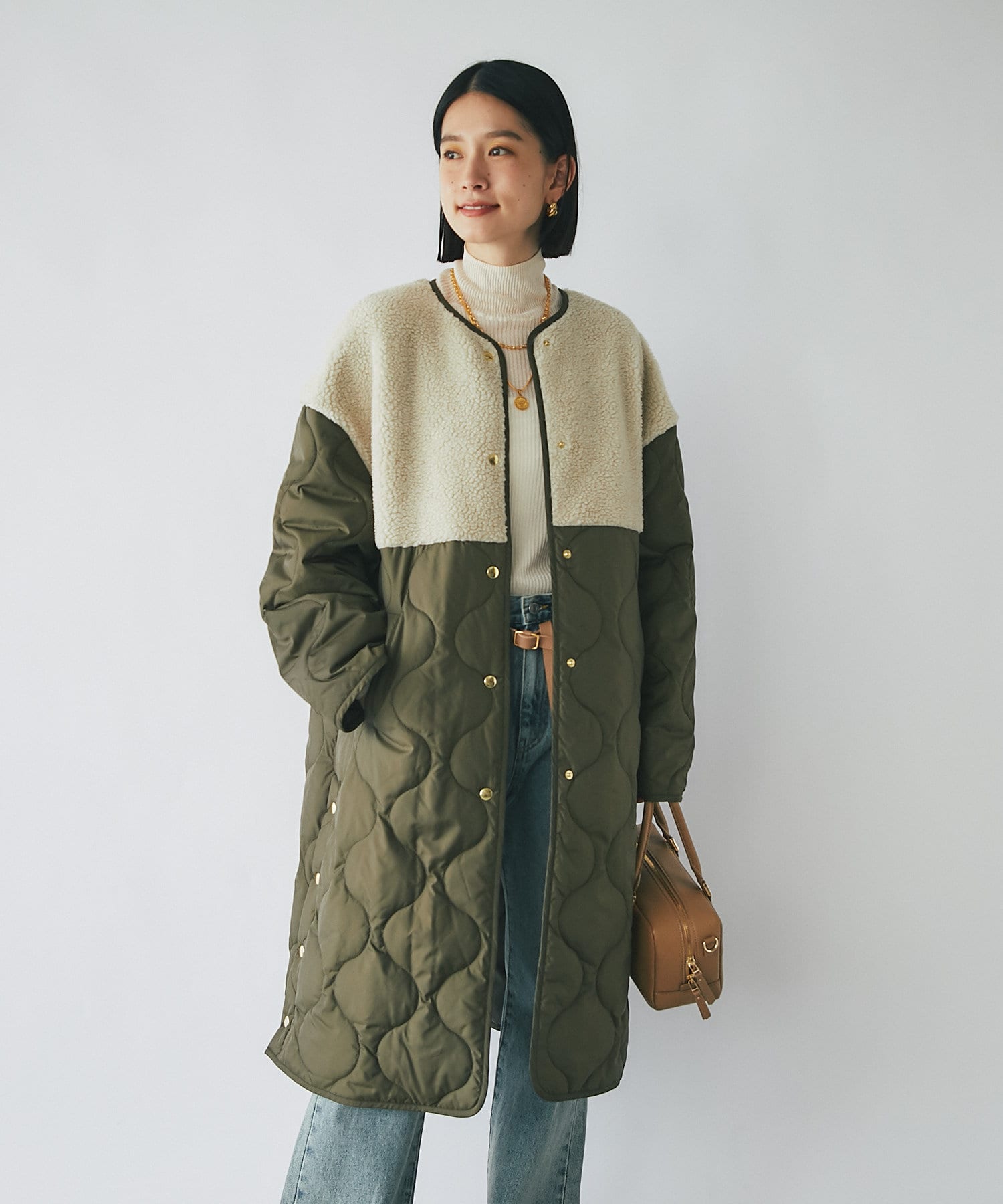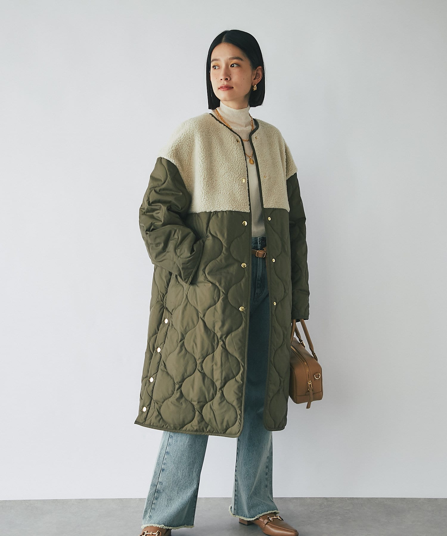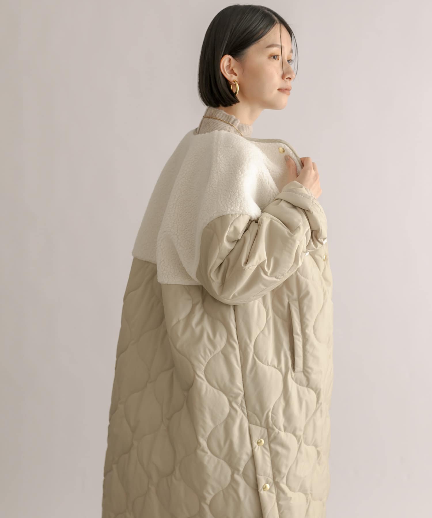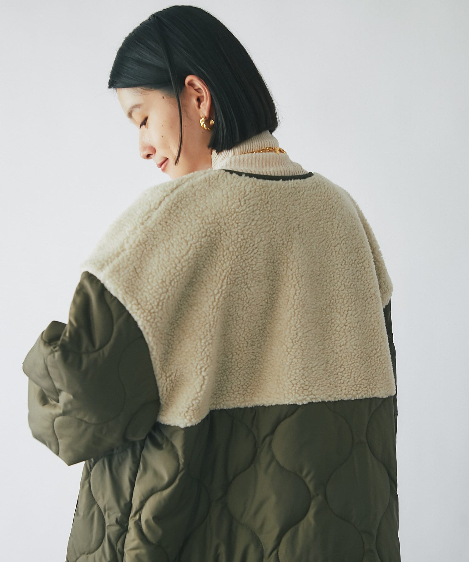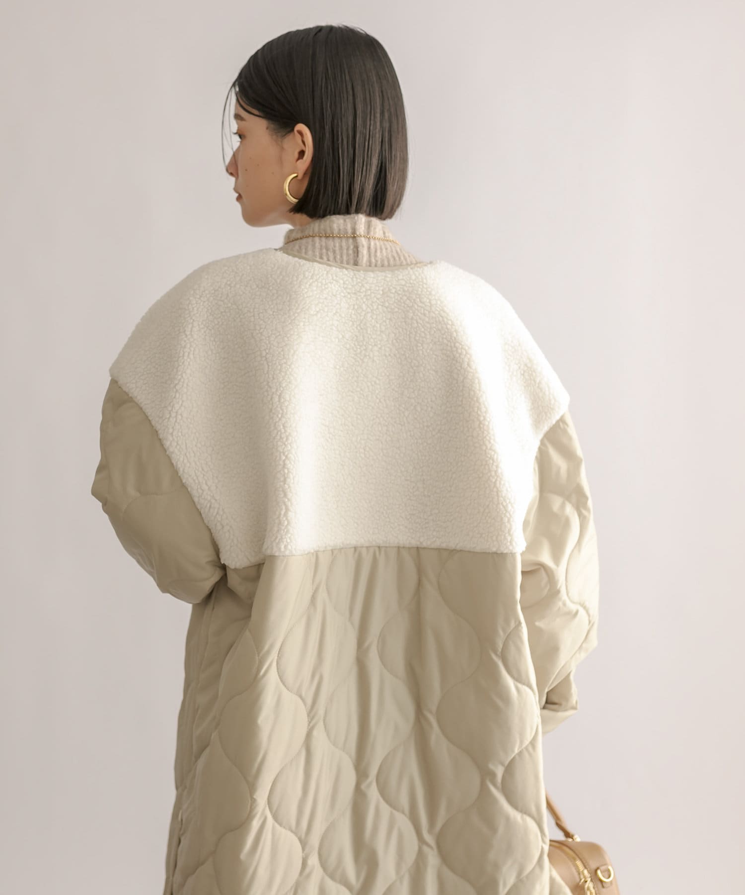 もこもことした温かみのあるボアと立体的な表情が魅力的なキルティングの組み合わせがかわいいコート。