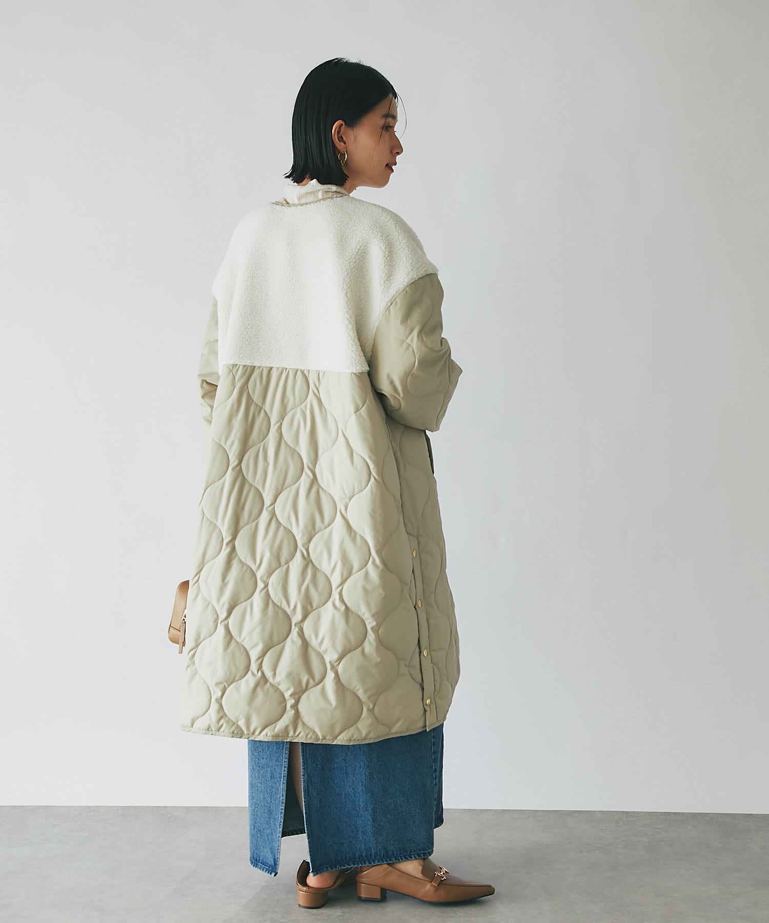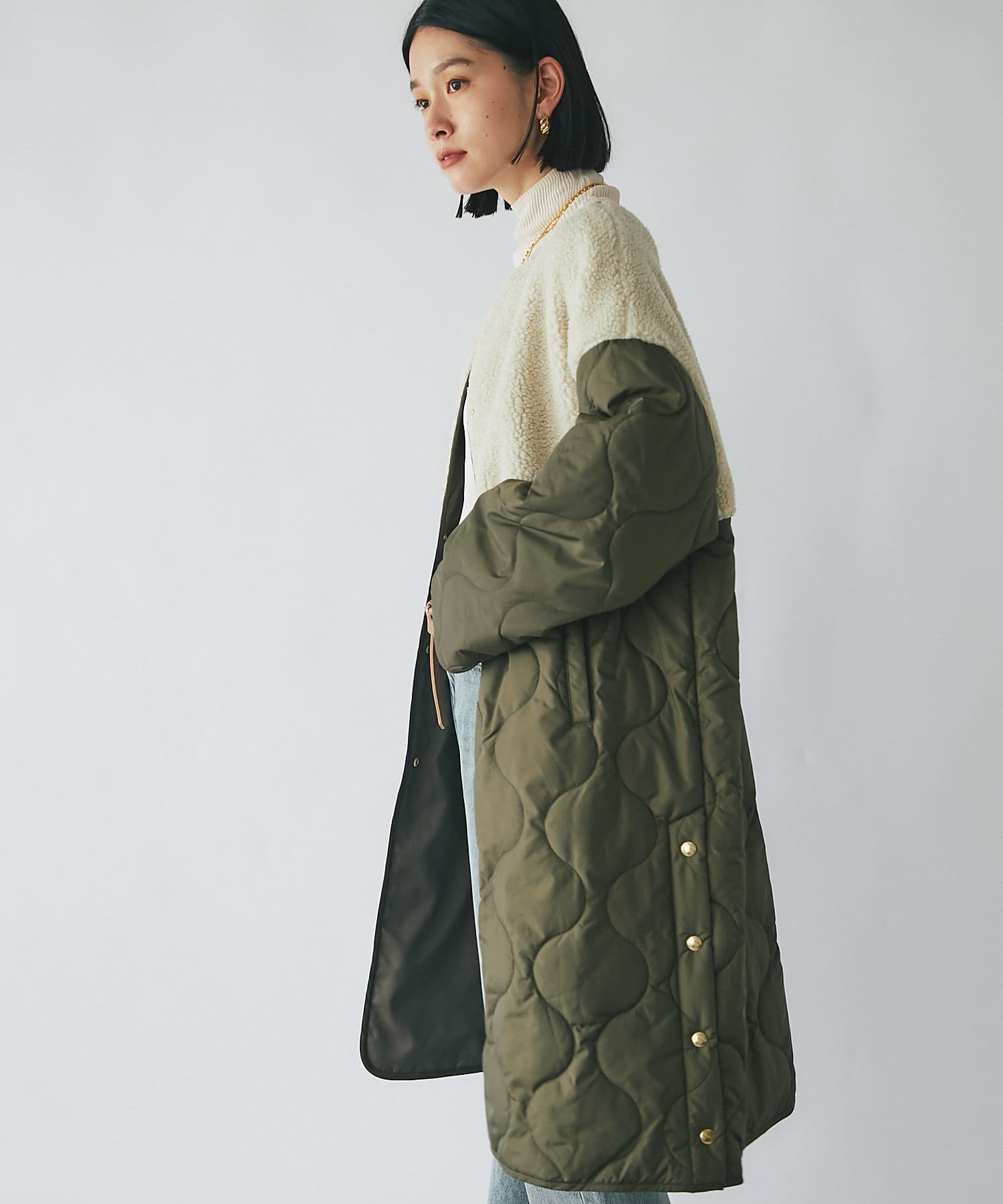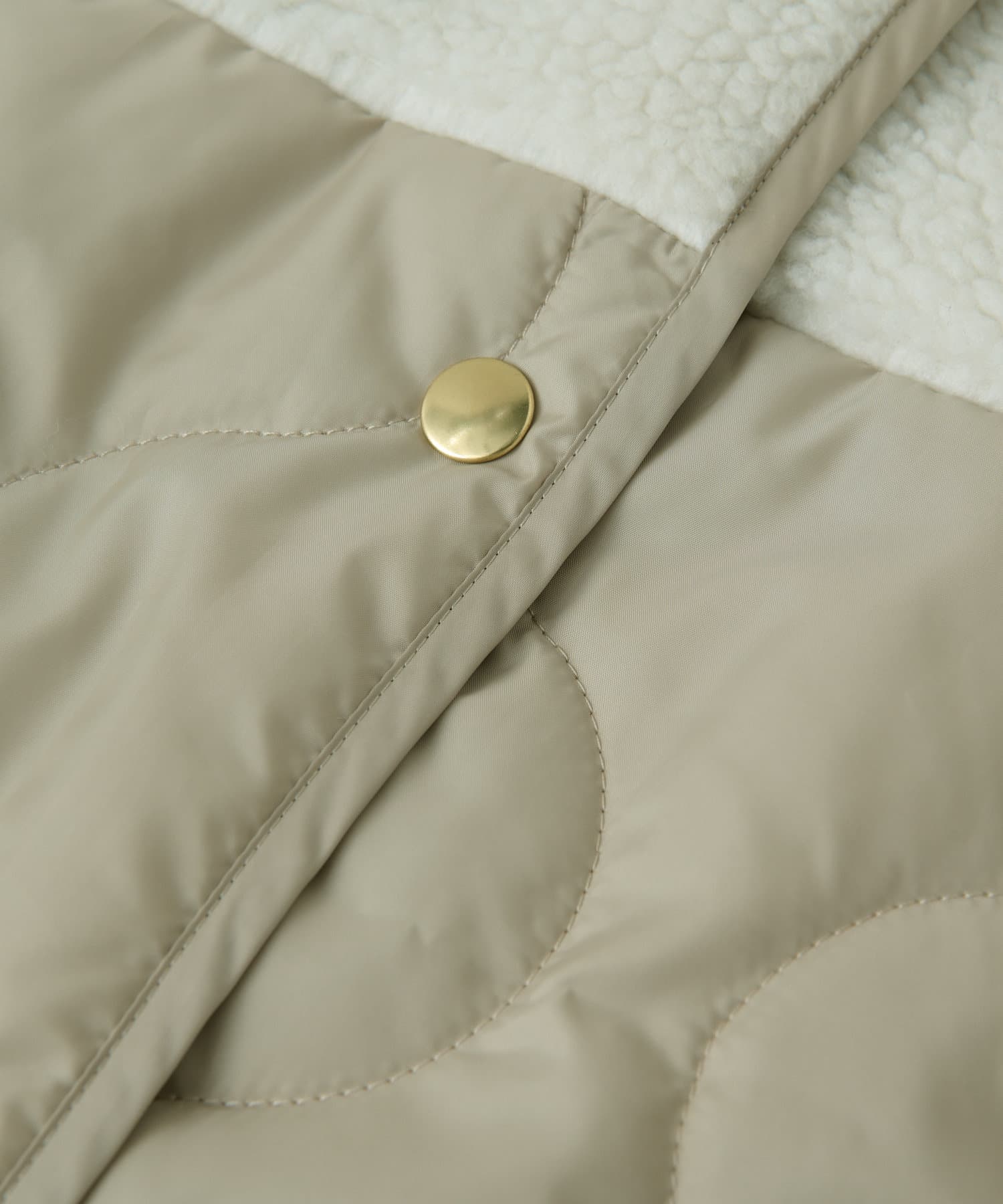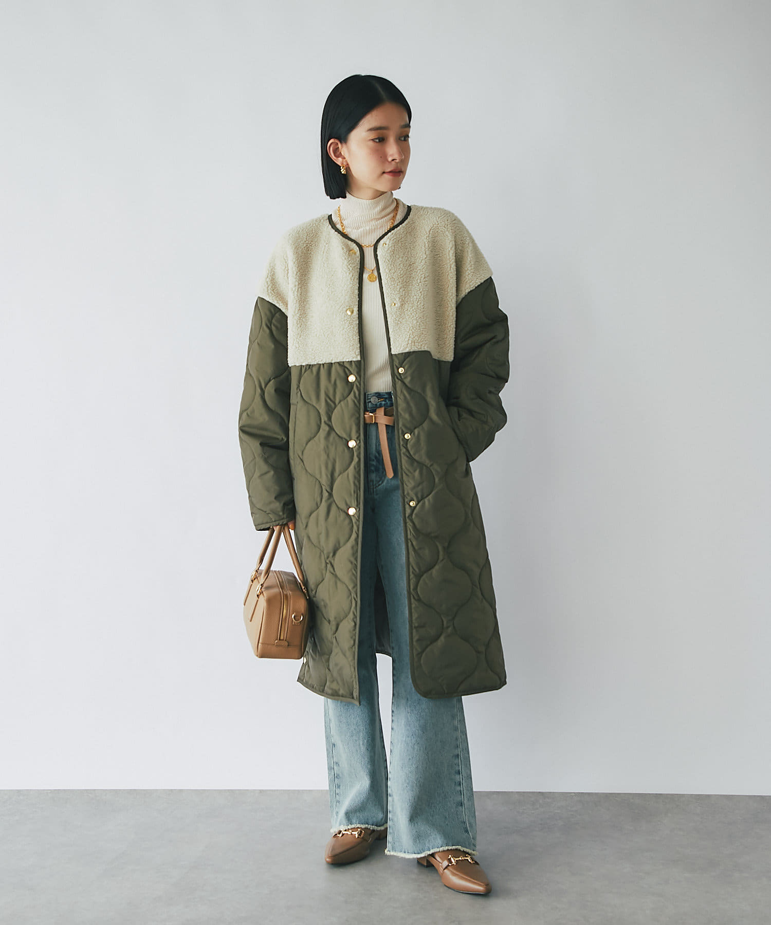 もこもことした温かみのあるボアと立体的な表情が魅力的なキルティングの組み合わせがかわいいコート。