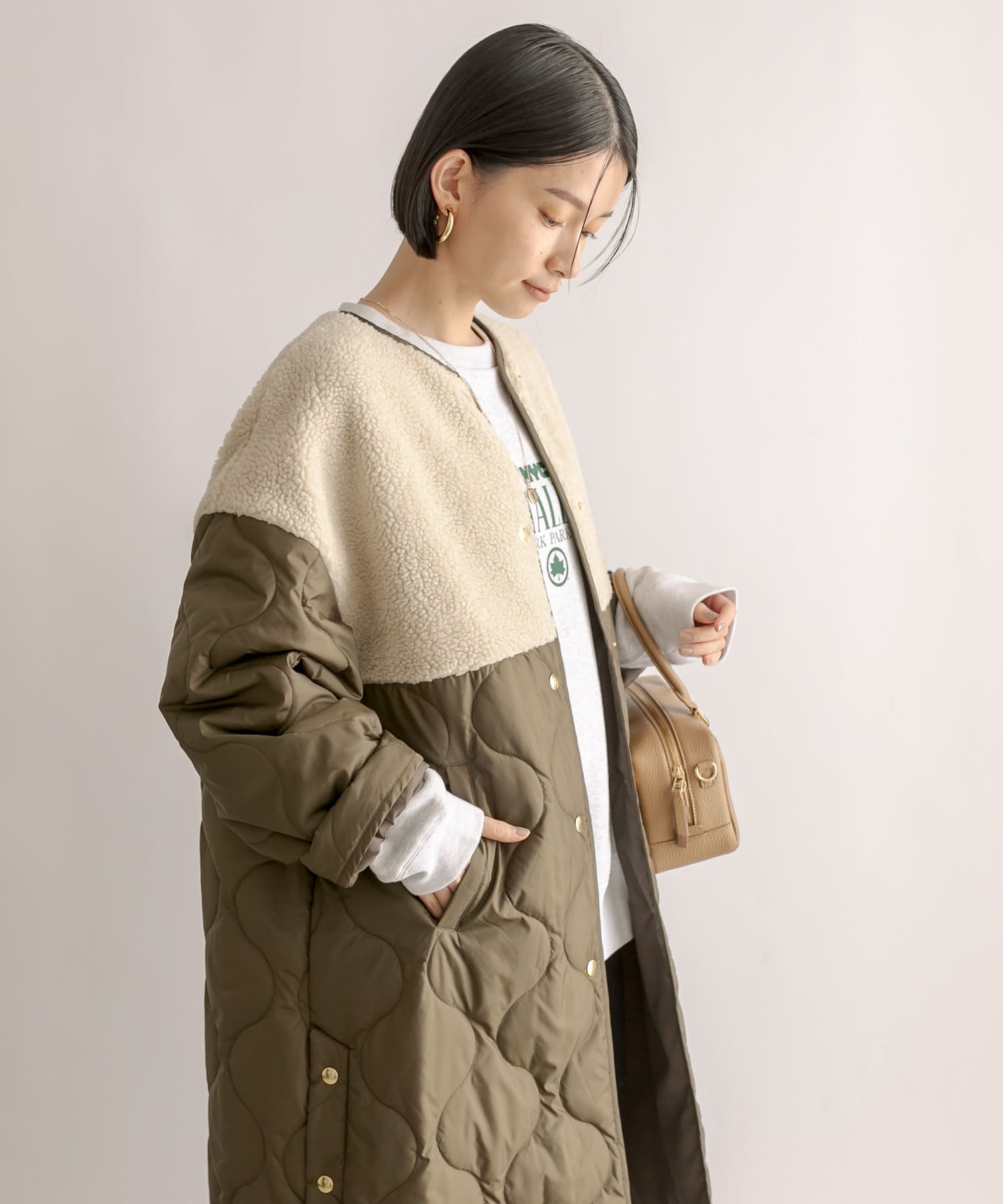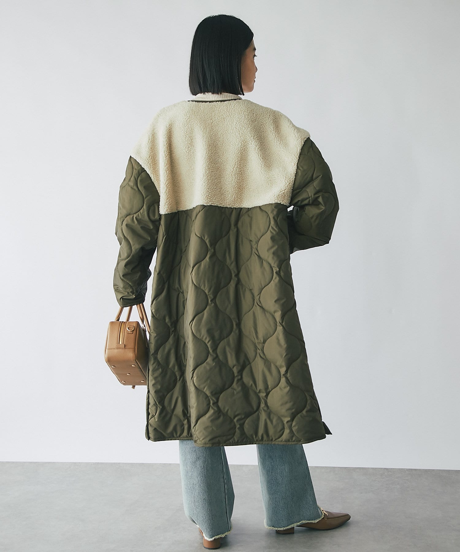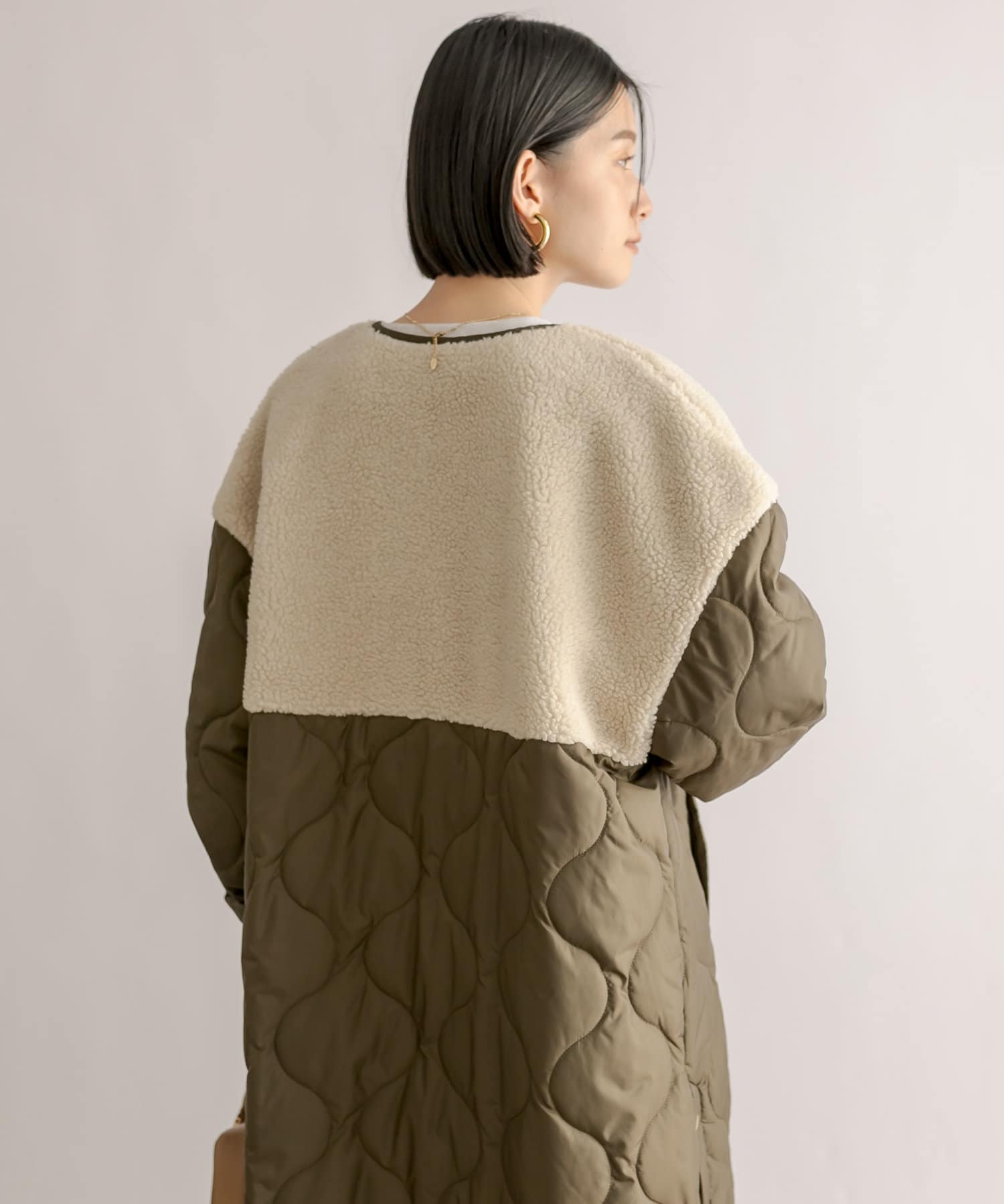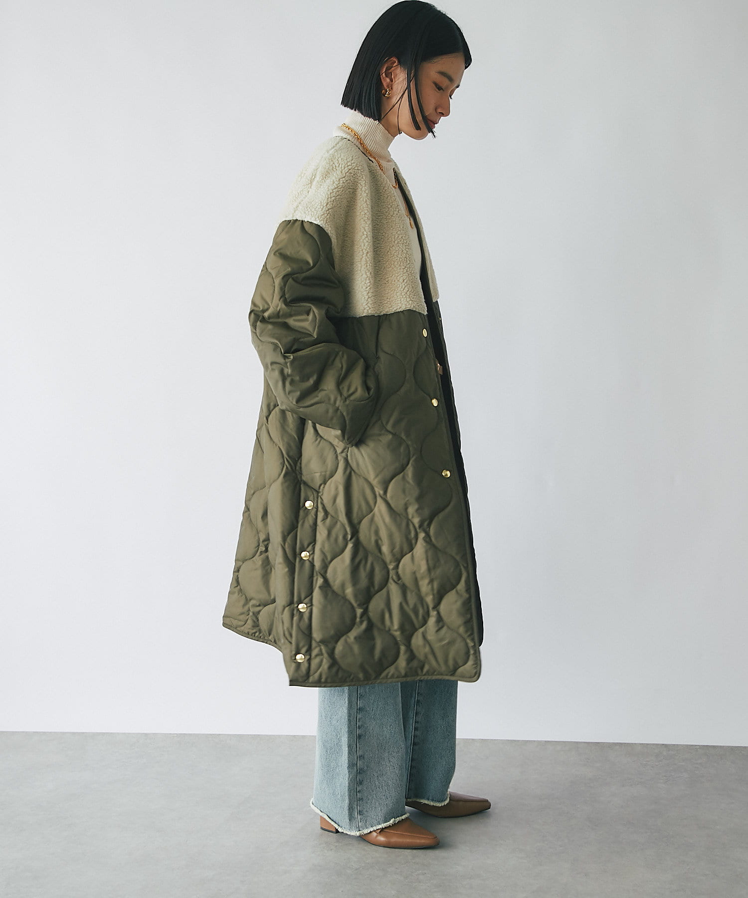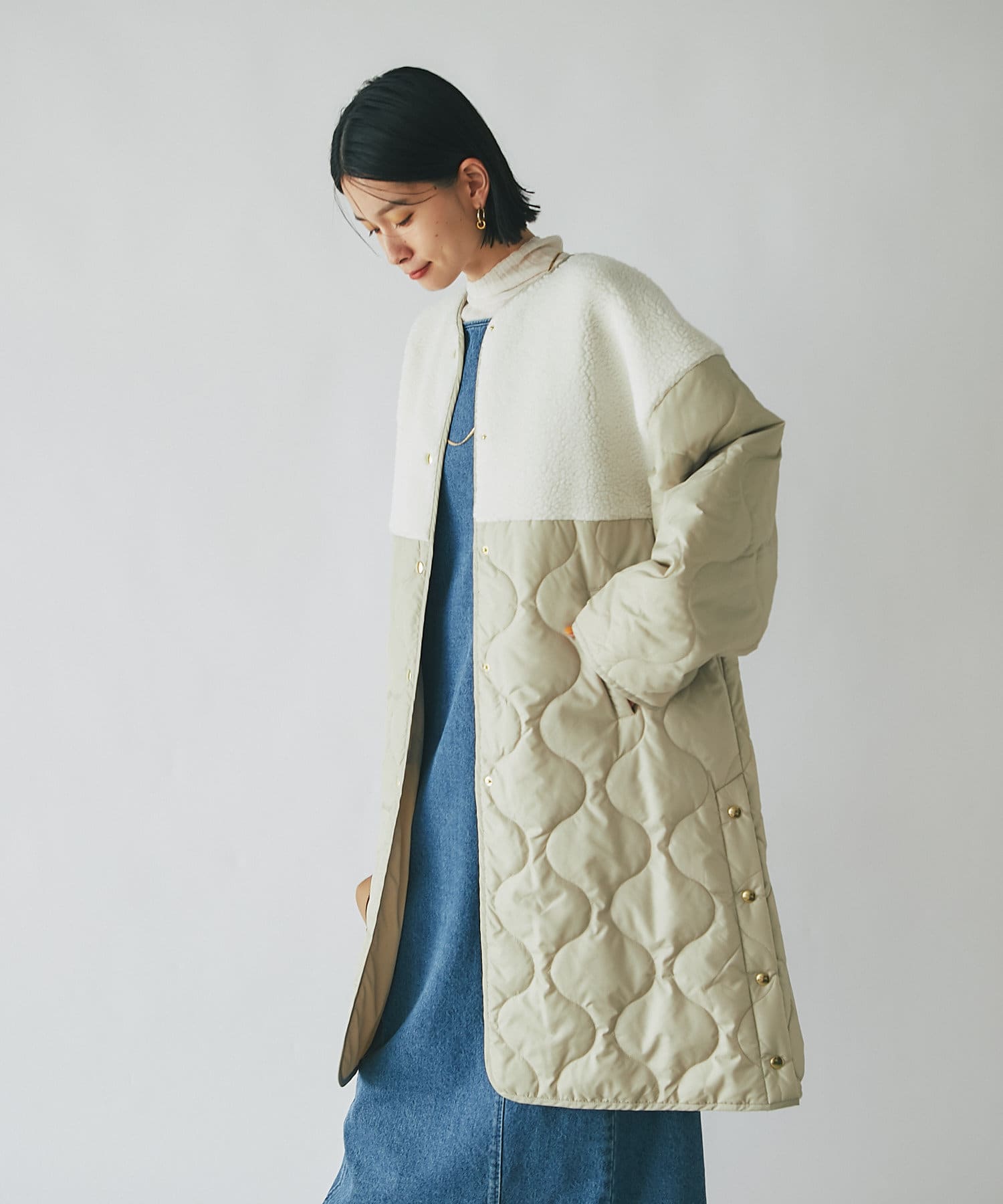 もこもことした温かみのあるボアと立体的な表情が魅力的なキルティングの組み合わせがかわいいコート。