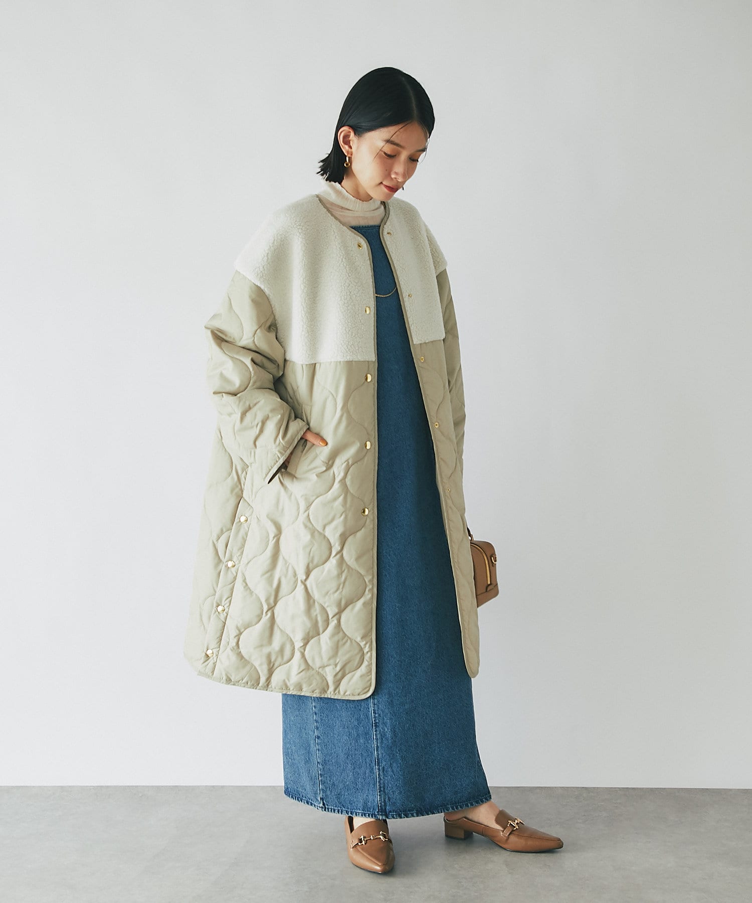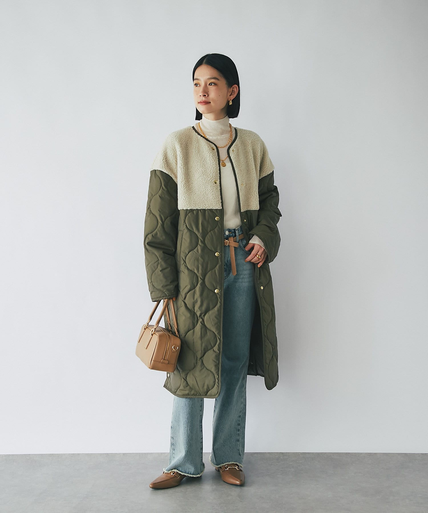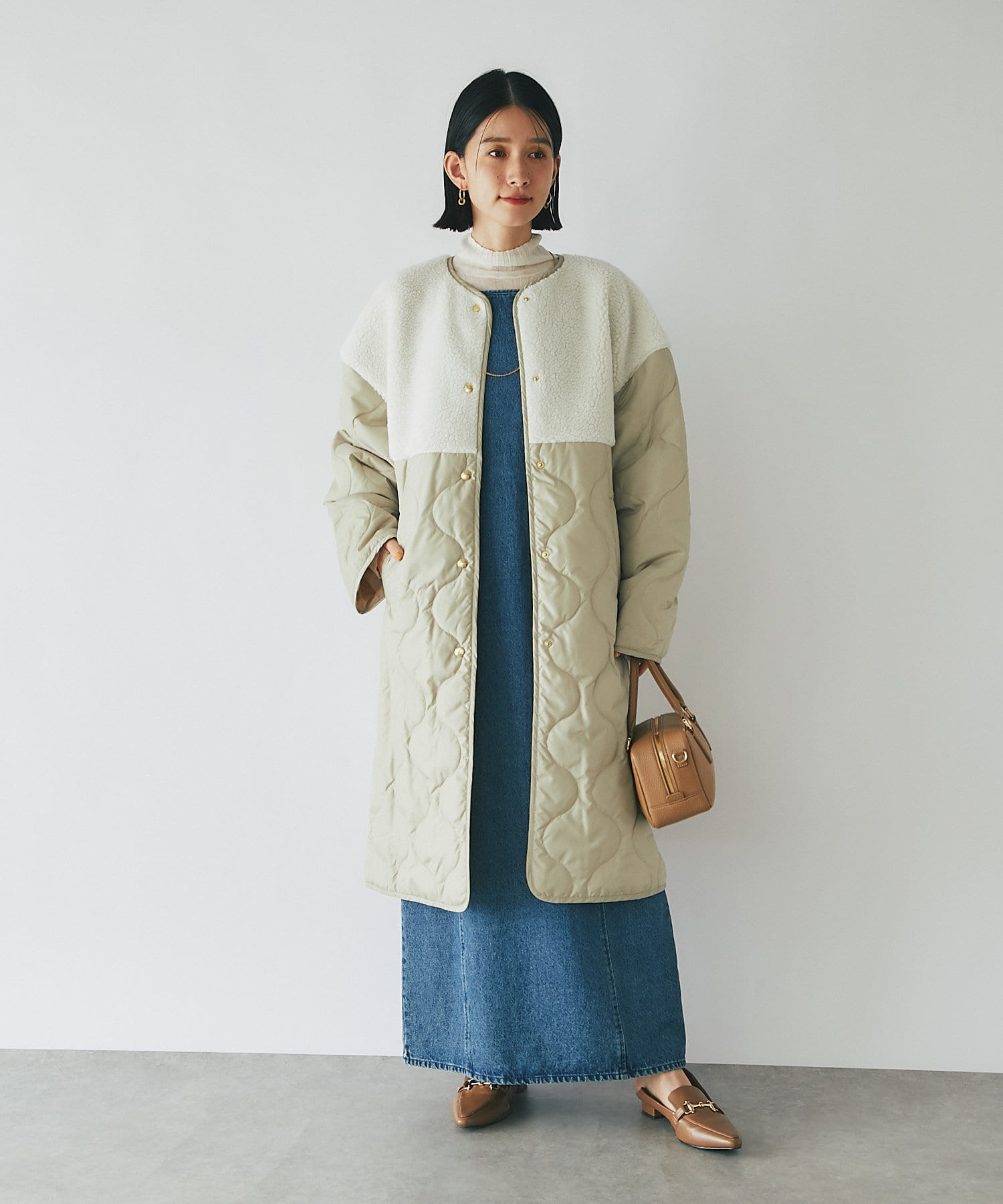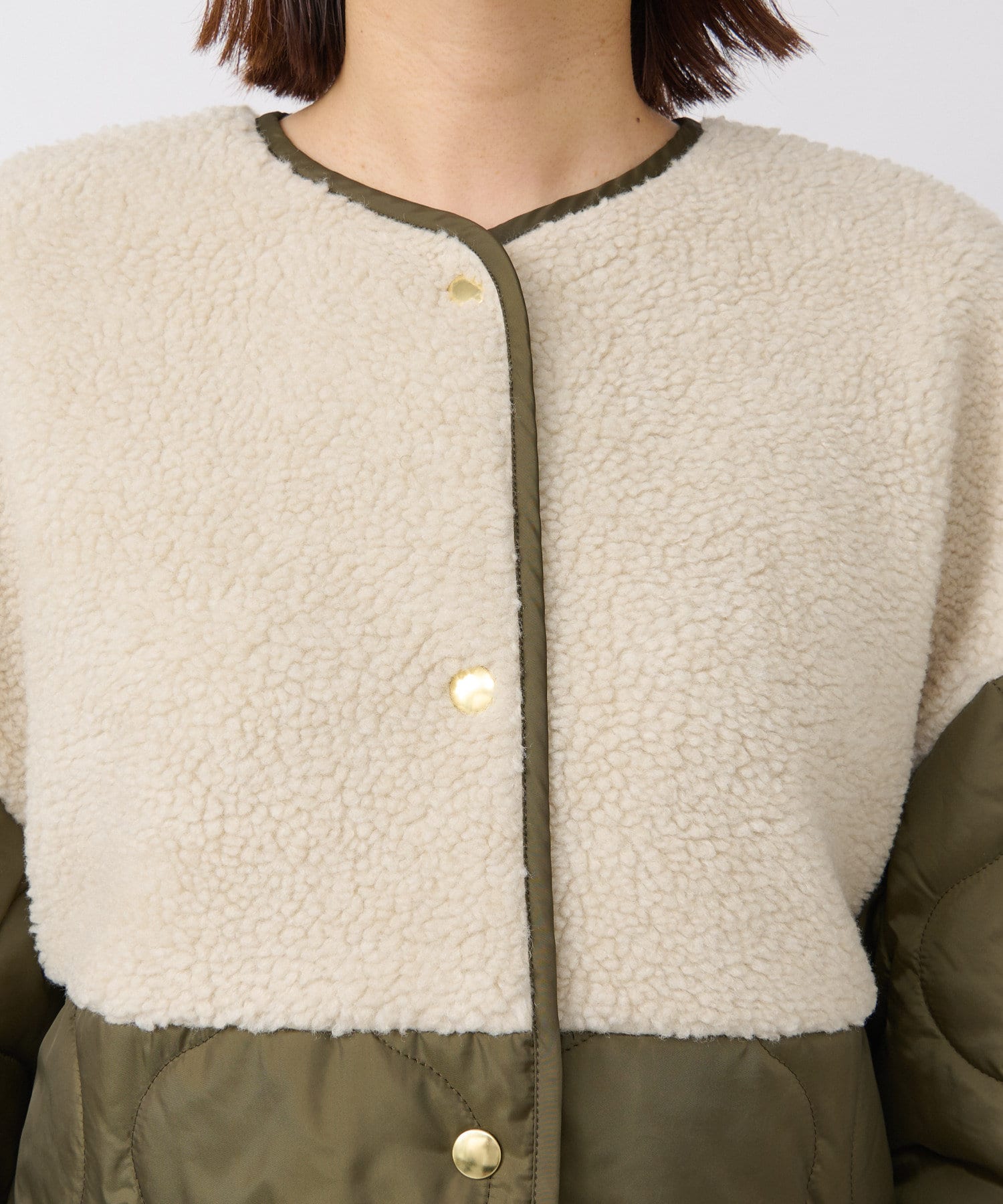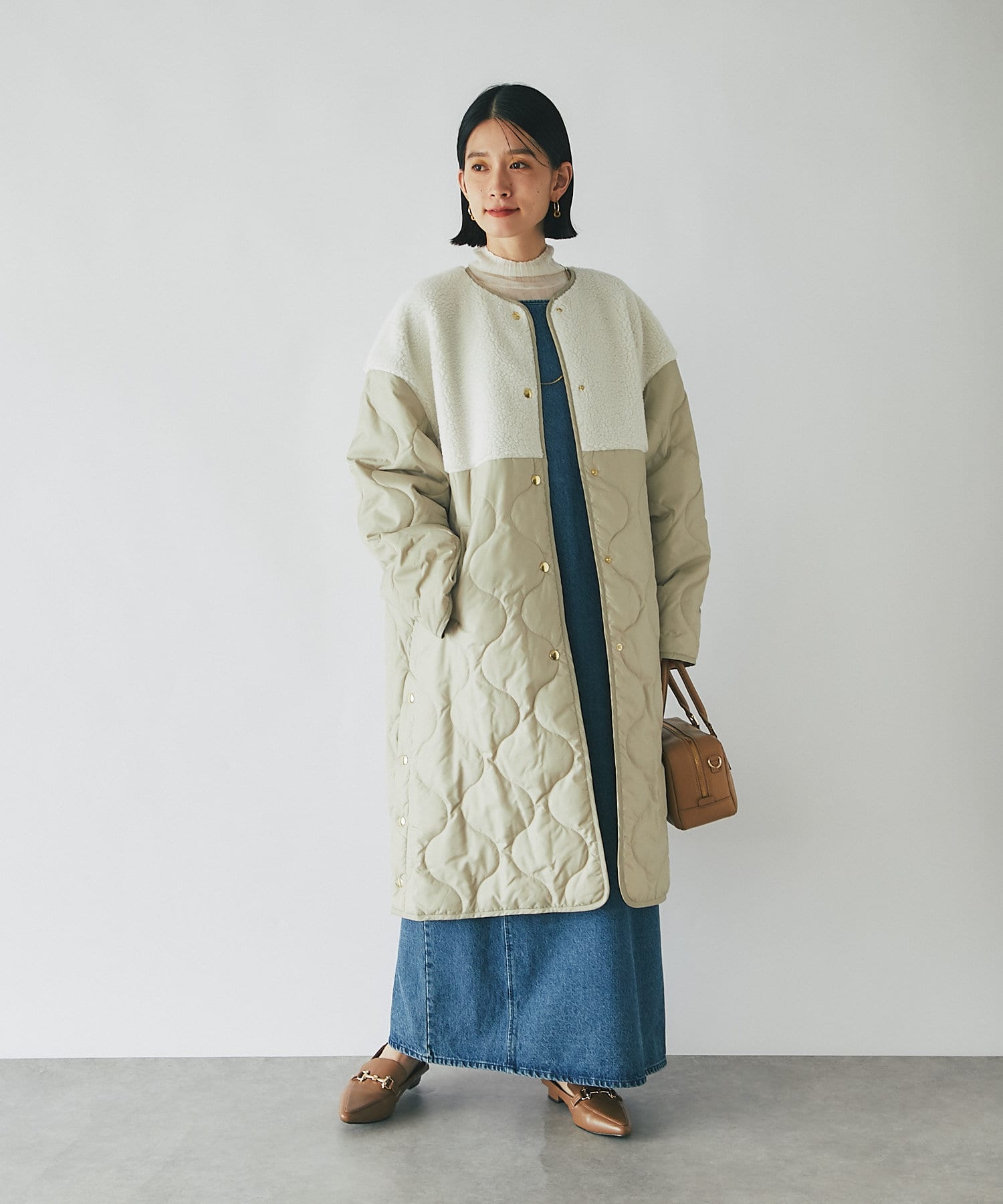 もこもことした温かみのあるボアと立体的な表情が魅力的なキルティングの組み合わせがかわいいコート。