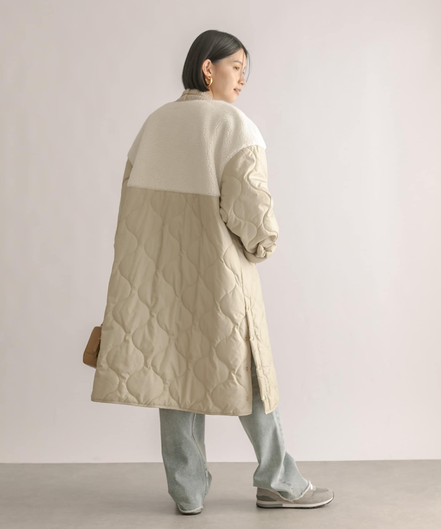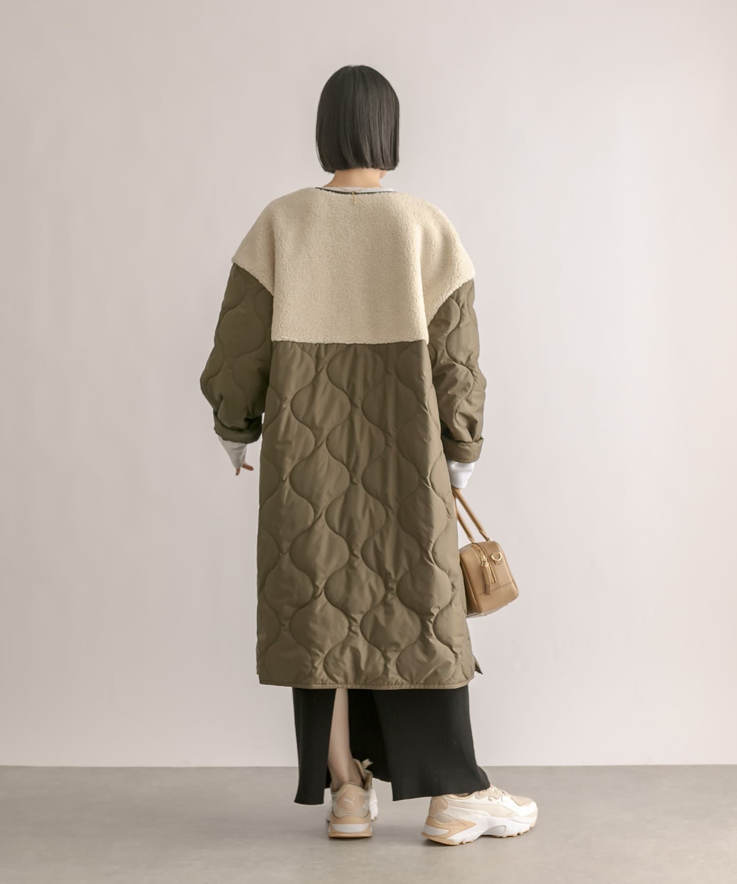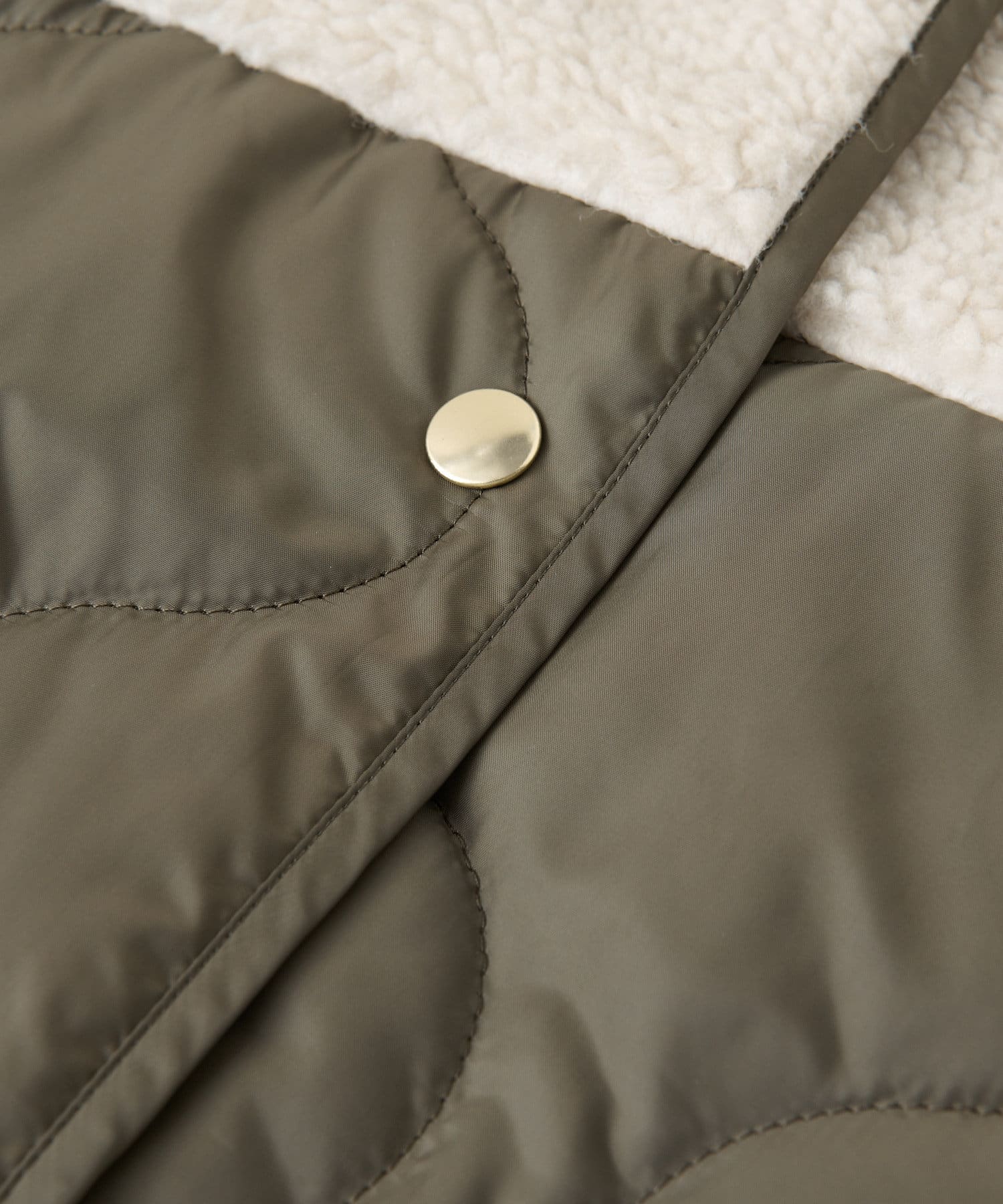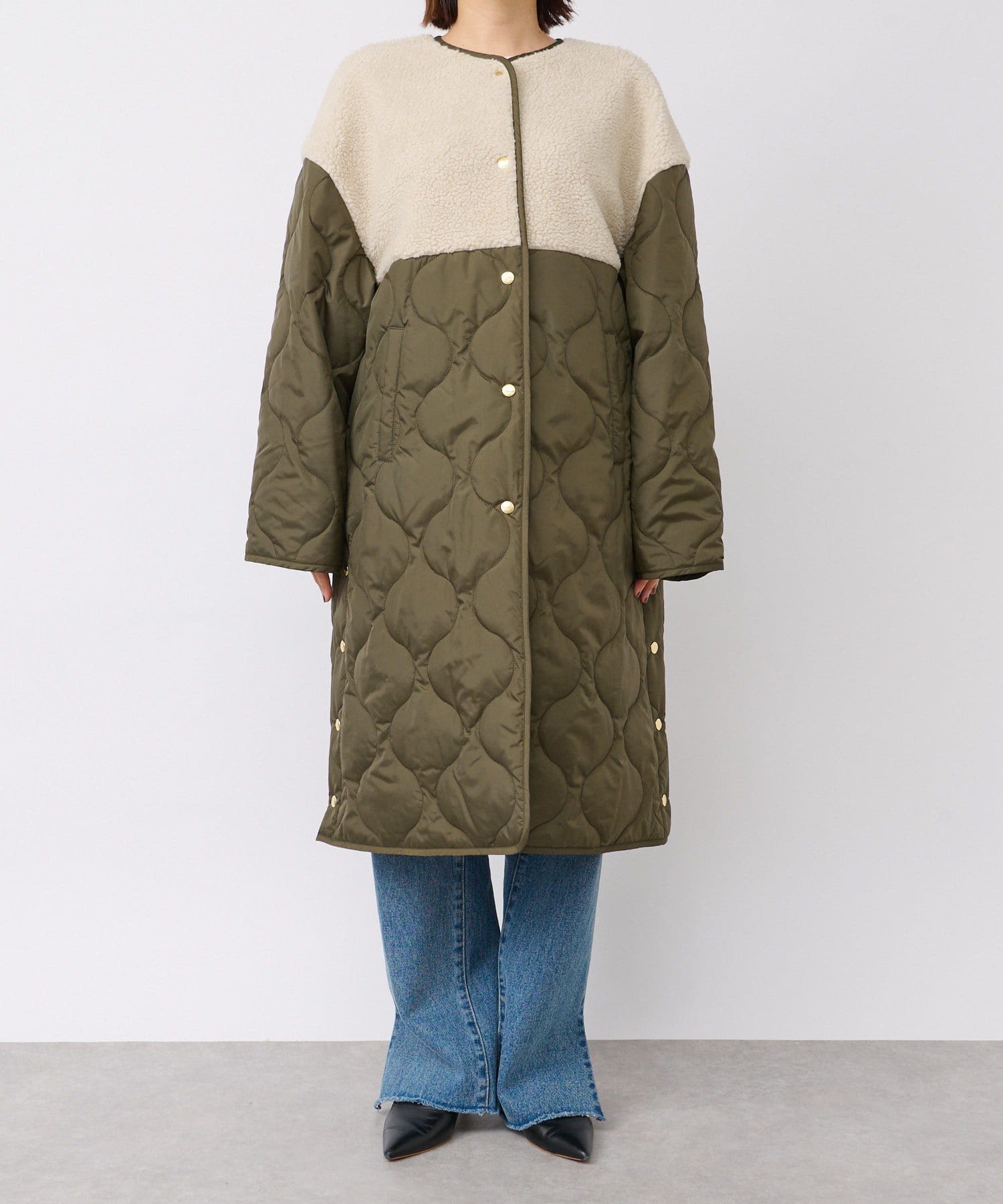 もこもことした温かみのあるボアと立体的な表情が魅力的なキルティングの組み合わせがかわいいコート。