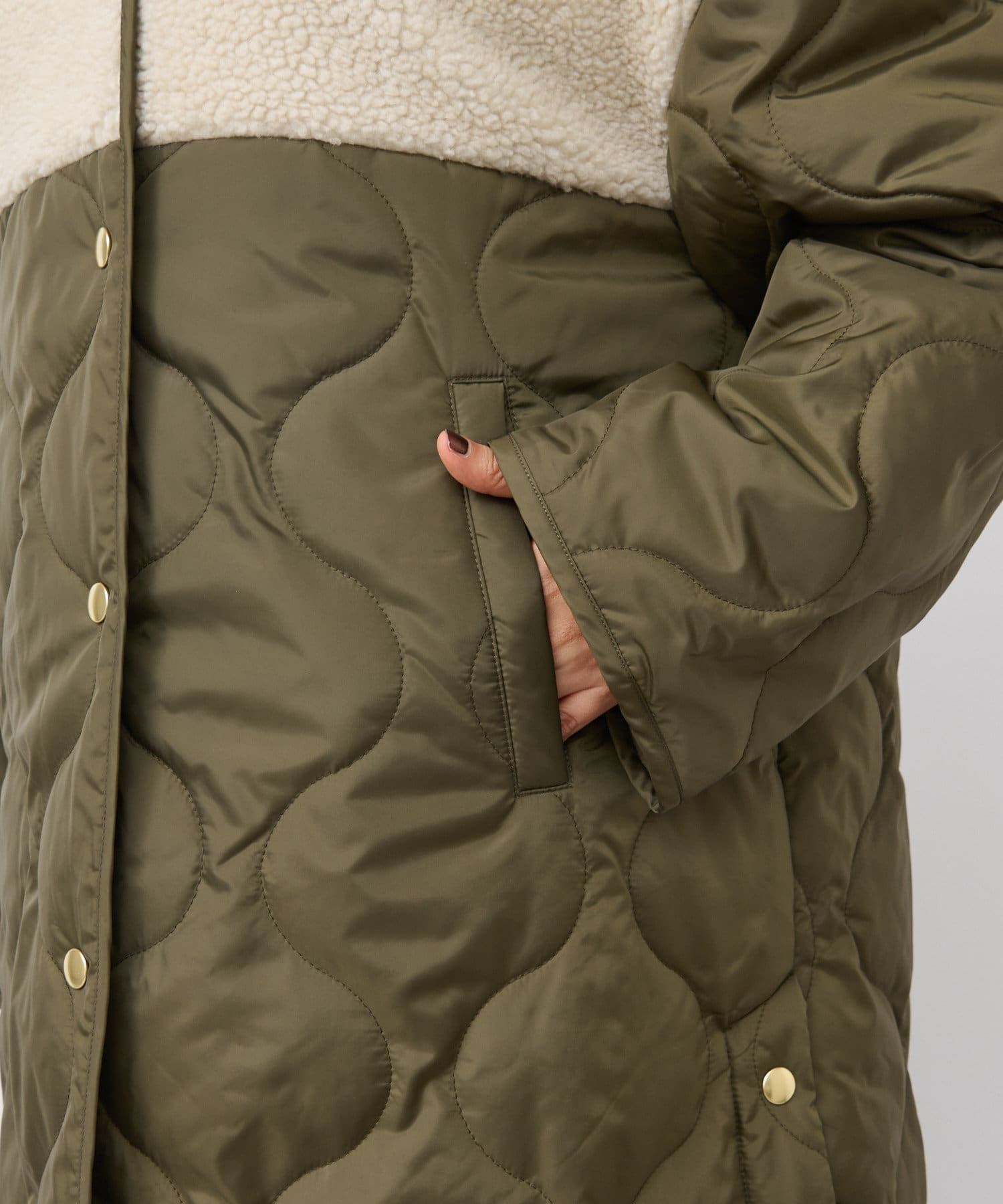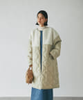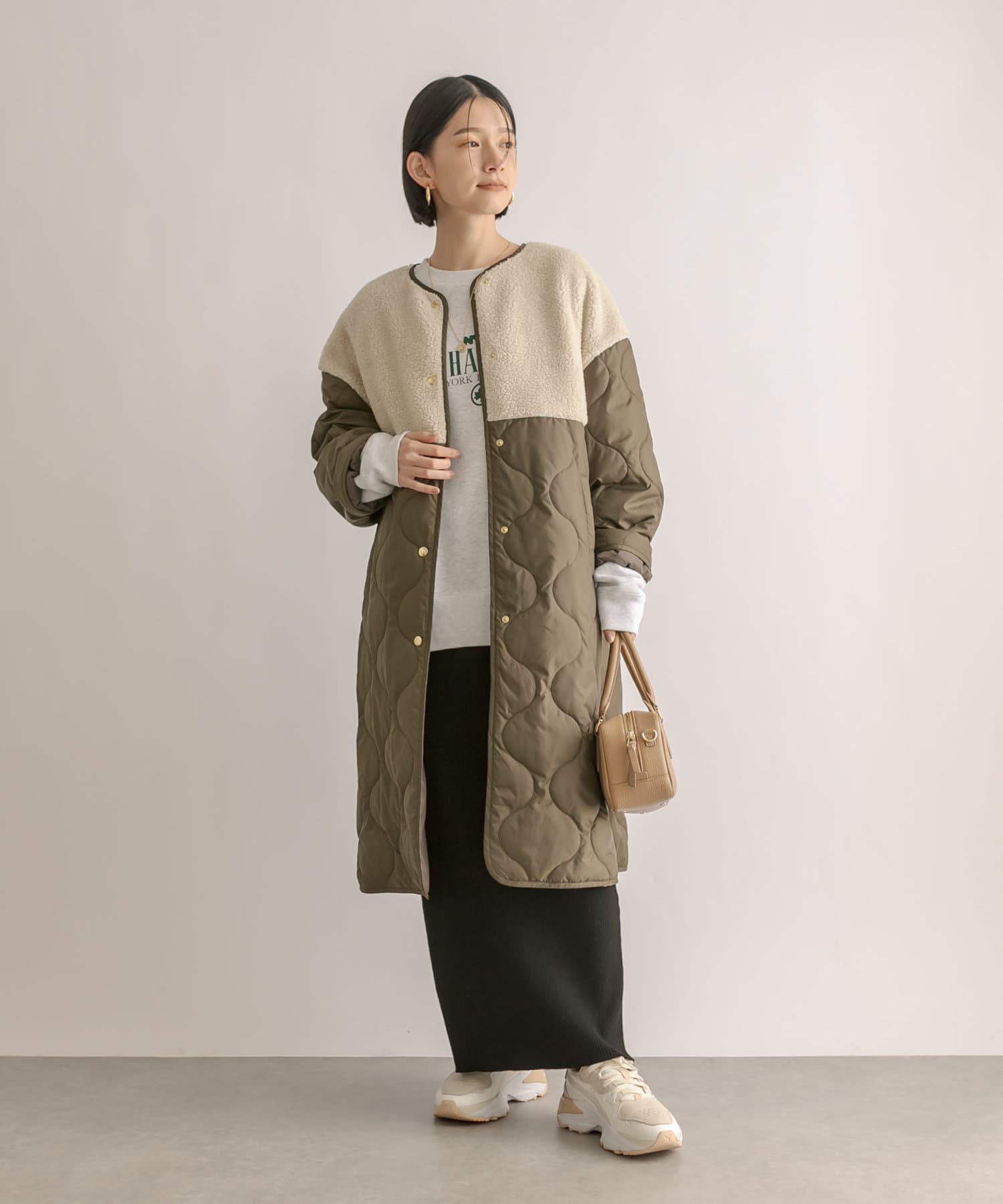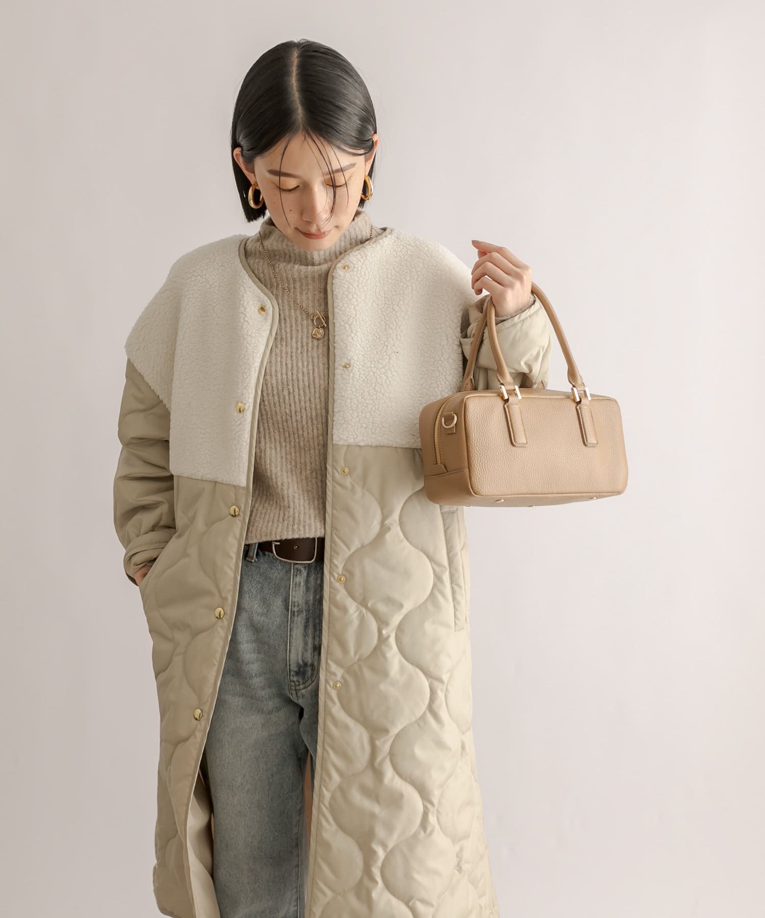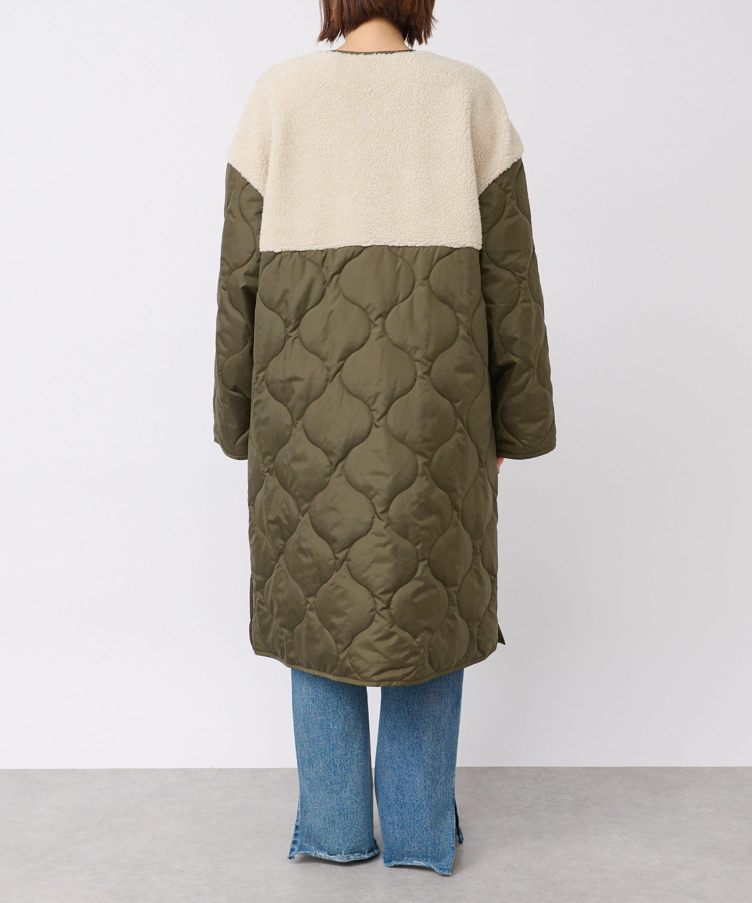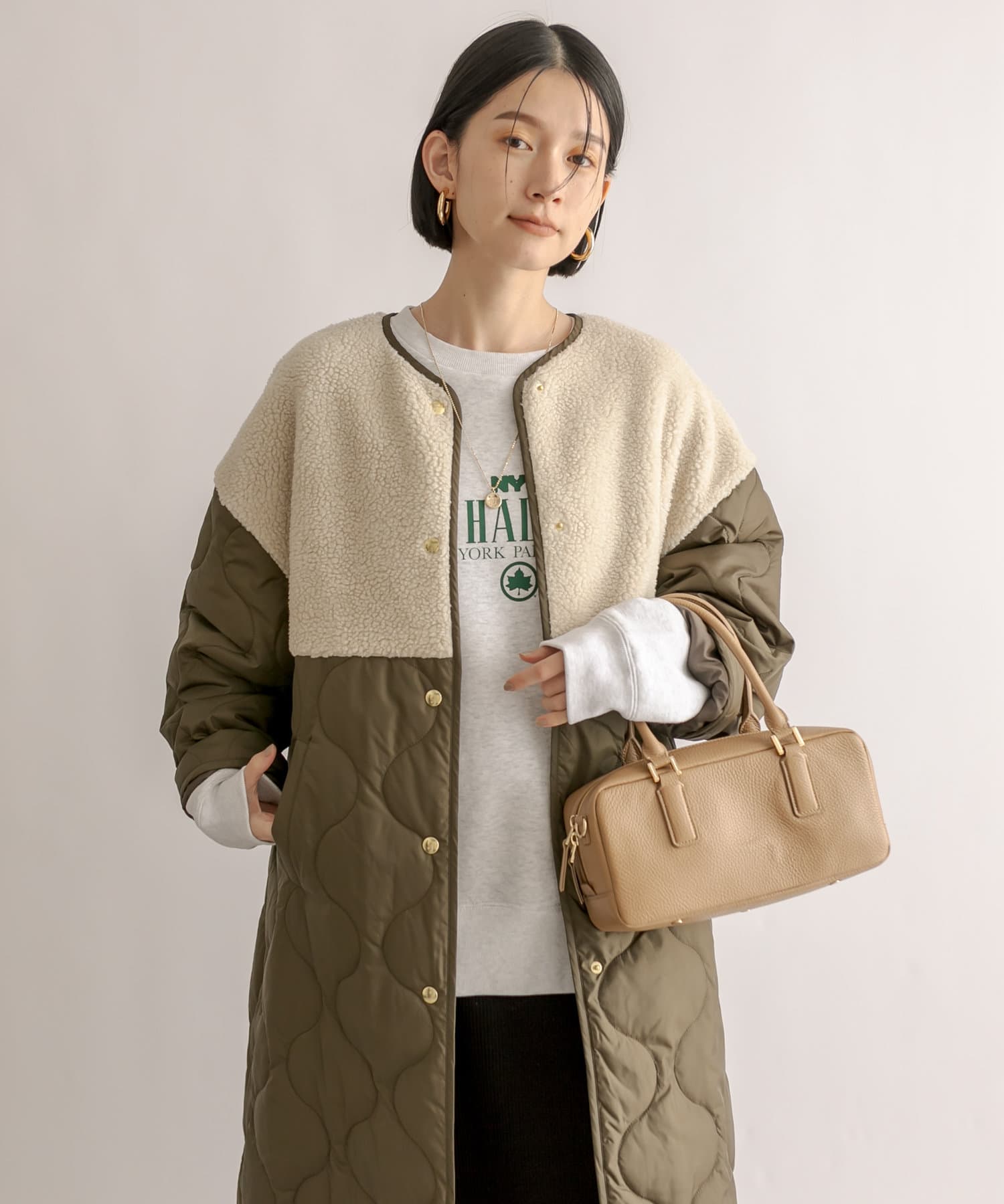 もこもことした温かみのあるボアと立体的な表情が魅力的なキルティングの組み合わせがかわいいコート。