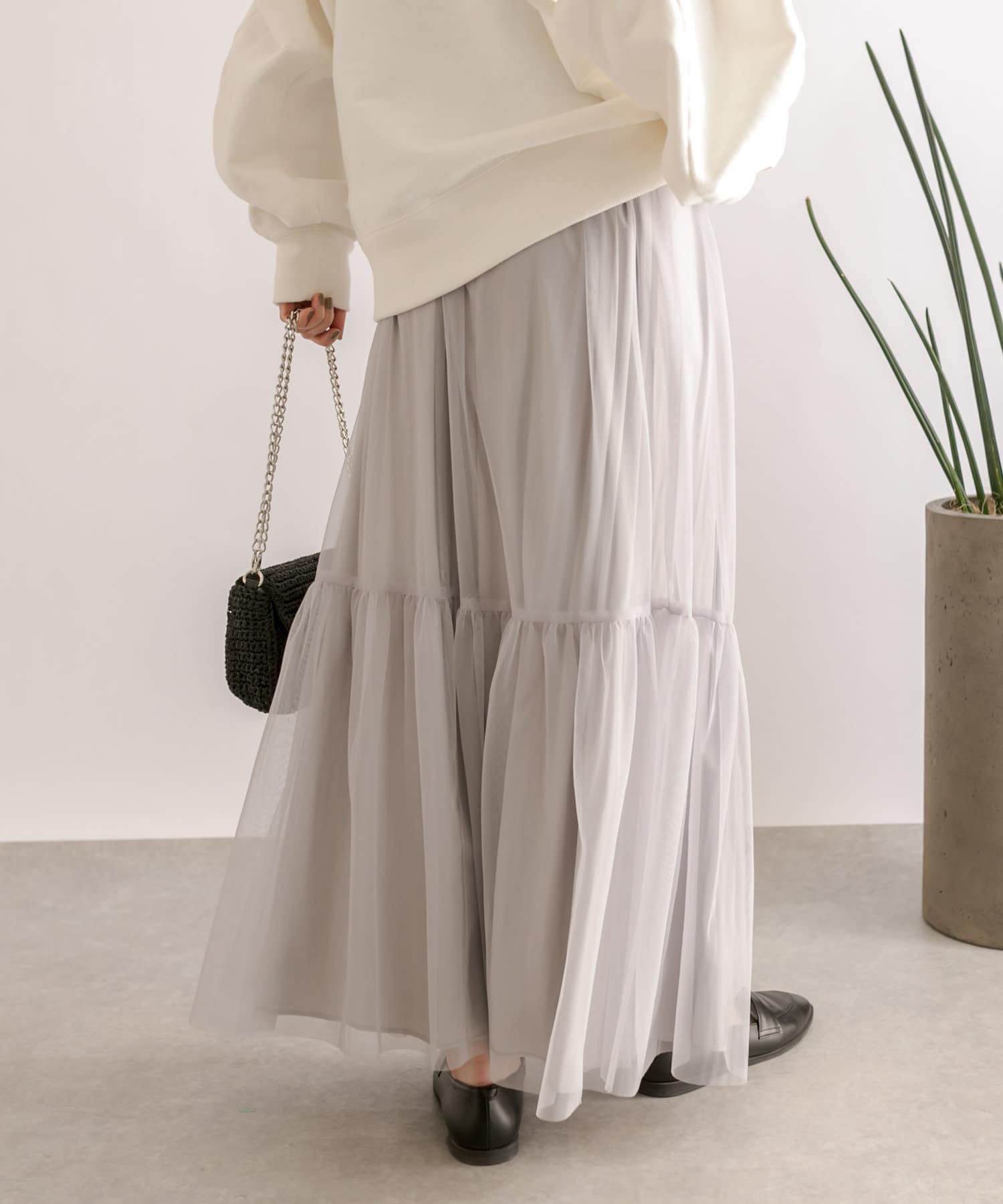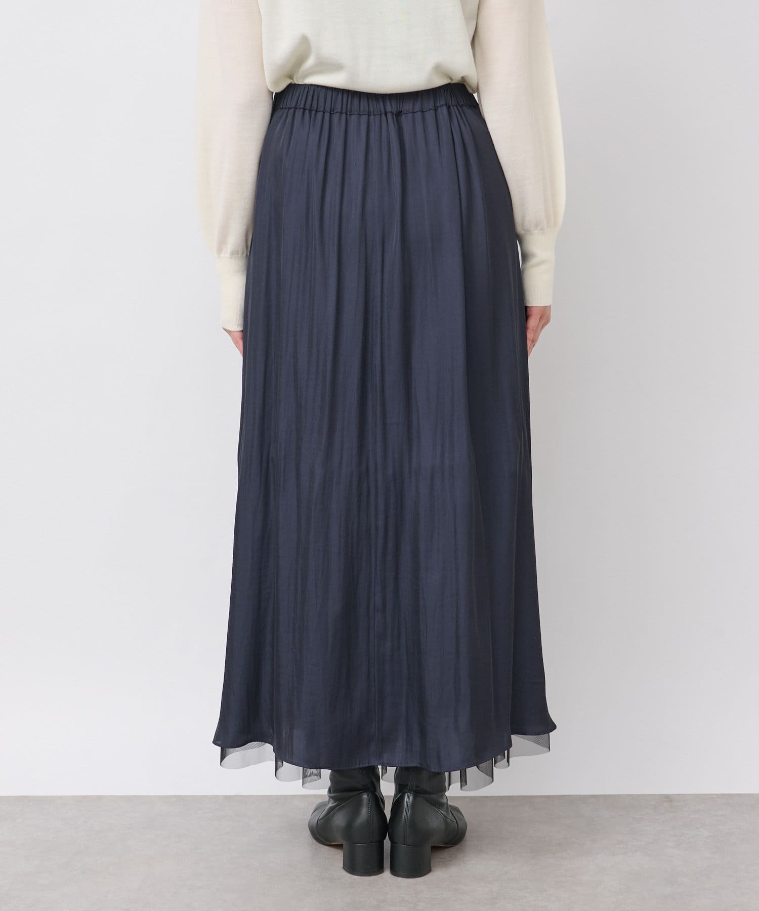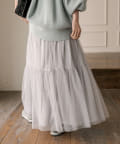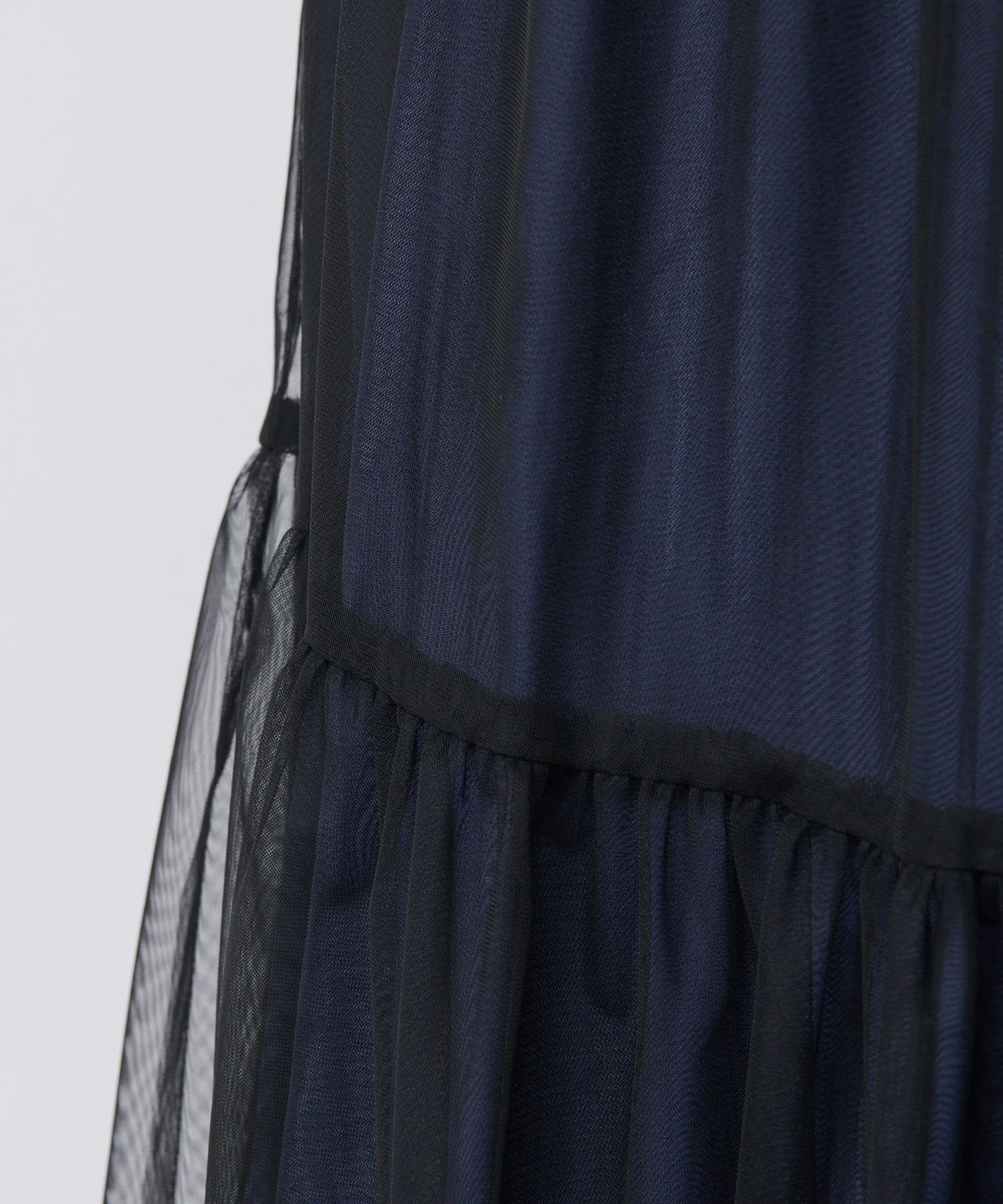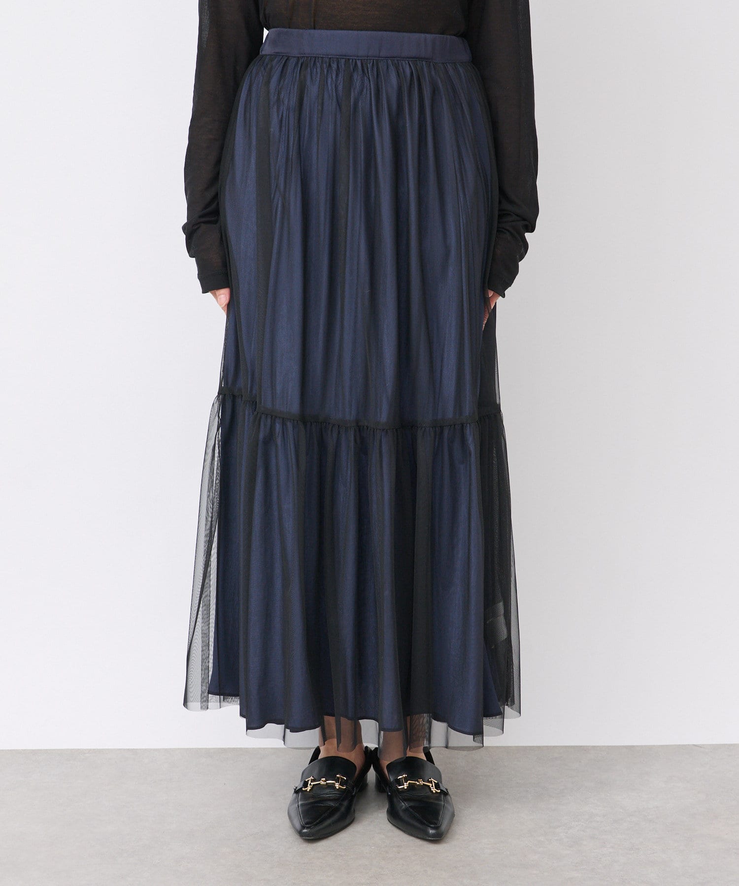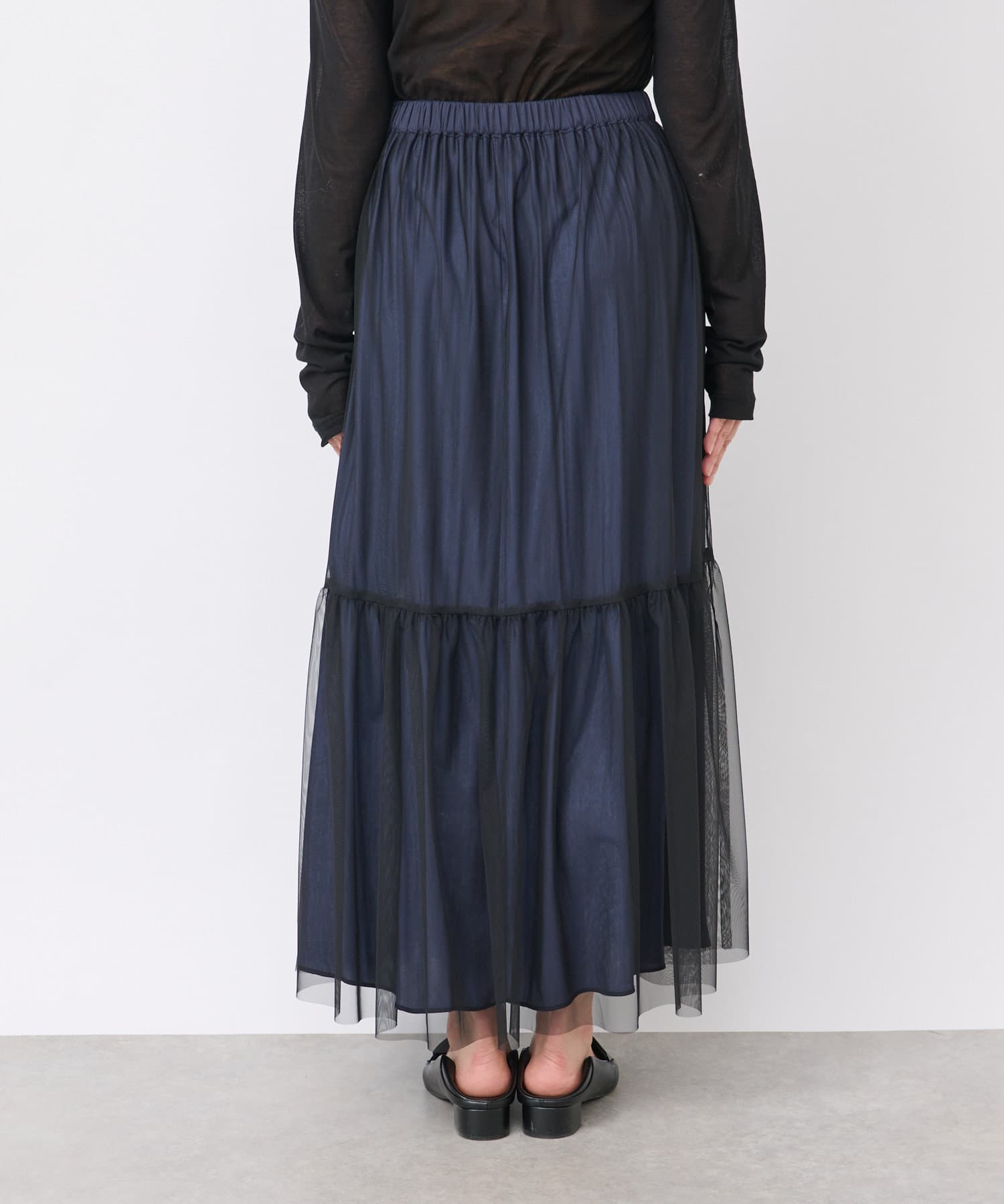 2段に分かれたティアードシルエットのチュール面と、ツヤ感のきれいなサテン面をそれぞれリバーシブルで着れるスカート。