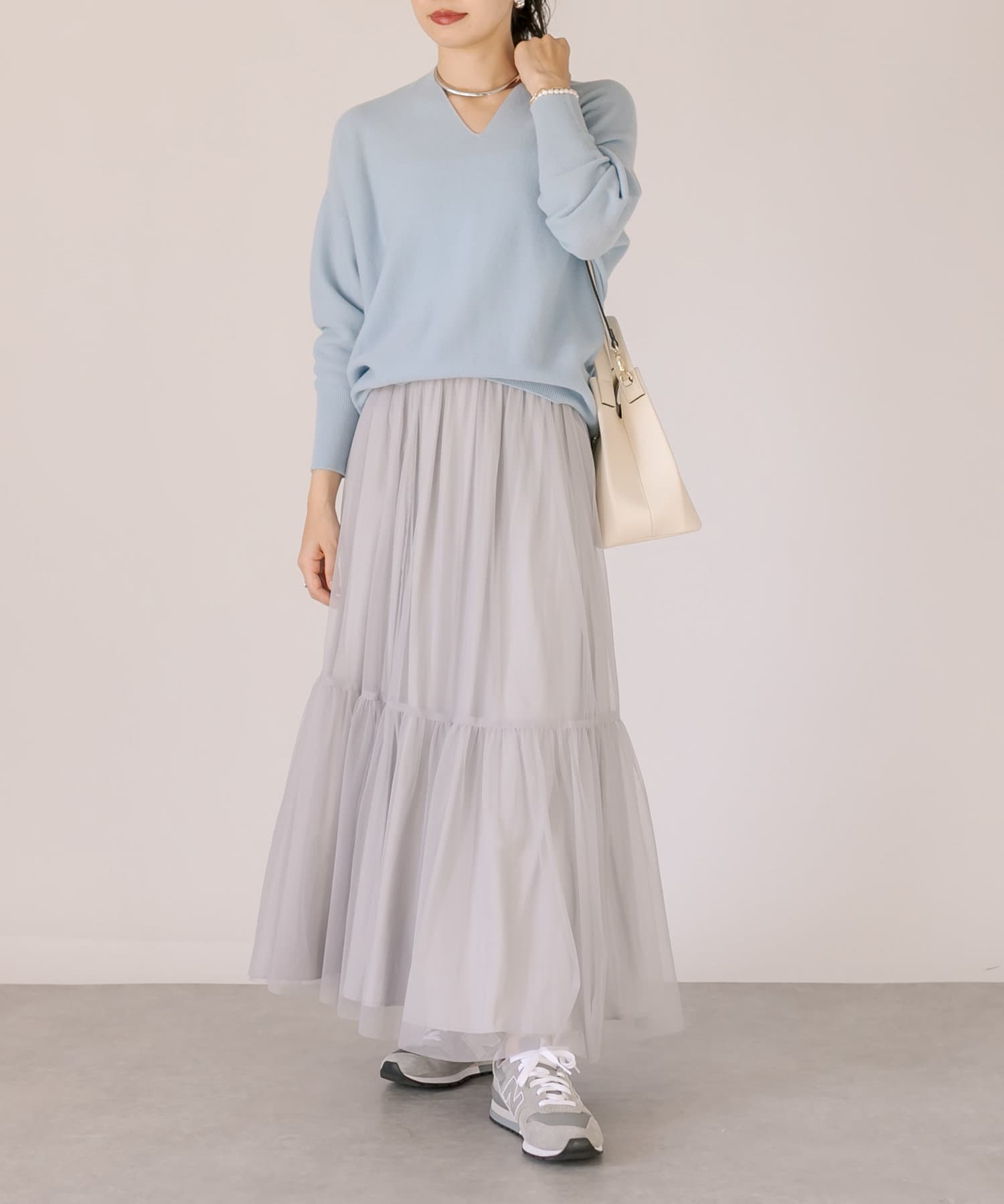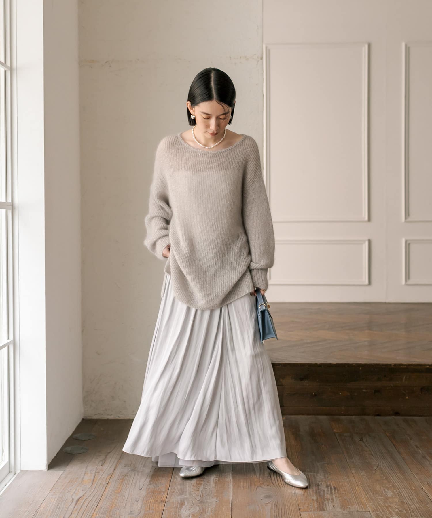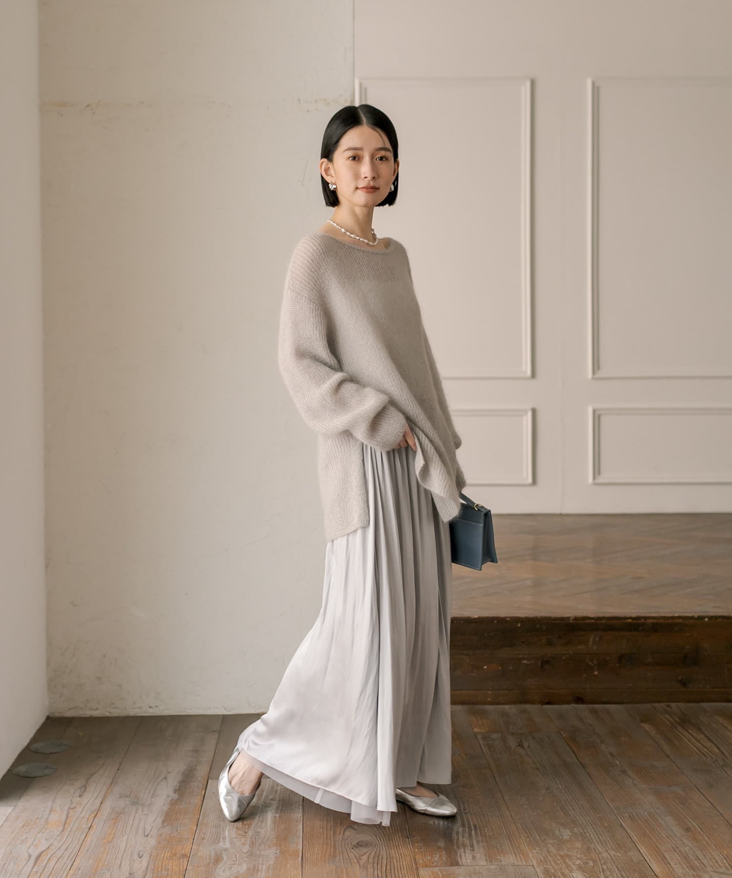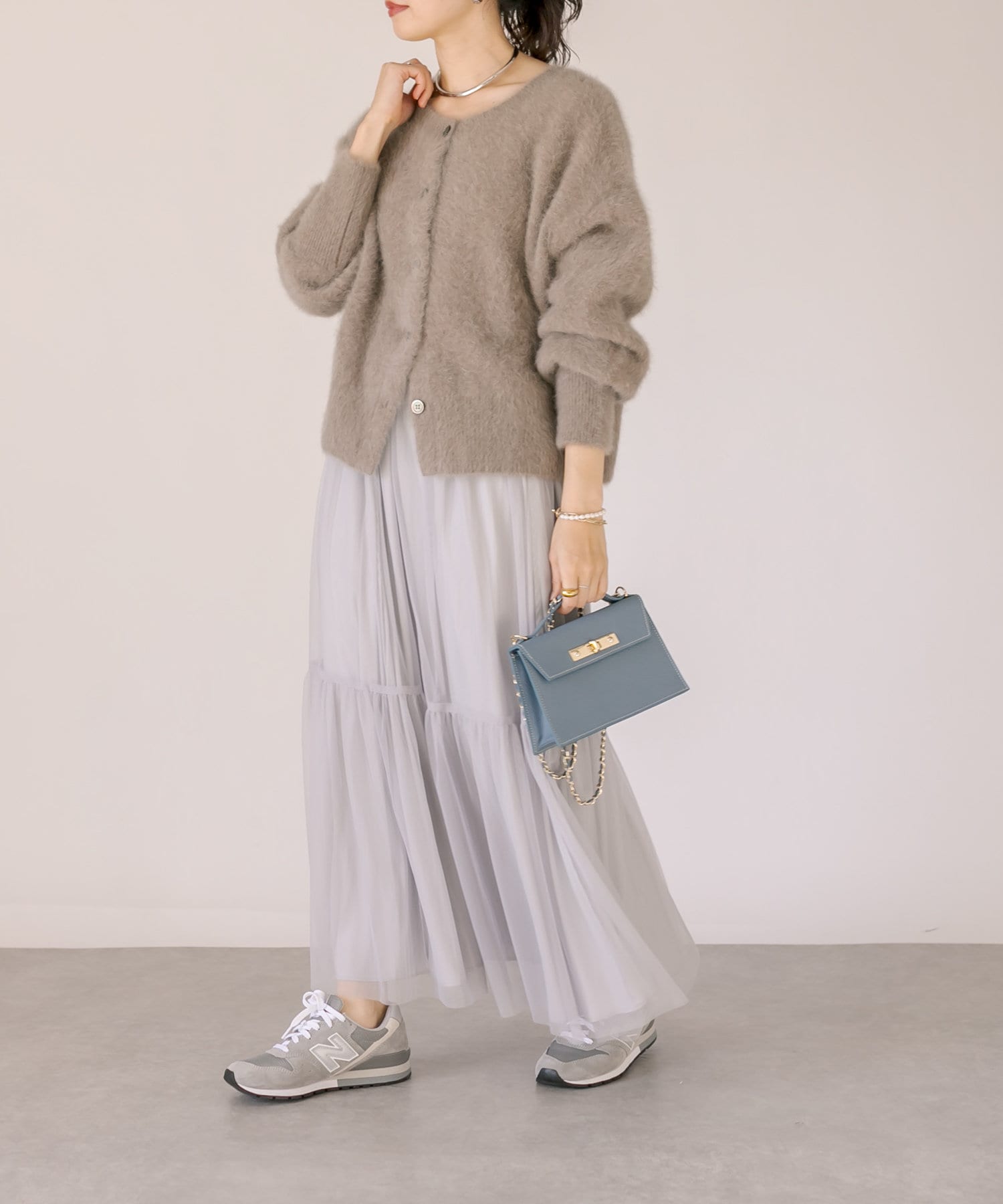 歩くと揺れるそれぞれの素材が重たくなりがちな秋冬のニットスタイルを軽やかに彩ります。