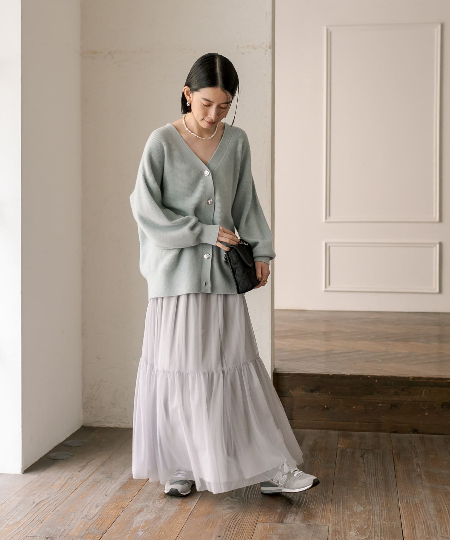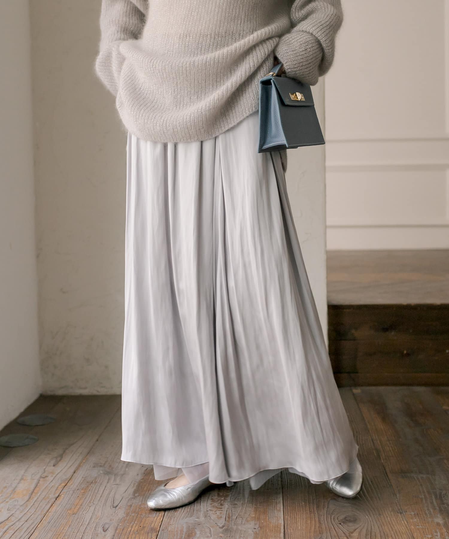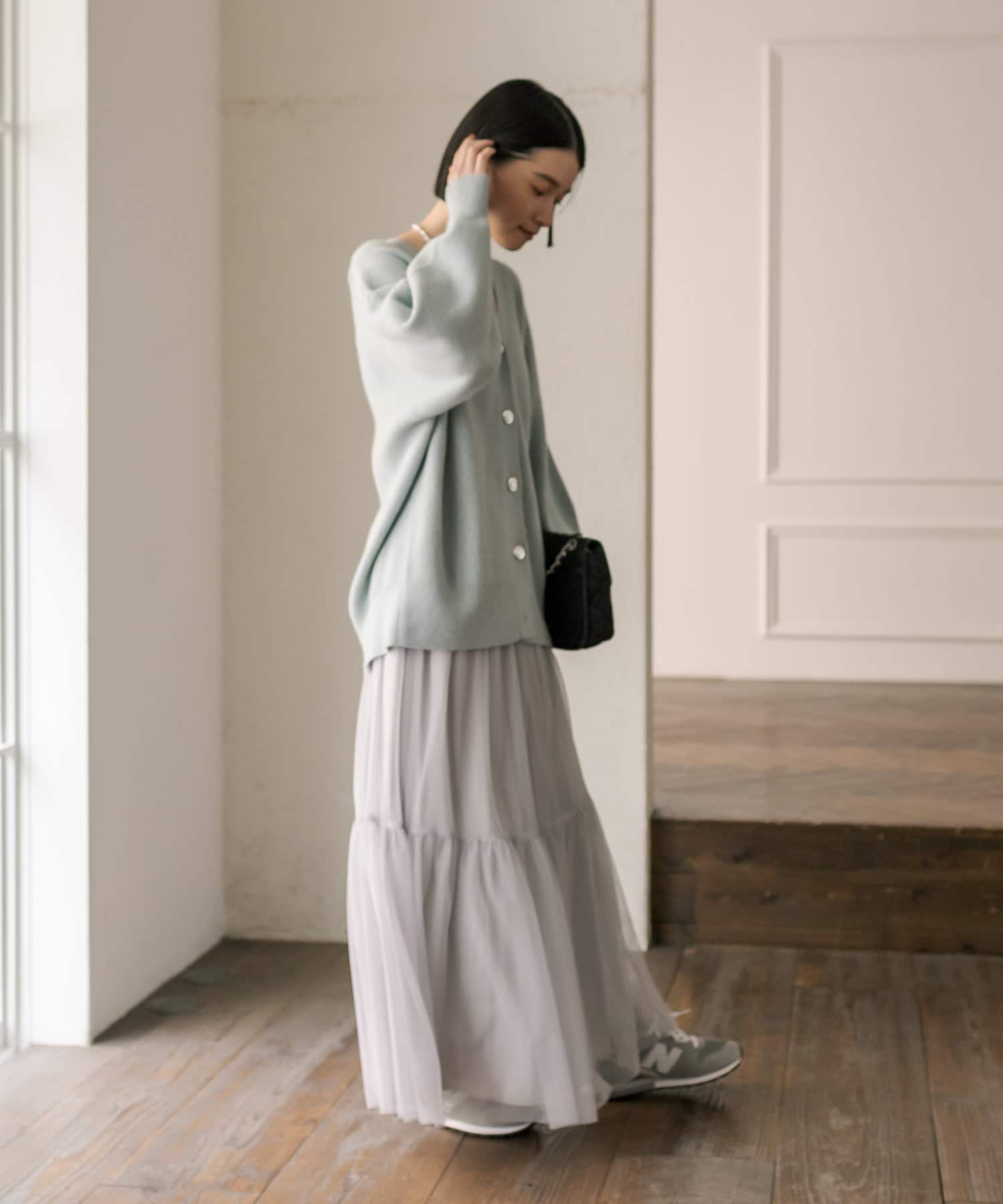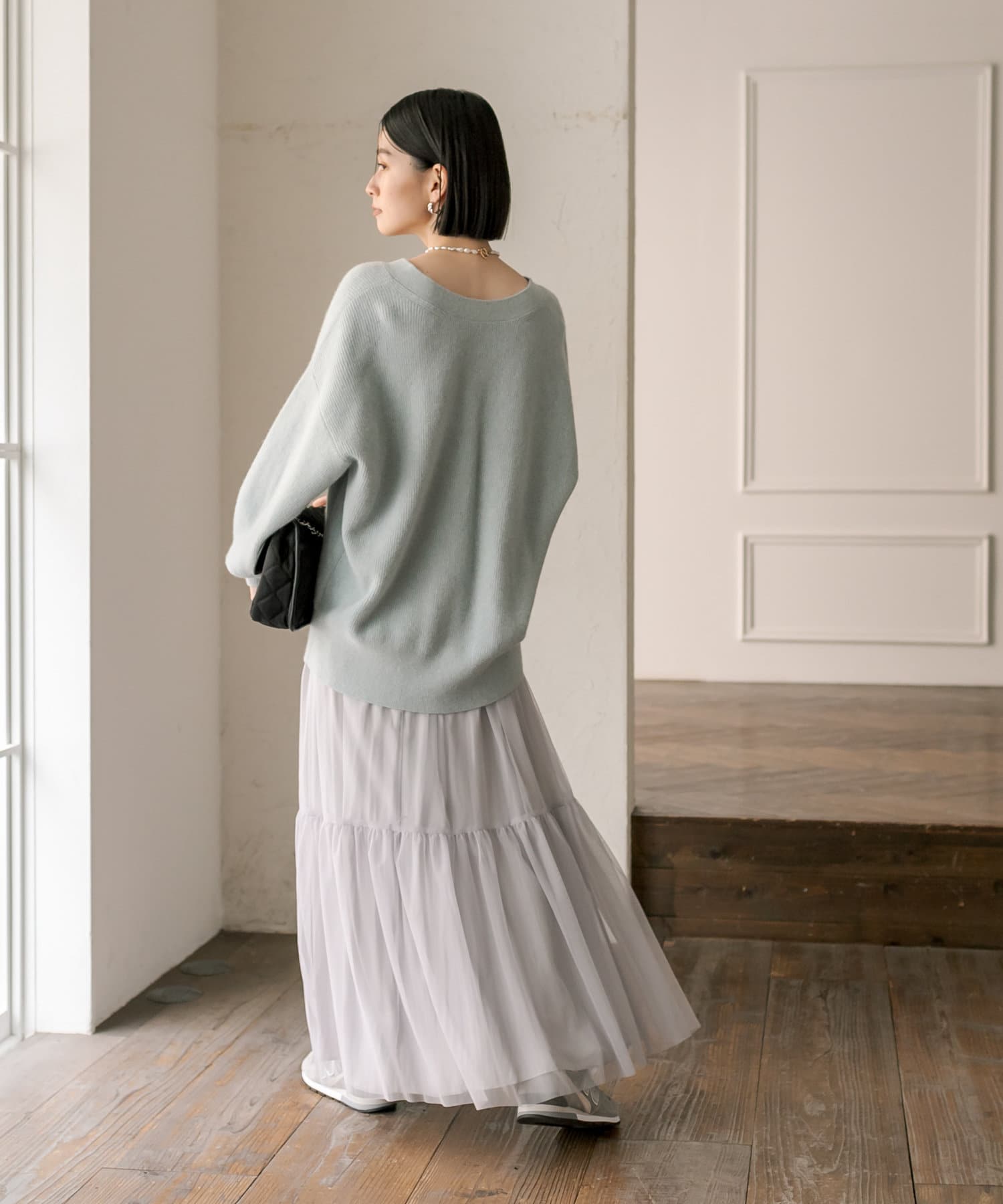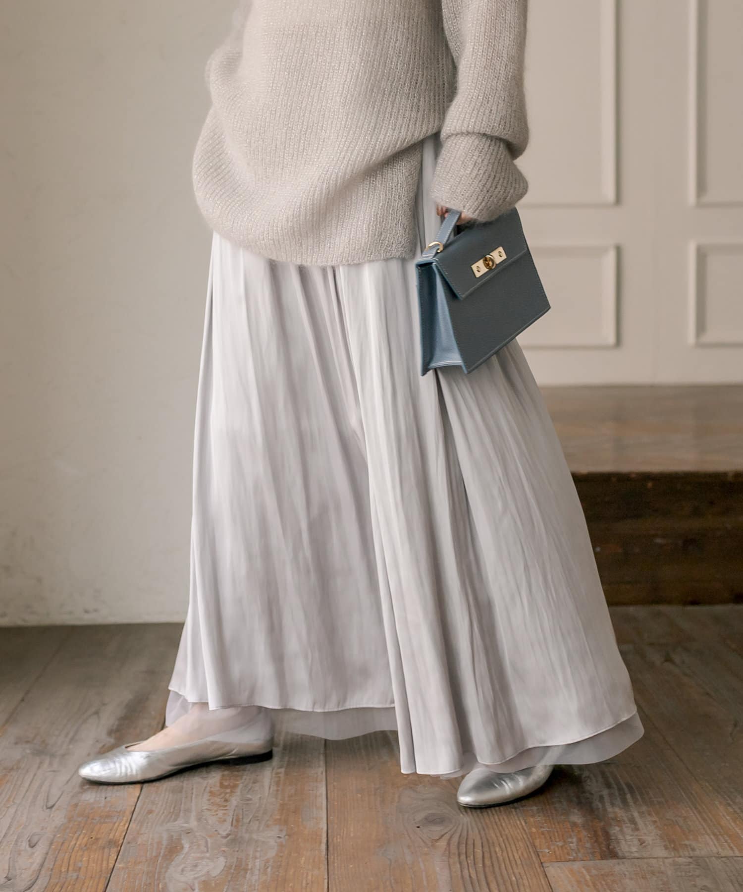歩くと揺れるそれぞれの素材が重たくなりがちな秋冬のニットスタイルを軽やかに彩ります。