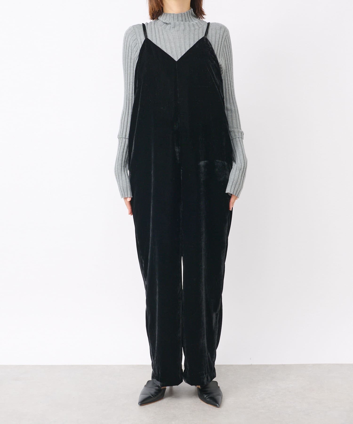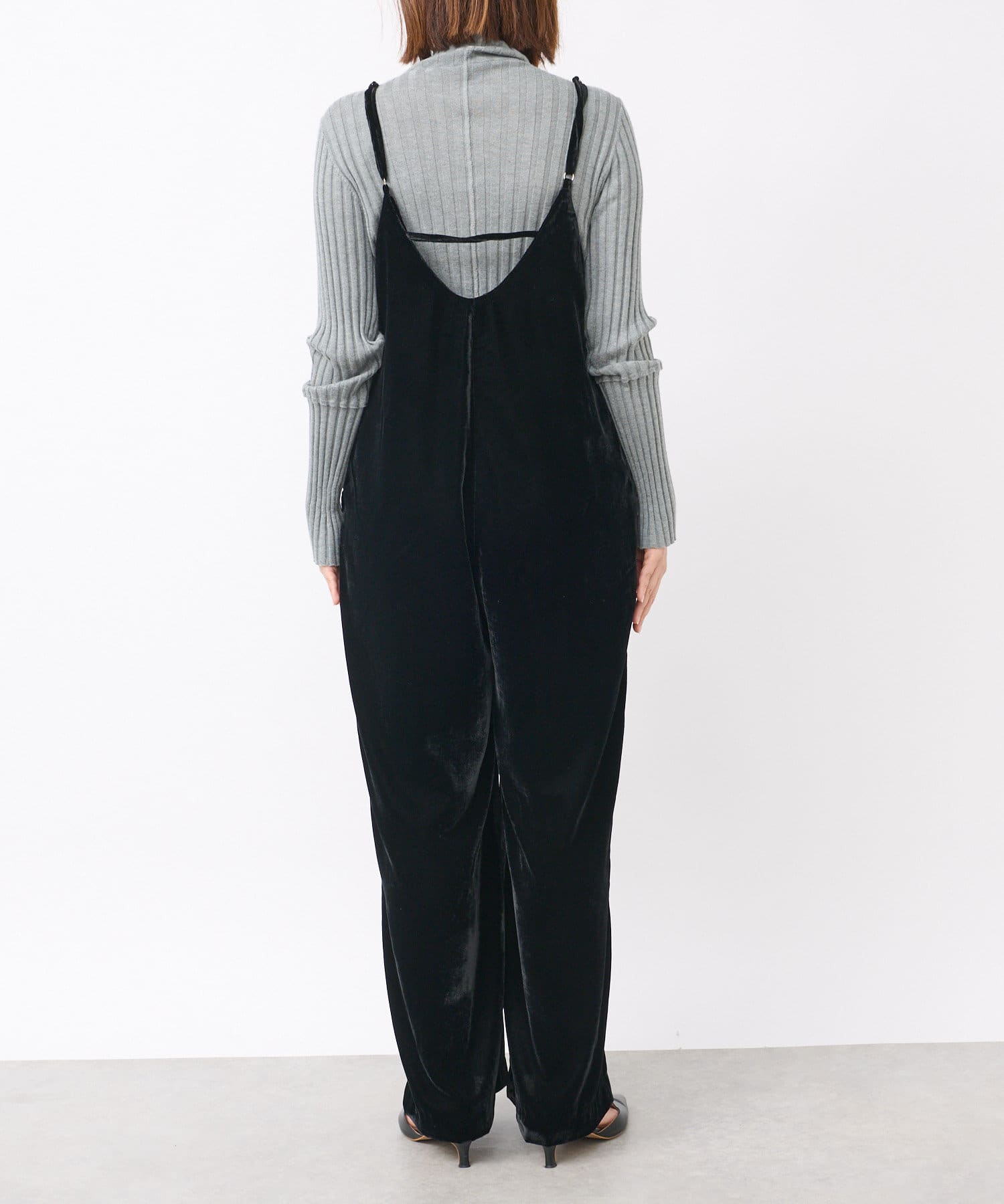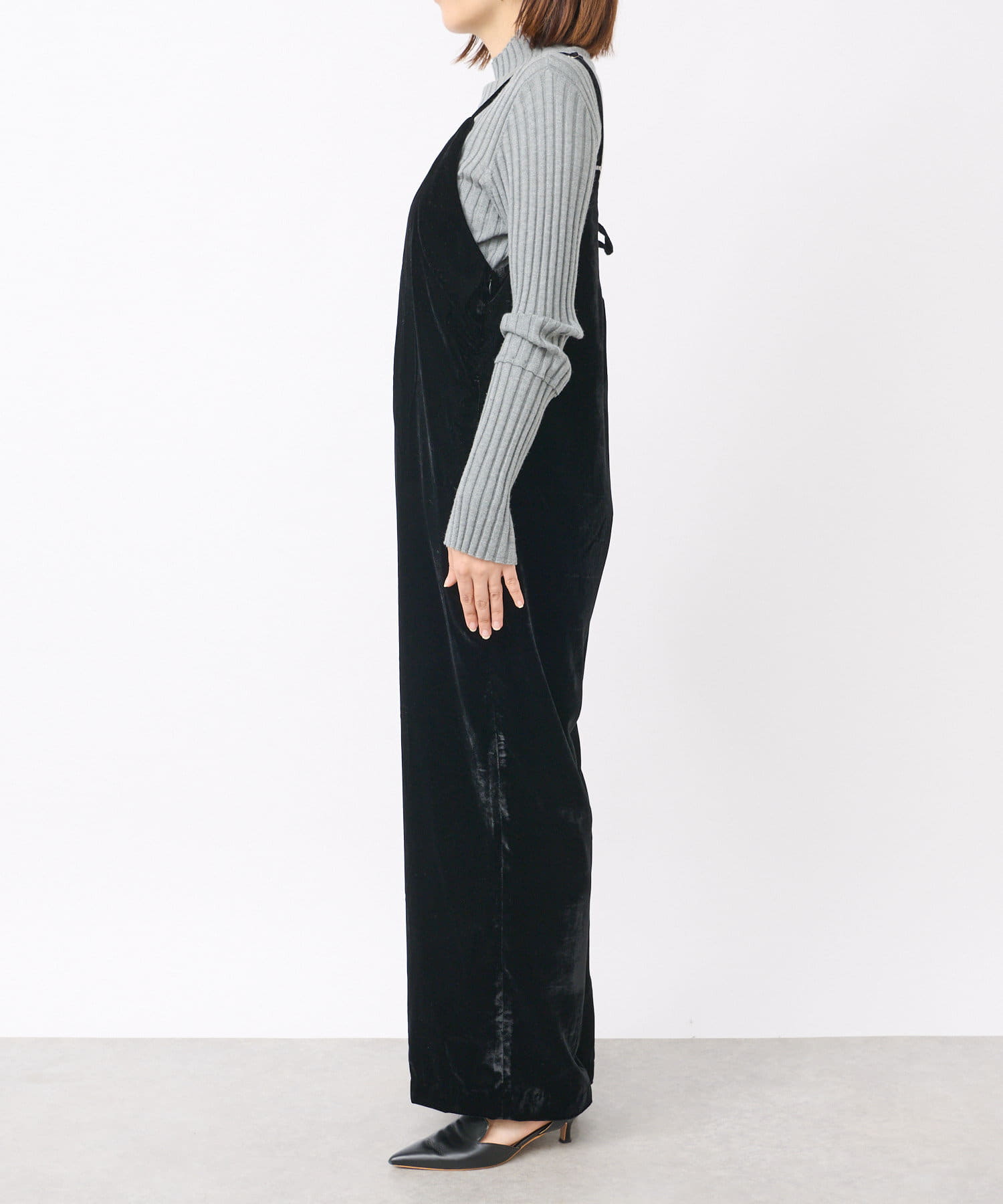 着心地はゆったりとした作りでありながらも、ベロアの上品な光沢感で大人の女性にもおすすめのサロペット。