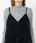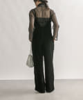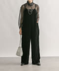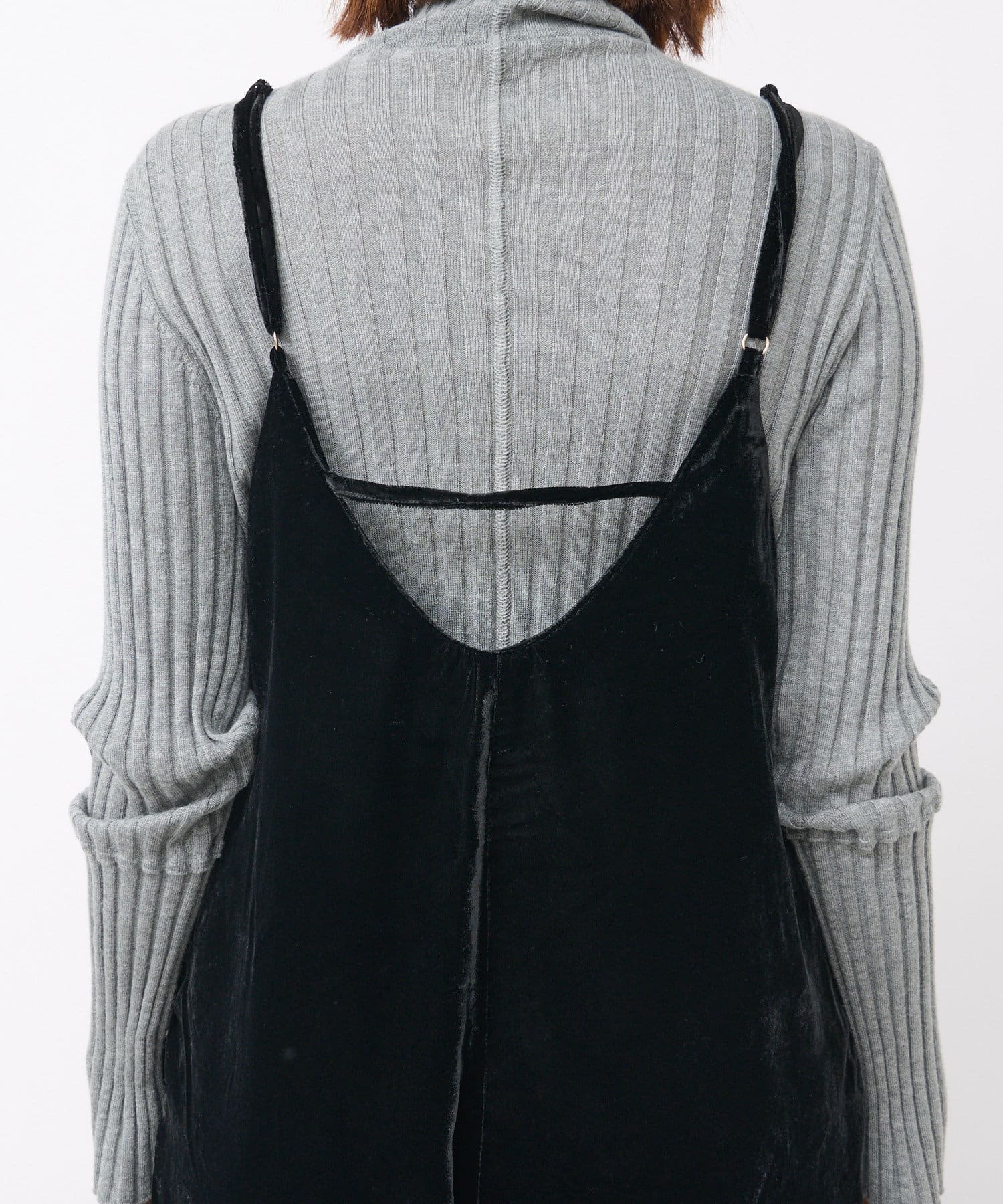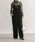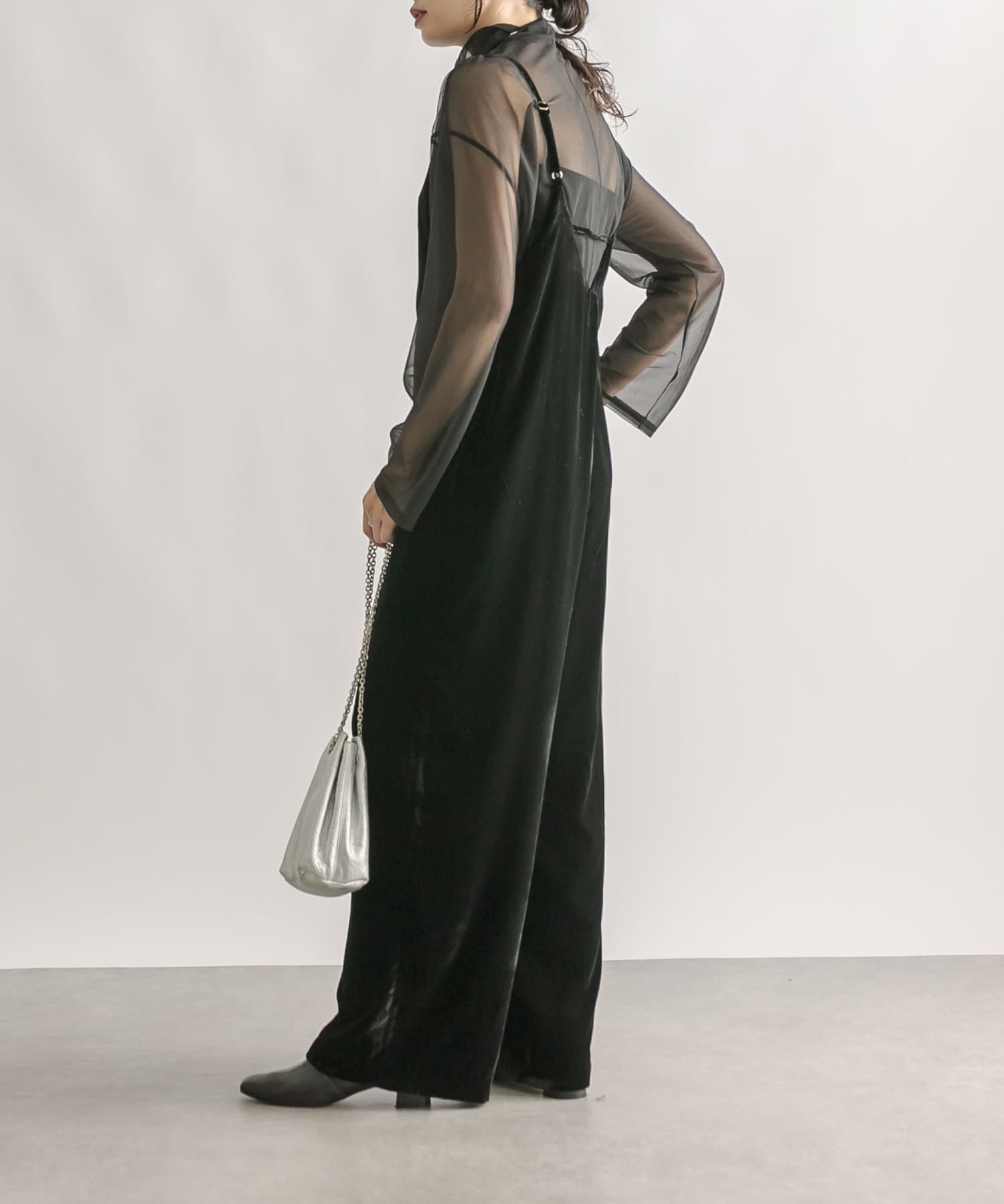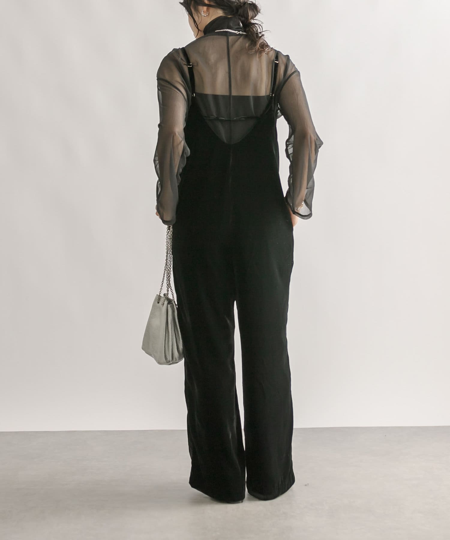 着心地はゆったりとした作りでありながらも、ベロアの上品な光沢感で大人の女性にもおすすめのサロペット。